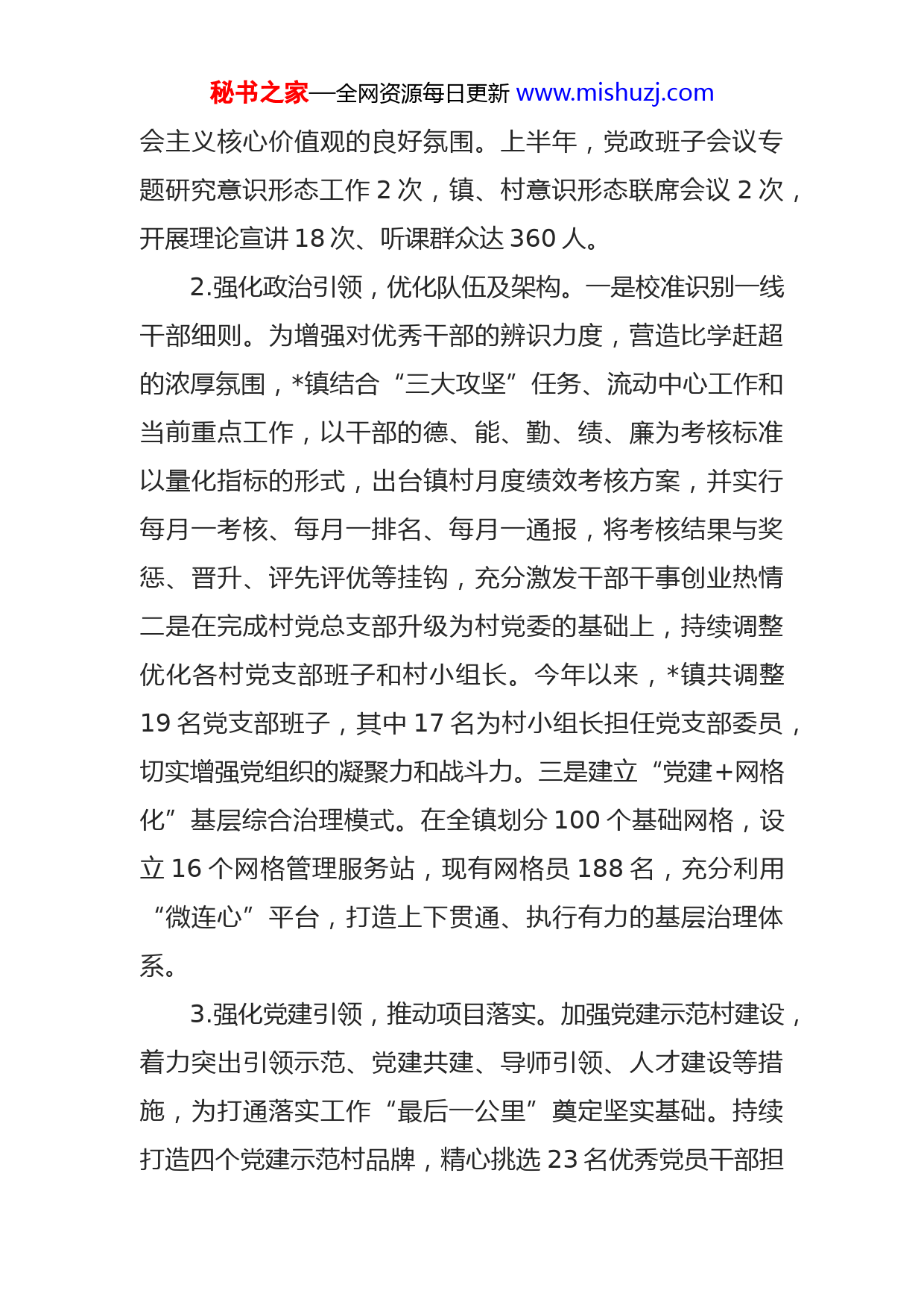 秘书之家—全网资源每日更新www.mishuzj.com乡镇政府2022年工作汇报材料2022年以来,镇坚持以习近平新时代中国特色社会主义思想为指导,全面贯彻落实省第十三次党代会精神、市第八次党代会精神、市第十四次党代会精神和市委、市政府工作部署要求,准确把握新发展阶段,深入贯彻新发展理念,坚持稳中求进工作总基调,明晰工作思路,把脉重点工作,压实工作责任,统筹抓好疫情防控和经济社会发展工作,现将镇上半年工作总结和下半年工作计划汇报如下:一、上半年工作情况(一)强化党建引领作用,打造坚强战斗堡垒1.加强学习教育,筑牢思想根基。一是我镇采取“关键少数”率先学、教育培训集中学、线上平台创新学、阵地教育交流学等方式,强化党员干部思想意识,提升责任意识和履职能力。上半年,共开展理论中心组学习11次,镇委党校培训班8期,参训人员556人次,共组织126名党员干部完成省网络干部学院的学习培训。二是压实意识形态工作。镇始终把意识形态和网络意识形态工作摆在重要位置,持续完善网络舆情和信息发布等制度,每季度开展户外设计政治类广告巡查,建立健全意识形态工作研判机制,全力营造新时代文明实践所践行社秘书之家—全网资源每日更新www.mishuzj.com会主义核心价值观的良好氛围。上半年,党政班子会议专题研究意识形态工作2次,镇、村意识形态联席会议2次,开展理论宣讲18次、听课群众达360人。2.强化政治引领,优化队伍及架构。一是校准识别一线干部细则。为增强对优秀干部的辨识力度,营造比学赶超的浓厚氛围,镇结合“三大攻坚”任务、流动中心工作和当前重点工作,以干部的德、能、勤、绩、廉为考核标准以量化指标的形式,出台镇村月度绩效考核方案,并实行每月一考核、每月一排名、每月一通报,将考核结果与奖惩、晋升、评先评优等挂钩,充分激发干部干事创业热情二是在完成村党总支部升级为村党委的基础上,持续调整优化各村党支部班子和村小组长。今年以来,镇共调整19名党支部班子,其中17名为村小组长担任党支部委员,切实增强党组织的凝聚力和战斗力。三是建立“党建+网格化”基层综合治理模式。在全镇划分100个基础网格,设立16个网格管理服务站,现有网格员188名,充分利用“微连心”平台,打造上下贯通、执行有力的基层治理体系。3.强化党建引领,推动项目落实。加强党建示范村建设,着力突出引领示范、党建共建、导师引领、人才建设等措施,为打通落实工作“最后一公里”奠定坚实基础。持续打造四个党建示范村品牌,精心挑选23名优秀党员干部担秘书之家—全网资源每日更新www.mishuzj.com任各村党组织和“两新”组织的党建导师,先后举办2期党建导师业务培训班,发布2期工作任务清单,由党建导师指导基层党组织开展组织生活,带领党员投身疫情防控森林防火、防汛减灾等重点工作中。(二)严肃党风廉政建设,营造良好政治生态1.落实主体责任,着力净化政治生态。镇始终坚持把党风廉政建设工作纳入主要议事日程,严格落实党风廉政建设主体责任,严格执行廉政谈话制度。建立党委书记亲自抓,党委成员结合分管工作齐抓共管的责任体系,形成一级抓一级,层层抓落实的良好格局。上半年,党政班子会议专题讨论党风廉政建设和反腐败工作1次,开展廉政谈话22人次。2.注重线索处置,加强纪律审查。镇严格落实党风廉政建设、党委主体责任和纪委监督责任,制定落实“两个责任”清单和问责办法。坚持“零容忍”态度,严肃查处违纪违法、侵犯群众利益的案件,切实发挥纪检、监察部门职能作用,不断推进党风廉政建设向纵深发展。上半年办结问题线索1条,立案1件1人。3.加强警示教育,树立廉洁从政意识。持续抓好警示教育,及时传达上级对典型违纪案例的通报,通过以案说纪以案说法、以案说廉的形式,警示提醒党员干部,提高纪法意识和法治观念。加强中央八项规定精神等廉政纪律提秘书之家—全网资源每日更新www.mishuzj.com醒,截至目前,共发送节日前夕廉政短信提醒486条。4.加强日常监督,深入推进作风建设。巩固拓展基层正风反腐三年行动成果,强化对违反中央八项规定精神行为的监督执纪问责,结合人居环境整治、疫情防控、乡村振兴等中心工作,加强监督检查,坚决刹住有令不行、有禁不止、纪律涣散等歪风。上半年,督促相关部门整改问题9个。5.扎实开展违规吃喝专项整治。自开展违规吃喝问题专项整治以来,镇对标对表,认真组织开展违规吃喝问题专项整治行动,对公务接待中无公函接待、一函多餐等问题进行全面自查。发现2018年至今出现无公函接待115单,已补函91单,同时,根据现存的问题及整治要求修订完善了镇内务管理制度。(三)抓好各项安全工作,建设平安稳定1.全力做好疫情防控常态化工作。我镇充分发挥党的组织体系优势,坚持全镇“一盘棋”,通过党组织的统筹协调,运用“党建+网格”模式,聚集各方面力量参与疫情防控工作,持续加强疫苗接种和返乡人员排查,全力织牢织密群防群控网络。截至目前,全人群第一针接种率92.76%,全人群第二针接种率90.80%,第三针加强针接种率95.63%;大数据推送人员921人次,其中落地镇431人次,落地市560人,转外省市255人,无法落地秘书之家—全网资源每日更新www.mishuzj.com106人,全部推送任务均及时在核实情况后传真至市工作专班,核查率100%。落地镇