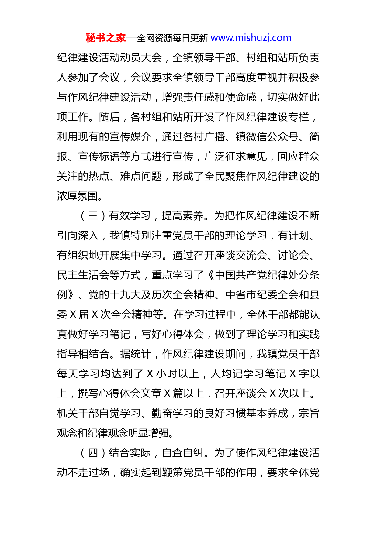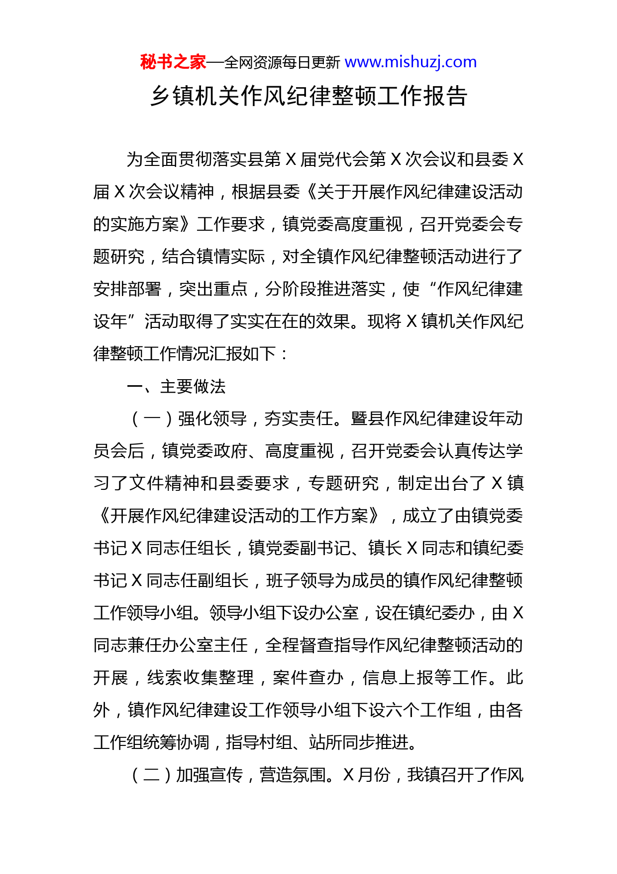 秘书之家—全网资源每日更新www.mishuzj.com乡镇机关作风纪律整顿工作报告为全面贯彻落实县第X届党代会第X次会议和县委X届X次会议精神,根据县委《关于开展作风纪律建设活动的实施方案》工作要求,镇党委高度重视,召开党委会专题研究,结合镇情实际,对全镇作风纪律整顿活动进行了安排部署,突出重点,分阶段推进落实,使“作风纪律建设年”活动取得了实实在在的效果。现将X镇机关作风纪律整顿工作情况汇报如下:一、主要做法(一)强化领导,夯实责任。暨县作风纪律建设年动员会后,镇党委政府、高度重视,召开党委会认真传达学习了文件精神和县委要求,专题研究,制定出台了X镇《开展作风纪律建设活动的工作方案》,成立了由镇党委书记X同志任组长,镇党委副书记、镇长X同志和镇纪委书记X同志任副组长,班子领导为成员的镇作风纪律整顿工作领导小组。领导小组下设办公室,设在镇纪委办,由X同志兼任办公室主任,全程督查指导作风纪律整顿活动的开展,线索收集整理,案件查办,信息上报等工作。此外,镇作风纪律建设工作领导小组下设六个工作组,由各工作组统筹协调,指导村组、站所同步推进。(二)加强宣传,营造氛围。X月份,我镇召开了作风秘书之家—全网资源每日更新www.mishuzj.com纪律建设活动动员大会,全镇领导干部、村组和站所负责人参加了会议,会议要求全镇领导干部高度重视并积极参与作风纪律建设活动,增强责任感和使命感,切实做好此项工作。随后,各村组和站所开设了作风纪律建设专栏,利用现有的宣传媒介,通过各村广播、镇微信公众号、简报、宣传标语等方式进行宣传,广泛征求意见,回应群众关注的热点、难点问题,形成了全民聚焦作风纪律建设的浓厚氛围。(三)有效学习,提高素养。为把作风纪律建设不断引向深入,我镇特别注重党员干部的理论学习,有计划、有组织地开展集中学习。通过召开座谈交流会、讨论会、民主生活会等方式,重点学习了《中国共产党纪律处分条例》、党的十九大及历次全会精神、中省市纪委全会和县委X届X次全会精神等。在学习过程中,全体干部都能认真做好学习笔记,写好心得体会,做到了理论学习和实践指导相结合。据统计,作风纪律建设期间,我镇党员干部每天学习均达到了X小时以上,人均记学习笔记X字以上,撰写心得体会文章X篇以上,召开座谈会X次以上。机关干部自觉学习、勤奋学习的良好习惯基本养成,宗旨观念和纪律观念明显增强。(四)结合实际,自查自纠。为了使作风纪律建设活动不走过场,确实起到鞭策党员干部的作用,要求全体党秘书之家—全网资源每日更新www.mishuzj.com员干部对照我镇印发的作风纪律建设活动的工作方案中的八项重点整治工作,查找自身存在的问题,撰写剖析材料,认真开展了自查自纠活动。通过自查自纠,深入剖析产生问题的原因,全体干部根据各自实际,针对性地提出整改措施,使每个人都正确、客观地评价自己,树立科学的世界观、人生观、价值观。以高度的责任感、事业心,以扎扎实实的工作作风,按照各自的分工,完成X年各项工作任务。(五)集中整治,注重实效。在集中整顿阶段中,镇党委坚持将学习教育与纪律作风建设相结合,先后开展了违反政治纪律和政治规矩整治活动,支部书记、主任、第一书记和站所负责人主体责任落实整治活动,规章制度落实整治活动,明责任促落实整治活动,重点行业部门作风纪律整治活动,扫黑除恶和干部职工参与赌博整治活动,“红白喜事”乱操乱办整治活动,“乱请假”涉嫌“吃空饷”整治活动等八项专项整治工作。针对第二阶段自查自纠活动中梳理出的存在的突出问题,确定了解决问题的重点,抓深入、抓推进、抓落实,在广泛征求意见的基础上,对查找整理出的影响和制约机关纪律作风建设以及群众反映的意见建议进行逐条分析,有针对性地加以整改,能立即解决的、立即解决;需要逐步解决的,专门制定出了问题台账和切合实际、行之有效的整改方案,并召开领秘书之家—全网资源每日更新www.mishuzj.com导班子讨论会,就整改方案进行研究讨论,提出了修改和完善意见。根据所提意见建议对领导班子整改落实方案进行修改完善,确保领导班子整改落实方案落到实处。通过这次集中整治,使全体干部在思想上,牢固树立了围绕大局,服务中心的宗旨意识;在纪律上,坚决执行镇党委的各项决策,有令则行,有禁即止,严格遵守单位的各项规章制度,杜绝上下班迟到早退、随意脱岗或串岗聊天等现象;在作风上,领导带头,扑下身子,真抓实干,防止和克服了干部工作漂浮、敷衍塞责,标准不高,工作效率低、不负责任、不思进取,工作被动应付,缺乏主动创新等问题。(六)健全机制,长远发展。制定出台了《X镇驻村干部“八包”责任制》和《村组季度考核排名办法》,细化考核内容,建立了干部能上能下的用人机制和科学的考核机制,定期分析、准确全面掌握干部的思想、工作、作风状况,作为选拔使用干部的重要依据。对群众确认作风不实、反映强烈的乡镇干部,作出相应的处理,绝不姑息迁就,促进干部干事意识的全面好转。其次加强廉政文化建设,强化廉绩考核。把是否清正廉洁、否得到群众公认、是否求真务实、是否牢固树立群众观点、是否取得实实在在的成绩等作为干部考核的重要依据。(七)严肃监督,执纪问责。为进一步提高我镇的行