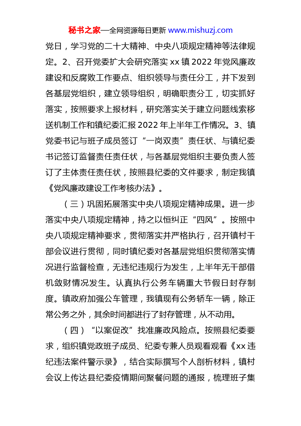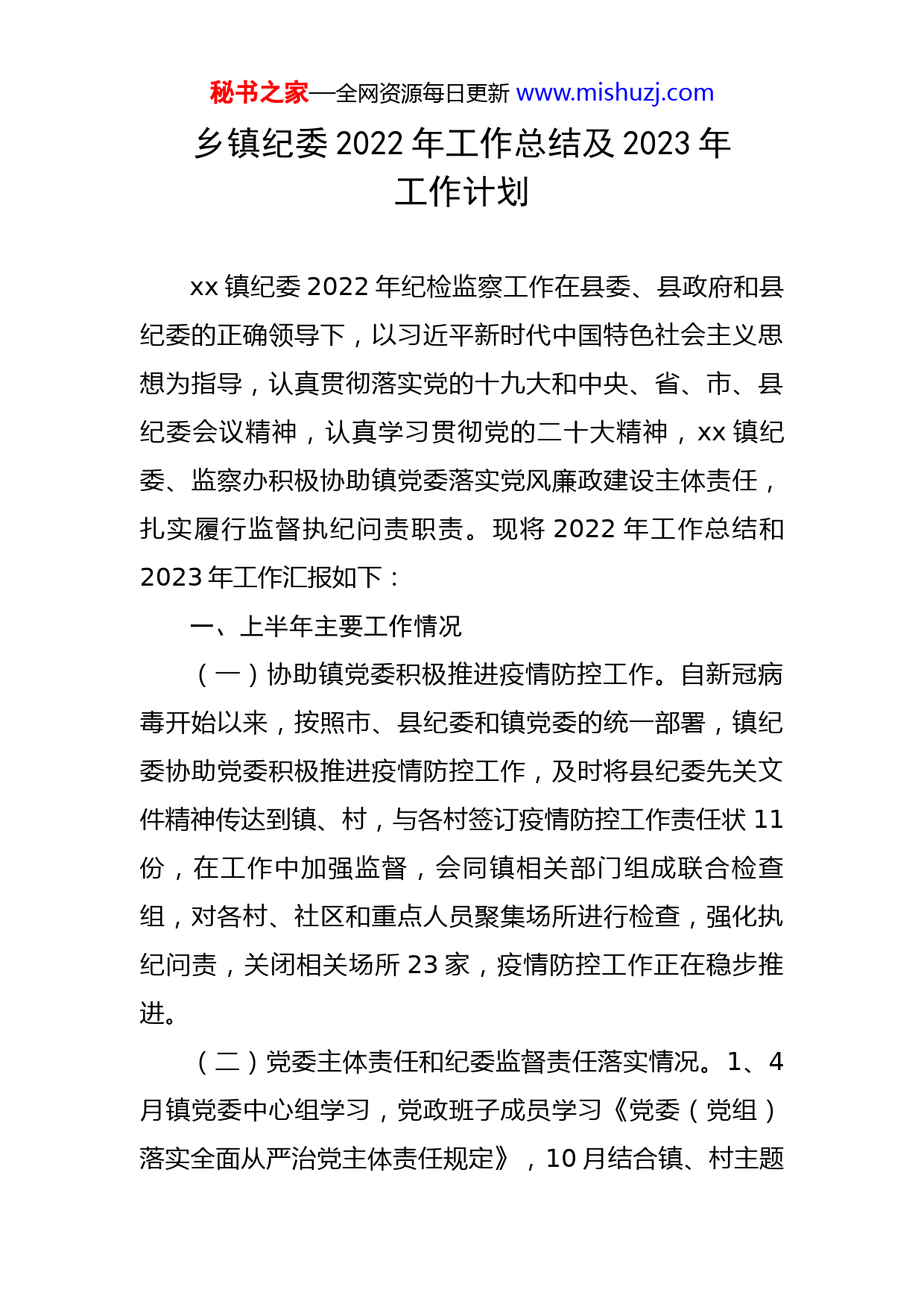 秘书之家—全网资源每日更新www.mishuzj.com乡镇纪委2022年工作总结及2023年工作计划xx镇纪委2022年纪检监察工作在县委、县政府和县纪委的正确领导下,以习近平新时代中国特色社会主义思想为指导,认真贯彻落实党的十九大和中央、省、市、县纪委会议精神,认真学习贯彻党的二十大精神,xx镇纪委、监察办积极协助镇党委落实党风廉政建设主体责任,扎实履行监督执纪问责职责。现将2022年工作总结和2023年工作汇报如下:一、上半年主要工作情况(一)协助镇党委积极推进疫情防控工作。自新冠病毒开始以来,按照市、县纪委和镇党委的统一部署,镇纪委协助党委积极推进疫情防控工作,及时将县纪委先关文件精神传达到镇、村,与各村签订疫情防控工作责任状11份,在工作中加强监督,会同镇相关部门组成联合检查组,对各村、社区和重点人员聚集场所进行检查,强化执纪问责,关闭相关场所23家,疫情防控工作正在稳步推进。(二)党委主体责任和纪委监督责任落实情况。1、4月镇党委中心组学习,党政班子成员学习《党委(党组)落实全面从严治党主体责任规定》,10月结合镇、村主题秘书之家—全网资源每日更新www.mishuzj.com党日,学习党的二十大精神、中央八项规定精神等法律规定。2、召开党委扩大会研究落实xx镇2022年党风廉政建设和反腐败工作要点、组织领导与责任分工,并下发到各基层党组织,建立领导组织,明确职责分工,切实抓好落实,按照要求上报材料,研究落实关于建立问题线索移送机制工作和镇纪委汇报2022年上半年工作情况。3、镇党委书记与班子成员签订“一岗双责”责任状、与镇纪委书记签订监督责任责任状,与各基层党组织主要负责人签订了主体责任责任状,按照县纪委的文件要求,制定我镇《党风廉政建设工作考核办法》。(三)巩固拓展落实中央八项规定精神成果。进一步落实中央八项规定精神,持之以恒纠正“四风”。按照中央八项规定精神要求,贯彻落实并严格执行,召开镇村干部会议进行贯彻,同时镇纪委对各基层党组织贯彻落实情况进行监督检查,无违纪违规行为发生,上半年无干部借机敛财情况发生。认真执行公务车辆重大节假日封存制度。镇政府加强公车管理,我镇现有公务轿车一辆,除正常公务之外,其余时间都进行了封存管理,从不动用。(四)“以案促改”找准廉政风险点。按照县纪委要求,组织镇党政班子成员、纪委专兼人员观看观看《xx违纪违法案件警示录》,结合实际撰写个人剖析材料,镇村会议上传达县纪委疫情期间聚餐问题的通报,梳理班子集秘书之家—全网资源每日更新www.mishuzj.com体廉政风险点7条、班子成员廉政风险点12条。(五)结合“访走查促”活动开展专项检查。今年以来,镇纪委结合实际,按照“一镇一品”要求,结合“访走查促”活动,开展党员违建问题专项检查,重点以3个村为重点,同时,充分发挥正风肃纪监督员基层“哨兵”作用,各村、社区共配强配齐12名监督员,建立正风肃纪监督员问题线索台账和个人档案,召开培训会议,下发走访工作手册,目前专项检查现已立案2件,线索2条。(六)案件任务完成情况。截止目前,完成案件6件处分6人,其中:县纪委转办案件2件,部门移送2件,正风肃纪监督员发现线索2件;正在初核的2件。二、存在的主要问题1、廉政教育的警示震撼作用发挥不够。在警示教育工作中,往往只根据上级要求通报典型案例、观看警示教育片的形式,教育内容不够丰富,形式不够创新,导致教育的警示震撼效果有所减弱,部分镇村干部的廉洁自律意识还有待提高。2、问题线索来源单一,自身主动发现违纪违法问题线索的能力不足。比如扫黑除恶方面,至今仍然没有排查出有价值的线索。三、2023年工作计划1、对贯彻落实中央八项规定精神,聚焦“四风”突出秘书之家—全网资源每日更新www.mishuzj.com问题强化日常监督,推动正风肃纪常态化。2、开展基层廉政文化活动,做好党风廉政建设宣传工作。结合实际,把廉政文化向多样化、深层次延伸。3、注重拓宽信访渠道,广泛收集案件线素,并妥善处理群众来信来访,认真解决侵害群众切身利益的信访问题,切实维护群众的根本利益。
