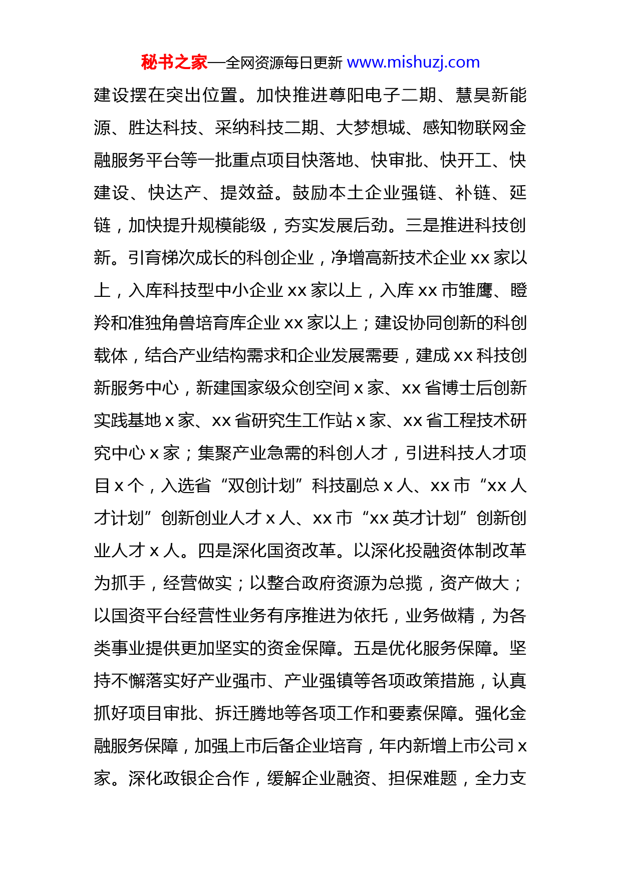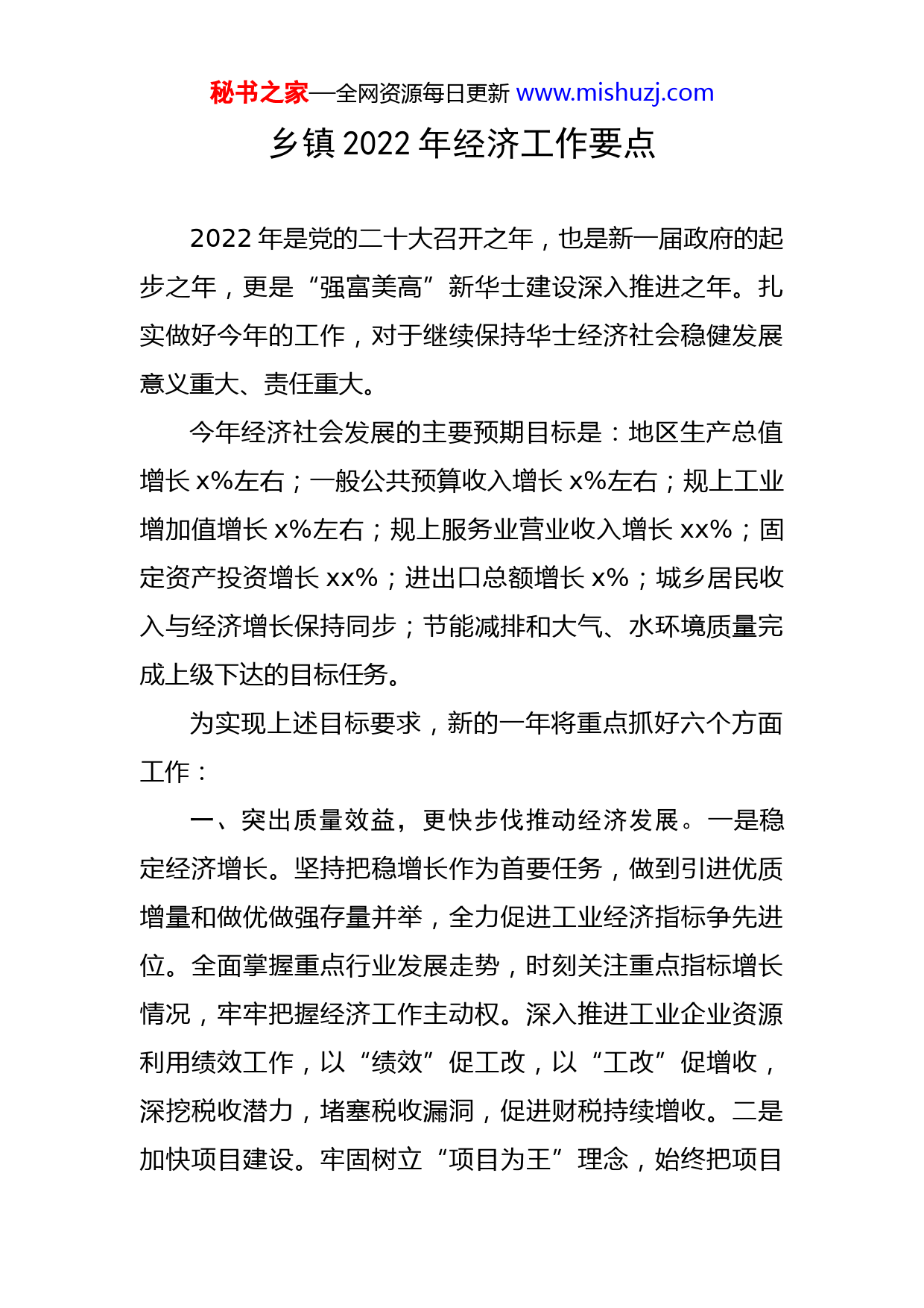 秘书之家—全网资源每日更新www.mishuzj.com乡镇2022年经济工作要点2022年是党的二十大召开之年,也是新一届政府的起步之年,更是“强富美高”新华士建设深入推进之年。扎实做好今年的工作,对于继续保持华士经济社会稳健发展意义重大、责任重大。今年经济社会发展的主要预期目标是:地区生产总值增长x%左右;一般公共预算收入增长x%左右;规上工业增加值增长x%左右;规上服务业营业收入增长xx%;固定资产投资增长xx%;进出口总额增长x%;城乡居民收入与经济增长保持同步;节能减排和大气、水环境质量完成上级下达的目标任务。为实现上述目标要求,新的一年将重点抓好六个方面工作:一、突出质量效益,更快步伐推动经济发展。一是稳定经济增长。坚持把稳增长作为首要任务,做到引进优质增量和做优做强存量并举,全力促进工业经济指标争先进位。全面掌握重点行业发展走势,时刻关注重点指标增长情况,牢牢把握经济工作主动权。深入推进工业企业资源利用绩效工作,以“绩效”促工改,以“工改”促增收,深挖税收潜力,堵塞税收漏洞,促进财税持续增收。二是加快项目建设。牢固树立“项目为王”理念,始终把项目秘书之家—全网资源每日更新www.mishuzj.com建设摆在突出位置。加快推进尊阳电子二期、慧昊新能源、胜达科技、采纳科技二期、大梦想城、感知物联网金融服务平台等一批重点项目快落地、快审批、快开工、快建设、快达产、提效益。鼓励本土企业强链、补链、延链,加快提升规模能级,夯实发展后劲。三是推进科技创新。引育梯次成长的科创企业,净增高新技术企业xx家以上,入库科技型中小企业xx家以上,入库xx市雏鹰、瞪羚和准独角兽培育库企业xx家以上;建设协同创新的科创载体,结合产业结构需求和企业发展需要,建成xx科技创新服务中心,新建国家级众创空间x家、xx省博士后创新实践基地x家、xx省研究生工作站x家、xx省工程技术研究中心x家;集聚产业急需的科创人才,引进科技人才项目x个,入选省“双创计划”科技副总x人、xx市“xx人才计划”创新创业人才x人、xx市“xx英才计划”创新创业人才x人。四是深化国资改革。以深化投融资体制改革为抓手,经营做实;以整合政府资源为总揽,资产做大;以国资平台经营性业务有序推进为依托,业务做精,为各类事业提供更加坚实的资金保障。五是优化服务保障。坚持不懈落实好产业强市、产业强镇等各项政策措施,认真抓好项目审批、拆迁腾地等各项工作和要素保障。强化金融服务保障,加强上市后备企业培育,年内新增上市公司x家。深化政银企合作,缓解企业融资、担保难题,全力支秘书之家—全网资源每日更新www.mishuzj.com持实体经济发展。密切关注困难企业运行情况,健全预警机制,完善应急预案,依法打击非法集资、逃废债等违法行为,妥善处置各类风险隐患,切实维护经济金融安全环境。二、突出园区改造,更大力度促进转型升级。一是做优园区规划。贯彻市委、市政府决策部署,结合我镇工业现状和发展方向,统筹考虑、科学制订工业园区整体规划和产业发展规划。按照现代化新型工业园区要求,进一步提升园区承载能力和形象,促进镇域工业经济提档升级。二是做实腾退盘活。镇村合力攻坚,深化土地资源集约利用,以“厂中厂”专项整治、“散乱污”企业专项治理为抓手,以亩产论英雄、定进退,推动工业企业向园区集中。坚决淘汰产能落后、污染严重、安全隐患突出的企业(作坊),严厉打击和清理违章建筑和违法用地,通过回收、回购、置换等方式,确保年内盘活存量土地xxx亩,腾退低效工业用地xxxx亩,拆迁非工业用地xxx亩。三是做深运营文章。找准产业定位,依托现有企业优势抓招商,加快形成电子信息、高端金属制品、机械装备、医疗器材、新能源产业集群。严把项目入口关,致力于引进带动性强、科技含量高、产品附加值高的好项目、大项目,提高资源配置效益,促进企业转型升级、做优做强。注重工业园区长效管理,健全完善管理机构制度,促进工业园秘书之家—全网资源每日更新www.mishuzj.com区整体环境面貌和管理水平提升。三、突出建管并重,更新理念提升城市品质。一是优化空间布局。提高空间配置效率,改善空间功能品质,增强空间治理能力,支撑重大区域战略实施,适应经济高质量发展的空间需求,塑造多元、开放、高效、优质的新型城镇化空间布局,推进多规合一村庄规划编制。加快华泓地块、华强地块和陆桥商住地块出让进度,实施城市更新,提升城市能级。二是加快基础建设。有序推进中心污水厂扩建,开工建设新一轮农村污水治理、交警中队改造、红星路北段改建等项目,完成东华路污水主管网建设、人民路延伸段道路绿化、新丰街和陆西大街改造。三是突出常态长效。持续巩固全国文明镇、国家卫生镇创建成果,提升城镇品质和管理水平,提高市民文明素质。针对交通秩序、犬类管理以及乱张贴“小广告”等顽疾,采取定点管理与流动巡查相结合、专项整治与建章立制相结合、日常检查与定期模测相结合等有效举措,闭环整改问题。四、突出绿色宜居,更高标准推进生态建设。一是强化能源管理。树立“双碳”理念,以“碳达峰”目标为引领,推动企业向绿色低碳转型发展。持续抓好“能耗双控”,加强“两高”项目管理,提高“绿电”规模。深入推进屋顶