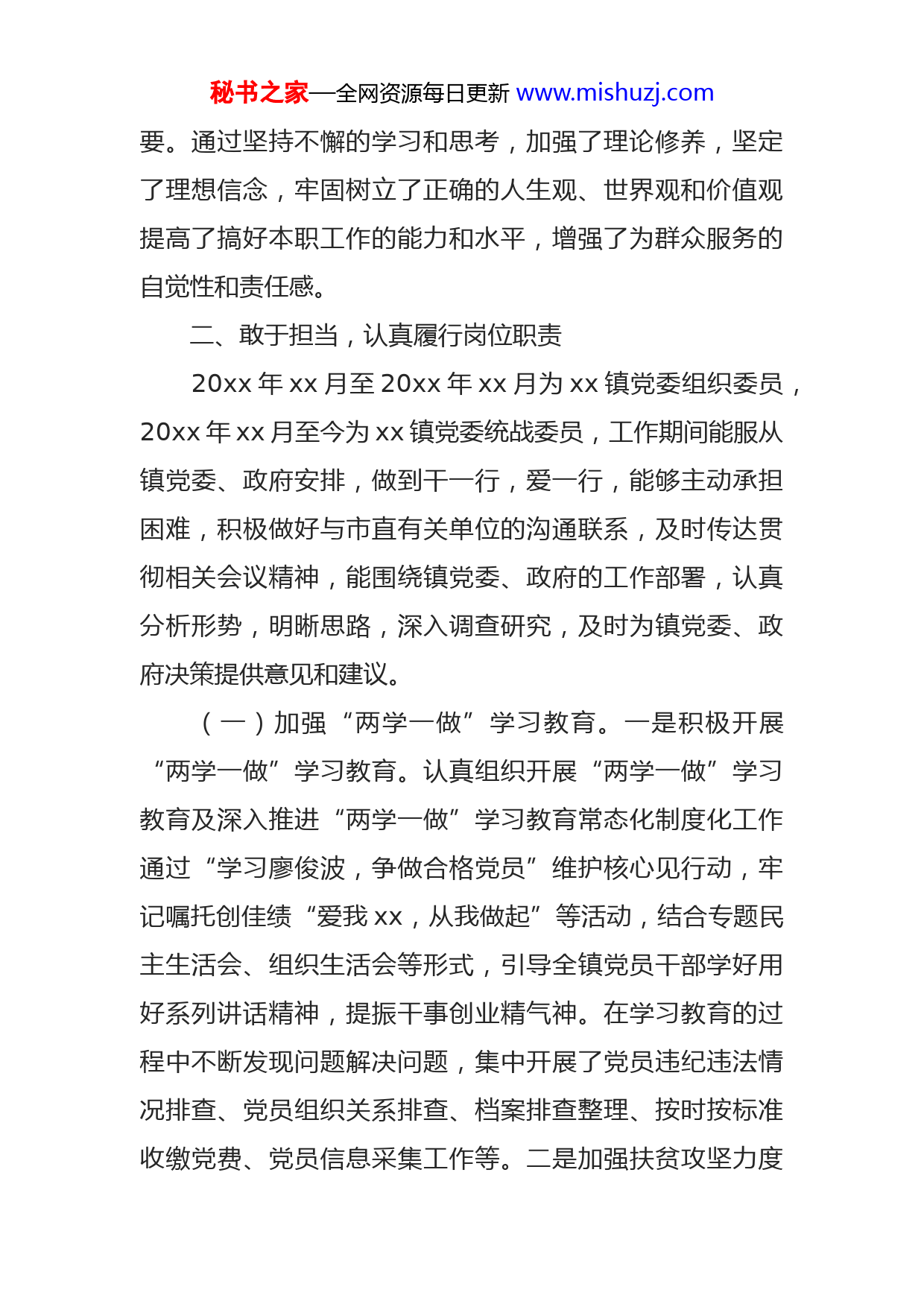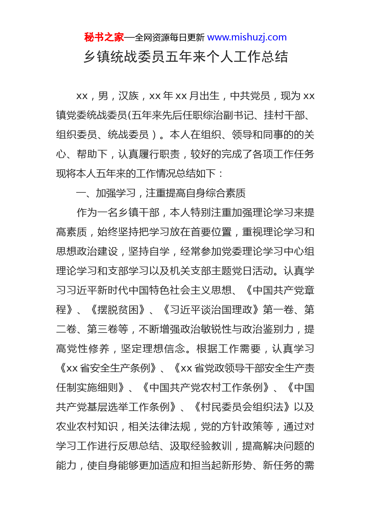 秘书之家—全网资源每日更新www.mishuzj.com乡镇统战委员五年来个人工作总结xx,男,汉族,xx年xx月出生,中共党员,现为xx镇党委统战委员(五年来先后任职综治副书记、挂村干部、组织委员、统战委员)。本人在组织、领导和同事的的关心、帮助下,认真履行职责,较好的完成了各项工作任务现将本人五年来的工作情况总结如下:一、加强学习,注重提高自身综合素质作为一名乡镇干部,本人特别注重加强理论学习来提高素质,始终坚持把学习放在首要位置,重视理论学习和思想政治建设,坚持自学,经常参加党委理论学习中心组理论学习和支部学习以及机关支部主题党日活动。认真学习习近平新时代中国特色社会主义思想、《中国共产党章程》、《摆脱贫困》、《习近平谈治国理政》第一卷、第二卷、第三卷等,不断增强政治敏锐性与政治鉴别力,提高党性修养,坚定理想信念。根据工作需要,认真学习《xx省安全生产条例》、《xx省党政领导干部安全生产责任制实施细则》、《中国共产党农村工作条例》、《中国共产党基层选举工作条例》、《村民委员会组织法》以及农业农村知识,相关法律法规,党的方针政策等,通过对学习工作进行反思总结、汲取经验教训,提高解决问题的能力,使自身能够更加适应和担当起新形势、新任务的需秘书之家—全网资源每日更新www.mishuzj.com要。通过坚持不懈的学习和思考,加强了理论修养,坚定了理想信念,牢固树立了正确的人生观、世界观和价值观提高了搞好本职工作的能力和水平,增强了为群众服务的自觉性和责任感。二、敢于担当,认真履行岗位职责20xx年xx月至20xx年xx月为xx镇党委组织委员,20xx年xx月至今为xx镇党委统战委员,工作期间能服从镇党委、政府安排,做到干一行,爱一行,能够主动承担困难,积极做好与市直有关单位的沟通联系,及时传达贯彻相关会议精神,能围绕镇党委、政府的工作部署,认真分析形势,明晰思路,深入调查研究,及时为镇党委、政府决策提供意见和建议。(一)加强“两学一做”学习教育。一是积极开展“两学一做”学习教育。认真组织开展“两学一做”学习教育及深入推进“两学一做”学习教育常态化制度化工作通过“学习廖俊波,争做合格党员”维护核心见行动,牢记嘱托创佳绩“爱我xx,从我做起”等活动,结合专题民主生活会、组织生活会等形式,引导全镇党员干部学好用好系列讲话精神,提振干事创业精气神。在学习教育的过程中不断发现问题解决问题,集中开展了党员违纪违法情况排查、党员组织关系排查、档案排查整理、按时按标准收缴党费、党员信息采集工作等。二是加强扶贫攻坚力度秘书之家—全网资源每日更新www.mishuzj.com选派专门干部挂钩帮扶贫困户,以政策扶持、资金支持、技术帮扶的工作理念,着力加强贫困户自身造血功能,指导他们发展生产,助力贫困户早日实现脱贫。三是加强典型宣传教育。注重教育培训,邀请xx一中退休教师xx为我镇党员干部讲解《全面从严治党——十八届六中全会精神解读》,邀请市委宣讲团至我镇进行十九大精神宣讲邀请xx检察院干部为我镇党员干部讲授美丽乡村建设、廉政教育等课程,提升了村干队伍的履职能力。组织党员干部赴福建省政和县廖俊波纪念馆参观学习,让党员干部了解时代的楷模、榜样的力量。(二)加强基层组织建设。一是扎实推进“xxxx”党建工作机制。xx村党支部发挥先锋模范作用发展“稻鱼共生”集体经济项目,实现村财增收农民致富,成功举办xx村第一届第二届“开镰节”;充分挖掘xx村红色文化内涵,把红色资源优势转化为对党员干部的理想信念教育和党性党风党纪教育,通过打基础、重示范、抓教育,着力打造红色党建教育基地,建立红色宣传教育新载体。二是加强村干部队伍建设:一优化人员结构,加强人才储备。将优秀青年党员纳入后备干部培养,对返乡务工人员及乡贤进行调查摸底建立档案,为20xx年村级组织换届选举储备人才;二严把发展党员质量,20xx、20xx年各发展党员xx名、xx名,为优化党员队伍的年龄和知识结构,将致富能秘书之家—全网资源每日更新www.mishuzj.com手、回乡大学生、返乡创业人员、优秀退伍军人吸收到党员队伍中来;三加强软弱涣散党支部整顿。针对软弱涣散党支部xx村、xx村和xx村存在的问题,通过安排得力干部驻村监督、加强与村干部沟通交流、书记进村上党课等形式,提升支部战斗力。三是加强非公企业党建工作。选派有经验的镇、村党建工作干部担任企业党建工作指导员指导非公有制企业党建工作,确保非公有制企业党组织的巩固和党建工作的有效开展。(三)健全统战工作机制,发挥党外人士作用。一是做好党外人士、非公经济人士、宗教界人士等统战人士沟通联系工作,疫情防控期间,与xx相关海外人员、港澳台人员逐一进行排查摸底,完善我镇港澳台乡情普查联系台账,为上级工作决策提供参考依据。二是加强商会建设。持续推进创建“四好”商会活动,充分发挥商会积极引导作用,大力宣传党和国家的相关政策,积极引导非公经济人士投身xx镇经济社会事务。(四)切实抓好宗教工作,倡导文明新风。一是依法管理宗教事务。加强疫情防控期间宗教活动场所管理工作对佛道教商业化、教风不正问题进行治理;严格执行乱滥建寺观教堂、露天宗教造像、民间信仰活动巡查整治工作加强民