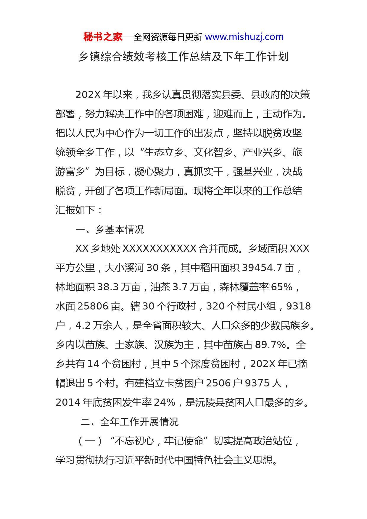 秘书之家—全网资源每日更新www.mishuzj.com乡镇综合绩效考核工作总结及下年工作计划202X年以来,我乡认真贯彻落实县委、县政府的决策部署,努力解决工作中的各项困难,迎难而上,主动作为。把以人民为中心作为一切工作的出发点,坚持以脱贫攻坚统领全乡工作,以“生态立乡、文化智乡、产业兴乡、旅游富乡”为目标,凝心聚力,真抓实干,强基兴业,决战脱贫,开创了各项工作新局面。现将全年以来的工作总结汇报如下:一、乡基本情况XX乡地处XXXXXXXXXXX合并而成。乡域面积XXX平方公里,大小溪河30条,其中稻田面积39454.7亩,林地面积38.3万亩,油茶3.7万亩,森林覆盖率65%,水面25806亩。辖30个行政村,320个村民小组,9318户,4.2万余人,是全省面积较大、人口众多的少数民族乡。乡内以苗族、土家族、汉族为主,其中苗族占89.7%。全乡共有14个贫困村,其中5个深度贫困村,202X年已摘帽退出5个村。有建档立卡贫困户2506户9375人,2014年底贫困发生率24%,是沅陵县贫困人口最多的乡。二、全年工作开展情况(一)“不忘初心,牢记使命”切实提高政治站位,学习贯彻执行习近平新时代中国特色社会主义思想。秘书之家—全网资源每日更新www.mishuzj.com1、强化乡党委理论中心组学习。今年以来,中心组共开展了以“不忘初心,牢记使命”学习贯彻党的十九大精神、习近平新时代中国特色社会主义思想等为主题的12个专题学习,领导班子成员带头领学12次,中心发言24次,县纪委书记张俊辉同志旁听了中心组学习,并给予了高度评价及建议。2、落实各党支部的学习教育。着眼提高履职能力,健全工作推进机制,各种决策部署得到高效落实。调整3个村支部书记,发展党员23名。推进“不忘初心、牢记使命”主题教育,健全正向激励和容错纠错机制,大力倡导“不找借口,争创一流”进取精神,形成了比学赶超、争先进位、竞相发展的浓厚氛围。自上而下地传达学习十九大及习近平新时代中国特色社会主义思想和中央、省委、市委及县委相关文件精神。乡级层面举办“不忘初心、牢记使命”主题教育培训12次,推送学习资料36余篇,发放学习书籍3600余本。每名班子成员都到自己联系的支部开展了不少于两天(学习量)的培训。在二酉中学支部、宗琳小学等支部率先开展了以“不忘初心,牢记使命”为主题的教育宣讲会,并开展升国旗、唱国歌、诵党史专题学习活动。3、营造全乡创新学习氛围,丰富学习载体。一是多渠道学习,紧跟时代的步伐,合理利用网络学习平台(湖南秘书之家—全网资源每日更新www.mishuzj.com干教、学习强国APP等)开展干部群众理论教育;于各村组织集中观看电影500余场;二是以考促学。共开展“不忘初心、牢记使命”主题教育应知应会知识测试4次,参考人员共600余人;三是撰写学习心得。开展了“不忘初心、牢记使命”主题教育心得体会征文活动;四是营造浓厚氛围。发放宣传书籍1500余册,共制作横幅标语150余条、路灯牌标语20个,固定宣传牌10个,做到“不忘初心、牢记使命”主题教育每个村、每个乡直单位、网上网下随处可见。(二)万众一心,齐迈脱贫攻坚“五大步”。1、“三大攻坚战”进一步推进。防范化解重大风险有力有为。防控乡财政债务风险方面,按照上级精神,全面核实乡村两级债务,逐步化解乡村隐形债务。全面清理借欠公款行为,截至10月底,共追回公款170万元。防控安全生产风险方面,乡安监站切实完善“三实”信息、客渡船只、大团寨、烟花爆竹、危化品销售、餐馆、商店等详细台账,加强交通安全、建筑安全、食品安全、消防安全大检查,确保社会大局安全稳定。非洲猪瘟防控有力,全乡6个临时检测点运行正常,工作人员认真负责,作风过硬。防控信访维稳风险方面,强化信访维稳风险防控,加强应急管理和处置能力建设,取缔非法砂场,及时化解棋坪村坟地纠纷,正确处理涉军人员、齐眉界林场退职员秘书之家—全网资源每日更新www.mishuzj.com工、农电工等群体诉求,落实好“一村一辅警”工作机制,强力推进扫黑除恶专项斗争和大力开展禁毒行动。社会治安形势持续向好,群众安全感稳步提升。脱贫攻坚用心用情。按照《沅陵县农业产业扶贫奖补办法》,全乡共发放奖补资金163.8万元;落实五强溪辉佳水产养殖专业合作社、沅陵县五丰生态种养专业合作社、沅陵县康欣园生态茶油科技有限公司、湖南辰投碣滩茶业开发有限公司对接贫困户工作,共对接贫困户615户1947人,村级合作社已经实现贫困户全覆盖。314亩土地增减挂钩项目基本完成,助力易地扶贫搬迁项目成效明显。完成分散安置住房功能完善117户429人、太常集中安置今年入住79户315人、集中安置点配套管理设施完成15户54人;完成202X年县内外就读建档立卡贫困生国家助学帮扶;安排生态护林员公益性岗位48人和扶贫特岗260人;探索建立帮扶长效机制,完美对接长沙长龙街道办事处,初步建立长龙街道教育帮扶基金和长龙街道医疗帮扶基金,制定了《长沙县长龙街道对口帮扶沅陵县XX乡血水潭村三年行动计划纲要》。实施安全饮水工程全乡覆盖,解决了贫困人口的安全饮水问题;完成农村危房改造验收405户;27个村综合服务平台建设、30个广播“村村响”工程基本完成。通过精准帮扶,预计全乡实现稳定脱贫480户1683人,施溪、杨柳垭、落鹤坪、茶溪、田坳5个贫困村出列。污秘书之家—全网资源每日更新www.mishuzj