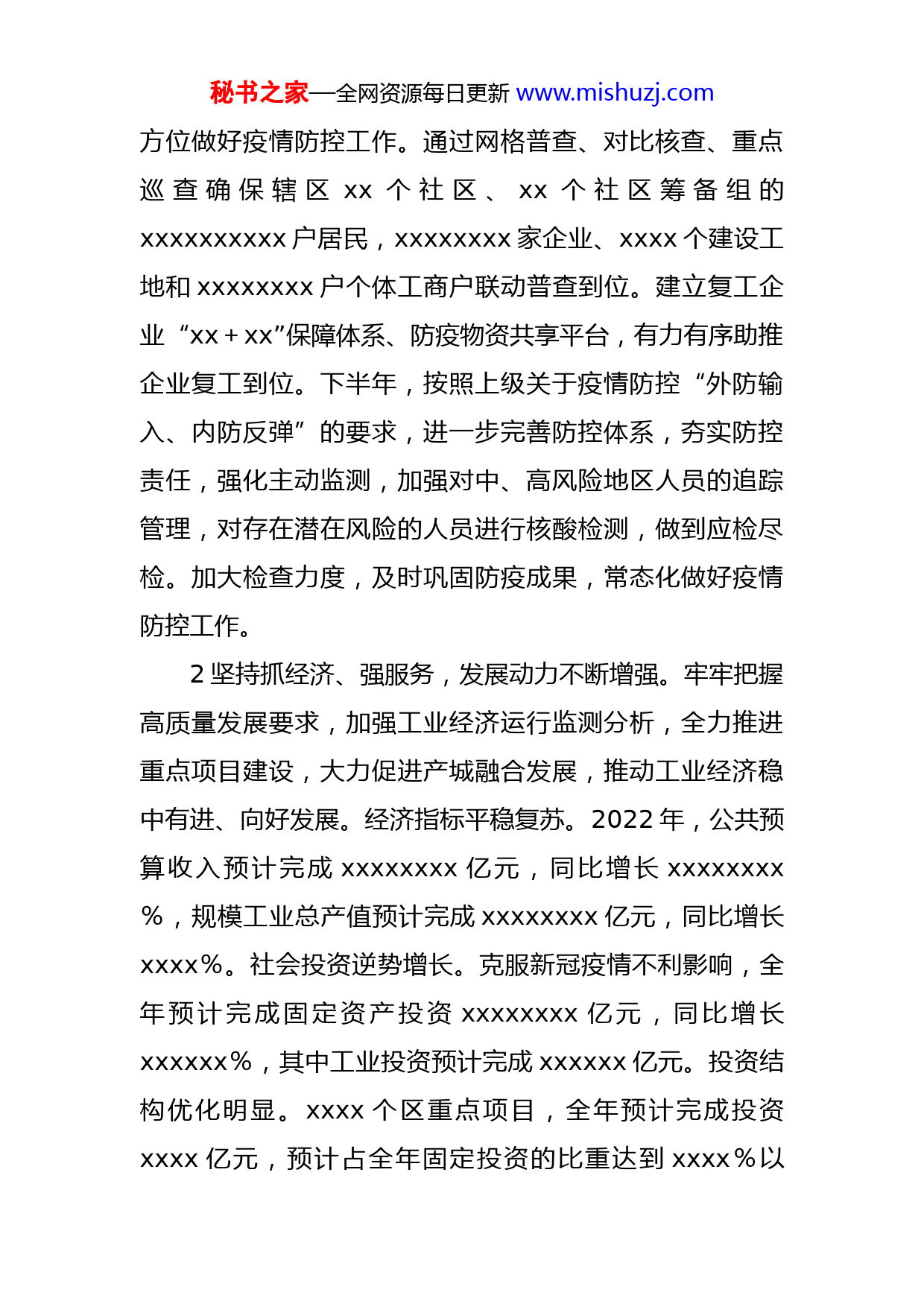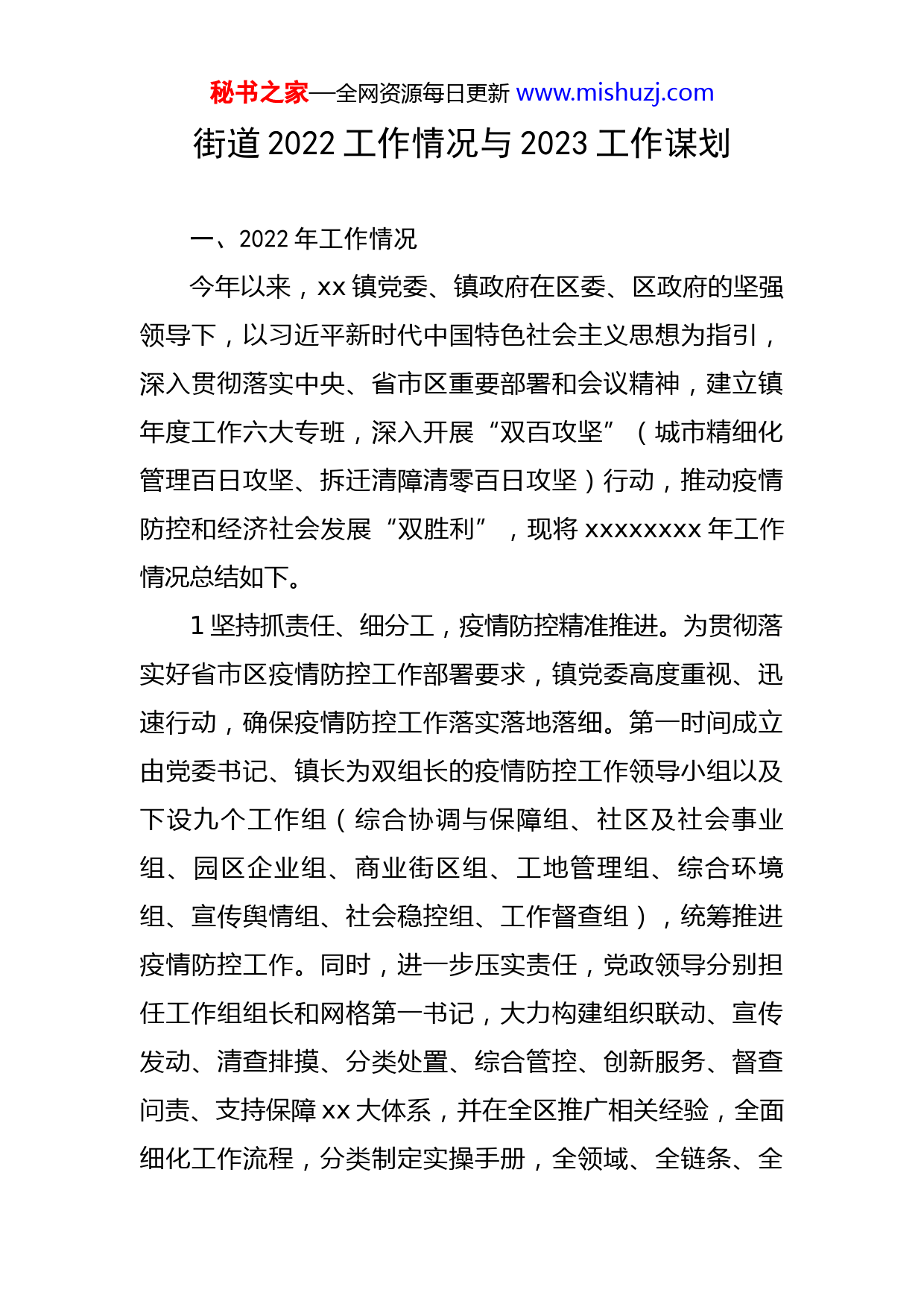 秘书之家—全网资源每日更新www.mishuzj.com街道2022工作情况与2023工作谋划一、2022年工作情况今年以来,xx镇党委、镇政府在区委、区政府的坚强领导下,以习近平新时代中国特色社会主义思想为指引,深入贯彻落实中央、省市区重要部署和会议精神,建立镇年度工作六大专班,深入开展“双百攻坚”(城市精细化管理百日攻坚、拆迁清障清零百日攻坚)行动,推动疫情防控和经济社会发展“双胜利”,现将xxxxxxxx年工作情况总结如下。1坚持抓责任、细分工,疫情防控精准推进。为贯彻落实好省市区疫情防控工作部署要求,镇党委高度重视、迅速行动,确保疫情防控工作落实落地落细。第一时间成立由党委书记、镇长为双组长的疫情防控工作领导小组以及下设九个工作组(综合协调与保障组、社区及社会事业组、园区企业组、商业街区组、工地管理组、综合环境组、宣传舆情组、社会稳控组、工作督查组),统筹推进疫情防控工作。同时,进一步压实责任,党政领导分别担任工作组组长和网格第一书记,大力构建组织联动、宣传发动、清查排摸、分类处置、综合管控、创新服务、督查问责、支持保障xx大体系,并在全区推广相关经验,全面细化工作流程,分类制定实操手册,全领域、全链条、全秘书之家—全网资源每日更新www.mishuzj.com方位做好疫情防控工作。通过网格普查、对比核查、重点巡查确保辖区xx个社区、xx个社区筹备组的xxxxxxxxxx户居民,xxxxxxxx家企业、xxxx个建设工地和xxxxxxxx户个体工商户联动普查到位。建立复工企业“xx+xx”保障体系、防疫物资共享平台,有力有序助推企业复工到位。下半年,按照上级关于疫情防控“外防输入、内防反弹”的要求,进一步完善防控体系,夯实防控责任,强化主动监测,加强对中、高风险地区人员的追踪管理,对存在潜在风险的人员进行核酸检测,做到应检尽检。加大检查力度,及时巩固防疫成果,常态化做好疫情防控工作。2坚持抓经济、强服务,发展动力不断增强。牢牢把握高质量发展要求,加强工业经济运行监测分析,全力推进重点项目建设,大力促进产城融合发展,推动工业经济稳中有进、向好发展。经济指标平稳复苏。2022年,公共预算收入预计完成xxxxxxxx亿元,同比增长xxxxxxxx%,规模工业总产值预计完成xxxxxxxx亿元,同比增长xxxx%。社会投资逆势增长。克服新冠疫情不利影响,全年预计完成固定资产投资xxxxxxxx亿元,同比增长xxxxxx%,其中工业投资预计完成xxxxxx亿元。投资结构优化明显。xxxx个区重点项目,全年预计完成投资xxxx亿元,预计占全年固定投资的比重达到xxxx%以秘书之家—全网资源每日更新www.mishuzj.com上,较xxxxxxxx年提升xxxx个百分点。高技术产业投资预计完成xx亿元,完成年度目标的xxxxxx%,超额完成全年任务。科技人才助力发展。全年新增省双创人才xx名,引进“龙城英才计划”领军人才xx名,市领军型创新人才xx名,引进紧缺人才xxxx名。全年新申报高新技术企业xxxx家,规上工业研发活动企业数达到xxxx家,规上企业研发经费预计xxxxxx亿元,技术合同成交额xxxx亿元。企业上市势头强劲。xxxxxxxx年xx于xx月香港上市,XX预计xxxx月报会。xx完成股改,一大批上市后备企业为镇经济发展提供了强劲动力。安全生产常抓不懈。针对镇主要风险点,扎实开展日常检查,截至目前,共检查企业xxxx家,梳理隐患xxxxxx条,现已全部完成整改;深入开展行业领域专项整治、“小化工”整治,排查园区内的xxxxxx家六类“小字头”场所,责令xx家废品收购站限期搬离,xx家停业整顿。环保监察攻坚克难。紧抓大气污染防治,做好日常巡查、扬尘管控,加快完善区域管网,开展截污工程,重点监测危废企业土壤染污状态,打好蓝天、碧水、净土三大保卫战。企业服务成效显著。组织xx申报xx市信用贯标企业;xx入围xxxxxxxx年中国优秀工业设计奖复评产品,为xx唯一;xx批xx市企业技术中心;xx成功认定为xx制造创新产品;xx“xxG+智慧工厂”获得国家工信部第三届“绽放杯”xxG应用秘书之家—全网资源每日更新www.mishuzj.com征集大赛一等奖。积极争取上级政策。全年累计为企业争取资金近xxxxxxxx万元,其中xx家企业获得“三位一体”有效投入项目补助,共计xxxxxxxxxx万元;xx获得xxxxxxxx年度第二批省级工业和信息产业转型升级专项资金xxxxxxxx万元;xx年产xx万吨光学级聚酯基膜项目获得省发改委专项资金xxxxxxxx万。3坚持抓整治、补短板,城市面貌出精出新。以“双百攻坚”行动为契机,积极落实管理明星城市的要求,推进城市精细精准管理,全力提升城市治理水平,打造文明美丽的品质xx。城市建设日益完善。不断完善小区服务设施,构建宜居社区,今年以来,xx电动车停车库智能化改造系统工程、xx停车建设工程、老旧小区的基础设施提升改造工程等陆续实施;不断提升绿化景观,打造生态绿廊,预计年内完工xx卫生院西侧绿地、xx二期西侧绿地两个景观节点,总面积约xxxxxxxxxx平方米;积极协调对接,梳理安置房产权办理流程,推进安置房产权补办工作;有序推进城市更新,夯实城市公共设施和基础服务设施,完成xxxx座桥梁整修,对道路的标志、标线、标杆、标志牌、信号灯等交通设施进行完善;盘活土地存量,回收美的xx地块及xx地块共约xxxx亩土地使用权,进一步拓展转型升级的空间;规范管理闲置土地,调查整理辖区内近xxxxxx亩土地,最大程度上保留辖区内建设用地,为秘书之家—全网资源每日更新ww