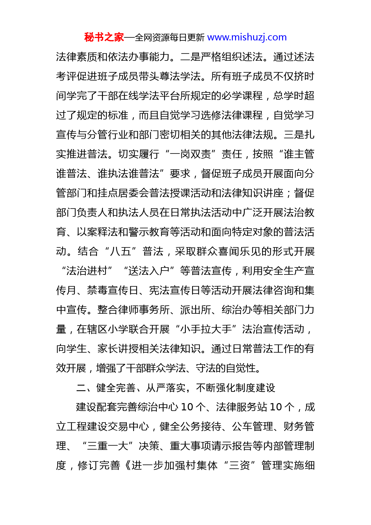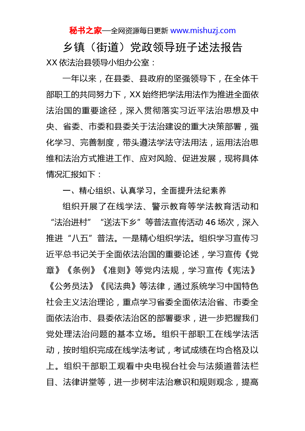 秘书之家—全网资源每日更新www.mishuzj.com乡镇(街道)党政领导班子述法报告XX依法治县领导小组办公室:一年以来,在县委、县政府的坚强领导下,在全体干部职工的共同努力下,XX始终把学法用法作为推进全面依法治国的重要途径,深入贯彻落实习近平法治思想及中央、省委、市委和县委关于法治建设的重大决策部署,强化学习、完善制度,带头遵法学法守法用法,运用法治思维和法治方式推进工作、应对风险、促进发展,现将具体情况汇报如下:一、精心组织、认真学习,全面提升法纪素养组织开展了在线学法、警示教育等学法教育活动和“法治进村”“送法下乡”等普法宣传活动46场次,深入推进“八五”普法。一是精心组织学法。组织学习宣传习近平总书记关于全面依法治国的重要论述,学习宣传《党章》《条例》《准则》等党内法规,学习宣传《宪法》《公务员法》《民法典》等法律,通过系统学习中国特色社会主义法治理论,重点学习省委全面依法治省、市委全面依法治市、县委依法治区的部署要求,进一步把握我们党处理法治问题的基本立场。组织干部职工在线学法活动,按时组织完成在线学法考试,考试成绩在均合格及以上。组织干部职工观看中央电视台社会与法频道普法栏目、法律讲堂等,进一步树牢法治意识和规则观念,提高秘书之家—全网资源每日更新www.mishuzj.com法律素质和依法办事能力。二是严格组织述法。通过述法考评促进班子成员带头尊法学法。所有班子成员不仅挤时间学完了干部在线学法平台所规定的必学课程,总学时超过了规定的标准,而且自觉学习选修法律课程,自觉学习宣传与分管行业和部门密切相关的其他法律法规。三是扎实推进普法。切实履行“一岗双责”责任,按照“谁主管谁普法、谁执法谁普法”要求,督促班子成员开展面向分管部门和挂点居委会普法授课活动和法律知识讲座;督促部门负责人和执法人员在日常执法活动中广泛开展法治教育、以案释法和警示教育等活动和面向特定对象的普法活动。结合“八五”普法,采取群众喜闻乐见的形式开展“法治进村”“送法入户”等普法宣传,利用安全生产宣传月、禁毒宣传日、宪法宣传日等活动开展法律咨询和集中宣传。整合律师事务所、派出所、综治办等相关部门力量,在辖区小学联合开展“小手拉大手”法治宣传活动,向学生、家长讲授相关法律知识。通过日常普法工作的有效开展,增强了干部群众学法、守法的自觉性。二、健全完善、从严落实,不断强化制度建设建设配套完善综治中心10个、法律服务站10个,成立工程建设交易中心,健全公务接待、公车管理、财务管理、“三重一大”决策、重大事项请示报告等内部管理制度,修订完善《进一步加强村集体“三资”管理实施细秘书之家—全网资源每日更新www.mishuzj.com则》《进一步加强工程建设管理规定》《进一步加强村集体福利津贴发放、费用报销管理的通知》《进一步规范社区办公司企业的通知》等相关工作制度,夯实基层基础、健全完善机制,着力提升法治工作制度化、规范化、科学化水平,及时堵塞工程招投标、项目建设、三资管理等重点领域、关键环节制度漏洞,合理规范机关干部依法行政行为。坚持民主集中制,所有重大事项均由党(工)委会研究决定,做到事前有谋划、事中有商量、决定有记录。严格按照《党政干部选拔任用条例》规定和程序任用干部,按规定实行表决确定人选,杜绝用人上的不正之风。严把干部入口关,严格按照《干部任用条例》的规定和要求选任干部。三、依规办事、依法行政,坚持规范履职为民XX坚持学法守法,合理用法,不断强化宪法和法律至上、法大于权、权服从于法的意识,时刻把党纪国法当作利剑常挂头顶,坚决摒弃以言代法、以权压法的思维和作风,真正做到带头用法,带头守法。不断强化法律法规宣传,加强对党员干部的行为引导,大力开展文明单位创建活动。年内,各项工作没有申请行政复议或复议被撤销变更案件,没有造成集体性越级上访事件,没有执法人员被确认为不作为、乱作为、越权行政的情况,XX政治环境风清气正。秘书之家—全网资源每日更新www.mishuzj.com四、廉洁自律、率先垂范,树牢公道正派形象认真组织领导干部学习党和国家关于党风廉政建设的若干规定、各项党纪政纪的精神实质。开展廉政教育,将廉洁、勤奋、正直作为工作和干部生活准则。在思想上,坚决构筑反腐倡廉、拒腐防变的防线,牢固树立廉洁从政、服务群众的思想。严格重点部门、重要领域监管,特别是在工程建设和资金拨付方面,所有项目招投标、施工监督及工程验收,资金拨付等环节都严格按照招标办法等制度和程序去办,要求纪(工)委全程参与,有效避免违纪违规行为发生。进一步规范财务制度管理。加强对XX属条线单位的账户管理,实行“收支两条线”。全面实行村账XX代理制度,加强对村级组织的日常审计和村级财务管理和村级工程管理,有效维护了村级组织集体经济利益。各班子成员、干部职工也能严格执行廉洁自律规定,一年来,没有违反规定和制度的行为,没有越权办事、滥用职权、以权谋私的行为。五、培根铸魂、强基固本,建设崇法善治队伍配齐配强司法、法务咨询、公安、民警等党内法规工作人员XX人,组建政法网军“地方团队”XX人,一以贯之坚持带头守法