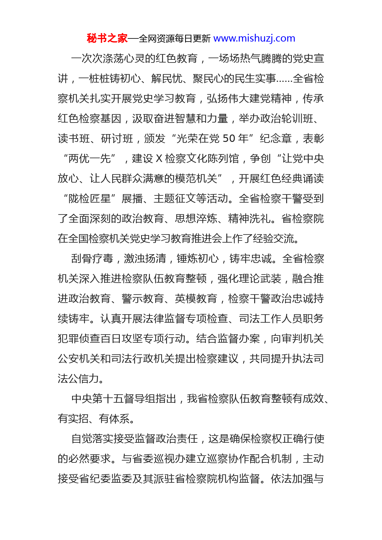 秘书之家—全网资源每日更新www.mishuzj.com书写服务高质量发展“检察答卷”——党的十八大以来全省检察工作综述千帆竞发,百舸争流。党的十八大以来,全省检察机关坚持以习近平新时代中国特色社会主义思想为指导,全面学习贯彻习近平法治思想,坚持“两聚焦一结合”工作思路,紧盯X检察工作“进入全国中偏上水平”奋斗目标,结合我省实际,强化政治引领,深耕主责主业,加强基层基础,忠实履行法律监督职能,各项工作取得新成绩,为全省高质量发展提供有力的法治保障。艰难方显勇毅,磨砺始得玉成。十年来,全省检察机关成功办理了一批“检察名案”,涌现出了一批“检察名人”,一项项亮点工作、一个个检察榜样,打造了X检察的优质品牌,也烙下了X检察人不忘初心、公正司法、执法为民的历史印记。强化政治引领确保正确方向十年来,全省检察机关始终把党的政治建设放在首位,落实到检察工作全过程各方面。坚持党对检察工作的绝对领导,增强“四个意识”、坚定“四个自信”、做到“两个维护”,坚决贯彻《中国共产党政法工作条例》《中国共产党重大事项请示报告条例》,谋划推进“十四五”时期全省检察工作。秘书之家—全网资源每日更新www.mishuzj.com一次次涤荡心灵的红色教育,一场场热气腾腾的党史宣讲,一桩桩铸初心、解民忧、聚民心的民生实事……全省检察机关扎实开展党史学习教育,弘扬伟大建党精神,传承红色检察基因,汲取奋进智慧和力量,举办政治轮训班、读书班、研讨班,颁发“光荣在党50年”纪念章,表彰“两优一先”,建设X检察文化陈列馆,争创“让党中央放心、让人民群众满意的模范机关”,开展红色经典诵读“陇检匠星”展播、主题征文等活动。全省检察干警受到了全面深刻的政治教育、思想淬炼、精神洗礼。省检察院在全国检察机关党史学习教育推进会上作了经验交流。刮骨疗毒,激浊扬清,锤炼初心,铸牢忠诚。全省检察机关深入推进检察队伍教育整顿,强化理论武装,融合推进政治教育、警示教育、英模教育,检察干警政治忠诚持续铸牢。认真开展法律监督专项检查、司法工作人员职务犯罪侦查百日攻坚专项行动。结合监督办案,向审判机关公安机关和司法行政机关提出检察建议,共同提升执法司法公信力。中央第十五督导组指出,我省检察队伍教育整顿有成效、有实招、有体系。自觉落实接受监督政治责任,这是确保检察权正确行使的必然要求。与省委巡视办建立巡察协作配合机制,主动接受省纪委监委及其派驻省检察院机构监督。依法加强与秘书之家—全网资源每日更新www.mishuzj.com监委、法院、公安机关的配合和制约,对法院判决无罪的公诉案件,逐案自查分析,提升审查起诉质量;对公安机关提请复议复核的案件,严格依法重新审查。同时,加强检律协作、检媒互动,定期与司法行政机关、律协、新闻媒体座谈交流,真诚听取意见建议,让接受监督成为常态。立足检察职能服务中心大局不谋全局者,不足以谋一域。服务改革发展大局,一直是检察工作的出发点和落脚点。十年来,全省检察机关立足省情实际和检察职能,始终将服务大局作为重大使命,主动将检察工作融入大局中谋划推进,对标中央、最高检省委决策部署,扎实推进服务中心大局“六项重点工作”用实干担当书写了服务高质量发展的“检察答卷”。全省检察机关坚决维护国家政治安全和社会稳定,依法严惩严重暴力犯罪,深入推进扫黑除恶专项斗争,依法办理了全国扫黑办、最高检挂牌督办的兰州“2·12”特大“套路贷”案等一批重点案件。联合省扫黑办向14家监管单位集中公开送达检察建议书,经验做法被全国扫黑办、最高检肯定推广。常态化开展扫黑除恶斗争以来,起诉涉黑涉恶犯罪218人。同时,深化重点行业领域治理,突出惩治安全生产领域犯罪,加大惩治电信网络诈骗犯罪力度,从严追诉金融诈骗、破坏金融管理秩序犯罪,依法办理了秘书之家—全网资源每日更新www.mishuzj.com“4·11”地下钱庄案、“2·27”票据诈骗案等特大金融犯罪案件。全省检察机关促进优化营商法治环境,依法平等保护各类市场主体,大力支持企业经营发展,让法治成为最好的营商环境。加大民营企业平等保护力度,联合省工商联开展为期3年的“维护民企权益、优化营商环境”专项行动。制定涉民企案件“慎捕慎诉”实施细则,建立三级院同步审查机制。持续开展“千人进万企”大调研大走访大排查活动,自主研发服务保障信息平台。常态化开展涉民企“挂案”清理,开展送法进企业“百场法治培训”,编发法律风险防控指引,引导企业守法合规经营。助力巩固脱贫攻坚成果、助推乡村振兴,出台“15条意见”,发挥检察职能,为巩固脱贫成果、推进乡村振兴提供有力法治保障。严厉打击涉农刑事犯罪,积极办理涉农职务犯罪案件,用好国家司法救助制度,常态化开展侵害农民工权益犯罪专项监督,积极参与“控辍保学”行动,运用检察建议、支持起诉、庭审说法等方式,帮助失辍学学生重返校园。深化生态环境司法保护,紧扣我省生态地位重要、生态环境脆弱的情况,出台服务生态环保“10项举措”,发挥打击犯罪、诉讼监督、公益诉讼等职能作用,助力污染防治攻坚,守护蓝天碧水净土。建立健全“河长+检察长”协秘书之家—全网资源每日更新www.mishuzj.com作机制,深入推进“