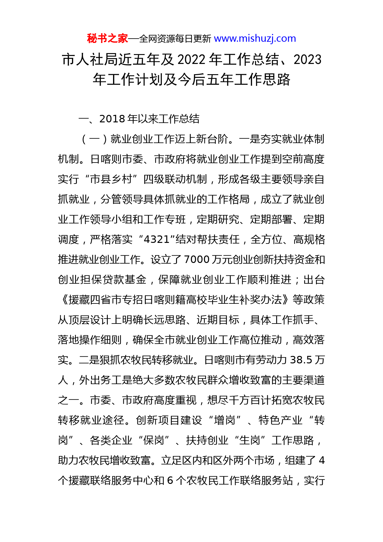 秘书之家—全网资源每日更新www.mishuzj.com市人社局近五年及2022年工作总结、2023年工作计划及今后五年工作思路一、2018年以来工作总结(一)就业创业工作迈上新台阶。一是夯实就业体制机制。日喀则市委、市政府将就业创业工作提到空前高度实行“市县乡村”四级联动机制,形成各级主要领导亲自抓就业,分管领导具体抓就业的工作格局,成立了就业创业工作领导小组和工作专班,定期研究、定期部署、定期调度,严格落实“4321”结对帮扶责任,全方位、高规格推进就业创业工作。设立了7000万元创业创新扶持资金和创业担保贷款基金,保障就业创业工作顺利推进;出台《援藏四省市专招日喀则籍高校毕业生补奖办法》等政策从顶层设计上明确长远思路、近期目标,具体工作抓手、落地操作细则,确保全市就业创业工作高位推动,高效落实。二是狠抓农牧民转移就业。日喀则市有劳动力38.5万人,外出务工是绝大多数农牧民群众增收致富的主要渠道之一。市委、市政府高度重视,想尽千方百计拓宽农牧民转移就业途径。创新项目建设“增岗”、特色产业“转岗”、各类企业“保岗”、扶持创业“生岗”工作思路,助力农牧民增收致富。立足区内和区外两个市场,组建了4个援藏联络服务中心和6个农牧民工作联络服务站,实行秘书之家—全网资源每日更新www.mishuzj.com“点对点”输送,“一站式”服务。创新“六位一体”劳务输出模式,组建劳务公司42家,劳务合作社844个,培育村居劳务经纪人1653人,搭建就业平台,提供用工信息,保障农牧民权益。实现了转移就业从“单打独斗”向“联合作战”转变,全市组织化转移就业达60%以上。形成“珠峰劳务”等一系列知名劳务品牌,全区农牧民转移就业工作现场会,连续2次在我市召开,进行经验推广。三是狠抓大学生就业创业。按照习近平总书记“民生首先是就业”的指示要求,区市党委、政府高度重视大学生就业创业工作,紧紧围绕“八个精准”,加大政策扶持和资金支持,全力推进大学生就业创业工作。在全区率先实施“4321”结对帮扶机制,2.13万人次党员干部与2.94万名大学生结对子。按照“N+3”模式,“一对一”、“面对面”讲政策,推岗位,促就业。以“五进一送”为抓手,以典型成功案例为示范引领,每年提前进校园进企业进机关,宣讲就业形势和就业创业优惠政策,引导学生和家长转变就业观念,适应新形势。成立了高校毕业生就业指导中心,落实全部高校毕业生实名制登记管理,提前了解所学专业,就业意愿,精准推送就业岗位,及时掌握就业动态。每年开发和搜集各类岗位5万多个,积极争取援藏4省市2企业岗位支持,举办多场次“线上线下”招聘会,通过创业大赛和就业创业论坛等多种形式,多层次、多领秘书之家—全网资源每日更新www.mishuzj.com域、多元化推进就业。按照6000元/月标准与实际月工资差额,对专招生进行奖补,鼓励大学生区外就业。已为735人次高校毕业生兑现工资补差735万元。市委、市政府设立了3000万元的创业创新扶持资金,4000万元的创业担保基金,打造1家自治区级“创业孵化”基地,授予23家企业“创百店扶千生”基地,充分释放政策红利,提振高校毕业生就业创业积极性。近些年,落实各类就业创业补贴1.52亿元,惠及1.06万人次高校毕业生。四是狠抓就业援藏工作。上海、山东、黑龙江、吉林4省市,以及宝武、中化2企业,坚决贯彻落实以习近平同志为核心的党中央战略部署,提高政治站位,把援助日喀则就业工作,作为加强合作交流、促进边疆发展稳定和民族团结的重大政治任务。真心真意、竭尽全力,帮助解决日喀则籍高校毕业生就业。在自身编制紧缺、就业压力很大的情况下,提供企事业岗位2.3万个,敞开大门、广开绿灯,帮助435名日喀则籍高校毕业生走出日喀则,到内地援藏省市、企业实现了就业,赋予了促进各民族交往交流交融新的时代内涵。多次选派专家赴我市参加珠峰创业论坛,营造就业创业浓厚氛围。免费为我市300余名大学生,开展创业师资培训、大学生电子商务暨“双创”培训、幼教、科技、农业农村专业培训。成立了援藏就业见习基地,让我们的大学生能够到内地开眼界,学本领,长才干。同时秘书之家—全网资源每日更新www.mishuzj.com其他省市也积极响应“中央关心西藏,全国支援西藏”的伟大号召,用心用情用力帮助我市249名农牧民,在惠州、无锡、扬州、南京实现了“组团式”就业,开辟了区外就业新途径。以就业为载体,进一步铸牢中华民族共同体意识。(二)社会保障工作实现新提升。坚持完善社保服务体系,扩大社保信息系统覆盖面,延伸服务至18县(区),扎实开展社保扶贫“三年行动”,着力在资源整合、扩面征缴、政策宣传、基金安全、社保扶贫等方面做文章,全力打造“制度配套完备,覆盖范围广泛,手续衔接畅通,资金运行安全,兜底作用显现”的全市社会保障体系。一是社会保险参保范围不断扩大。根据《西藏自治区完善企业职工基本养老保险制度实施方案》(藏政发〔2006〕37号)、《西藏自治区机关事业单位工作人员养老保险制度改革实施细则》的通知(藏人社发〔2017〕98号)等相关文件要求,加大各项社会保险参保宣传,坚持应保尽保努力提高社会保险覆盖面入手,五年来参加城镇职工养老保险人数从1.82万人上升到2.83万人,增幅55.3%,工伤保险从2.49万人上升到6.33万人,增幅153