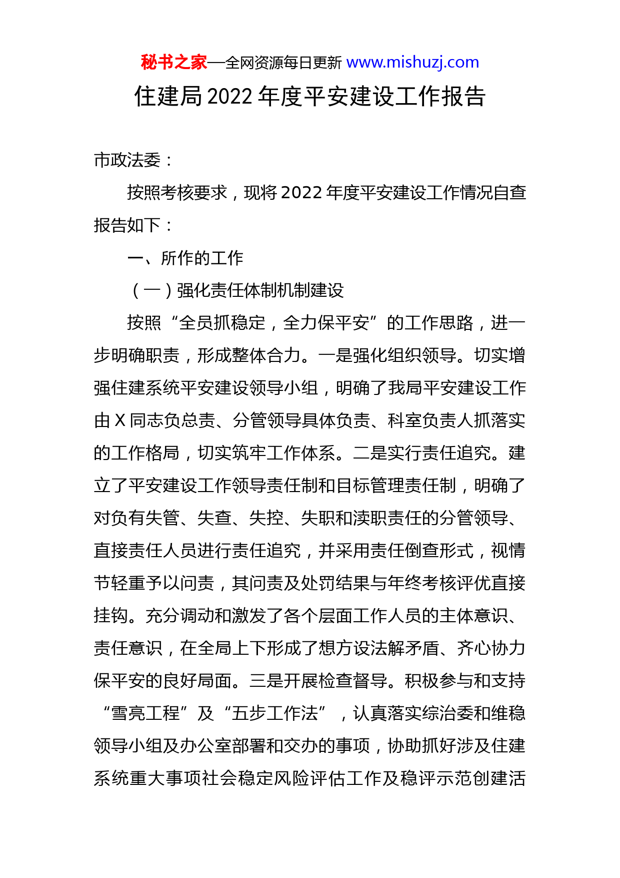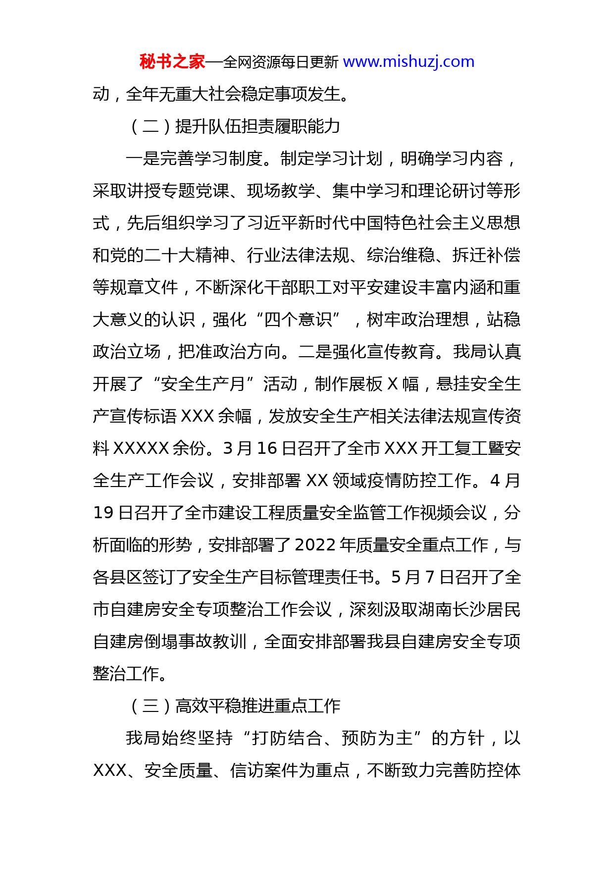 秘书之家—全网资源每日更新www.mishuzj.com住建局2022年度平安建设工作报告市政法委:按照考核要求,现将2022年度平安建设工作情况自查报告如下:一、所作的工作(一)强化责任体制机制建设按照“全员抓稳定,全力保平安”的工作思路,进一步明确职责,形成整体合力。一是强化组织领导。切实增强住建系统平安建设领导小组,明确了我局平安建设工作由X同志负总责、分管领导具体负责、科室负责人抓落实的工作格局,切实筑牢工作体系。二是实行责任追究。建立了平安建设工作领导责任制和目标管理责任制,明确了对负有失管、失查、失控、失职和渎职责任的分管领导、直接责任人员进行责任追究,并采用责任倒查形式,视情节轻重予以问责,其问责及处罚结果与年终考核评优直接挂钩。充分调动和激发了各个层面工作人员的主体意识、责任意识,在全局上下形成了想方设法解矛盾、齐心协力保平安的良好局面。三是开展检查督导。积极参与和支持“雪亮工程”及“五步工作法”,认真落实综治委和维稳领导小组及办公室部署和交办的事项,协助抓好涉及住建系统重大事项社会稳定风险评估工作及稳评示范创建活秘书之家—全网资源每日更新www.mishuzj.com动,全年无重大社会稳定事项发生。(二)提升队伍担责履职能力一是完善学习制度。制定学习计划,明确学习内容,采取讲授专题党课、现场教学、集中学习和理论研讨等形式,先后组织学习了习近平新时代中国特色社会主义思想和党的二十大精神、行业法律法规、综治维稳、拆迁补偿等规章文件,不断深化干部职工对平安建设丰富内涵和重大意义的认识,强化“四个意识”,树牢政治理想,站稳政治立场,把准政治方向。二是强化宣传教育。我局认真开展了“安全生产月”活动,制作展板X幅,悬挂安全生产宣传标语XXX余幅,发放安全生产相关法律法规宣传资料XXXXX余份。3月16日召开了全市XXX开工复工暨安全生产工作会议,安排部署XX领域疫情防控工作。4月19日召开了全市建设工程质量安全监管工作视频会议,分析面临的形势,安排部署了2022年质量安全重点工作,与各县区签订了安全生产目标管理责任书。5月7日召开了全市自建房安全专项整治工作会议,深刻汲取湖南长沙居民自建房倒塌事故教训,全面安排部署我县自建房安全专项整治工作。(三)高效平稳推进重点工作我局始终坚持“打防结合、预防为主”的方针,以XXX、安全质量、信访案件为重点,不断致力完善防控体秘书之家—全网资源每日更新www.mishuzj.com系,落实目标责任,将平安建设贯穿于各项重要工作。一是整顿建筑市场秩序。持续深化“放管服”改革工作,推行“不见面”审批事项,从6月份起XXXX企业资质证书开始使用电子证书,取消证明材料XX项;三季度全市完成产值XX亿元,同比增长XXX%,实现增加值XXX亿元,同比增长XXX%。预计全年实现增加值XX亿元,同比增长X%;帮助企业完善各项管理制度,强化从业人员管理和培训,全年晋升二级企业资质XX户,处理XX起专业技术人员投诉案件;全面推行农民工工资银行卡支付制度。大力开展《农民工工资支付条例》宣贯工作。全市XXX系统XXX名干部职工通过了《条例》的网络培训考核。全市XXX项在建项目录入“XXX”信息系统。解决拖欠农民工工资上访案件X起、转批督办X起,化解了社会潜在的矛盾;进一步完善执业注册人员管理。建造师职业注册登记XXX人,退回信息不完善人员XXX人次,重新审核上报XXX人次。二是强化工程质量安全监管。开展了市级层面质量安全大检查X次,检查工程项目XXX项,下发整改通知书XX份、安全质量隐患和问题清单XX份;检测机构XX家,预拌混凝土生产企业XX家,查出安全隐患XX条,下发整改通知XXX份,隐患整改率达到100%。对X名建造师和X名总监未到岗履职行为,移交县区实施处罚。各县区累计检查在建项目X项,下发整改通知XX份,秘书之家—全网资源每日更新www.mishuzj.com停工通知X份;建立了住建系统隐患排查治理预防机制,制定了重大安全风险管理制度,印发了安全生产风险分级管控与隐患排查治理工作手册;继续强化信息化监管工作。全市工程造价3000万元以上或面积20000平方米以上的XX项在建项目的全面实施了现场远程视频监控;积极推进疫情防控各项措施有效落实。制定了疫情防控工作要点和复工复产工作实施方案。研发了XX市建筑施工企业复工登记备案系统,实现建筑工人扫码登记,创新了复工人员疫情防控新措施。排查疫情隔离观察场所XX个,开复工项目XXX个,工地内集中居住板房XX座,工地外集中租居地XX处;持续开展未竣工验收擅自投入使用项目乱象整治工作。截止11月底,各县区督促整改XX项,未完成整改X项,整改率XX%;持续开展安全生产专项整治三年行动,全面开展建筑安全风险隐患排查整治工作,重点整治住建领域违法违规建设审批和人员聚集场所建筑安全风险隐患;全面推进施工企业本质安全体系建设。截止目前,我市确定了X家本质安全体系示范性施工企业;全面推行工程项目和企业安全生产标准化工作,工程项目基本实现了安全标准化自评全覆盖,竣工项目安全标准化考评率达到了100%,建筑施工企业安全标准化考评率达到了100%。三是注重招标投标过程监督。增强了政府投资项目的招投标监管工作,截止11月底,完成现场监管交易XXX秘书之家—全网资源每日更新www.mishuzj.com项(其中:勘察X项、
