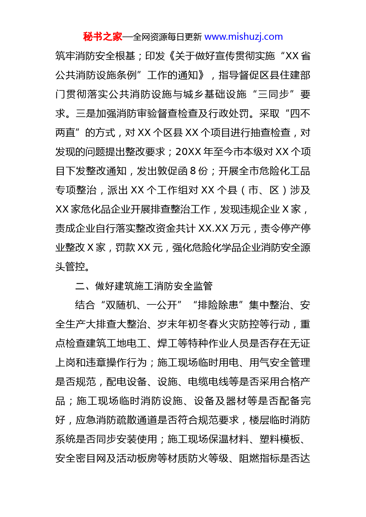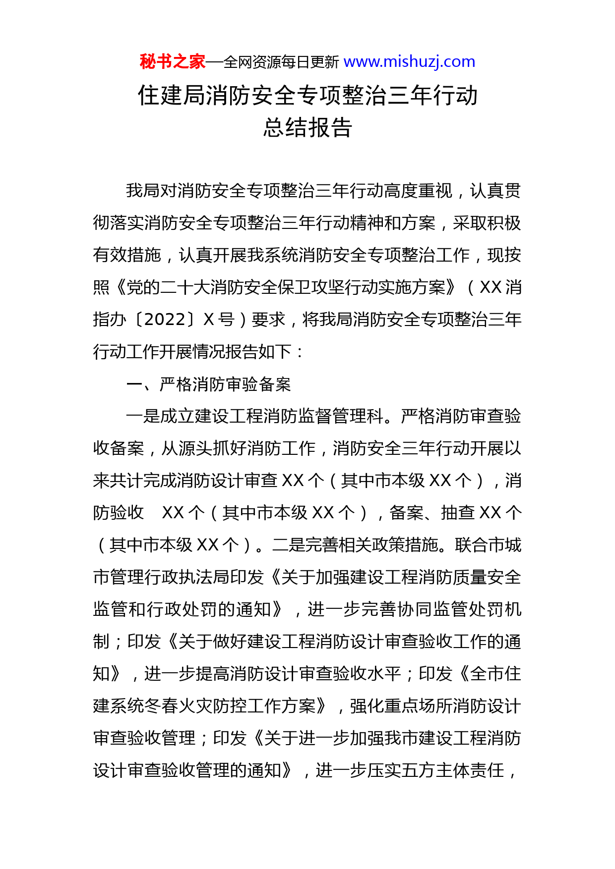 秘书之家—全网资源每日更新www.mishuzj.com住建局消防安全专项整治三年行动总结报告我局对消防安全专项整治三年行动高度重视,认真贯彻落实消防安全专项整治三年行动精神和方案,采取积极有效措施,认真开展我系统消防安全专项整治工作,现按照《党的二十大消防安全保卫攻坚行动实施方案》(XX消指办〔2022〕X号)要求,将我局消防安全专项整治三年行动工作开展情况报告如下:一、严格消防审验备案一是成立建设工程消防监督管理科。严格消防审查验收备案,从源头抓好消防工作,消防安全三年行动开展以来共计完成消防设计审查XX个(其中市本级XX个),消防验收XX个(其中市本级XX个),备案、抽查XX个(其中市本级XX个)。二是完善相关政策措施。联合市城市管理行政执法局印发《关于加强建设工程消防质量安全监管和行政处罚的通知》,进一步完善协同监管处罚机制;印发《关于做好建设工程消防设计审查验收工作的通知》,进一步提高消防设计审查验收水平;印发《全市住建系统冬春火灾防控工作方案》,强化重点场所消防设计审查验收管理;印发《关于进一步加强我市建设工程消防设计审查验收管理的通知》,进一步压实五方主体责任,秘书之家—全网资源每日更新www.mishuzj.com筑牢消防安全根基;印发《关于做好宣传贯彻实施“XX省公共消防设施条例”工作的通知》,指导督促区县住建部门贯彻落实公共消防设施与城乡基础设施“三同步”要求。三是加强消防审验督查检查及行政处罚。采取“四不两直”的方式,对XX个区县XX个项目进行抽查检查,对发现的问题提出整改要求;20XX年至今市本级对XX个项目下发整改通知,发出敦促函8份;开展全市危险化工品专项整治,派出XX个工作组对XX个县(市、区)涉及XX家危化品企业开展排查整治工作,发现违规企业X家,责成企业自行落实整改资金共计XX.XX万元,责令停产停业整改X家,罚款XX元,强化危险化学品企业消防安全源头管控。二、做好建筑施工消防安全监管结合“双随机、一公开”“排险除患”集中整治、安全生产大排查大整治、岁末年初冬春火灾防控等行动,重点检查建筑工地电工、焊工等特种作业人员是否存在无证上岗和违章操作行为;施工现场临时用电、用气安全管理是否规范,配电设备、设施、电缆电线等是否采用合格产品;施工现场临时消防设施、设备及器材等是否配备完好,应急消防疏散通道是否符合规范要求,楼层临时消防系统是否同步安装使用;施工现场保温材料、塑料模板、安全密目网及活动板房等材质防火等级、阻燃指标是否达秘书之家—全网资源每日更新www.mishuzj.com标;易燃可燃物品安全管理是否集中堆放并规范管理,防火间距是否符合规范要求,是否按照《建设工程施工现场消防安全技术规范》设置消防车道、临时给水、应急照明,并配备灭火器材、设施;是否建立消防安全制度、技术措施和火灾事故应急救援预案等,每年组织示范观摩活动,定期开展相关应急演练。近三年,共发出抽查记录XX份,限期整改通知书XX份,停工整改通知书XX份,约谈责任主体单位XX次,移交城管查处项目XX个,对XX个项目经理和XX个总监人员、X家企业进行不良行为扣分。三、拧紧城镇燃气安全阀门一是开展专项整治工作。按照省、市城镇燃气排查整治工作部署,统筹组织机关单位、乡镇社区、燃气企业、物业公司等各方力量,全面推进我市城镇燃气安全排查整治工作。截至目前,全市城镇燃气排查专项整治累计完成整治包含居民、非居等问题隐患XX个,查处燃气违法违规行为XX起,下架违法燃气具XX个,处罚金XX余万元。市级相关部门组成的XX个督导组,分片区对XXX个点位进行了督导,发现问题点位XX个,向区县政府发出问题交办函XX份,切实传导压力、压实责任。责令停止销售X家,下架违规热水器X台、违规灶具X台;排查居民、非居燃气热水器类问题XX户,发现存在燃气热水器超年限使用、烟道未伸出窗外等问题XX家,完成整治XX家,限期秘书之家—全网资源每日更新www.mishuzj.com整改XX家。二是开展城镇燃气老旧管网更新改造工作。抢抓“十四五”规划编制机遇期,指导各地充分利用城市更新、老旧小区改造等政策,分期分批加快推动老旧燃气管网改造项目实施。三是加大燃气安全宣传力度。开展“燃气安全进万家”活动,采取短信、微信、社区宣传等多渠道多方式加强安全用气教育培训,在物业小区、小区、街道、社区、乡镇等张贴安全用气须知宣传普及燃气法律法规和安全用气常识。通过微信公众号、政府官网发布《关于严格遵守燃气安全法律法规依法处置违法行为的通告》,有效提升群众燃气安全意识。制作张贴“XX市城镇燃气监督卡”,广泛发动群众参与、监督燃气安全排查整治工作。专项整治期间,通过各类媒介发布安全用气公开信XX余次、短视频XX个、提示短信XXX.X余万条、明白卡XX余万份、宣传海报XXXX余份、宣传标语XXX余幅、公益广告XX条,开展现场宣传XX次,有效提升群众燃气安全意识,营造重视燃气安全的浓厚氛围。四、加强主城区公园广场消防安全隐患排查一是加强主城区广场、城市公园、广场易燃、易爆品等火灾隐患排查力度,强化用电安全,严格火源管理和动火作业。重点检查了消防通道、安全出口是否畅通,消防灭火器材是否完好可用,用电线路是否符合消防要求等工作。二是积极开展公园绿地、