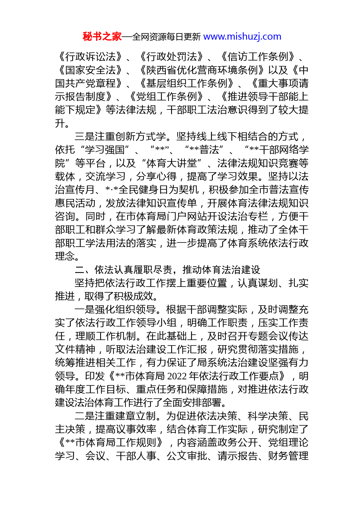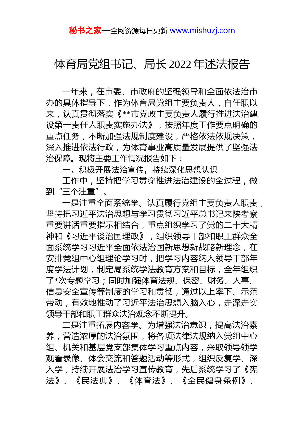秘书之家—全网资源每日更新www.mishuzj.com体育局党组书记、局长2022年述法报告一年来,在市委、市政府的坚强领导和全面依法治市办的具体指导下,作为体育局党组主要负责人,自任职以来,认真贯彻落实《市党政主要负责人履行推进法治建设第一责任人职责实施办法》,按照年度工作要点明确的重点任务,不断加强法规制度建设,严格依法依规决策,深入推进依法行政,为体育事业高质量发展提供了坚强法治保障。现将主要工作情况报告如下:一、积极开展法治宣传,持续深化思想认识工作中,坚持把学习贯穿推进法治建设的全过程,做到“三个注重”。一是注重全面系统学。认真履行党组主要负责人职责,坚持把习近平法治思想与学习贯彻习近平总书记来陕考察重要讲话重要指示相结合,重点组织学习了党的二十大精神和《习近平谈治国理政》,组织领导干部和职工群众全面系统学习习近平全面依法治国新思想新战略新理念,在安排党组中心组理论学习时,把学习内容纳入领导干部年度学法计划,制定局系统学法教育方案和目标,全年组织了次专题学习;同时加强体育法规、保密、财务、人事、信息安全宣传等制度的学习和贯彻,通过以上率下、示范带动,有效地推动了习近平法治思想入脑入心,走深走实领导干部和职工群众法治观念不断提升。二是注重拓展内容学。为增强法治意识,提高法治素养,营造浓厚的法治氛围,将各项法律法规纳入党组中心组、机关和基层党支部集体学习重点内容,采取领导领学观看录像、体会交流和答题活动等形式,组织反复学、深入学,持续开展法治学习宣传教育,先后系统学习了《宪法》、《民法典》、《体育法》、《全民健身条例》、秘书之家—全网资源每日更新www.mishuzj.com《行政诉讼法》、《行政处罚法》、《信访工作条例》、《国家安全法》、《陕西省优化营商环境条例》以及《中国共产党章程》、《基层组织工作条例》、《重大事项请示报告制度》、《党组工作条例》、《推进领导干部能上能下规定》等法律法规,干部职工法治意识得到了较大提升。三是注重创新方式学。坚持线上线下相结合的方式,依托“学习强国”、“”、“普法”、“干部网络学院”等平台,以及“体育大讲堂”、法律法规知识竞赛等载体,交流学习,分享心得,提高了学习效果。坚持以法治宣传月、·全民健身日为契机,积极参加全市普法宣传惠民活动,发放法律知识宣传单,开展体育法律法规知识咨询。同时,在市体育局门户网站开设法治专栏,方便干部职工和群众学习了解最新体育政策法规,推动了全体干部职工学法用法的落实,进一步提高了体育系统依法行政理念。二、依法认真履职尽责,推动体育法治建设坚持把依法行政工作摆上重要位置,认真谋划、扎实推进,取得了积极成效。一是强化组织领导。根据干部调整实际,及时调整充实了依法行政工作领导小组,明确工作职责,压实工作责任,理顺工作机制。在此基础上,及时召开专题会议传达文件精神,听取法治建设工作汇报,研究贯彻落实措施,统筹推进相关工作,有力保证了局系统法治建设坚强有力领导。印发《市体育局2022年依法行政工作要点》,明确年度工作目标、重点任务和保障措施,对推进依法行政建设法治体育工作进行了全面安排部署。二是注重建章立制。为促进依法决策、科学决策、民主决策,提高议事效率,结合体育工作实际,研究制定了《市体育局工作规则》,内容涵盖政务公开、党组理论学习、会议、干部人事、公文审批、请示报告、财务管理秘书之家—全网资源每日更新www.mishuzj.com安全管理等制度,以及廉政建设、落实意识形态工作责任制等制度规定,进一步规范了依法治体和依法行政工作。按照落实法治建设职责要求,将体育系统法治建设纳入全局整体工作计划,制定工作规划和年度工作计划时,将法治建设与工作目标任务同部署、同实施、同推进、同督促做到法治建设重要工作亲自部署、重大问题亲自过问、重点环节亲自协调,整体推进法治体育建设。凡属重大决策重要干部任免、重要项目安排和大额度资金的使用,坚持民主集中制原则,充分发扬民主,集体研究、集体决策,不搞“一言堂”和个人说了算,使决策经得起时间和实践的检验。同时,认真落实法律顾问制度,在重大行政决策及日常工作中涉及到法律问题的,须由聘请的法律顾问出具法律意见后作出科学决策。三是强化作风建设。坚持以开展的作风建设专项行动为抓手,通过公布监督举报电话、设立意见箱、座谈交流等形式,广泛听取对政务服务水平、公正文明执法、落实政策措施等方面的意见建议。按照归口进行分类,明确整改责任单位,限期督促整改,确保收集的意见建议件件有着落。针对房屋租赁自立名目收费行为,将拟出租的国有固定资产统一在固定资产交易平台挂牌招租,规范了房屋租赁管理;针对疫情影响商户收入经营困难要求减免房屋租金的问题,依据助企纾困政策,对体育场馆家租户减免租金.万余元,帮助商户渡过难关;为满足群众对公共体育场馆健身需求,积极推进体育资源全民共享,及时调整公布市属公共体育场馆免费或低收费开放方案,明确开放时间和具体要求,为群众参与健身活动提供便利。三、积极推进职能转变,强化政务服务提升始终按照行为规范、运转协调、公正透明、廉洁高