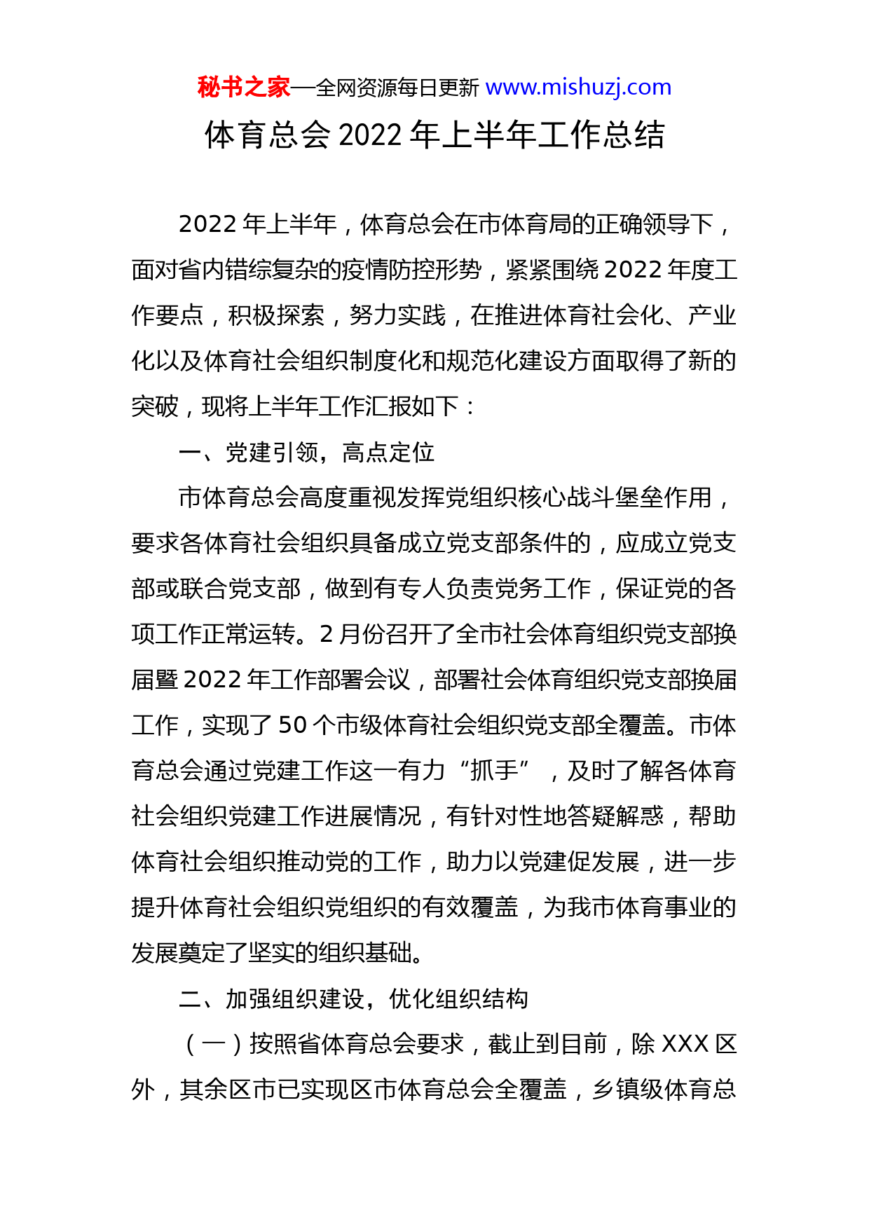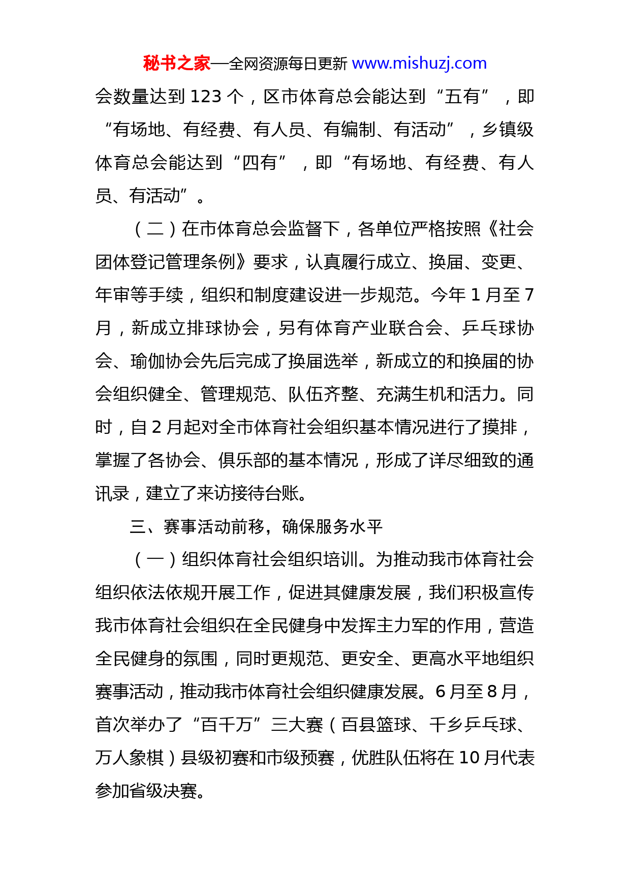 秘书之家—全网资源每日更新www.mishuzj.com体育总会2022年上半年工作总结2022年上半年,体育总会在市体育局的正确领导下,面对省内错综复杂的疫情防控形势,紧紧围绕2022年度工作要点,积极探索,努力实践,在推进体育社会化、产业化以及体育社会组织制度化和规范化建设方面取得了新的突破,现将上半年工作汇报如下:一、党建引领,高点定位市体育总会高度重视发挥党组织核心战斗堡垒作用,要求各体育社会组织具备成立党支部条件的,应成立党支部或联合党支部,做到有专人负责党务工作,保证党的各项工作正常运转。2月份召开了全市社会体育组织党支部换届暨2022年工作部署会议,部署社会体育组织党支部换届工作,实现了50个市级体育社会组织党支部全覆盖。市体育总会通过党建工作这一有力“抓手”,及时了解各体育社会组织党建工作进展情况,有针对性地答疑解惑,帮助体育社会组织推动党的工作,助力以党建促发展,进一步提升体育社会组织党组织的有效覆盖,为我市体育事业的发展奠定了坚实的组织基础。二、加强组织建设,优化组织结构(一)按照省体育总会要求,截止到目前,除XXX区外,其余区市已实现区市体育总会全覆盖,乡镇级体育总秘书之家—全网资源每日更新www.mishuzj.com会数量达到123个,区市体育总会能达到“五有”,即“有场地、有经费、有人员、有编制、有活动”,乡镇级体育总会能达到“四有”,即“有场地、有经费、有人员、有活动”。(二)在市体育总会监督下,各单位严格按照《社会团体登记管理条例》要求,认真履行成立、换届、变更、年审等手续,组织和制度建设进一步规范。今年1月至7月,新成立排球协会,另有体育产业联合会、乒乓球协会、瑜伽协会先后完成了换届选举,新成立的和换届的协会组织健全、管理规范、队伍齐整、充满生机和活力。同时,自2月起对全市体育社会组织基本情况进行了摸排,掌握了各协会、俱乐部的基本情况,形成了详尽细致的通讯录,建立了来访接待台账。三、赛事活动前移,确保服务水平(一)组织体育社会组织培训。为推动我市体育社会组织依法依规开展工作,促进其健康发展,我们积极宣传我市体育社会组织在全民健身中发挥主力军的作用,营造全民健身的氛围,同时更规范、更安全、更高水平地组织赛事活动,推动我市体育社会组织健康发展。6月至8月,首次举办了“百千万”三大赛(百县篮球、千乡乒乓球、万人象棋)县级初赛和市级预赛,优胜队伍将在10月代表参加省级决赛。秘书之家—全网资源每日更新www.mishuzj.com(二)规范管理工作。对于各区市上报的赛事计划、比赛的规程及赛事结束后的信息上报都有明确的要求,并起草完成《市级体育社会组织监管意见(草案)》。(三)提高服务水平。凝聚社会力量,鼓励支持体育社会组织举办赛事活动,从数量上扩大群众参与度。7月8日,为进一步繁荣体育市场,促进体育消费,“第一期体育惠民消费券正式发放,截止到7月26日共发放优惠金额59.32万元,实际消费金额455.93万元,单张最高优惠金额为500元。6月11日,为深入推进全民健身活动的持续开展,山东省暨纪念毛泽东“发展体育运动,增强人民体质”题词70周年全民健身主题活动在福山保利剧院举行。按照市委组织部要求,市体育总会上半年多次组织马拉松协会、武术运动协会、足球协会、冰上运动协会、雪上运动俱乐部等,充分利用自身的人才和资源优势,通过进校园、进社区、进农村、进广场、免费科普等活动进一步加大对相关项目的宣传普及力度。四、存在的问题1.各协会存在发展不平衡、层次不高,规模不大,效益不显,影响不强的问题。2.受疫情影响,没有到各协会组织进行调研和走访,对各体育社会组织的实际情况掌握的不深不透,日常监管不到位,服务水平能力有待提高。秘书之家—全网资源每日更新www.mishuzj.com3.党建工作重视不够。协会普遍存在重业务,轻党建的情况。五、下半年工作计划(一)多措并举加强体育行业疫情防控安全监管。通过教育引导与监督执法相结合的方式,加强体育行业安全生产及疫情防控意识。一方面,通过案例警示教育作用,提高从业人员思想认识,绷紧安全生产之弦;另一方面,与其他部门一起形成常态化联合监督执法机制,加强监督检查力度,加强威慑力。确保本行业安全生产、疫情防控等底线工作不出纰漏,严防重大事故的发生。(二)进一步规范对体育社会组织的监管。一是下发《关于开展体育社会组织专项整治工作的通知》,要求各市级体育社会组织认真按照通知要求开展自查整改,并将抽取部分社会组织,对自查整改情况进行现场检查。二是参照省体育总会换届的程序,对我市区市、乡、村的体育总会进行换届指导、督导、全覆盖。三是依照新颁布的《体育法》,拟出台《市级体育社会组织监管意见(草案)》,从制度上对协会、俱乐部进行进一步服务和监管。(三)高标准完成赛事和组织工作。一是完成“三大赛”招标工作,具有资质及承接能力的单位中标后,有关项目的具体分工,实施及组织,形成方案,同时对区市秘书之家—全网资源每日更新www.mishuzj.com“三大赛”的组织提出具体的意见和要求,并按合同要求严格组织实施,确保“三大赛”高质量的完成,并选拔优秀运动项目参加省比赛,争取创造优异成绩和等次,二是梳理汇总各市级体育社会组织2022年8月-2023年6