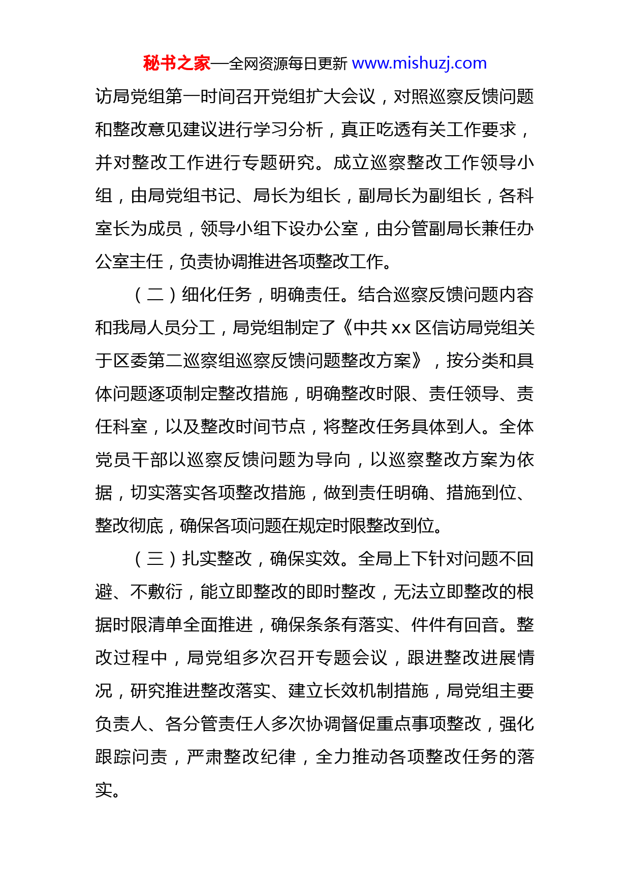 秘书之家—全网资源每日更新www.mishuzj.com信访局关于区委第X届第X巡察组巡察反馈问题整改报告2022年2月28日至3月29日,区委第二巡察组对区信访局党组开展了巡察工作,5月25日反馈了巡察发现问题,提出了整改意见建议。区信访局党组于6月13日制定整改方案,7月1日召开专题民主生活会,坚持问题导向,认真抓好整改落实。巡察共发现问题53个,其中聚焦基层贯彻落实党的理论路线方针政策和党中央决策部署情况的问题16个、聚焦群众身边腐败问题和不正之风的问题22个、聚焦基层党组织领导班子和干部队伍建设的问题15个,经过认真对照检查,全面完成整改50个,基本完成整改3个,整改率达94.34%。现将区信访局党组落实巡察反馈意见整改情况报告如下:一、提高站位,把巡察整改作为重大政治任务抓到位针对区委第二巡察组反馈的三个方面问题,区信访局党组将落实好区委巡察整改工作作为一项重大的政治任务,切实加强组织领导,真正承担起整改的主体责任,坚持即知即改、立行立改、真改实改、全面整改,坚持问题导向,切实推动巡察整改与业务提升相结合,不折不扣抓好整改落实。(一)强化领导,立即行动。巡察反馈会议后,区信秘书之家—全网资源每日更新www.mishuzj.com访局党组第一时间召开党组扩大会议,对照巡察反馈问题和整改意见建议进行学习分析,真正吃透有关工作要求,并对整改工作进行专题研究。成立巡察整改工作领导小组,由局党组书记、局长为组长,副局长为副组长,各科室长为成员,领导小组下设办公室,由分管副局长兼任办公室主任,负责协调推进各项整改工作。(二)细化任务,明确责任。结合巡察反馈问题内容和我局人员分工,局党组制定了《中共xx区信访局党组关于区委第二巡察组巡察反馈问题整改方案》,按分类和具体问题逐项制定整改措施,明确整改时限、责任领导、责任科室,以及整改时间节点,将整改任务具体到人。全体党员干部以巡察反馈问题为导向,以巡察整改方案为依据,切实落实各项整改措施,做到责任明确、措施到位、整改彻底,确保各项问题在规定时限整改到位。(三)扎实整改,确保实效。全局上下针对问题不回避、不敷衍,能立即整改的即时整改,无法立即整改的根据时限清单全面推进,确保条条有落实、件件有回音。整改过程中,局党组多次召开专题会议,跟进整改进展情况,研究推进整改落实、建立长效机制措施,局党组主要负责人、各分管责任人多次协调督促重点事项整改,强化跟踪问责,严肃整改纪律,全力推动各项整改任务的落实。秘书之家—全网资源每日更新www.mishuzj.com二、坚持问题导向,不折不扣地做好整改落实工作针对区委第二巡察组反馈的问题,区信访局全体党员干部积极落实各项整改措施,按照时间节点积极推进整改工作,认真完成各项整改任务。(一)聚焦基层贯彻落实党的路线方针政策和党中央决策部署情况方面的问题1.政治理论学习不深入(1)学习频次不足整改落实情况:严格落实理论中心组学习制度,结合实际制定理论中心组学习计划,每月开展理论中心组学习,截止8月份,开展理论中心组学习8次,每次学习制定方案,班子成员按要求撰写发言材料,在集中学习时进行交流发言。整改完成情况:已完成。(2)学习形式单一整改落实情况:丰富学习形式,组织党员干部参观了朱德旧居、xx起义纪念馆,观看爱国主义影片《长津湖之水门桥》等爱国主义教育电影,组织党员干部开展心理疏导活动。同时,将新颁布的《信访工作条例》纳入理论中心组和专题党课学习,通过学习培训提升全局党员干部理论素养。整改完成情况:已完成。秘书之家—全网资源每日更新www.mishuzj.com2.贯彻落实上级信访工作重大决策部署有差距(1)发挥信访联席会议制度力度不足整改落实情况:督促指导街道充分发挥街道信访工作联席会议机制,并按照省市信访部门相关通知要求,制定下发相关工作方案,加强对辖区重点领域风险隐患化解稳控。整改完成情况:基本整改完成。(2)信访工作目标考核“指挥棒”作用发挥不明显整改落实情况:严格落实信访工作考核评价和对责任单位的监督力度。结合我区实际,拟定考核任务分解表,运用于平安建设和信访工作考核中,对目标任务完成好的单位给予激励。在日常工作中,对完成工作不到位的责任单位下发督办函,提醒督促其按要求落实工作任务,并在年底考核时进行扣分。整改完成情况:基本整改完成。(3)对“三跨三分离”信访重点人员稳控工作统筹不够整改落实情况:加强对“三跨三分离”信访重点人员和重点群体稳控工作的统筹力度,及时汇报工作动态,确保人员稳定。整改完成情况:已完成。(4)对集体访处置工作指导不力秘书之家—全网资源每日更新www.mishuzj.com整改落实情况:加强全区信访应急处置工作的培训。修订印发了《xx区信访应急处置预案》,并结合《信访工作条例》和实际案例进行培训。整改完成情况:已完成。(5)推进信访重复投诉化解力度不够整改落实情况:压实行业主管部门责任,采取领导包案化解等措施,召开民情恳谈会,及时通报工作进展情况,重点领域群体持续保持稳定。整改完成情况:已完成。3.意识形态工作落实不到位(1)对意识形态工作研究不够整改落实情况:一是加强对意识形态工作的研究部署,将意识形态工作纳入年度工作计划,在党组会议上对2022年意识形态工作计划进行