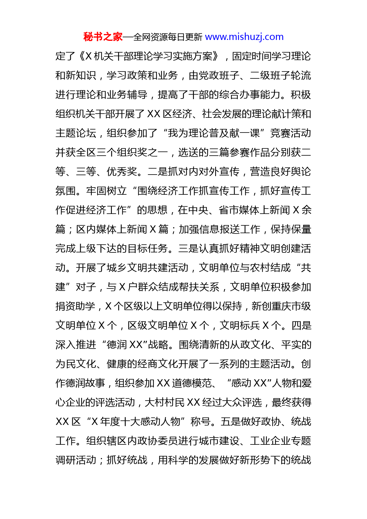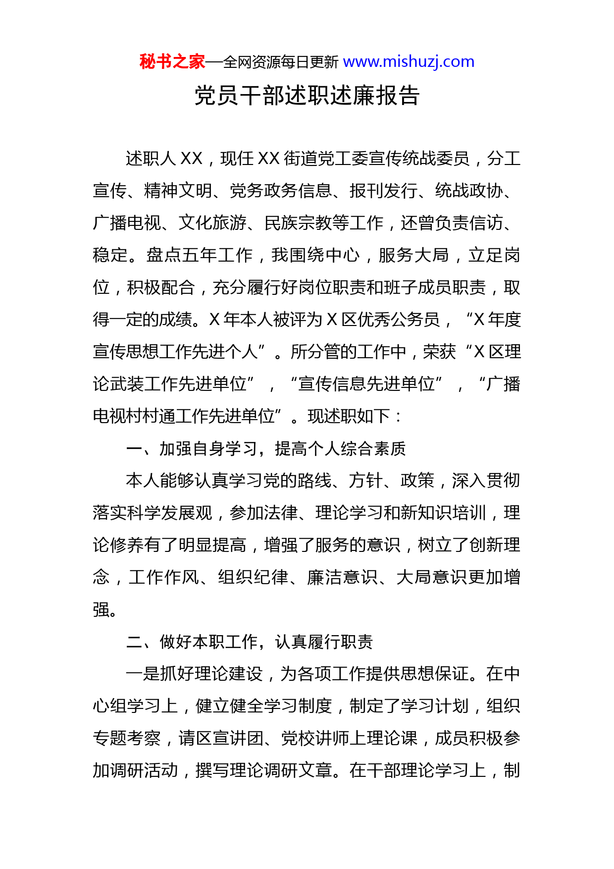 秘书之家—全网资源每日更新www.mishuzj.com党员干部述职述廉报告述职人XX,现任XX街道党工委宣传统战委员,分工宣传、精神文明、党务政务信息、报刊发行、统战政协、广播电视、文化旅游、民族宗教等工作,还曾负责信访、稳定。盘点五年工作,我围绕中心,服务大局,立足岗位,积极配合,充分履行好岗位职责和班子成员职责,取得一定的成绩。X年本人被评为X区优秀公务员,“X年度宣传思想工作先进个人”。所分管的工作中,荣获“X区理论武装工作先进单位”,“宣传信息先进单位”,“广播电视村村通工作先进单位”。现述职如下:一、加强自身学习,提高个人综合素质本人能够认真学习党的路线、方针、政策,深入贯彻落实科学发展观,参加法律、理论学习和新知识培训,理论修养有了明显提高,增强了服务的意识,树立了创新理念,工作作风、组织纪律、廉洁意识、大局意识更加增强。二、做好本职工作,认真履行职责一是抓好理论建设,为各项工作提供思想保证。在中心组学习上,健立健全学习制度,制定了学习计划,组织专题考察,请区宣讲团、党校讲师上理论课,成员积极参加调研活动,撰写理论调研文章。在干部理论学习上,制秘书之家—全网资源每日更新www.mishuzj.com定了《X机关干部理论学习实施方案》,固定时间学习理论和新知识,学习政策和业务,由党政班子、二级班子轮流进行理论和业务辅导,提高了干部的综合办事能力。积极组织机关干部开展了XX区经济、社会发展的理论献计策和主题论坛,组织参加了“我为理论普及献一课”竞赛活动并获全区三个组织奖之一,选送的三篇参赛作品分别获二等、三等、优秀奖。二是抓对内对外宣传,营造良好舆论氛围。牢固树立“围绕经济工作抓宣传工作,抓好宣传工作促进经济工作”的思想,在中央、省市媒体上新闻X余篇;区内媒体上新闻X篇;加强信息报送工作,保持保量完成上级下达的目标任务。三是认真抓好精神文明创建活动。开展了城乡文明共建活动,文明单位与农村结成“共建”对子,与X户群众结成帮扶关系,文明单位积极参加捐资助学,X个区级以上文明单位得以保持,新创重庆市级文明单位X个,区级文明单位X个,文明标兵X个。四是深入推进“德润XX”战略。围绕清新的从政文化、平实的为民文化、健康的经商文化开展了一系列的主题活动。创作德润故事,组织参加XX道德模范、“感动XX”人物和爱心企业的评选活动,大村村民XX经过大众评选,最终获得XX区“X年度十大感动人物”称号。五是做好政协、统战工作。组织辖区内政协委员进行城市建设、工业企业专题调研活动;抓好统战,用科学的发展做好新形势下的统战秘书之家—全网资源每日更新www.mishuzj.com工作,建好少数民族、信教群众、海外华侨的台帐,教育引导群众有好的政治立场和政治方向。三、抓好分管工作,取得显著成效热心抓好文化建设和活动,但凡上级部署的工作都认真完成。搞好建国X周年、建党X周年的庆祝活动,深入开展“唱读讲传”活动,组织18个红歌队送文化下乡表演,积极参加了全区性的红歌合唱比赛和家庭红歌比赛,举办XX街道专场故事会和江城大舞台演出,编写上传、转发短信十万余条;文化、体育活动丰富多彩,指导学校、社区开展了丰富的节庆游乐活动,建立了社区腰鼓队、红歌队;成功举办了首届XX体育运动会,增强了体质,增进了友谊;积极组团参加XX区第七届体育运动会,取得了团体总分第X名的好成绩;开展送电影下乡活动,丰富群众文化生活;完成了“农村广播村村通工程”,新发展闭路电视用户X余户;规范了文化市场管理,开展了“净化文化市场,服务文化发展”活动,促进文化市场健康发展;建设街道综合文化中心,建成X个村的农家书屋,顺利通过了重庆市的检查验收。四、做好党工委、行政交办的其他中心工作在分片包村工作上,带领驻村干部及村干部进村入户开展“五送”活动,帮助村上理清发展思路,化解矛盾纠纷,促进村级班子团结协作,在经济发展、社会稳定等方秘书之家—全网资源每日更新www.mishuzj.com面做出了较好成绩。在重大项目的建设和协建工作中,服从安排,组织实施,使城北工业园、化工园的征地、拆迁工作顺利进行,按质按量地完成了工作任务。五、保持党员本色,做到廉洁从政一直以来严格按照“为民、务实、清廉”的标准,从严掌握,防微杜渐,始终牢固树立“两个务必”的思想,把精力用在抓发展的落实上,遵守政治纪律、组织纪律、经济纪律,时刻自重、自省、自警、自励,甘于奉献,以诚待人,决无欺上瞒下、阳奉阴违的思想和行为。六、存在的不足及下步打算一是学习缺乏主动性,政治理论水平还不能满足工作的需要;二是工作缺乏针对性,理论联系实际的经验不足。为此,我将进一步改进工作作风,转变工作方式,牢固树立全心全意为人民服务的思想,乐于奉献,开拓创新,以新时期共产党员的标准严格要求自己,争取更大进步。