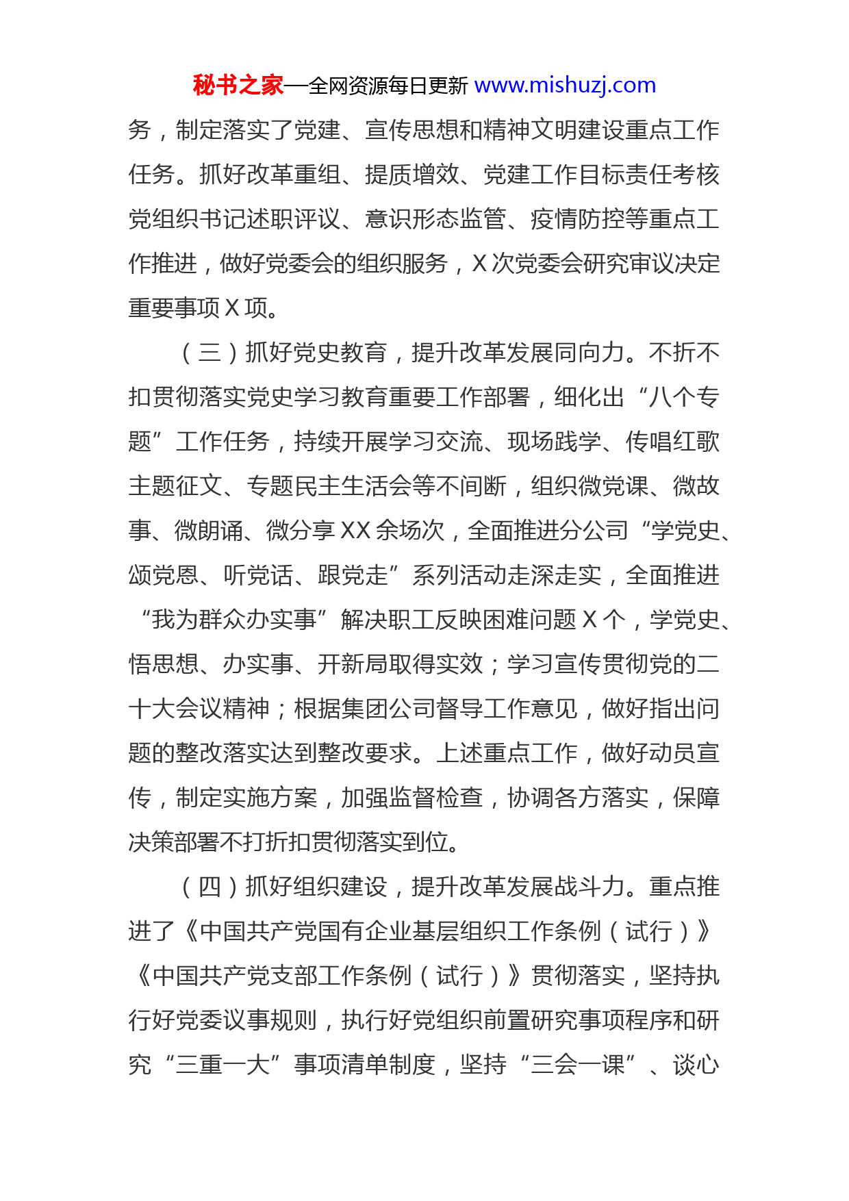 秘书之家—全网资源每日更新www.mishuzj.com党委办公室主任2022年度述职述廉报告2022年,在分公司党委的领导下,在各部室、各管理所的支持下,我与党委办公室同志们围绕分公司改革重组提质增效、疫情防控、群团工作等,杠起担当职责,恪尽职守做事,突出党务抓提升,强化事务重规范,保障党建工作有序推进。现就有关情况汇报如下:一、聚焦主责,尽心尽力,确保党建任务完成(一)抓好政治建设,提升改革发展引领力。贯彻学习“首要任务”,党委中心组工作部署,组织落实了党员领导干部集中培训、网络答题和知识竞赛等,抓好学习党的二十大会议精神,学习《习近平谈治国理政》(第四卷),学习习近平来X视察重要讲话精神,评比表彰“学习强国”学习标兵。分公司党委理论中心组学习XX次,6名党务工作者同志参加了集团公司培训,党委班子成员到所联系党支部分别讲党课,受教育人数近600余人(次),推进分公司上下学思用贯通,知行信统一,党员干部“四个意识”进一步增强、“四个自信”更加坚定,做到“两个维护”。(二)抓好目标导向,提升改革发展执行力。以推动目标责任考核为主线,提升抓好党建工作精准落地落实能力。做好2022年度党建暨纪检工作会议的组织、协调和服秘书之家—全网资源每日更新www.mishuzj.com务,制定落实了党建、宣传思想和精神文明建设重点工作任务。抓好改革重组、提质增效、党建工作目标责任考核党组织书记述职评议、意识形态监管、疫情防控等重点工作推进,做好党委会的组织服务,X次党委会研究审议决定重要事项X项。(三)抓好党史教育,提升改革发展同向力。不折不扣贯彻落实党史学习教育重要工作部署,细化出“八个专题”工作任务,持续开展学习交流、现场践学、传唱红歌主题征文、专题民主生活会等不间断,组织微党课、微故事、微朗诵、微分享XX余场次,全面推进分公司“学党史、颂党恩、听党话、跟党走”系列活动走深走实,全面推进“我为群众办实事”解决职工反映困难问题X个,学党史、悟思想、办实事、开新局取得实效;学习宣传贯彻党的二十大会议精神;根据集团公司督导工作意见,做好指出问题的整改落实达到整改要求。上述重点工作,做好动员宣传,制定实施方案,加强监督检查,协调各方落实,保障决策部署不打折扣贯彻落实到位。(四)抓好组织建设,提升改革发展战斗力。重点推进了《中国共产党国有企业基层组织工作条例(试行)》《中国共产党支部工作条例(试行)》贯彻落实,坚持执行好党委议事规则,执行好党组织前置研究事项程序和研究“三重一大”事项清单制度,坚持“三会一课”、谈心秘书之家—全网资源每日更新www.mishuzj.com谈话等制度。持续推进党支部标准化规范化建设,XX党支部创新推动智慧党建发展、XX党建带团建、XX党建带工建再上台阶,XX进一步加强党支部阵地建设,本部党支部讲政治善学习做表率求实效,7名同志参加了集团公司发展对象培训全部合格。党费收缴月缴季清,规范使用和管理及时向集团公司上缴。评选表彰“两优一先”XX人。(五)抓好宣传引导,提升改革发展凝聚力。严格落实意识形态责任制,落实了工作责任,印发落实宣传工作要点,培训通讯员,通报工作动态,全年在市级以上媒体刊发稿件XX篇。合并、解散、净化QQ群XX个,微信群XX个,审批审核备案报告会、研讨会XX余次,《青春白泉》等个微信公众号推送信息2500条。在企业改革重组、疫情防控、安全生产等重点工作推进和敏感时期,规范信息发布,做好职工思想政治工作,营造了良好的舆论环境。(六)抓好党风建设,提升改革发展保障力。在党委领导和支持下,修订完善了落实全面从严治党主题责任清单,将党委主体责任、纪委监督责任、党委书记第一责任委员“一岗双责”以及党支部负责人、部室负责人的责任落到实处,健全完善了党建工作考核评价办法,将“软指标”变成“硬约束”,营造一级抓一级,人人抓落实的良好氛围。推动作风专项整治工作,落实工作责任,落实整改措施,协助抓好整改问题基本到位,推进党口精文减会秘书之家—全网资源每日更新www.mishuzj.com不断深入,配合纪委打造党风廉政教育基地统筹文稿,取得了成效。(七)抓好文明创建,提升改革发展支持力。协调做好文明单位创建、道德讲堂筹办、企业文化打造等工作。XX创建国家级文明单位,XX单位巩固省级文明单位建设成果稳步发展,分公司争创省级文明单位继续推进。组织评选表彰近5年来分公司“身边榜样”10名,巩固推进了XX等品牌实践,组织开展道德讲堂4期,促进读书分享、好书推荐活动等5次。在工会的领导下,组织开展了“建功十四五、奋进新时代”主题劳动竞赛、技能竞赛,技术创新活动获得XX省企业“三新三小”创新竞赛“”三等奖,指导工会分会开展“我们的节日”活动20余次,举办了分公司第三届职工运动会,升级“母婴关爱室”功能,“十四运”青年志愿服务、学雷锋志愿服务活动累计为过往司乘提供服务XXX余次。XX被评为XX省工人先锋号,XX安康站被评委“巾帼文明岗”。“五个一”民生工程位为职工排忧解难。管好用好“智慧团建”系统,继续开展了“一学一做”活动,青年大学习和志愿服务蔚成风气。(八)抓好制度建设,提升改革发展创新力。按照运营管理公司部署结合单位实际,修订完善了《三重一大决策制度实施办法》等制