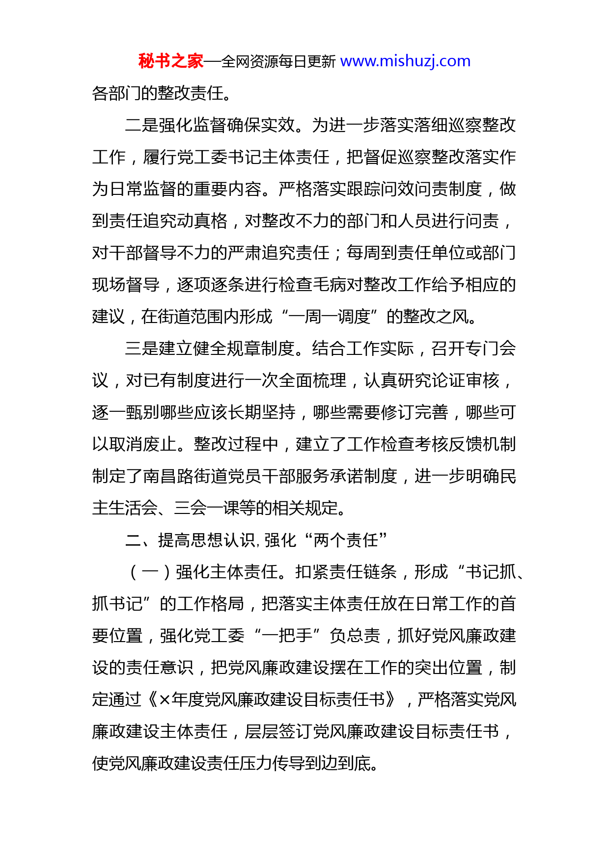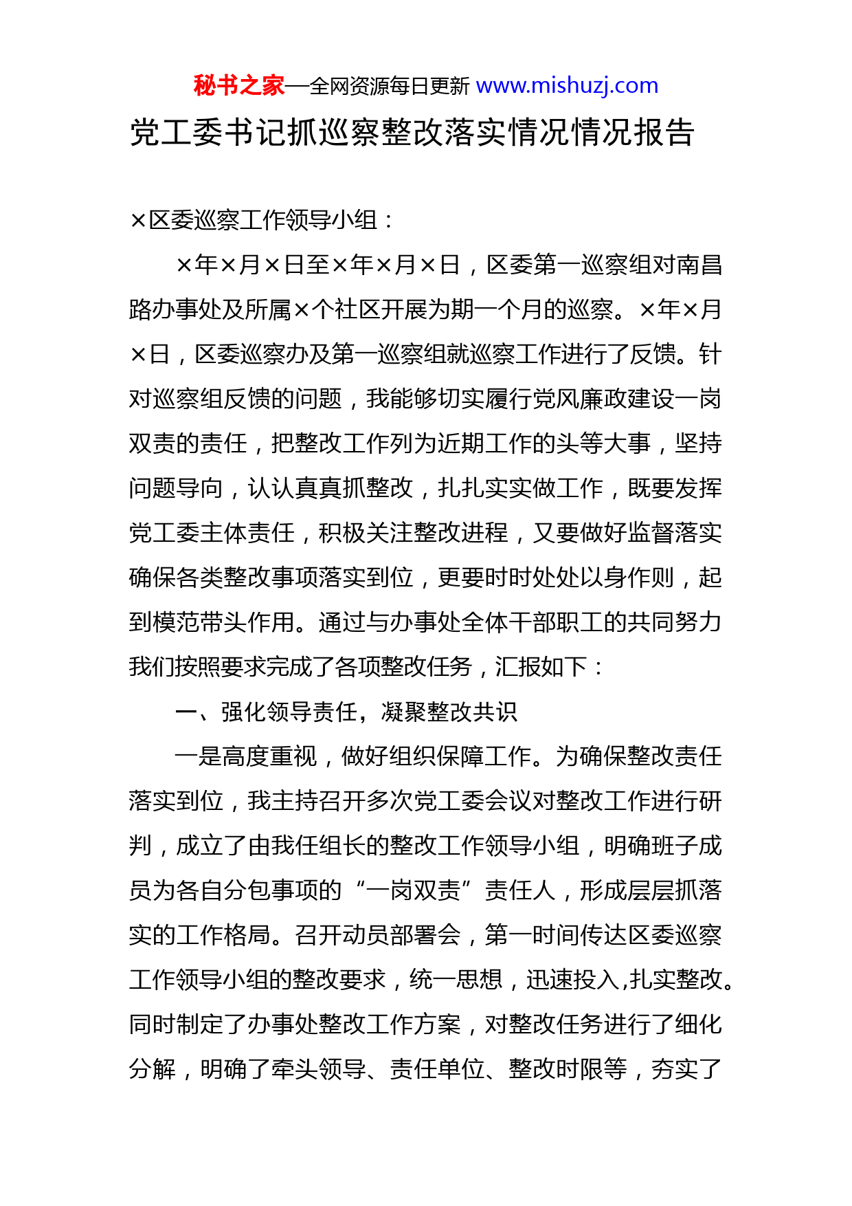 秘书之家—全网资源每日更新www.mishuzj.com党工委书记抓巡察整改落实情况情况报告×区委巡察工作领导小组:×年×月×日至×年×月×日,区委第一巡察组对南昌路办事处及所属×个社区开展为期一个月的巡察。×年×月×日,区委巡察办及第一巡察组就巡察工作进行了反馈。针对巡察组反馈的问题,我能够切实履行党风廉政建设一岗双责的责任,把整改工作列为近期工作的头等大事,坚持问题导向,认认真真抓整改,扎扎实实做工作,既要发挥党工委主体责任,积极关注整改进程,又要做好监督落实确保各类整改事项落实到位,更要时时处处以身作则,起到模范带头作用。通过与办事处全体干部职工的共同努力我们按照要求完成了各项整改任务,汇报如下:一、强化领导责任,凝聚整改共识一是高度重视,做好组织保障工作。为确保整改责任落实到位,我主持召开多次党工委会议对整改工作进行研判,成立了由我任组长的整改工作领导小组,明确班子成员为各自分包事项的“一岗双责”责任人,形成层层抓落实的工作格局。召开动员部署会,第一时间传达区委巡察工作领导小组的整改要求,统一思想,迅速投入,扎实整改。同时制定了办事处整改工作方案,对整改任务进行了细化分解,明确了牵头领导、责任单位、整改时限等,夯实了秘书之家—全网资源每日更新www.mishuzj.com各部门的整改责任。二是强化监督确保实效。为进一步落实落细巡察整改工作,履行党工委书记主体责任,把督促巡察整改落实作为日常监督的重要内容。严格落实跟踪问效问责制度,做到责任追究动真格,对整改不力的部门和人员进行问责,对干部督导不力的严肃追究责任;每周到责任单位或部门现场督导,逐项逐条进行检查毛病对整改工作给予相应的建议,在街道范围内形成“一周一调度”的整改之风。三是建立健全规章制度。结合工作实际,召开专门会议,对已有制度进行一次全面梳理,认真研究论证审核,逐一甄别哪些应该长期坚持,哪些需要修订完善,哪些可以取消废止。整改过程中,建立了工作检查考核反馈机制制定了南昌路街道党员干部服务承诺制度,进一步明确民主生活会、三会一课等的相关规定。二、提高思想认识,强化“两个责任”(一)强化主体责任。扣紧责任链条,形成“书记抓、抓书记”的工作格局,把落实主体责任放在日常工作的首要位置,强化党工委“一把手”负总责,抓好党风廉政建设的责任意识,把党风廉政建设摆在工作的突出位置,制定通过《×年度党风廉政建设目标责任书》,严格落实党风廉政建设主体责任,层层签订党风廉政建设目标责任书,使党风廉政建设责任压力传导到边到底。秘书之家—全网资源每日更新www.mishuzj.com(二)落实“一岗双责”。主持构建了“谁主管、谁负责、各司其职、各负其责”的责任体系,进一步明确细化党工委书记责任清单和其他班子成员责任清单。建立党工委重大事项议事决策制度,提升班子成员贯彻执行民主集中制的意识和能力,每位班子成员在集中讨论时充分发表意见,注重听取吸收不同意见。组织部门中层干部、社区党组织书记签订了《领导干部廉政承诺书》;通过党工委领导班子工作例会、中层工作例会,督促班子成员、中层干部和社区书记明确自身党风廉政建设职责,督促种好各自“责任田”,做好党风廉政建设的表率;充分利用微信工作平台,不定时向工作人员发送有关廉政的短信内容尤其是在逢年过节时,更是加大警示力度。(三)建立考评机制。落实党风廉政建设责任制,将落实党风廉政建设情况纳入年度目标考核范围,建立考评机制,实施目标管理。由纪工委负责对党风廉政建设年度目标和月度工作任务完成情况进行考核,计入部门、个人综合考核,作为评选年度先进的依据。制定南昌路街道党员干部服务承诺制度,建立长效监管机制,公布投诉举报电话,对工作中发现存在不作为、不尽责、懒政怠政现象后立即处理。三、突出务实管用,确保整改实效一是注重加强队伍建设。坚持每季度至少开展×次党风秘书之家—全网资源每日更新www.mishuzj.com廉政警示教育学习,党工委中心组开展党风党纪专题研讨×次,主题民主生活会×次,切实促进作风转变,提醒大家时刻绷紧严以律己、廉洁自律这根弦。突出“廉政”警示夜校作用,×月至×月共计开展×次集中学习,书记上党课×次,强化对中层干部、社区干部教育力度,持续加强对中共中央“八项规定”内容的学习,切实增强党员干部廉洁自律意识,规范履职行为。二是加强监督检查力度。对于巡察组指出的问题,在班子会上我主动征求大家意见,确保对工作中出现问题和失误的同志处理做到程序规范、轻重适中,既要达到警示当事人的作用,又要起到以儆效尤的效果。我经常督促检查办事处纪工委月巡查活动,检查巡查台账,听取汇报检查情况,做到心中有数,确保单位的各项制度落实到位。三是进一步严格党的组织生活。为确保有效落实“三会一课”制度,我要求班子成员坚持每季度对分包社区的“三会一课”资料进行调阅签字,有效保障了“三会一课”制度的有效落实。认真组织召开民主生活会,严格规范“三重一大”制度落实,对重要人事任免、中层干部选拔按照程序,不走过场,同时指导各党支部书记要改进组织活动形式,除安排学习党内文件、通过支部决议,还采取观看有教育意义的电影、电