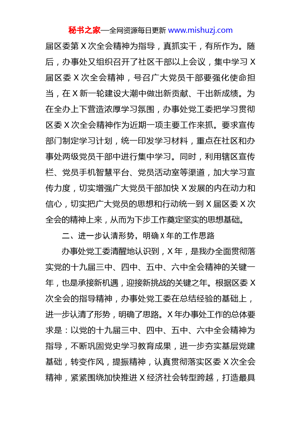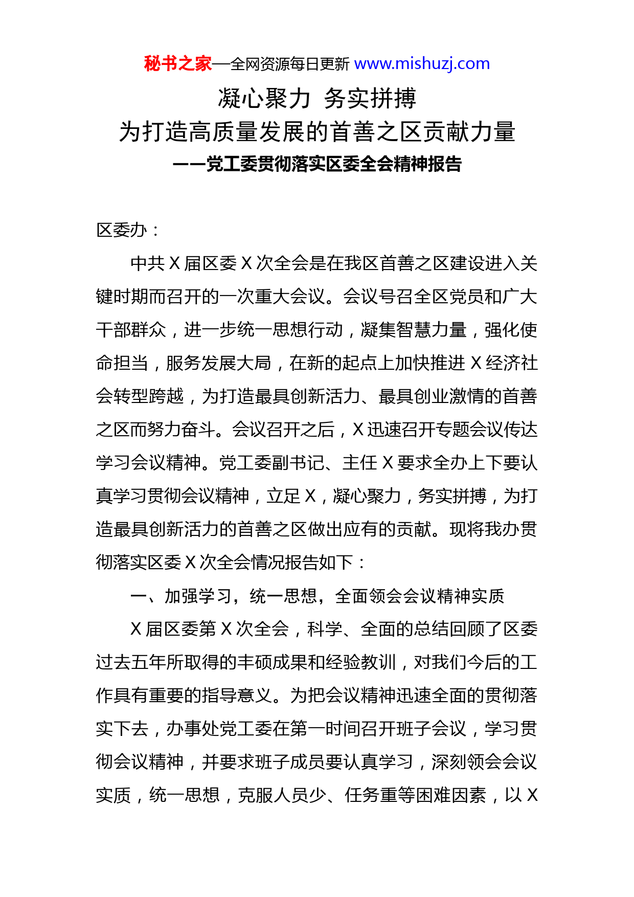 秘书之家—全网资源每日更新www.mishuzj.com凝心聚力务实拼搏为打造高质量发展的首善之区贡献力量——党工委贯彻落实区委全会精神报告区委办:中共X届区委X次全会是在我区首善之区建设进入关键时期而召开的一次重大会议。会议号召全区党员和广大干部群众,进一步统一思想行动,凝集智慧力量,强化使命担当,服务发展大局,在新的起点上加快推进X经济社会转型跨越,为打造最具创新活力、最具创业激情的首善之区而努力奋斗。会议召开之后,X迅速召开专题会议传达学习会议精神。党工委副书记、主任X要求全办上下要认真学习贯彻会议精神,立足X,凝心聚力,务实拼搏,为打造最具创新活力的首善之区做出应有的贡献。现将我办贯彻落实区委X次全会情况报告如下:一、加强学习,统一思想,全面领会会议精神实质X届区委第X次全会,科学、全面的总结回顾了区委过去五年所取得的丰硕成果和经验教训,对我们今后的工作具有重要的指导意义。为把会议精神迅速全面的贯彻落实下去,办事处党工委在第一时间召开班子会议,学习贯彻会议精神,并要求班子成员要认真学习,深刻领会会议实质,统一思想,克服人员少、任务重等困难因素,以X秘书之家—全网资源每日更新www.mishuzj.com届区委第X次全会精神为指导,真抓实干,有所作为。随后,办事处又组织召开了社区干部以上会议,集中学习X届区委X次全会精神,号召广大党员干部要强化使命担当,在X新一轮建设大潮中做出新贡献、干出新成绩。为在全办上下营造浓厚学习氛围,办事处党工委把学习贯彻区委X次全会精神作为近期一项主要工作来抓。要求宣传部门制定学习计划,统一印发学习材料,重点在社区和办事处两级党员干部中进行集中学习。同时,利用辖区宣传栏、党员手机智慧平台、党员活动室等渠道,加大学习宣传力度,切实增强广大党员干部加快X发展的内在动力和信心,切实把广大党员的思想和行动统一到X届区委X次全会的精神上来,从而为下步工作奠定坚实的思想基础。二、进一步认清形势,明确X年的工作思路办事处党工委清醒地认识到,X年,是我办全面贯彻落实党的十九届三中、四中、五中、六中全会精神的关键一年,也是承接新机遇,迎接新挑战的关键之年。根据区委X次全会的指导精神,办事处党工委在总结经验的基础上,进一步认清了形势,明确了思路。X年办事处工作的总体要求是:以党的十九届三中、四中、五中、六中全会精神为指导,不断巩固党史学习教育成果,进一步夯实基层党建基础,转变作风,提振精神,认真贯彻落实区委X次全会精神,紧紧围绕加快推进X经济社会转型跨越,打造最具秘书之家—全网资源每日更新www.mishuzj.com创新活力、最具创业激情的首善之区的工作定位,结合辖区实际,以目标管理为统揽,坚持改革创新,以转变经济发展方式为主线,以社会事务管理转型为依托,以开展X为载体,转变工作作风、优化政务环境,努力抢抓发展机遇,为建设最具创新活力、最具创业激情的的新X而努力奋斗!三、围绕重点,全力以赴,为完成全年目标任务而努力拼搏(一)紧盯目标,加大项目推进力度。X年,X事处被区政府纳入目标管理的重大项目就有X个,总投资X.X亿元。办事处党工委清醒地认识到,我们虽然肩负的任务异常艰巨,但使命光荣,发展前景广阔。只有紧紧抓住这个历史机遇,不断加大项目建设力度,才能最有效地推动辖区经济快速发展。继续坚持实行领导分包重大项目建设制度,分包领导要深入一线,督导指挥,不断加大对项目建设的指挥协调力度,及时发现和解决项目推进过程中的困难和问题,确保重点项目尽快出形象、见成效。要进一步完善落实协调例会制、管理责任制、督促检查制等项目推进制度,加强对重点项目的统一指导和协调,全力以赴抓好工业产业转型升级、文化产业、旧村改造、基础设施和民生工程项目建设。重点抓好大学科技园(二)期、X科技园项目(一期)建设和清华启迪科技园、中开院项目落户秘书之家—全网资源每日更新www.mishuzj.com辖区的各项工作,依托这四个科技园建设,为辖区先进制造业转型升级奠定坚实基础;要围绕文化产业做文章,抓好武则天演义旅游产业项目,积极推进西部生态城建设,大力构建最佳人居环境;要进一步加大政策宣传力度,细化工作,全力做好X和X旧村改造工作。各分包领导要积极与企业对接,做好项目的前期准备,积极创造条件,进一步加快项目推进速度。(二)多策并举,抓好招商引资工作。一是借助花会做好项目宣传。要借助每年X牡丹花会这个平台,进一步宣传辖区相关情况,增强外界对X事处的了解;二是做好重点项目的推介。邀请国内有实力的开发商前来投资开发,积极参加全国各地的经贸洽谈活动,向外推介项目。三是加大外出招商力度。采取多种方式,如,提倡以情招商、以商招商、老板招商、代理招商等,提高工作实效。四是加大产业链招商。要依托辖区“四大科技园”,紧密围绕机器人及智能装备制造、新能源、信息服务、节能环保等重点产业进行招商,从而加快辖区产业结构的优化升级。(三)加快转变社会管理模式,持续巩固创建成果按照“村改居”的要求,要及时由农村集体管理模式向城市社区管理模式转变。一是抓好辖区环境治理。以农村环境整治为抓手,逐步向城市社区环境管理模式过度,秘书之家—全网资源每日更新www.mishuzj.com逐步