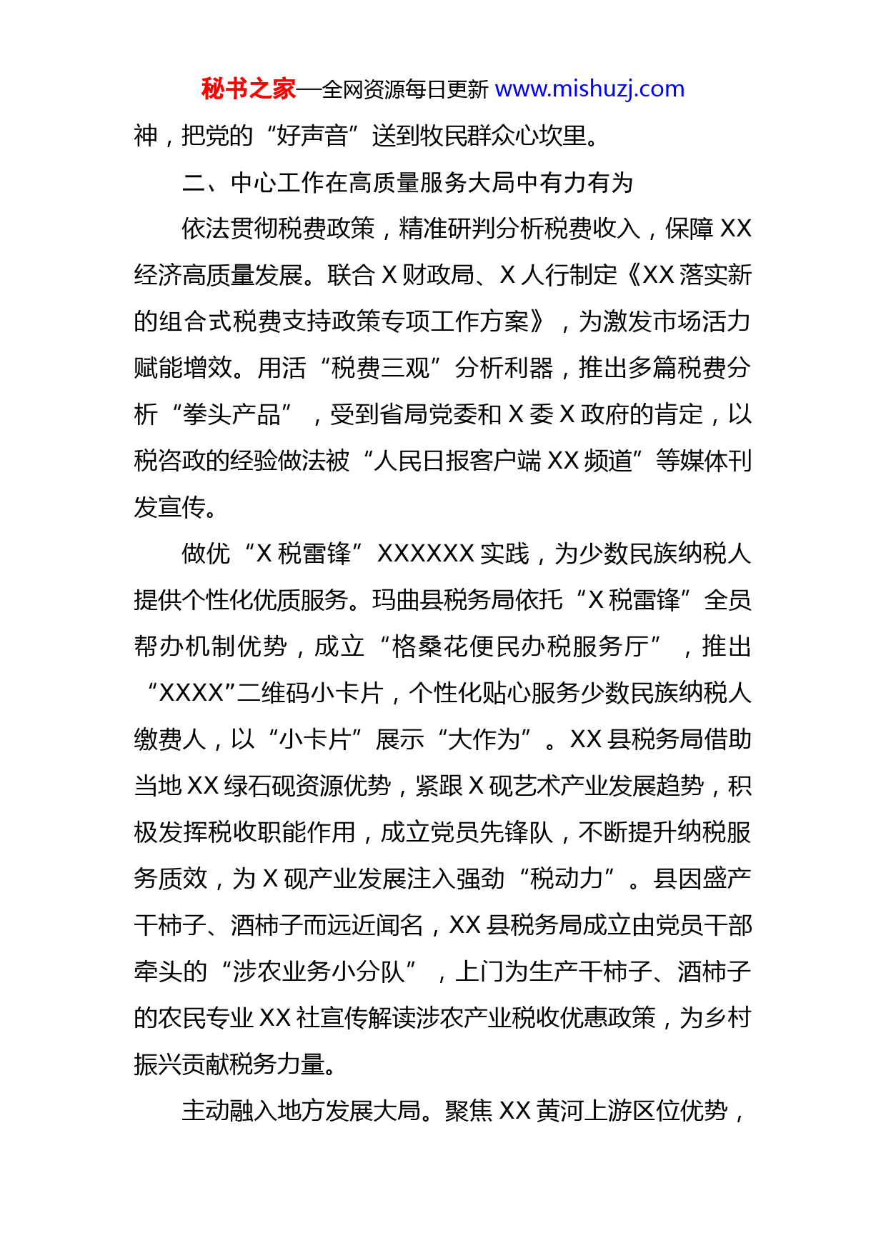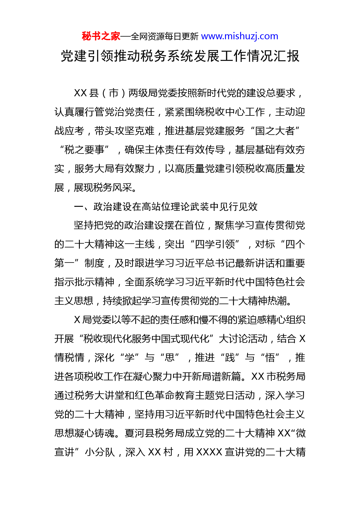 秘书之家—全网资源每日更新www.mishuzj.com党建引领推动税务系统发展工作情况汇报XX县(市)两级局党委按照新时代党的建设总要求,认真履行管党治党责任,紧紧围绕税收中心工作,主动迎战应考,带头攻坚克难,推进基层党建服务“国之大者”“税之要事”,确保主体责任有效传导,基层基础有效夯实,服务大局有效聚力,以高质量党建引领税收高质量发展,展现税务风采。一、政治建设在高站位理论武装中见行见效坚持把党的政治建设摆在首位,聚焦学习宣传贯彻党的二十大精神这一主线,突出“四学引领”,对标“四个第一”制度,及时跟进学习习近平总书记最新讲话和重要指示批示精神,全面系统学习习近平新时代中国特色社会主义思想,持续掀起学习宣传贯彻党的二十大精神热潮。X局党委以等不起的责任感和慢不得的紧迫感精心组织开展“税收现代化服务中国式现代化”大讨论活动,结合X情税情,深化“学”与“思”,推进“践”与“悟”,推进各项税收工作在凝心聚力中开新局谱新篇。XX市税务局通过税务大讲堂和红色革命教育主题党日活动,深入学习党的二十大精神,坚持用习近平新时代中国特色社会主义思想凝心铸魂。夏河县税务局成立党的二十大精神XX“微宣讲”小分队,深入XX村,用XXXX宣讲党的二十大精秘书之家—全网资源每日更新www.mishuzj.com神,把党的“好声音”送到牧民群众心坎里。二、中心工作在高质量服务大局中有力有为依法贯彻税费政策,精准研判分析税费收入,保障XX经济高质量发展。联合X财政局、X人行制定《XX落实新的组合式税费支持政策专项工作方案》,为激发市场活力赋能增效。用活“税费三观”分析利器,推出多篇税费分析“拳头产品”,受到省局党委和X委X政府的肯定,以税咨政的经验做法被“人民日报客户端XX频道”等媒体刊发宣传。做优“X税雷锋”XXXXXX实践,为少数民族纳税人提供个性化优质服务。玛曲县税务局依托“X税雷锋”全员帮办机制优势,成立“格桑花便民办税服务厅”,推出“XXXX”二维码小卡片,个性化贴心服务少数民族纳税人缴费人,以“小卡片”展示“大作为”。XX县税务局借助当地XX绿石砚资源优势,紧跟X砚艺术产业发展趋势,积极发挥税收职能作用,成立党员先锋队,不断提升纳税服务质效,为X砚产业发展注入强劲“税动力”。县因盛产干柿子、酒柿子而远近闻名,XX县税务局成立由党员干部牵头的“涉农业务小分队”,上门为生产干柿子、酒柿子的农民专业XX社宣传解读涉农产业税收优惠政策,为乡村振兴贡献税务力量。主动融入地方发展大局。聚焦XX黄河上游区位优势,秘书之家—全网资源每日更新www.mishuzj.com持续落实省局“助力黄河流域生态保护和高质量发展十二条措施”,在黄河上游流域XX段保护和发展中贡献税务力量。与统战等部门联合抓好XX寺等宗教组织税收管理试点工作,探索推进税收共治大格局。为共建社区和帮扶村全年投入帮扶资金4万元,支持消费扶贫1万元。组织全系统党员干部参加“8+”基层治理、疫情防控、环境卫生整治、文明交通劝导等工作,心怀“国之大者”,做实“税之要事”。三、管党治党在高标准督责履责中从严从实严格落实《全国税务系统党建工作规范》等制度,对全面从严治党、党内法规执行、意识形态、统战和群团等工作专题部署,做到定期研究分析,长期跟踪问效,履行党委主体责任。X县(市)两级局党委开展谈心谈话1000余人次,做到关注基层、了解基层、关心基层,树立大抓基层导向。X县(市)两级局党委领导班子成员为基层党建联系点讲党课180余次,深入基层调研工作200余次,开展税务干部和纳税人座谈会100余次,做到问计问需,献计献策。坚持全面从严治党永远在路上、党的自我革命永远在路上,持续释放“严”的信号。X局制定《XX税务系统干部职工“八小时以外”监督管理办法》《XX税务系统开展“举一反三深化以案促改,以上率下强化遵规守纪”专项秘书之家—全网资源每日更新www.mishuzj.com监督整治活动实施方案》,切实加强对税务干部“八小时以外”的监督和风险排查化解,不断推进全系统全面从严治党工作走深走实。临潭县税务局打造“十方建廉”税务廉政品牌(领导抓廉、制度保廉、文化倡廉、家庭助廉、社会促廉、思想育廉、科技筑廉、节俭养廉、读书思廉、惩戒固廉),积极营造风清气正的廉洁文化氛围,不断提高党员干部廉洁自律意识,自觉筑牢拒腐防变的思想道德防线。四、组织建设在高质效条块协同中有序有方深入贯彻“纵合横通强党建”机制体系,主动向上级局党委和地方党委及相关部门多请示、多汇报,凝聚条块合力,争取工作支持。2022年,全X税务系统X县(市)两级局党委向地方党委及有关工作部门汇报党建工作70余次,获得肯定性批示20余次,税务党建的影响力和知名度得到认可和肯定。持续落实“党建+”“+党建”引领融合机制,以党建引领乡村振兴和税务助力乡村振兴为切入点,巩固“知合惠”“四合兴”等党建品牌,为乡村振兴赋能添彩(“知合惠”即知民情、合民力、惠民生,通过共驻共建为社区居民办实事;“四合兴”即四方协同聚合力,党建引领促振兴)。其中“四合兴”党建品牌入选省局创先争优“党建+”“赛马”项目。碌曲县税务局党支部与碌曲县新昕安达秘书之家—全网资源每日更新www.mishuzj.com机动车检测有限公