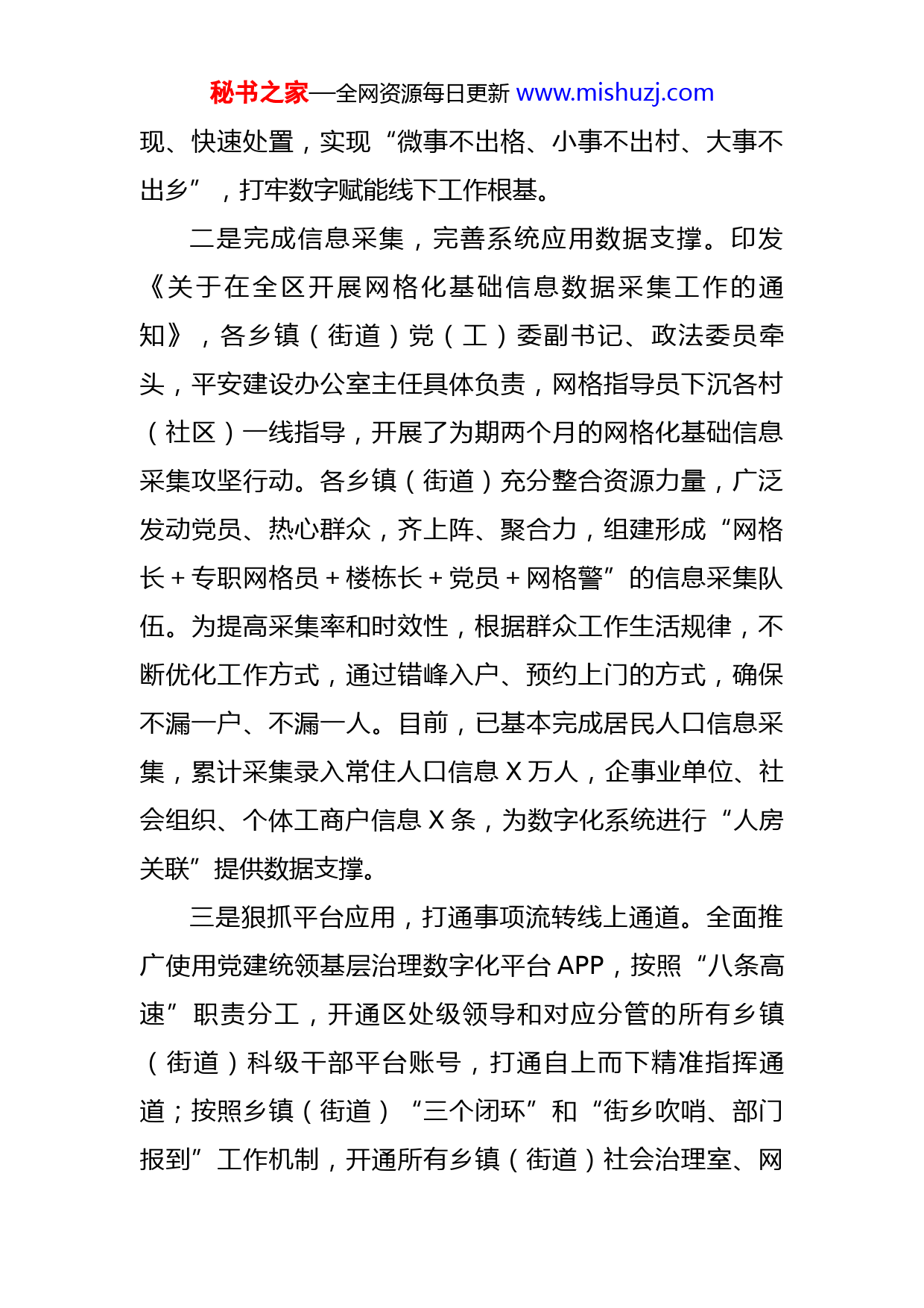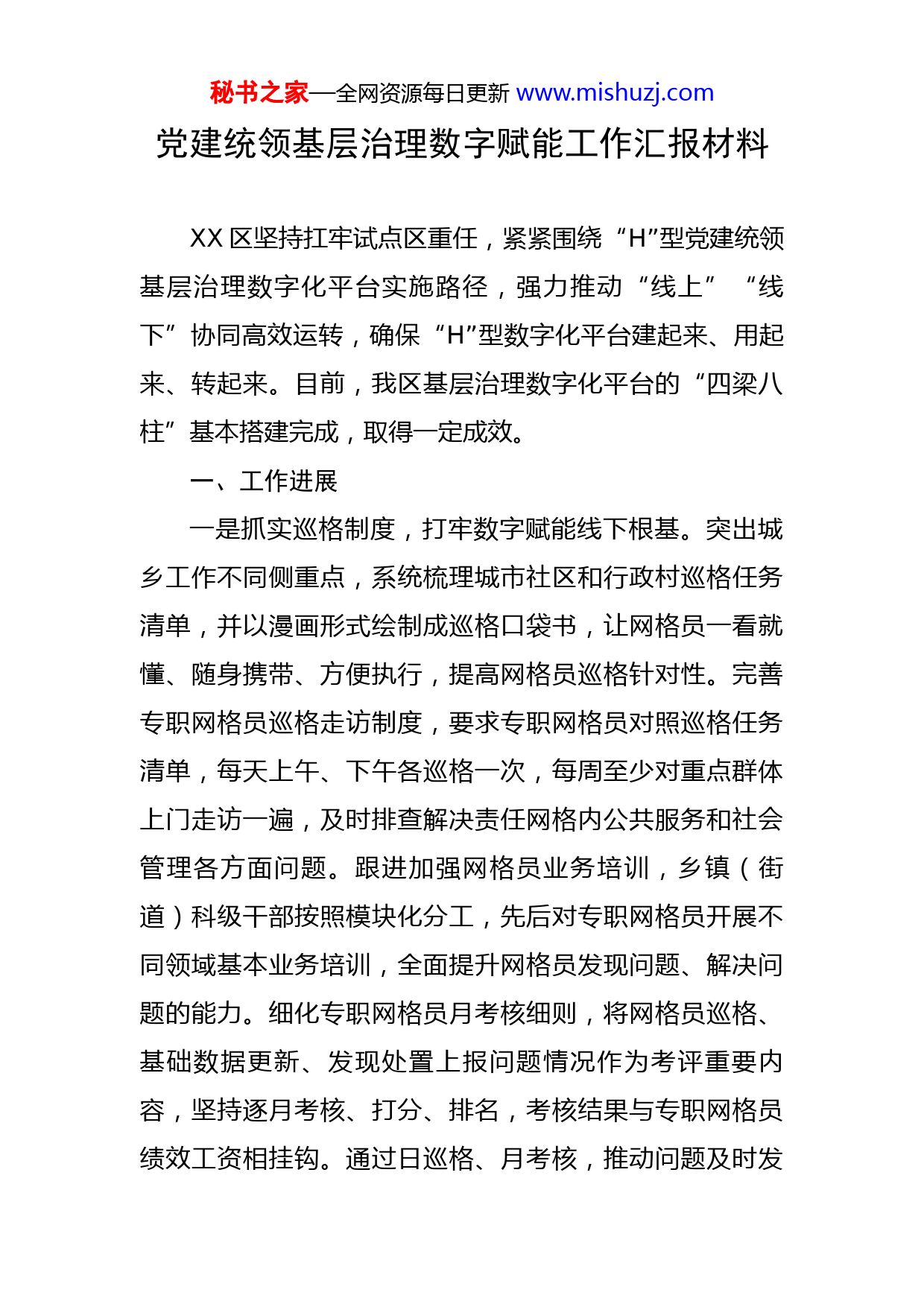 秘书之家—全网资源每日更新www.mishuzj.com党建统领基层治理数字赋能工作汇报材料XX区坚持扛牢试点区重任,紧紧围绕“H”型党建统领基层治理数字化平台实施路径,强力推动“线上”“线下”协同高效运转,确保“H”型数字化平台建起来、用起来、转起来。目前,我区基层治理数字化平台的“四梁八柱”基本搭建完成,取得一定成效。一、工作进展一是抓实巡格制度,打牢数字赋能线下根基。突出城乡工作不同侧重点,系统梳理城市社区和行政村巡格任务清单,并以漫画形式绘制成巡格口袋书,让网格员一看就懂、随身携带、方便执行,提高网格员巡格针对性。完善专职网格员巡格走访制度,要求专职网格员对照巡格任务清单,每天上午、下午各巡格一次,每周至少对重点群体上门走访一遍,及时排查解决责任网格内公共服务和社会管理各方面问题。跟进加强网格员业务培训,乡镇(街道)科级干部按照模块化分工,先后对专职网格员开展不同领域基本业务培训,全面提升网格员发现问题、解决问题的能力。细化专职网格员月考核细则,将网格员巡格、基础数据更新、发现处置上报问题情况作为考评重要内容,坚持逐月考核、打分、排名,考核结果与专职网格员绩效工资相挂钩。通过日巡格、月考核,推动问题及时发秘书之家—全网资源每日更新www.mishuzj.com现、快速处置,实现“微事不出格、小事不出村、大事不出乡”,打牢数字赋能线下工作根基。二是完成信息采集,完善系统应用数据支撑。印发《关于在全区开展网格化基础信息数据采集工作的通知》,各乡镇(街道)党(工)委副书记、政法委员牵头,平安建设办公室主任具体负责,网格指导员下沉各村(社区)一线指导,开展了为期两个月的网格化基础信息采集攻坚行动。各乡镇(街道)充分整合资源力量,广泛发动党员、热心群众,齐上阵、聚合力,组建形成“网格长+专职网格员+楼栋长+党员+网格警”的信息采集队伍。为提高采集率和时效性,根据群众工作生活规律,不断优化工作方式,通过错峰入户、预约上门的方式,确保不漏一户、不漏一人。目前,已基本完成居民人口信息采集,累计采集录入常住人口信息X万人,企事业单位、社会组织、个体工商户信息X条,为数字化系统进行“人房关联”提供数据支撑。三是狠抓平台应用,打通事项流转线上通道。全面推广使用党建统领基层治理数字化平台APP,按照“八条高速”职责分工,开通区处级领导和对应分管的所有乡镇(街道)科级干部平台账号,打通自上而下精准指挥通道;按照乡镇(街道)“三个闭环”和“街乡吹哨、部门报到”工作机制,开通所有乡镇(街道)社会治理室、网秘书之家—全网资源每日更新www.mishuzj.com格工作站、村(社区)“一长三员”以及区直单位平台账号,打通自下而上事项处置通道。区乡联动,分批组织乡镇(街道)、村(社区)网格员、区直单位负责同志以及有关处级领导培训X场次,通过实操培训、现场逐人演示过关的形式,确保“H”型数字化平台实施路径、事件流转流程应知应会、熟练操作。四是强化督导考评,推动数字平台高效运转。加大乡镇(街道)数字化平台推广应用力度,区工作专班、区委政法委抽调精干力量,联合市专班、华为公司,分组深入乡镇(街道)、村(社区),实地跟进督导平台安装使用情况。拟定《基层社会治理工作效能考核办法》,将乡镇(街道)数字化平台日常使用维护、网格化工作开展、事件流转办理和区直单位“吹哨报到”事件流转纳入考核重要内容,推动乡镇(街道)数字化平台运转常态化、高效率。截至目前,已通过数字化平台运转事项X件。其中,“三个闭环”自处理事项X件;“吹哨事项”X件,已办结X件、挂账X件、退办X件、正在办理X件;区处级领导运用“八条指挥通道”发布公告X项、安排工作任务X项、交办任务X项。二、存在问题及工作建议一是“三个闭环”事件流转质量有待进一步提高。虽然各乡镇(街道)通过平台流转事项的数量有了明显提秘书之家—全网资源每日更新www.mishuzj.com高,但是还存在着一些专职网格员将日常性工作上传平台,有的专职网格员因为年龄偏大,上报的事件标题、内容模糊不清等问题。建议持续加大对专职网格员使用APP培训指导力度,严格落实好网格员日巡格、日上报制度,不断提升事件流转质量。二是“吹哨报到”和“八条高速”两项流程利用率有待提高。“街乡吹哨、部门报到”机制推广运用力度还不够大,目前乡镇(街道)通过平台上报“吹哨事项”还不多;区处级领导通过“八条通道”下发通知、安排任务不够常态化。建议加大这两项流程推广使用力度,建立健全相应督导考评办法,推动基层治理数字化平台高效运转。三是基础信息数据亟需进一步完善。受疫情防控工作影响,有的专职网格员在采集信息时不够完整规范。建议联合华为公司,对数据进行补充、完善,保证全部达到录入系统标准。