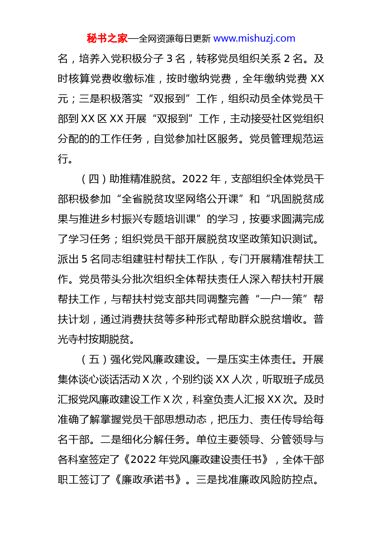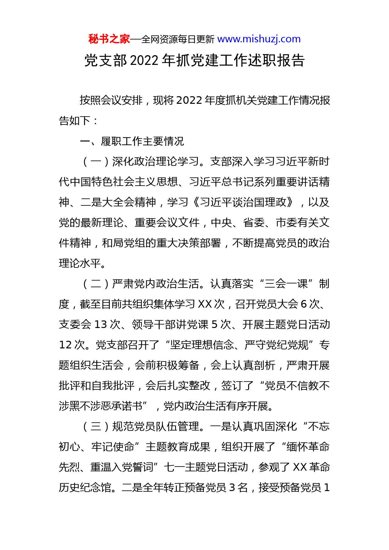 秘书之家—全网资源每日更新www.mishuzj.com党支部2022年抓党建工作述职报告按照会议安排,现将2022年度抓机关党建工作情况报告如下:一、履职工作主要情况(一)深化政治理论学习。支部深入学习习近平新时代中国特色社会主义思想、习近平总书记系列重要讲话精神、二是大全会精神,学习《习近平谈治国理政》,以及党的最新理论、重要会议文件,中央、省委、市委有关文件精神,和局党组的重大决策部署,不断提高党员的政治理论水平。(二)严肃党内政治生活。认真落实“三会一课”制度,截至目前共组织集体学习XX次,召开党员大会6次、支委会13次、领导干部讲党课5次、开展主题党日活动12次。党支部召开了“坚定理想信念、严守党纪党规”专题组织生活会,会前积极筹备,会上认真剖析,严肃开展批评和自我批评,会后扎实整改,签订了“党员不信教不涉黑不涉恶承诺书”,党内政治生活有序开展。(三)规范党员队伍管理。一是认真巩固深化“不忘初心、牢记使命”主题教育成果,组织开展了“缅怀革命先烈、重温入党誓词”七一主题党日活动,参观了XX革命历史纪念馆。二是全年转正预备党员3名,接受预备党员1秘书之家—全网资源每日更新www.mishuzj.com名,培养入党积极分子3名,转移党员组织关系2名。及时核算党费收缴标准,按时缴纳党费,全年缴纳党费XX元;三是积极落实“双报到”工作,组织动员全体党员干部到XX区XX开展“双报到”工作,主动接受社区党组织分配的的工作任务,自觉参加社区服务。党员管理规范运行。(四)助推精准脱贫。2022年,支部组织全体党员干部积极参加“全省脱贫攻坚网络公开课”和“巩固脱贫成果与推进乡村振兴专题培训课”的学习,按要求圆满完成了学习任务;组织党员干部开展脱贫攻坚政策知识测试。派出5名同志组建驻村帮扶工作队,专门开展精准帮扶工作。党员带头分批次组织全体帮扶责任人深入帮扶村开展帮扶工作,与帮扶村党支部共同调整完善“一户一策”帮扶计划,通过消费扶贫等多种形式帮助群众脱贫增收。普光寺村按期脱贫。(五)强化党风廉政建设。一是压实主体责任。开展集体谈心谈话活动X次,个别约谈XX人次,听取班子成员汇报党风廉政建设工作X次,科室负责人汇报XX次。及时准确了解掌握党员干部思想动态,把压力、责任传导给每名干部。二是细化分解任务。单位主要领导、分管领导与各科室签定了《2022年党风廉政建设责任书》,全体干部职工签订了《廉政承诺书》。三是找准廉政风险防控点。秘书之家—全网资源每日更新www.mishuzj.com对照工作职责,综合分析行业特点,准确研判廉政风险防控点,修订完善了《XX市XXX廉政风险防控手册》。全体党员廉政意识不断加强。(六)加强作风建设。一是严格落实中央八项规定精神,严控“三公”经费支出,严格执行公务用车、操办婚丧嫁娶事宜、个人重大事项报告等制度。二是加强纪律作风建设。结合作风建设年活动,认真贯彻落实习近平总书记关于整治形式主义、官僚主义的系列重要讲话和重要批示精神,着力整治形式主义官僚主义突出问题,制定印发了《XX市XX集中整治形式主义官僚主义突出问题实施方案》和《XX市XX关于集中整治形式主义官僚主义突出问题自查报告》,成立了领导小组,靠实了工作责任,确定了完成时限,明确了整改内容和落实措施,对问题“台账”实行动态管理。有效减少了会议次数和发文数量,工作效率进一步提高。二、存在的主要问题及原因一是部分党员学习的主动性不够,对理论知识学习不深不透,没有认识到学习的重要性,没有认识到通过学习提高自己本领的迫切性。二是党组织活动内容单一,缺乏创新。三是党员自学的和专题辅导还有待进一步加强。产生以上问题的主要原因是结合实际研究支部工作不到位,以完成党建工作任务指标为核心,方法不多,创新秘书之家—全网资源每日更新www.mishuzj.com滞后。三、下一步工作思路和主要措施(一)持续加强党的政治建设。牢牢把握机关党建的政治功能,持续加强习近平新时代中国特色社会主义理论的学习,增强党员干部政治素养和提高干事创业的能力。(二)持续压实工作责任。不断抓好党员学习教育工作和党员队伍建设,持续开展党员发展工作。严格党内组织生活,有效落实“三会一课”制度,扎实开展民主生活会和组织生活会。(三)持续创新工作方法。结合行业特色,业务特点,丰富主题党日活动内容,激发党员干事创业热情。充分运用多媒体,加大宣传报道,树立党员先锋模范榜样。