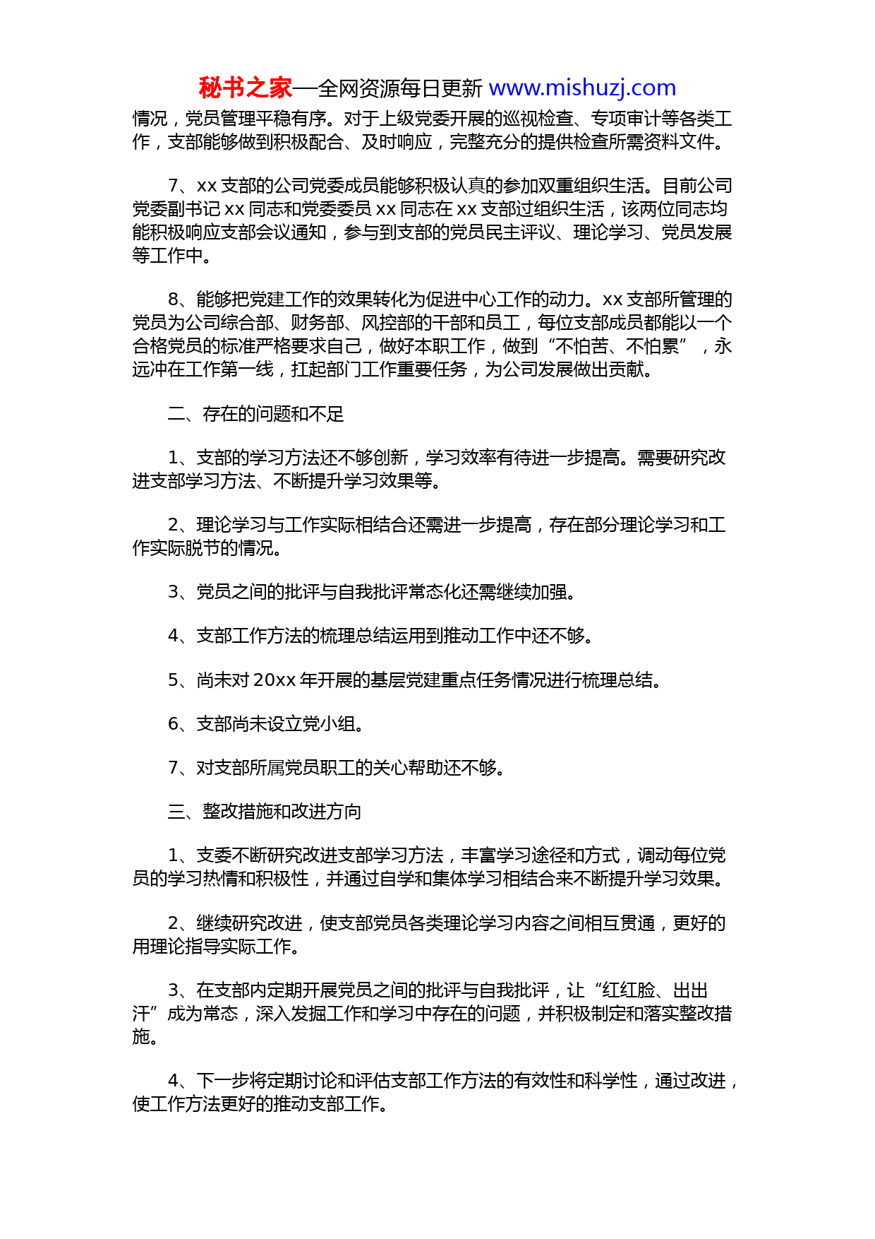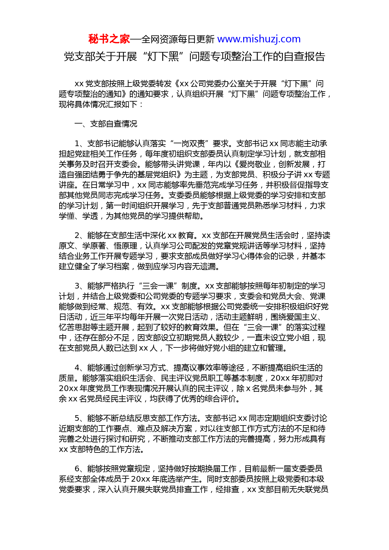 秘书之家—全网资源每日更新www.mishuzj.com党支部关于开展“灯下黑”问题专项整治工作的自查报告xx党支部按照上级党委转发《xx公司党委办公室关于开展“灯下黑”问题专项整治的通知》的通知要求,认真组织开展“灯下黑”问题专项整治工作,现将具体情况汇报如下:一、支部自查情况1、支部书记能够认真落实“一岗双责”要求。支部书记xx同志能主动承担起党建相关工作任务,每年度初组织支部委员认真制定学习计划,就支部相关事务及时召开支委会。能够带头讲党课,年内以《爱岗敬业,创新发展,打造自强团结勇于争先的基层党组织》为主题,为支部党员、积极分子讲xx专题讲座。在日常学习中,xx同志能够率先垂范完成学习任务,并积极督促指导支部其他党员同志完成学习任务。支委委员能够根据上级党委的学习安排和支部的学习计划,第一时间组织开展学习,先于支部普通党员熟悉学习材料,力求学懂、学透,为其他党员的学习提供帮助。2、能够在支部生活中深化xx教育。xx支部在开展党员生活会时,坚持读原文、学原著、悟原理,认真学习公司配发的党章党规讲话等学习材料,坚持结合业务工作开展专题学习,要求支部成员做好学习心得体会的记录,并基本建立健全了学习档案,做到应学习内容无遗漏。3、能够严格执行“三会一课”制度。xx支部能够按照每年初制定的学习计划,并结合上级党委和公司党委的专题学习要求,支委会和党员大会、党课能够做到经常、规范、有效。xx支部能够根据公司党委统一安排积极组织好党日活动,近三年平均每年开展一次党日活动,活动主题鲜明,围绕爱国主义、忆苦思甜等主题开展,起到了较好的教育效果。但在“三会一课”的落实过程中,还存在部分不足,因支部设立初期党员人数较少,一直未设立党小组,现在支部党员人数已达到xx人,下一步将做好党小组的建立和管理。4、能够通过创新学习方式、提高议事效率等途径,不断提高组织生活的质量。能够落实组织生活会、民主评议党员职工等基本制度,20xx年初即对20xx年度党员工作表现情况开展认真的民主评议,除x名党员未参与外,其余xx名党员经民主评议,均获得了优秀的综合评价。5、能够不断总结反思支部工作方法。支部书记xx同志定期组织支委讨论近期支部的工作要点、难点及解决方案,对以往支部工作方式方法的不足和待完善之处进行探讨和研究,不断推动支部工作方法的完善提高,努力形成具有xx支部特色的工作方法。6、能够按照党章规定,坚持做好按期换届工作,目前最新一届支委委员系经支部全体成员于20xx年底选举产生。同时支部委员按照上级党委和本级党委要求,深入认真开展失联党员排查工作,经排查,xx支部目前无失联党员秘书之家—全网资源每日更新www.mishuzj.com情况,党员管理平稳有序。对于上级党委开展的巡视检查、专项审计等各类工作,支部能够做到积极配合、及时响应,完整充分的提供检查所需资料文件。7、xx支部的公司党委成员能够积极认真的参加双重组织生活。目前公司党委副书记xx同志和党委委员xx同志在xx支部过组织生活,该两位同志均能积极响应支部会议通知,参与到支部的党员民主评议、理论学习、党员发展等工作中。8、能够把党建工作的效果转化为促进中心工作的动力。xx支部所管理的党员为公司综合部、财务部、风控部的干部和员工,每位支部成员都能以一个合格党员的标准严格要求自己,做好本职工作,做到“不怕苦、不怕累”,永远冲在工作第一线,扛起部门工作重要任务,为公司发展做出贡献。二、存在的问题和不足1、支部的学习方法还不够创新,学习效率有待进一步提高。需要研究改进支部学习方法、不断提升学习效果等。2、理论学习与工作实际相结合还需进一步提高,存在部分理论学习和工作实际脱节的情况。3、党员之间的批评与自我批评常态化还需继续加强。4、支部工作方法的梳理总结运用到推动工作中还不够。5、尚未对20xx年开展的基层党建重点任务情况进行梳理总结。6、支部尚未设立党小组。7、对支部所属党员职工的关心帮助还不够。三、整改措施和改进方向1、支委不断研究改进支部学习方法,丰富学习途径和方式,调动每位党员的学习热情和积极性,并通过自学和集体学习相结合来不断提升学习效果。2、继续研究改进,使支部党员各类理论学习内容之间相互贯通,更好的用理论指导实际工作。3、在支部内定期开展党员之间的批评与自我批评,让“红红脸、出出汗”成为常态,深入发掘工作和学习中存在的问题,并积极制定和落实整改措施。4、下一步将定期讨论和评估支部工作方法的有效性和科学性,通过改进,使工作方法更好的推动支部工作。秘书之家—全网资源每日更新www.mishuzj.com5、年底前,支部委员将对20xx年度基层党建重点任务的完成情况进行梳理和总结,发现落实工作中的不足之处,并加以改进。6、xx支部将尽快设立党小组并做好管理,同时邀请公司党委成员以普通党员身份经常参加所在党小组的活动,在学习时间、内容、效果上起好带头示范作用。7、下一步,将注重加强对党员职工的关心帮助,帮助解决思想上的困惑、工作和生活上的困难,让党员职工切实感受到组织温暖,增强组织归属感。