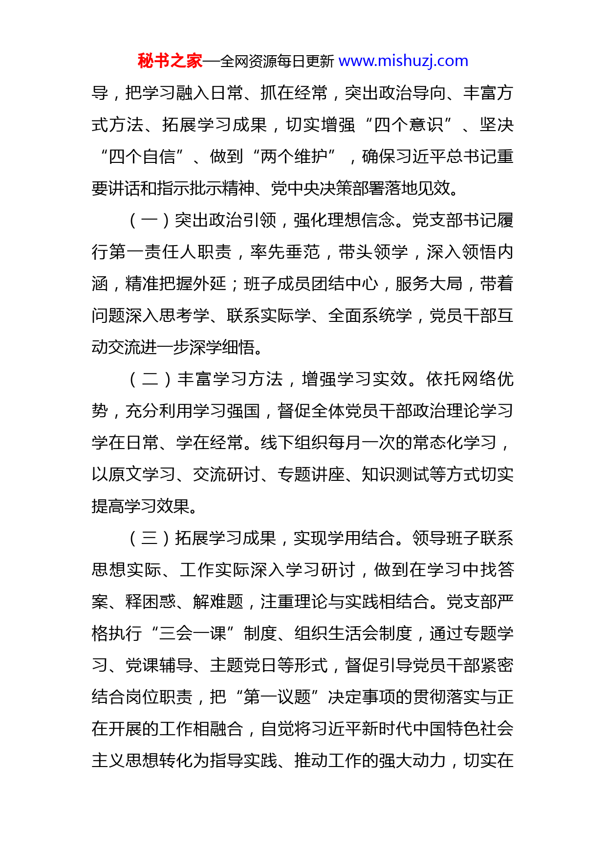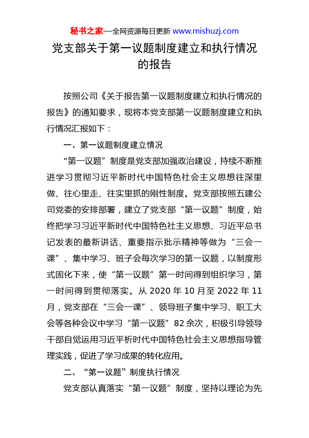 秘书之家—全网资源每日更新www.mishuzj.com党支部关于第一议题制度建立和执行情况的报告按照公司《关于报告第一议题制度建立和执行情况的报告》的通知要求,现将本党支部第一议题制度建立和执行情况汇报如下:一、第一议题制度建立情况“第一议题”制度是党支部加强政治建设,持续不断推进学习贯彻习近平新时代中国特色社会主义思想往深里做、往心里走、往实里抓的刚性制度。党支部按照五建公司党委的安排部署,建立了党支部“第一议题”制度,始终把学习习近平新时代中国特色社主义思想、习近平总书记发表的最新讲话、重要指示批示精神等做为“三会一课”、集中学习、班子会每次学习的第一议题,以制度形式固化下来,使“第一议题”第一时间得到组织学习,第一时间得到贯彻落实。从2020年10月至2022年11月,党支部在“三会一课”、领导班子集中学习、职工大会等各种会议中学习“第一议题”82余次,积极引导领导干部自觉运用习近平析时代中国特色社会主义思想指导管理实践,促进了学习成果的转化应用。二、“第一议题”制度执行情况党支部认真落实“第一议题”制度,坚持以理论为先秘书之家—全网资源每日更新www.mishuzj.com导,把学习融入日常、抓在经常,突出政治导向、丰富方式方法、拓展学习成果,切实增强“四个意识”、坚决“四个自信”、做到“两个维护”,确保习近平总书记重要讲话和指示批示精神、党中央决策部署落地见效。(一)突出政治引领,强化理想信念。党支部书记履行第一责任人职责,率先垂范,带头领学,深入领悟内涵,精准把握外延;班子成员团结中心,服务大局,带着问题深入思考学、联系实际学、全面系统学,党员干部互动交流进一步深学细悟。(二)丰富学习方法,增强学习实效。依托网络优势,充分利用学习强国,督促全体党员干部政治理论学习学在日常、学在经常。线下组织每月一次的常态化学习,以原文学习、交流研讨、专题讲座、知识测试等方式切实提高学习效果。(三)拓展学习成果,实现学用结合。领导班子联系思想实际、工作实际深入学习研讨,做到在学习中找答案、释困惑、解难题,注重理论与实践相结合。党支部严格执行“三会一课”制度、组织生活会制度,通过专题学习、党课辅导、主题党日等形式,督促引导党员干部紧密结合岗位职责,把“第一议题”决定事项的贯彻落实与正在开展的工作相融合,自觉将习近平新时代中国特色社会主义思想转化为指导实践、推动工作的强大动力,切实在秘书之家—全网资源每日更新www.mishuzj.com学习中发现问题、提出问题、研究问题、解决问题做到学思用贯通、知信行统一。三、存在的不足党员领导干部在学深悟透方面还不够,面对新情况新问题,深入思考不够,探索研究不够。领导干部以上率下,带头攻坚克难方面做的不够。四、改进措施(一)加强党支部理论学习,提高政治素质。进一步学习贯彻党的XX大精神,认真组织学习习近平新时代中国特色社会主义思想和系列重要讲话精神,坚持用理论武装头脑、指导实践、推动工作,牢固地树立“四个意识”,坚定“四个自信”,引导全体党员干部在政治上同党中央保持一致,不断增强政治鉴别力和政治定力,在大是大非前不为巧言所惑、不为歪风所动,打牢开拓进取、努力奋斗的思想基础。(二)提升宗旨意识,密切联系群众。在服务大局上下功夫,引导全体党员干部牢固树立全心全意为人民服务思想,保持思想道德的纯洁性,正确对待权力、金钱、名利,在工作中,领导班子成员要深入基层一线,倾听群众意见,把群众满意作为第一标准,脚踏实地地投入到工作中去,努力提高工作能力和服务水平。
