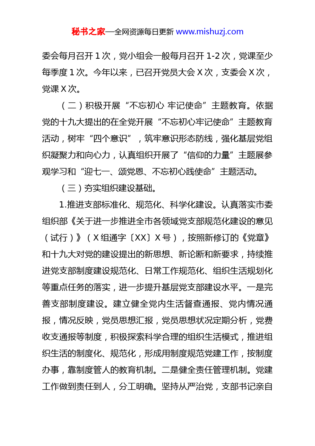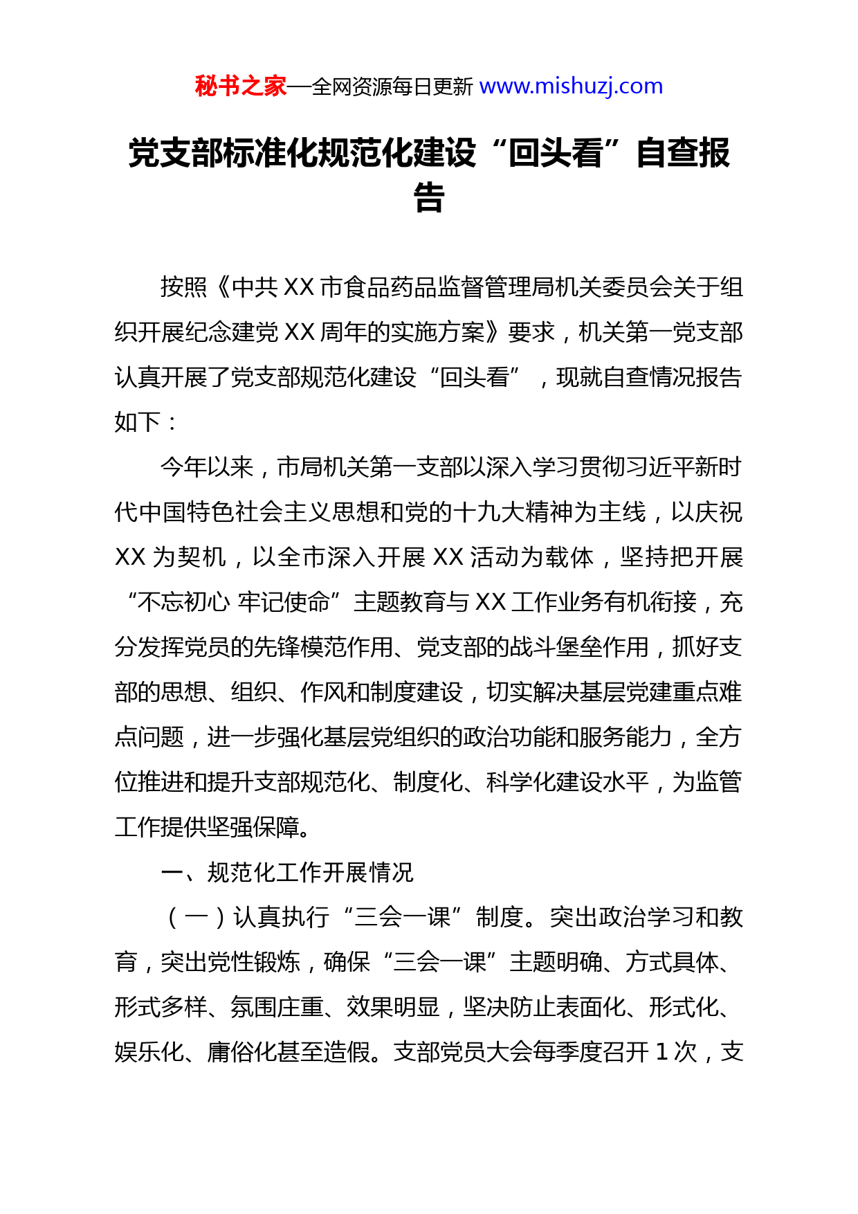 秘书之家—全网资源每日更新www.mishuzj.com党支部标准化规范化建设“回头看”自查报告按照《中共XX市食品药品监督管理局机关委员会关于组织开展纪念建党XX周年的实施方案》要求,机关第一党支部认真开展了党支部规范化建设“回头看”,现就自查情况报告如下:今年以来,市局机关第一支部以深入学习贯彻习近平新时代中国特色社会主义思想和党的十九大精神为主线,以庆祝XX为契机,以全市深入开展XX活动为载体,坚持把开展“不忘初心牢记使命”主题教育与XX工作业务有机衔接,充分发挥党员的先锋模范作用、党支部的战斗堡垒作用,抓好支部的思想、组织、作风和制度建设,切实解决基层党建重点难点问题,进一步强化基层党组织的政治功能和服务能力,全方位推进和提升支部规范化、制度化、科学化建设水平,为监管工作提供坚强保障。一、规范化工作开展情况(一)认真执行“三会一课”制度。突出政治学习和教育,突出党性锻炼,确保“三会一课”主题明确、方式具体、形式多样、氛围庄重、效果明显,坚决防止表面化、形式化、娱乐化、庸俗化甚至造假。支部党员大会每季度召开1次,支秘书之家—全网资源每日更新www.mishuzj.com委会每月召开1次,党小组会一般每月召开1-2次,党课至少每季度1次。今年以来,已召开党员大会X次,支委会X次,党课X次。(二)积极开展“不忘初心牢记使命”主题教育。依据党的十九大提出的在全党开展“不忘初心牢记使命”主题教育活动,树牢“四个意识”,筑牢意识形态防线,强化基层党组织凝聚力和向心力,认真组织开展了“信仰的力量”主题展参观学习和“迎七一、颂党恩、不忘初心践使命”主题活动。(三)夯实组织建设基础。1.推进支部标准化、规范化、科学化建设。认真落实市委组织部《关于进一步推进全市各领域党支部规范化建设的意见(试行)》(X组通字〔XX〕X号),按照新修订的《党章》和十九大对党的建设提出的新思想、新论断和新要求,持续推进党支部制度建设规范化、日常工作规范化、组织生活规划化等重点任务的落实,进一步提升基层党支部建设水平。一是完善支部制度建设。建立健全党内生活督查通报、党内情况通报,情况反映,党员思想汇报,党员思想状况定期分析,党费收支通报等制度,积极探索科学合理的组织生活模式,推进组织生活的制度化、规范化,形成用制度规范党建工作,按制度办事,靠制度管人的教育机制。二是健全责任管理机制。党建工作做到责任到人,分工明确。坚持从严治党,支部书记亲自秘书之家—全网资源每日更新www.mishuzj.com抓,负总责。坚持集体领导和个人分工负责相结合的原则,坚持少数服从多数,个人服从组织的原则。三是经常性开展组织生活。结合工作实际,通过党支部书记引领和党员发言讨论等形式,“以党的话说业务的事”,开展批评和自我批评,加强对党员的日常监管。认真培养入党积极分子,完成了新一届支部委员会换届选举工作。2.规范党费收缴工作。按照《党章》规定,按时足额交纳党费,每半年上缴机关党委,并及时公布党费收支情况。3.大力推广党支部主题党日活动。结合“三会一课”制度,每月确定一天开展主题党日活动,主要做好“1+X”动作,“1”就是1套规定动作,即奏唱国歌、重温入党誓词、诵读党章、交纳党费、研学党规党情等;“X”包括每月的主题内容和中央、自治区党委、市委的有关要求及自选动作。充分发挥主题党日活动作用,密切联系广大党员干部群众的学习、工作和生活,有计划、高效率的抓住重大纪念日、重要节点和传统节庆日等契机,把党日活动与中心工作、与创建党建品牌、与党员学习教育、与精准扶贫、与培育社会主义核心价值观、与正风肃纪紧密结合起来。今年以来,按有关要求认真组织开展了主题党日活动X次。4.丰富支部文化生活。以广大党员群众喜闻乐见、引人入胜为标准,围绕中国共产党成立XX周年等重大节日,通过文秘书之家—全网资源每日更新www.mishuzj.com艺表演、诗歌朗诵、知识竞赛等形式,开展丰富多彩、党性原则强的活动,进一步增强党支部的凝聚力向心力,不断丰富党员群众业余文化生活。活动要有具体工作方案,开展活动情况应以文字和图片形式记录和保存。5.加强支部宣传工作。继续加强党支部宣传工作,对党支部的近期动态进行宣传和及时反馈,加强信息报送,每月至少上报1条党建信息。充分利用移动通信网络技术,继续发挥新媒体优势,积极构建新的宣传平台和宣传策略,推动党支部工作再上新台阶。(五)组织开展在职党员进社区活动。每年深入社区开展集体活动至少三次,有详实的活动记录、图文信息。(六)持之以恒抓反腐倡廉建设。强化政治纪律和组织纪律,严格落实八项规定精神,加强党员干部党风廉政教育,运用警示手段,推进廉政宣传教育活动。今年以来,参加了机关党委组织的廉政主题教育活动,观看X部廉政警示教育片,近日,主要领导将讲解X次廉政党课。二、存在问题对新形势教育学习的重要性认识不足,对理论学习重视程度不够,创新意识不强,对相关业务工作及工作标准要求还不够高,工作中安排多,抓落实少,标准要求不够严格。三、下一步工作计划秘书之家—全网资源每日更新www.mishuzj.com今后,一支部将按照机关党委有关要求,结合机关一支部实际,在持续抓好学习教育和支部规范