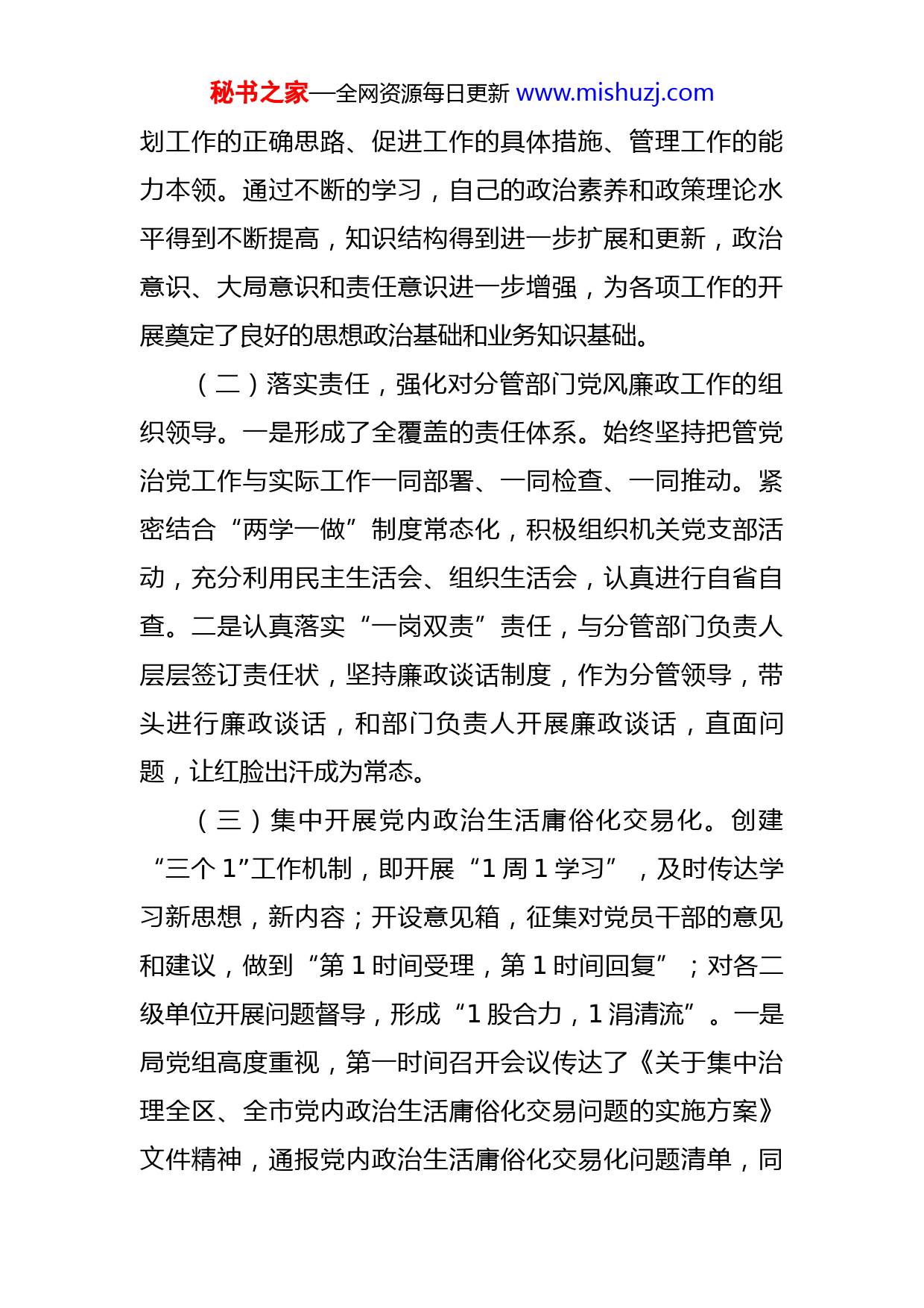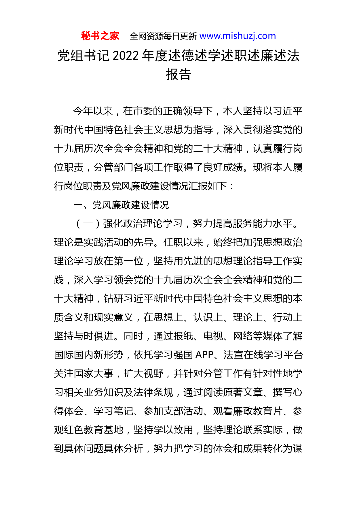 秘书之家—全网资源每日更新www.mishuzj.com党组书记2022年度述德述学述职述廉述法报告今年以来,在市委的正确领导下,本人坚持以习近平新时代中国特色社会主义思想为指导,深入贯彻落实党的十九届历次全会全会精神和党的二十大精神,认真履行岗位职责,分管部门各项工作取得了良好成绩。现将本人履行岗位职责及党风廉政建设情况汇报如下:一、党风廉政建设情况(一)强化政治理论学习,努力提高服务能力水平。理论是实践活动的先导。任职以来,始终把加强思想政治理论学习放在第一位,坚持用先进的思想理论指导工作实践,深入学习领会党的十九届历次全会全会精神和党的二十大精神,钻研习近平新时代中国特色社会主义思想的本质含义和现实意义,在思想上、认识上、理论上、行动上坚持与时俱进。同时,通过报纸、电视、网络等媒体了解国际国内新形势,依托学习强国APP、法宣在线学习平台关注国家大事,扩大视野,并针对分管工作有针对性地学习相关业务知识及法律条规,通过阅读原著文章、撰写心得体会、学习笔记、参加支部活动、观看廉政教育片、参观红色教育基地,坚持学以致用,坚持理论联系实际,做到具体问题具体分析,努力把学习的体会和成果转化为谋秘书之家—全网资源每日更新www.mishuzj.com划工作的正确思路、促进工作的具体措施、管理工作的能力本领。通过不断的学习,自己的政治素养和政策理论水平得到不断提高,知识结构得到进一步扩展和更新,政治意识、大局意识和责任意识进一步增强,为各项工作的开展奠定了良好的思想政治基础和业务知识基础。(二)落实责任,强化对分管部门党风廉政工作的组织领导。一是形成了全覆盖的责任体系。始终坚持把管党治党工作与实际工作一同部署、一同检查、一同推动。紧密结合“两学一做”制度常态化,积极组织机关党支部活动,充分利用民主生活会、组织生活会,认真进行自省自查。二是认真落实“一岗双责”责任,与分管部门负责人层层签订责任状,坚持廉政谈话制度,作为分管领导,带头进行廉政谈话,和部门负责人开展廉政谈话,直面问题,让红脸出汗成为常态。(三)集中开展党内政治生活庸俗化交易化。创建“三个1”工作机制,即开展“1周1学习”,及时传达学习新思想,新内容;开设意见箱,征集对党员干部的意见和建议,做到“第1时间受理,第1时间回复”;对各二级单位开展问题督导,形成“1股合力,1涓清流”。一是局党组高度重视,第一时间召开会议传达了《关于集中治理全区、全市党内政治生活庸俗化交易问题的实施方案》文件精神,通报党内政治生活庸俗化交易化问题清单,同秘书之家—全网资源每日更新www.mishuzj.com时,成立了党内政治生活庸俗化交易化问题工作领导小组,制定详实的《准格尔市农牧局关于集中治理党内政治生活庸俗化交易化问题实施方案的通知》文件精神,进一步细化实化工作措施。二是注重谋划部署。坚持专题研讨与警示教育相结合,召开理论学习中心组(扩大)专题研讨会1次,警示教育3次,切实让党员干部筑牢思想防线,守住廉洁底线,不越法纪红线。三是注重自查自纠。坚持党员干部自查自纠与承诺践诺相结合,对照11个问题清单,54种具体情形,共查找出6个方面问题,94条内容,已进行全面整改。二、意识形态工作履行情况认真履行意识形态主体责任,全面抓好抓实意识形态工作,坚持把凝聚人心作为抓好意识形态工作的出发点和落脚点,强化领导,周密部署,种好“责任田”,守住“主阵地”,筑牢“心”境界。结合工作实际,把警示教育放在重中之重,深入开展党员干部职业道德教育、法治理念教育、荣辱观教育和廉政警示教育。对新入职的同志进行廉政谈心谈话,及时查究党员干部在思想、工作、纪律、作风方面存在的倾向性、苗头性问题,提醒他们增强责任感,绷紧拒腐防变思想道德防线。一年来,局党组研究意识形态工作专题会议2次,意识形态分析研判会议1次,召开意识形态工作部署会、推进会各1次。局党组中秘书之家—全网资源每日更新www.mishuzj.com心组学习累计11次,其中包括6次专题研讨,每位领导干部都提交了书面研讨材料。三、个人廉洁自律情况作为一名党员领导干部,平时能按照党员的标准严格要求自己,自觉遵守和执行党的政策、法律和各项规章制度。在政治纪律上,始终保持了敏锐性和坚定性,敢于抵制不正之风,自觉与上级党组织保持一致;在组织纪律上,坚持民主集中制,做到了有请示有汇报,自觉维护领导和组织的威信,执行组织的决定、决议,始终把自己置于组织之中、领导之下开展工作;在工作纪律上,坚持上下班时间,自觉遵守机关的各项规章制度,认真履行工作职责,做到了不迟到早退,不无故请假,不消极怠工,不公车私用,以主人翁姿态搞好工作;在生活纪律上,严格遵守党风廉政建设的规定,严格落实领导干部廉洁从政若干总则,从不讲条件,摆阔气,争攀比,做到了清正廉洁、秉公办事;在领导岗位上,始终以身作则,时时事事作出表率,团结同志,尊重他人,一视同仁,从不搞特殊,凡是要求别人做到的自己首先做到,以实际行动在人民群众中树立起了机关和领导干部的良好形象。四、全面落实主体责任,积极支持配合巡察整改等“回头看”情况巡察整改“回头看”是一项重要而又严肃的政治任秘书之家—全网资源每日更新www.mishuzj.com务
