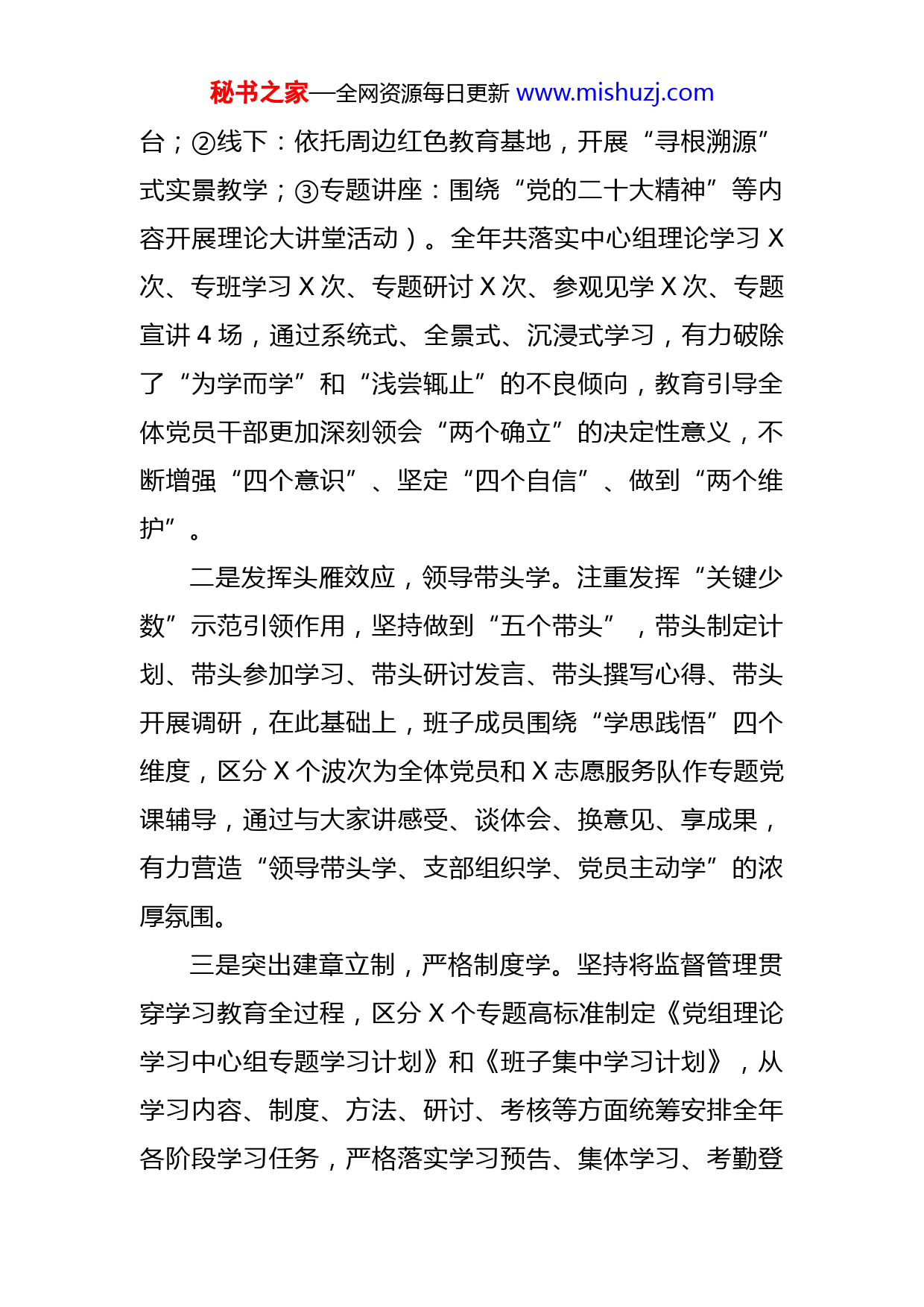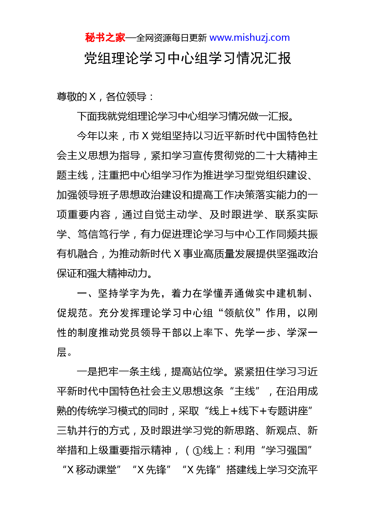 秘书之家—全网资源每日更新www.mishuzj.com党组理论学习中心组学习情况汇报尊敬的X,各位领导:下面我就党组理论学习中心组学习情况做一汇报。今年以来,市X党组坚持以习近平新时代中国特色社会主义思想为指导,紧扣学习宣传贯彻党的二十大精神主题主线,注重把中心组学习作为推进学习型党组织建设、加强领导班子思想政治建设和提高工作决策落实能力的一项重要内容,通过自觉主动学、及时跟进学、联系实际学、笃信笃行学,有力促进理论学习与中心工作同频共振有机融合,为推动新时代X事业高质量发展提供坚强政治保证和强大精神动力。一、坚持学字为先,着力在学懂弄通做实中建机制、促规范。充分发挥理论学习中心组“领航仪”作用,以刚性的制度推动党员领导干部以上率下、先学一步、学深一层。一是把牢一条主线,提高站位学。紧紧扭住学习习近平新时代中国特色社会主义思想这条“主线”,在沿用成熟的传统学习模式的同时,采取“线上+线下+专题讲座”三轨并行的方式,及时跟进学习党的新思路、新观点、新举措和上级重要指示精神,(①线上:利用“学习强国”“X移动课堂”“X先锋”“X先锋”搭建线上学习交流平秘书之家—全网资源每日更新www.mishuzj.com台;②线下:依托周边红色教育基地,开展“寻根溯源”式实景教学;③专题讲座:围绕“党的二十大精神”等内容开展理论大讲堂活动)。全年共落实中心组理论学习X次、专班学习X次、专题研讨X次、参观见学X次、专题宣讲4场,通过系统式、全景式、沉浸式学习,有力破除了“为学而学”和“浅尝辄止”的不良倾向,教育引导全体党员干部更加深刻领会“两个确立”的决定性意义,不断增强“四个意识”、坚定“四个自信”、做到“两个维护”。二是发挥头雁效应,领导带头学。注重发挥“关键少数”示范引领作用,坚持做到“五个带头”,带头制定计划、带头参加学习、带头研讨发言、带头撰写心得、带头开展调研,在此基础上,班子成员围绕“学思践悟”四个维度,区分X个波次为全体党员和X志愿服务队作专题党课辅导,通过与大家讲感受、谈体会、换意见、享成果,有力营造“领导带头学、支部组织学、党员主动学”的浓厚氛围。三是突出建章立制,严格制度学。坚持将监督管理贯穿学习教育全过程,区分X个专题高标准制定《党组理论学习中心组专题学习计划》和《班子集中学习计划》,从学习内容、制度、方法、研讨、考核等方面统筹安排全年各阶段学习任务,严格落实学习预告、集体学习、考勤登秘书之家—全网资源每日更新www.mishuzj.com记、交流研讨、情况报告等组织流程,并纳入党员领导干部年度述职述学述廉,确保学习活动“清单化、流程化、具体化、严格化”,促进中心组学习由“软任务”向“硬约束”转变。二、坚持发展为要,着力在学习实践转化中抓重点、攻难点。坚持把围绕中心、服务大局作为党组中心组学习的重要原则,努力使学习成为指导工作、服务决策的思想引擎。一是围绕关爱民生学,做共同富裕的实践者。开展专题学习会,深入学习领会习近平总书记关于《扎实推动共同富裕》重要文章,围绕“在实现共同富裕进程中进一步融入高质量发展大局”,中心组成员集思广益、群策群力,积极探索新形势下“互联网+公益”“企业+个人”的人道资源动员模式,通过创建“锡红公益联盟”、举办全市“XX”活动、开展“X”网络众筹等实践活动,切实把党委政府和社会各界的关心关爱转化成为实实在在的人道成效。今年以来,共募集社会捐赠款物X万元,实施精准救助X万元,其中,援助X、X地区X万元款物,惠及X万余人,通过广覆盖和精准帮,有力发挥了X在托底防漏上的最大效果。二是围绕服务大局学,做改革创新的推动者。围绕提升服务经济社会发展能力,区分X个波次,系统学习中央秘书之家—全网资源每日更新www.mishuzj.com和省、市委全面深化改革委员会系列会议精神,引导党员领导干部切实把“担使命作贡献”落实到创新思路举措上、体现到群众认可满意上。坚决落实习近平总书记“人民至上,生命至上”的执政理念,在全省率先以政府办名义出台《X市应急救护培训五年行动计划》,推动应急救护知识和技能向重点行业、重点领域、重点人群覆盖,累计开展救护培训X余万人,占户籍人口的X%。建成融“急救志愿者、公共场所急救设备、社会急救平台”于一体的“一键救援”系统和涵盖X余台自动体外除颤器的AED导航地图,实现人人共享“急有所救”。与市公安局联合实施“帮你回家”易走失人员定位手环项目,向患有阿尔兹海默症、精神及智力障碍等易走失特殊困难群体免费发放定位手环X个,赢得社会各界广泛赞誉。围绕打通数据壁垒,全面升级“X市X综合信息管理系统”,构建“会员志愿者管理、捐赠捐献、人道救助、应急救护培训”等“四大模块”,同步实现捐赠、捐献、救助、救护培训共X万余条数据融入市级大数据中心,打造“整体智治”人道服务新格局,在全市创新发展的火热实践中书写了X的精彩一笔。三是围绕扩大影响学,做人道精神的传播者。结合学习习近平总书记《论党的宣传思想工作》和有关意识形态工作重要论述,主动将中心组学习课堂融入基层党群服务秘书之家—全网资源每日更新www.mishuzj.com中心、新时代文明实践中心(所、站)、社