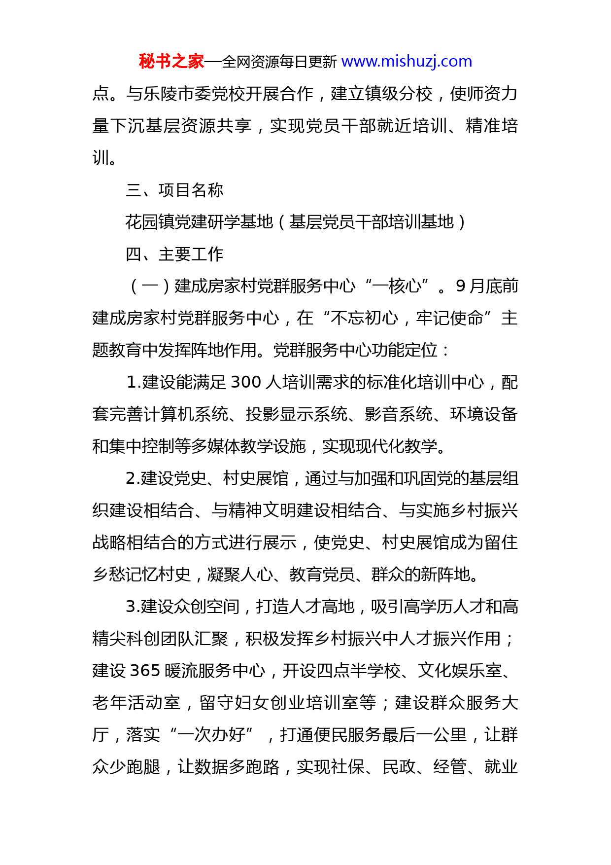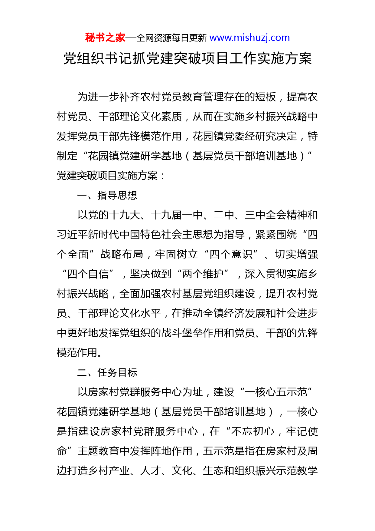 秘书之家—全网资源每日更新www.mishuzj.com党组织书记抓党建突破项目工作实施方案为进一步补齐农村党员教育管理存在的短板,提高农村党员、干部理论文化素质,从而在实施乡村振兴战略中发挥党员干部先锋模范作用,花园镇党委经研究决定,特制定“花园镇党建研学基地(基层党员干部培训基地)”党建突破项目实施方案:一、指导思想以党的十九大、十九届一中、二中、三中全会精神和习近平新时代中国特色社会主思想为指导,紧紧围绕“四个全面”战略布局,牢固树立“四个意识”、切实增强“四个自信”,坚决做到“两个维护”,深入贯彻实施乡村振兴战略,全面加强农村基层党组织建设,提升农村党员、干部理论文化水平,在推动全镇经济发展和社会进步中更好地发挥党组织的战斗堡垒作用和党员、干部的先锋模范作用。二、任务目标以房家村党群服务中心为址,建设“一核心五示范”花园镇党建研学基地(基层党员干部培训基地),一核心是指建设房家村党群服务中心,在“不忘初心,牢记使命”主题教育中发挥阵地作用,五示范是指在房家村及周边打造乡村产业、人才、文化、生态和组织振兴示范教学秘书之家—全网资源每日更新www.mishuzj.com点。与乐陵市委党校开展合作,建立镇级分校,使师资力量下沉基层资源共享,实现党员干部就近培训、精准培训。三、项目名称花园镇党建研学基地(基层党员干部培训基地)四、主要工作(一)建成房家村党群服务中心“一核心”。9月底前建成房家村党群服务中心,在“不忘初心,牢记使命”主题教育中发挥阵地作用。党群服务中心功能定位:1.建设能满足300人培训需求的标准化培训中心,配套完善计算机系统、投影显示系统、影音系统、环境设备和集中控制等多媒体教学设施,实现现代化教学。2.建设党史、村史展馆,通过与加强和巩固党的基层组织建设相结合、与精神文明建设相结合、与实施乡村振兴战略相结合的方式进行展示,使党史、村史展馆成为留住乡愁记忆村史,凝聚人心、教育党员、群众的新阵地。3.建设众创空间,打造人才高地,吸引高学历人才和高精尖科创团队汇聚,积极发挥乡村振兴中人才振兴作用;建设365暖流服务中心,开设四点半学校、文化娱乐室、老年活动室,留守妇女创业培训室等;建设群众服务大厅,落实“一次办好”,打通便民服务最后一公里,让群众少跑腿,让数据多跑路,实现社保、民政、经管、就业秘书之家—全网资源每日更新www.mishuzj.com等服务“一窗通办”。4.建设2000平米高标准文化活动广场,打造成为融思想引领、道德教化、文化传承等多种功能于一体的新时代文明实践站。(二)打造“五示范”引领现场教学点。整合教育培训资源,立足党员、干部学习需求和教育内容,开发现场教学点位,将乡村振兴服务队派驻的5个村进行高标准打造,形成一村一品,与房家、恭敬李等村一起打造乡村产业、人才、文化、生态和组织振兴示范教学点,并形成精品教学观摩路线,促使现场教学成为“第二课堂”,推动课堂教学、基地教学与社会实践有机结合。1.产业振兴示范教学点。打造以留兰香种植合作社为代表的党支部领创办合作社教学点、以周家村、前刘村果蔬大棚为代表的现代农业示范教学点2.人才振兴示范教学点。依托房家村众创空间和专家人才公寓,打造人才振兴示范教学点,实现筑巢引凤,人才回流。3.文化振兴示范教学点。一是王母殿村结合碧霞元君故居3A级旅游景区打造特色文旅示范点;二是花园村利用村级活动场所和村内闲置幼儿园,打造新时代文明实践中心示范点。4.生态振兴示范教学点。关家村发挥交通优势,与赵家秘书之家—全网资源每日更新www.mishuzj.com村合力打造“水墨关赵”生态文明示范点;东河堐通过整修村内道路、下水道、美化道路两侧墙体,打造美丽乡村示范点。5.组织振兴示范教学点。一是后刘村结合集体资源清理,打造村集体经济增收示范点;二是依托恭敬李、仲家等村软弱涣散村整顿提升样板村打造组织振兴教学点。三是优化“数字花园”微信小程序,打造小微权力规范运行示范点。(三)建立市委党校镇级分校,增强师资配备。研学基地建成后,积极与中共乐陵市委党校对接,建立镇级分校,由市委党校选派优秀教师到研学基地授课,使师资下沉基层资源共享,实现党员干部就近培训、精准培训。建立镇级党建师资培养计划,重点从党政班子成员、优秀党组织书记、第一书记、种养殖能手、返乡创业成功人士中推荐培养,建设一支“质量优良、结构合理、精干高效”等师资队伍。五、保障措施(一)强化组织保障。成立以党委书记周强同志为组长的基层党建突破项目工作领导小组,细化任务,压实责任,确保行动计划有序推进。领导小组每月召开一次党委会专题研究基层党建突破项目实施情况。(二)强化宣传引导。坚持正确的舆论导向,利用秘书之家—全网资源每日更新www.mishuzj.com“碧霞故里生态花园”微信公众平台以及市级以上媒体加强对突破项目实施意义的宣传,创造良好的工作氛围,不断增强广大党员、干部的工作热情,提高党建突破项目实施的积极性。(三)善用督导考核。制定考核细则,严格奖惩,将基层党建突破项目推进落实作为年底评先树优的重要参考,对于工作推进不力的进行通报批评。中共乐陵市花园镇委员会X年8月10日花园镇基层党建突