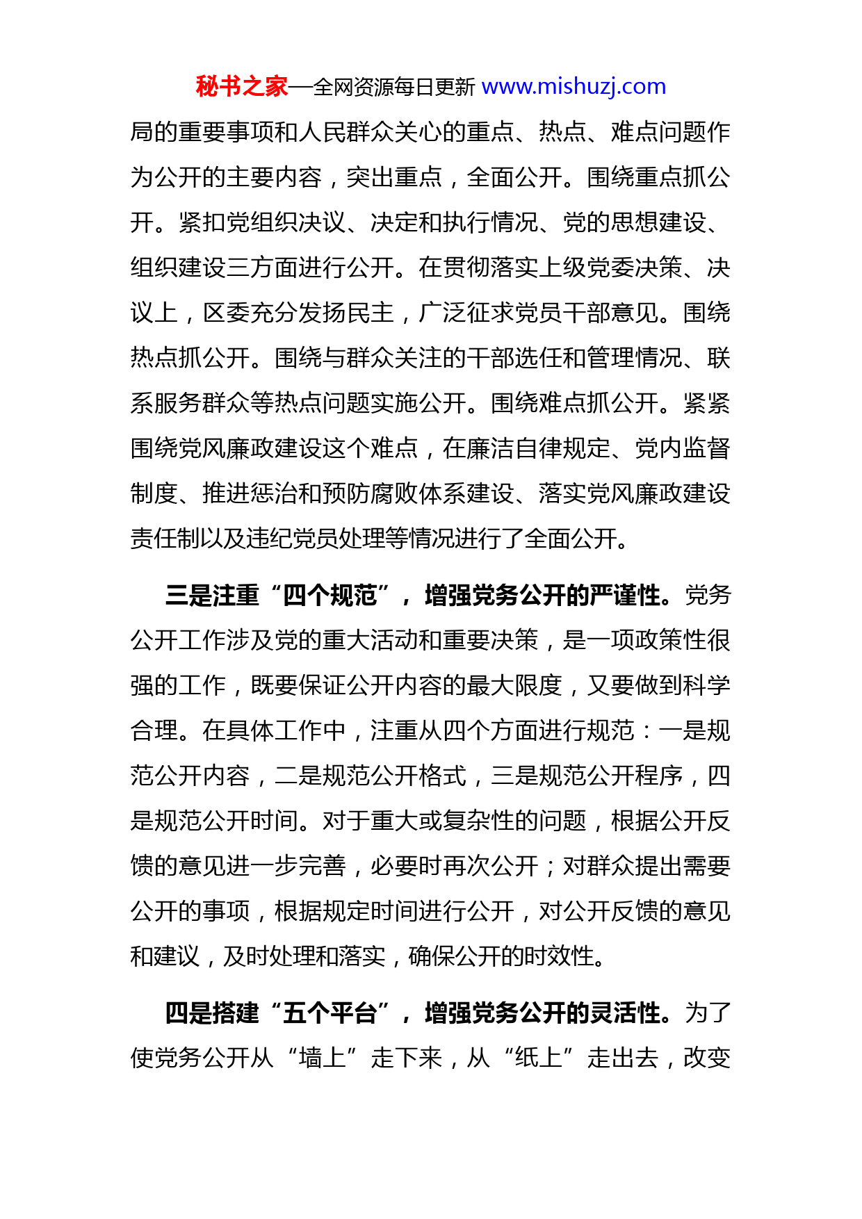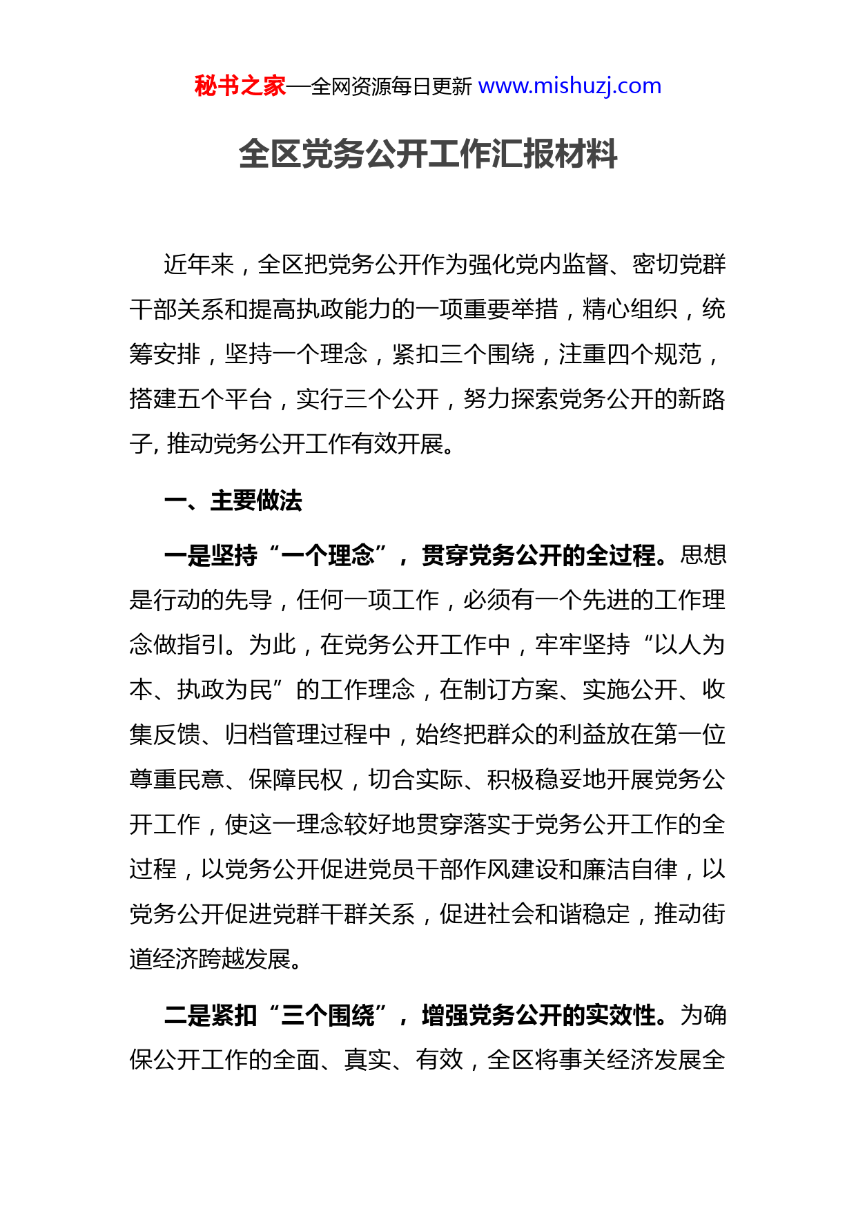 秘书之家—全网资源每日更新www.mishuzj.com全区党务公开工作汇报材料近年来,全区把党务公开作为强化党内监督、密切党群干部关系和提高执政能力的一项重要举措,精心组织,统筹安排,坚持一个理念,紧扣三个围绕,注重四个规范,搭建五个平台,实行三个公开,努力探索党务公开的新路子,推动党务公开工作有效开展。一、主要做法一是坚持“一个理念”,贯穿党务公开的全过程。思想是行动的先导,任何一项工作,必须有一个先进的工作理念做指引。为此,在党务公开工作中,牢牢坚持“以人为本、执政为民”的工作理念,在制订方案、实施公开、收集反馈、归档管理过程中,始终把群众的利益放在第一位尊重民意、保障民权,切合实际、积极稳妥地开展党务公开工作,使这一理念较好地贯穿落实于党务公开工作的全过程,以党务公开促进党员干部作风建设和廉洁自律,以党务公开促进党群干群关系,促进社会和谐稳定,推动街道经济跨越发展。二是紧扣“三个围绕”,增强党务公开的实效性。为确保公开工作的全面、真实、有效,全区将事关经济发展全秘书之家—全网资源每日更新www.mishuzj.com局的重要事项和人民群众关心的重点、热点、难点问题作为公开的主要内容,突出重点,全面公开。围绕重点抓公开。紧扣党组织决议、决定和执行情况、党的思想建设、组织建设三方面进行公开。在贯彻落实上级党委决策、决议上,区委充分发扬民主,广泛征求党员干部意见。围绕热点抓公开。围绕与群众关注的干部选任和管理情况、联系服务群众等热点问题实施公开。围绕难点抓公开。紧紧围绕党风廉政建设这个难点,在廉洁自律规定、党内监督制度、推进惩治和预防腐败体系建设、落实党风廉政建设责任制以及违纪党员处理等情况进行了全面公开。三是注重“四个规范”,增强党务公开的严谨性。党务公开工作涉及党的重大活动和重要决策,是一项政策性很强的工作,既要保证公开内容的最大限度,又要做到科学合理。在具体工作中,注重从四个方面进行规范:一是规范公开内容,二是规范公开格式,三是规范公开程序,四是规范公开时间。对于重大或复杂性的问题,根据公开反馈的意见进一步完善,必要时再次公开;对群众提出需要公开的事项,根据规定时间进行公开,对公开反馈的意见和建议,及时处理和落实,确保公开的时效性。四是搭建“五个平台”,增强党务公开的灵活性。为了使党务公开从“墙上”走下来,从“纸上”走出去,改变秘书之家—全网资源每日更新www.mishuzj.com以往为了公开而公开的僵硬做法,我们积极创新载体,拓宽公开渠道,搭建“五个平台”,进一步扩大群众的知情权、参与权与监督权。“五个平台”分别是:搭建专栏公开平台,搭建会议公开平台,搭建网络公开平台,搭建媒体公开平台,搭建文件公开平台。五是实行“三个公开”,增强党务公开的透明度。告知式公开。通过“一栏”、“一报”、“一会”等载体公布党内事务。一栏”,即通过公开栏进行党务公开;“一报”,即通过有关简报进行党务公开;“一会”,即通过有关会议、文件进行党务公开。互动式公开。以“村(居)民开放日”活动为载体,搭建互动平台,建立互动机制,广泛听取党员和群众的意见和建议。开展“村(居)民开放日”等活动,定期开展党内事务问询,听取意见和建议,现场答复或限期回复党员群众的问题和要求评议式公开。建立党员民主测评领导机关和领导干部制度定期开展“一讲二评三公示”等党员评议活动,让党员、群众对党组织和党员干部有关情况的评议、监督。二、初步成效在工作实践中,全区通过积极推行党务公开,取得了实实在在的成效。秘书之家—全网资源每日更新www.mishuzj.com一是密切了党群干群关系。通过推进党务公开,将群众关心的事项公布于众,给群众一个明白,还干部一份清白加强了群众与干部之间的交流与沟通,消除了误会,增进了理解,密切了党群干群关系。截至目前,在开展“下基层送精神砺作风”集中活动中,建立了民生台账,并将办理的1233件民生实事张贴在公开栏,接受群众监督。二是推进了党风廉政建设。通过推进党务公开,开展“阳光作业”,强化了群众的监督意识,提高了广大基层党员干部拒腐防变的能力,从源头上有效遏制了腐败现象的滋生蔓延,目前,辖区内没有发生重大违纪违法案件。三是提高了党的执政能力。通过推进党务公开,增强了党务工作的透明度,有效发扬了民主,加强了监督,赢得了群众的信任与支持,提高了党委科学执政、民主执政、依法执政的水平。四是推动了社会和谐稳定。通过推进党务公开,促进了社会公开公平与正义,涌现出一批先进党支部和个人,先后有35个党支部获得全市“创先争优先进基层党组织”称号,24名党员获得市级表彰。五是促进了经济发展。通过推进党务公开,全街道各基层党组织和广大共产党员充分发挥“先锋队”和“领头雁”作用,积极参与和服务经济发展。今年,实现地区生秘书之家—全网资源每日更新www.mishuzj.com产总值1110.2亿元,同比增长13.5%;社会消费品零售总额123.38亿元,同比增长30%;全社会固定资产投资127亿元,同比增长33%;农民人均纯收入20150元。三、几点建议全区在党务公开工作上取得成效的同时,也存在不足。主要表现在三个方面:一是个别部门领导对党务公开认识不足或有所顾虑,认