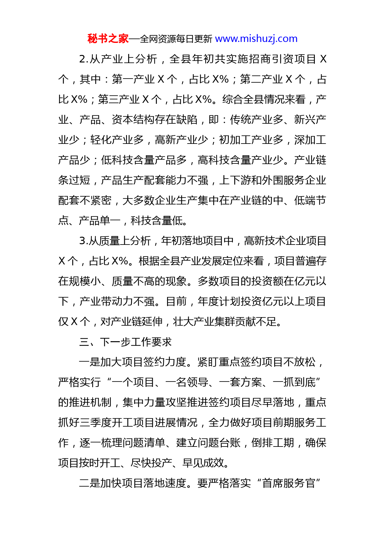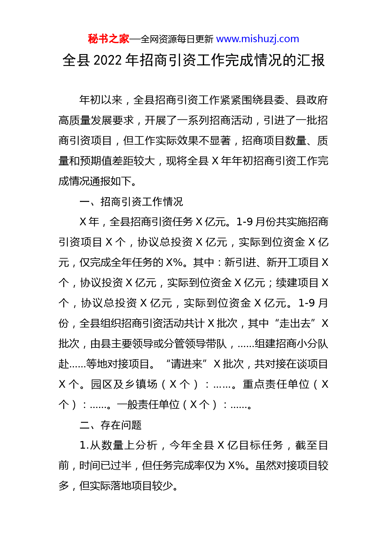秘书之家—全网资源每日更新www.mishuzj.com全县2022年招商引资工作完成情况的汇报年初以来,全县招商引资工作紧紧围绕县委、县政府高质量发展要求,开展了一系列招商活动,引进了一批招商引资项目,但工作实际效果不显著,招商项目数量、质量和预期值差距较大,现将全县X年年初招商引资工作完成情况通报如下。一、招商引资工作情况X年,全县招商引资任务X亿元。1-9月份共实施招商引资项目X个,协议总投资X亿元,实际到位资金X亿元,仅完成全年任务的X%。其中:新引进、新开工项目X个,协议投资X亿元,实际到位资金X亿元;续建项目X个,协议总投资X亿元,实际到位资金X亿元。1-9月份,全县组织招商引资活动共计X批次,其中“走出去”X批次,由县主要领导或分管领导带队,……组建招商小分队赴……等地对接项目。“请进来”X批次,共对接在谈项目X个。园区及乡镇场(X个):……。重点责任单位(X个):……。一般责任单位(X个):……。二、存在问题1.从数量上分析,今年全县X亿目标任务,截至目前,时间已过半,但任务完成率仅为X%。虽然对接项目较多,但实际落地项目较少。秘书之家—全网资源每日更新www.mishuzj.com2.从产业上分析,全县年初共实施招商引资项目X个,其中:第一产业X个,占比X%;第二产业X个,占比X%;第三产业X个,占比X%。综合全县情况来看,产业、产品、资本结构存在缺陷,即:传统产业多、新兴产业少;轻化产业多,高新产业少;初加工产业多,深加工产品少;低科技含量产品多,高科技含量产业少。产业链条过短,产品生产配套能力不强,上下游和外围服务企业配套不紧密,大多数企业生产集中在产业链的中、低端节点、产品单一,科技含量低。3.从质量上分析,年初落地项目中,高新技术企业项目X个,占比X%。根据全县产业发展定位来看,项目普遍存在规模小、质量不高的现象。多数项目的投资额在亿元以下,产业带动力不强。目前,年度计划投资亿元以上项目仅X个,对产业链延伸,壮大产业集群贡献不足。三、下一步工作要求一是加大项目签约力度。紧盯重点签约项目不放松,严格实行“一个项目、一名领导、一套方案、一抓到底”的推进机制,集中力量攻坚推进签约项目尽早落地,重点抓好三季度开工项目进展情况,全力做好项目前期服务工作,逐一梳理问题清单、建立问题台账,倒排工期,确保项目按时开工、尽快投产、早见成效。二是加快项目落地速度。要严格落实“首席服务官”秘书之家—全网资源每日更新www.mishuzj.com制度,强化项目跟踪问效,积极跟进在谈项目,实施“一对一”盯引。对有意向的项目要紧盯不放,实行全程跟踪服务,为企业提供“一站式”专业服务和精准指引。紧盯项目建设的难点痛点,提高签约项目落地成功率,确保招商项目顺利推进。力促三季度重点推进的X有限公司绝缘材料加工项目、X项目、X项目、X等项目尽快签约、落地、建设、达效。三是全方位打通招商引资对接渠道。各责任单位要千方百计加大“请进来”力度,更多获取项目投资信息,积极加强与企业的联系,让蹲点招商、专业团队、委托招商等多种招商形式发挥作用,多渠道招商,特别无项目单位,要增强责任意识,加大对接力度,主动对接联系,争取完成招商引资任务。四是加大精准招商力度。围绕全县主导产业,瞄准重点区域、重点产业,创新思路、精准发力、破解瓶颈,实现精准招商。下半年重点在长三角、珠三角、京津冀等地举办产业推介会,开展精准对接活动,加强区域合作,扩大项目储备规模,通过以商招商、产业链招商等方式方法,力争全年集中攻坚引进一批投资强度大、带动作用强的大项目、好项目。