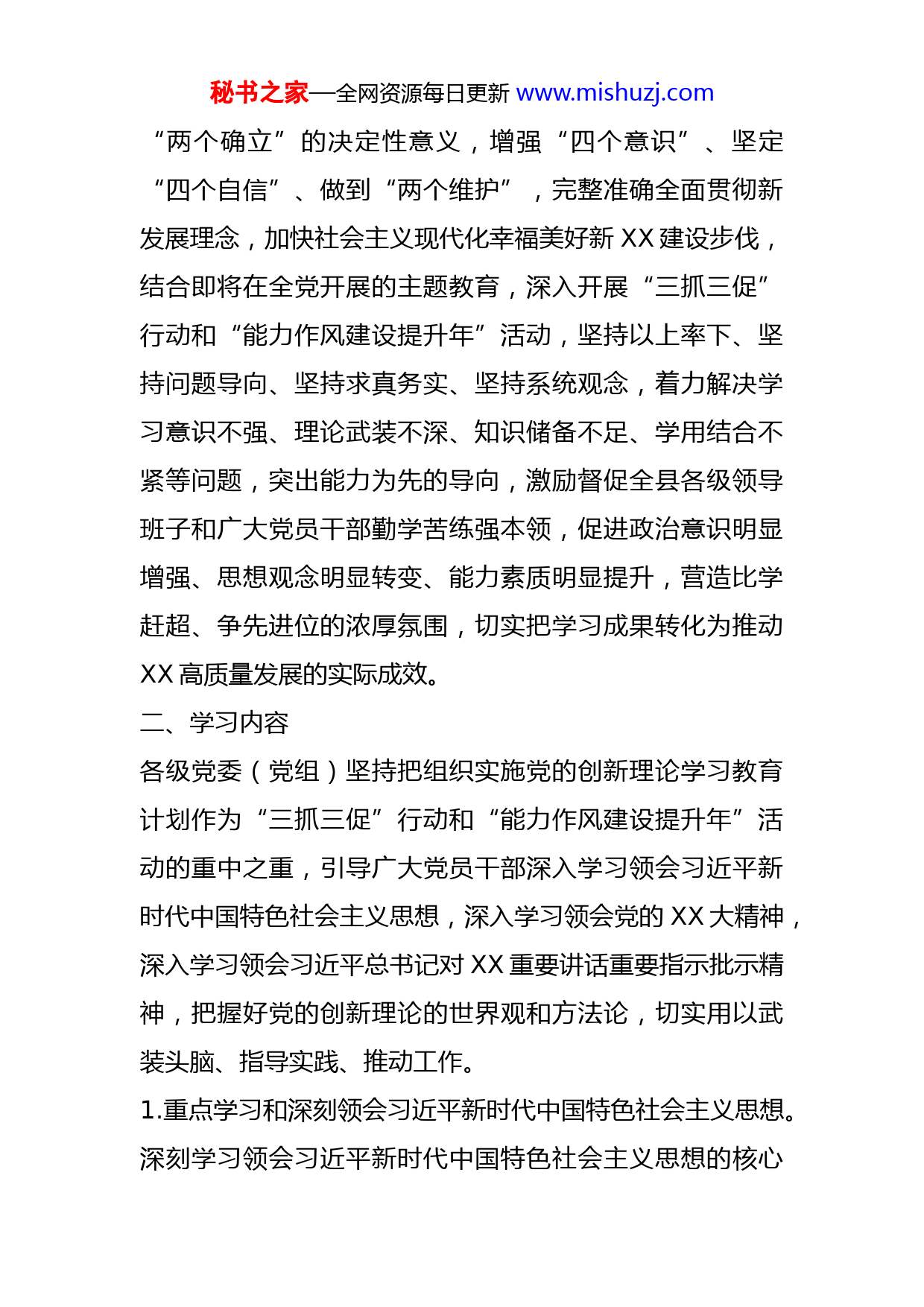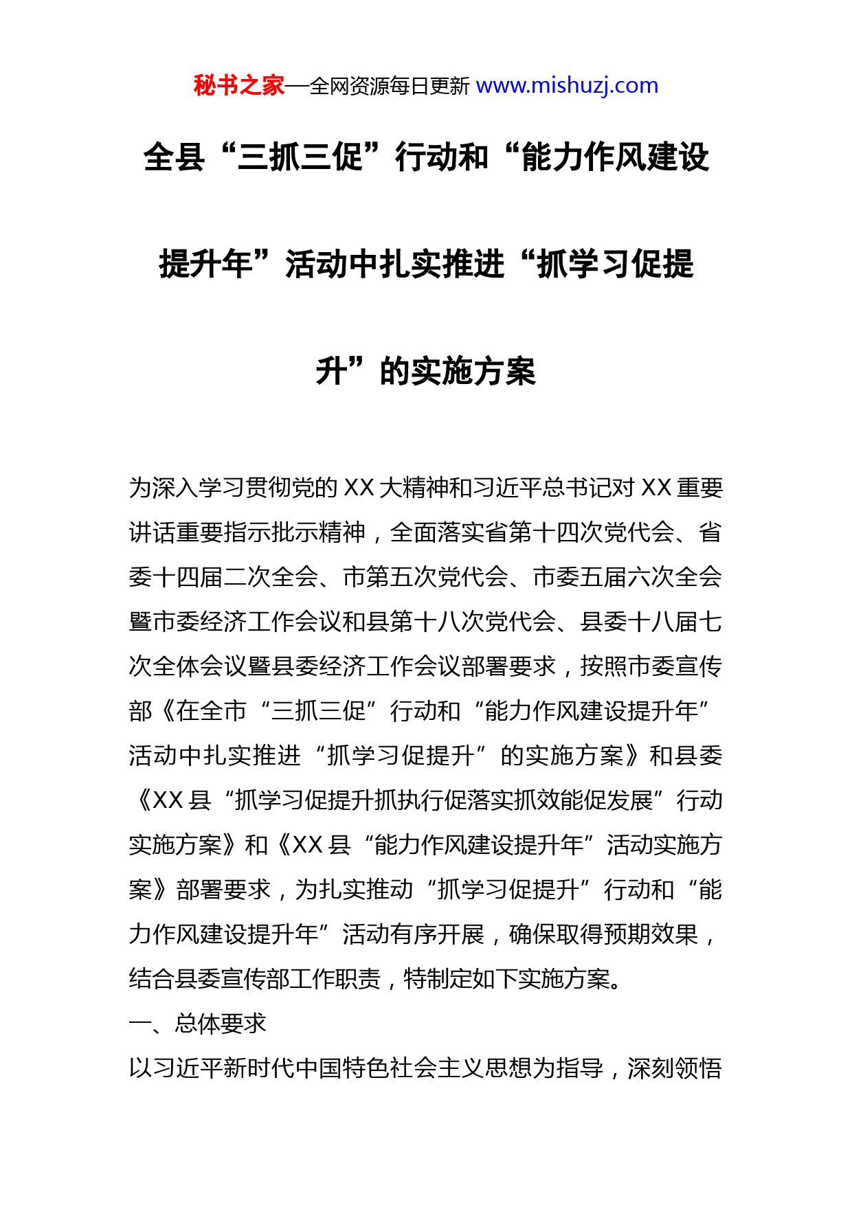 秘书之家—全网资源每日更新www.mishuzj.com全县“三抓三促”行动和“能力作风建设提升年”活动中扎实推进“抓学习促提升”的实施方案为深入学习贯彻党的XX大精神和习近平总书记对XX重要讲话重要指示批示精神,全面落实省第十四次党代会、省委十四届二次全会、市第五次党代会、市委五届六次全会暨市委经济工作会议和县第十八次党代会、县委十八届七次全体会议暨县委经济工作会议部署要求,按照市委宣传部《在全市“三抓三促”行动和“能力作风建设提升年”活动中扎实推进“抓学习促提升”的实施方案》和县委《XX县“抓学习促提升抓执行促落实抓效能促发展”行动实施方案》和《XX县“能力作风建设提升年”活动实施方案》部署要求,为扎实推动“抓学习促提升”行动和“能力作风建设提升年”活动有序开展,确保取得预期效果,结合县委宣传部工作职责,特制定如下实施方案。一、总体要求以习近平新时代中国特色社会主义思想为指导,深刻领悟秘书之家—全网资源每日更新www.mishuzj.com“两个确立”的决定性意义,增强“四个意识”、坚定“四个自信”、做到“两个维护”,完整准确全面贯彻新发展理念,加快社会主义现代化幸福美好新XX建设步伐,结合即将在全党开展的主题教育,深入开展“三抓三促”行动和“能力作风建设提升年”活动,坚持以上率下、坚持问题导向、坚持求真务实、坚持系统观念,着力解决学习意识不强、理论武装不深、知识储备不足、学用结合不紧等问题,突出能力为先的导向,激励督促全县各级领导班子和广大党员干部勤学苦练强本领,促进政治意识明显增强、思想观念明显转变、能力素质明显提升,营造比学赶超、争先进位的浓厚氛围,切实把学习成果转化为推动XX高质量发展的实际成效。二、学习内容各级党委(党组)坚持把组织实施党的创新理论学习教育计划作为“三抓三促”行动和“能力作风建设提升年”活动的重中之重,引导广大党员干部深入学习领会习近平新时代中国特色社会主义思想,深入学习领会党的XX大精神,深入学习领会习近平总书记对XX重要讲话重要指示批示精神,把握好党的创新理论的世界观和方法论,切实用以武装头脑、指导实践、推动工作。1.重点学习和深刻领会习近平新时代中国特色社会主义思想。深刻学习领会习近平新时代中国特色社会主义思想的核心秘书之家—全网资源每日更新www.mishuzj.com要义、精神实质、丰富内涵和实践要求,准确把握好习近平新时代中国特色社会主义思想的世界观和方法论,坚持好、运用好贯穿其中的立场观点方法,重点研读《习近平谈治国理政》第四卷、《习近平新时代中国特色社会主义思想学习纲要》等重要理论读物,进一步在学懂弄通做实上下功夫。2.重点学习和深刻领会党的XX大精神。原原本本、逐字逐句学习党的XX大报告,深入研读《党的XX大报告辅导读本》《党的XX大报告学习辅导百问》,深刻领会党的XX大精神的丰富内涵和核心要义,充分认识党的XX大的重大意义和重大成果,深刻领悟“两个确立”的决定性意义,切实把思想和行动统一到党中央决策部署上来。3.重点学习和深刻领会习近平总书记在学习贯彻党的XX大精神研讨班开班式上的重要讲话精神。深入学习领会习近平总书记关于中国式现代化的重要论述,准确把握中国式现代化的理论逻辑、历史逻辑、实践逻辑,切实用习近平总书记重要讲话精神统一思想、统一意志、统一行动。4.重点学习和深刻领会习近平总书记对XX重要讲话重要指示批示精神。深入学习习近平总书记对XX作出的“八个着力”重要指示精神和提出的“五个方面”工作要求,坚持把习近平总书记对XX重要讲话重要指示批示精神作为推动XX各项工作的“纲”和“魂”,不断完善思路举措,确保秘书之家—全网资源每日更新www.mishuzj.com习近平总书记重要指示要求在XX落地生根、开花结果。5.重点学习和深刻领会习近平总书记关于本领域本行业工作的重要论述。结合习近平新时代中国特色社会主义思想分领域学习纲要和学习问答,深入学习习近平总书记关于本领域本行业工作的重要论述和重要指示批示精神,学习习近平总书记重要讲话中与做好本职工作相关的重要论述,学习党中央、国务院出台的关于本领域本行业工作的政策法规,精准掌握与工作相关的政策规定,进一步提升履职尽责能力。6.重点学习和深刻领会党章党规和法律法规。深入学习新修改的《中国共产党章程》和《中国共产党第XX次全国代表大会关于<中国共产党章程(修正案)>的决议》,全面系统研读党内法规,提高推进新时代党的建设新的伟大工程的自觉性。认真学习《宪法》等国家法律,尤其是与群众利益密切相关的法律法规,切实提升依法决策、依法行政、依法管理治理能力。7.重点学习和深刻领会省、市、县委重大决策部署要求。深入学习省第十四次党代会、省委十四届二次全会、市第五次党代会、市委五届六次全会暨市委经济工作会议、县第十八次党代会、县委十八届七次全体会议暨县委经济工作会议部署要求以及全国和省、市、县“两会”精神,对照确定的目标任务着重对本系统本行业本领域的贯彻落实举秘书之家—全网资源每日更新www.mishuzj.com措进行研究谋划,切实将理论指导与工作实践紧密结合起来、将发展目标与具体行动紧