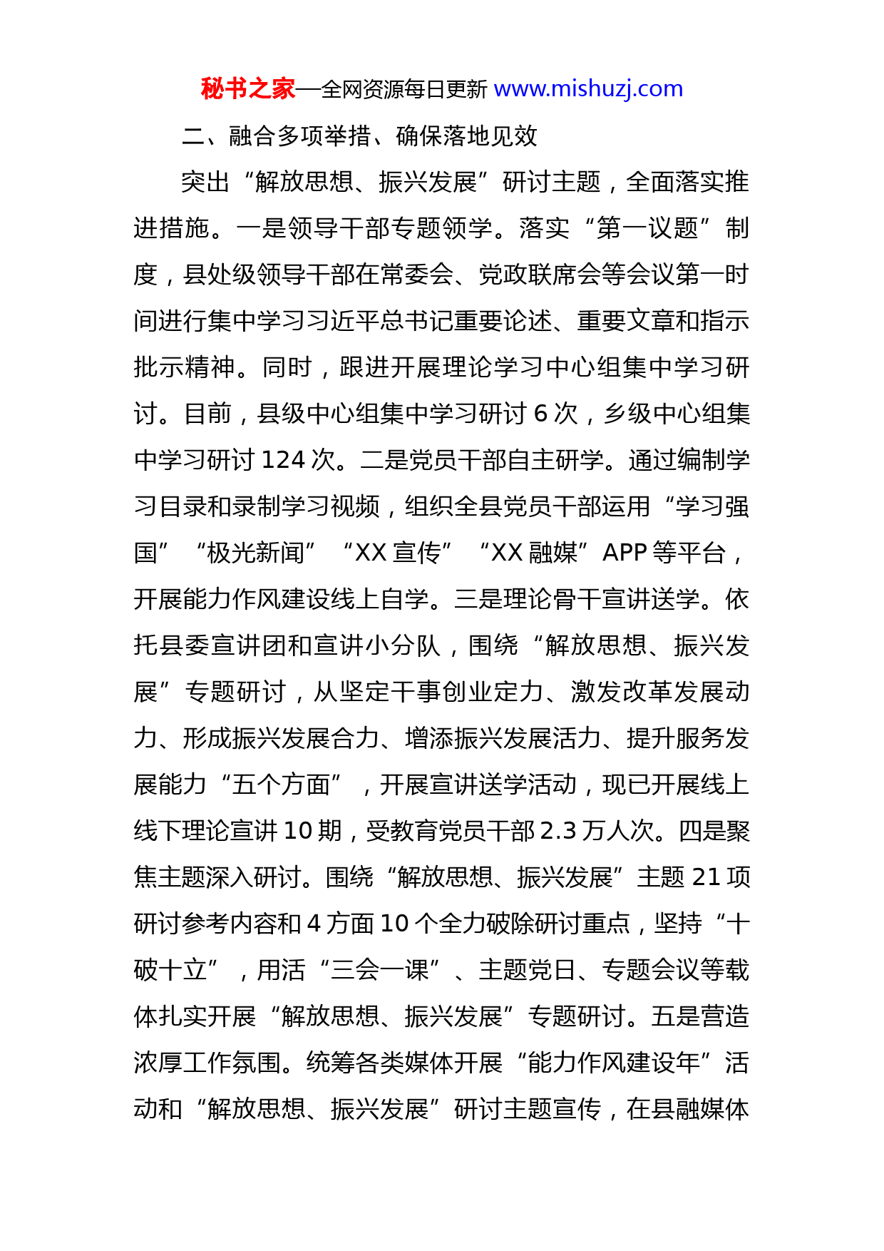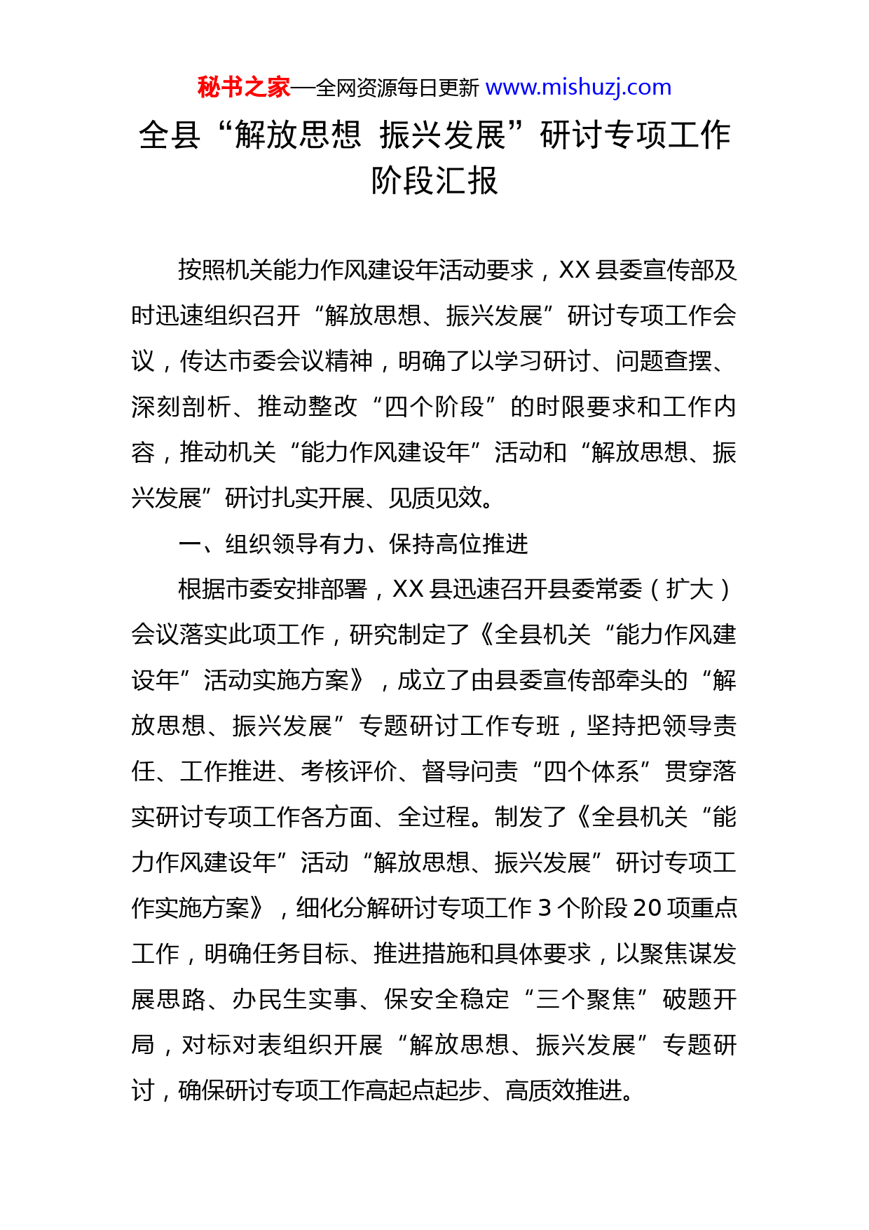 秘书之家—全网资源每日更新www.mishuzj.com全县“解放思想振兴发展”研讨专项工作阶段汇报按照机关能力作风建设年活动要求,XX县委宣传部及时迅速组织召开“解放思想、振兴发展”研讨专项工作会议,传达市委会议精神,明确了以学习研讨、问题查摆、深刻剖析、推动整改“四个阶段”的时限要求和工作内容,推动机关“能力作风建设年”活动和“解放思想、振兴发展”研讨扎实开展、见质见效。一、组织领导有力、保持高位推进根据市委安排部署,XX县迅速召开县委常委(扩大)会议落实此项工作,研究制定了《全县机关“能力作风建设年”活动实施方案》,成立了由县委宣传部牵头的“解放思想、振兴发展”专题研讨工作专班,坚持把领导责任、工作推进、考核评价、督导问责“四个体系”贯穿落实研讨专项工作各方面、全过程。制发了《全县机关“能力作风建设年”活动“解放思想、振兴发展”研讨专项工作实施方案》,细化分解研讨专项工作3个阶段20项重点工作,明确任务目标、推进措施和具体要求,以聚焦谋发展思路、办民生实事、保安全稳定“三个聚焦”破题开局,对标对表组织开展“解放思想、振兴发展”专题研讨,确保研讨专项工作高起点起步、高质效推进。秘书之家—全网资源每日更新www.mishuzj.com二、融合多项举措、确保落地见效突出“解放思想、振兴发展”研讨主题,全面落实推进措施。一是领导干部专题领学。落实“第一议题”制度,县处级领导干部在常委会、党政联席会等会议第一时间进行集中学习习近平总书记重要论述、重要文章和指示批示精神。同时,跟进开展理论学习中心组集中学习研讨。目前,县级中心组集中学习研讨6次,乡级中心组集中学习研讨124次。二是党员干部自主研学。通过编制学习目录和录制学习视频,组织全县党员干部运用“学习强国”“极光新闻”“XX宣传”“XX融媒”APP等平台,开展能力作风建设线上自学。三是理论骨干宣讲送学。依托县委宣讲团和宣讲小分队,围绕“解放思想、振兴发展”专题研讨,从坚定干事创业定力、激发改革发展动力、形成振兴发展合力、增添振兴发展活力、提升服务发展能力“五个方面”,开展宣讲送学活动,现已开展线上线下理论宣讲10期,受教育党员干部2.3万人次。四是聚焦主题深入研讨。围绕“解放思想、振兴发展”主题21项研讨参考内容和4方面10个全力破除研讨重点,坚持“十破十立”,用活“三会一课”、主题党日、专题会议等载体扎实开展“解放思想、振兴发展”专题研讨。五是营造浓厚工作氛围。统筹各类媒体开展“能力作风建设年”活动和“解放思想、振兴发展”研讨主题宣传,在县融媒体秘书之家—全网资源每日更新www.mishuzj.com中心、XX宣传、XX发布等新媒体平台开设“能力作风建设年”专版专栏。目前,转发中央和省市理论文章30期,发布工作信息50篇。三、深刻查摆检视,压实落靠主体责任。制定《XX县“解放思想促进高质量发展”集中研讨活动实施方案》,印发到全县61家党委(党组),形成集中研讨全覆盖。印发工作提示单91份,提示全县各级党组织要紧紧围绕产业项目建设、营商环境建设、民生保障、医疗卫生、司法执法等领域进行查摆剖析,解决群众困难。县处级领导干部,明确目标任务,发挥“关键少数”以身作则、以上率下作用,形成一级带一级、层层抓落实的浓厚氛围,破除资源依赖思想,深刻剖析根源。全县党员干部围绕“思想观念怎么变、短板弱项怎么补、振兴发展怎么干”,深刻反思剖析自身在思想、能力、作风和工作上的差距和不足,并通过集中研讨剖析会、理论学习中心组、党员干部大会,党小组会等方式,明确下步努力方向。各乡镇领导干部带头认真剖析查摆问题,按照能力作风建设和集中研讨目标导向,通过领导干部“走流程”、交流座谈、发放问卷等形式,广泛征求意见建议。立足主责主业,认真查摆剖析,截至目前,针对《XX县“解放思想促进高质量发展”集中研讨活动实施方案》,县委理论学习中心组撰写研讨心得60篇;乡(镇)级中心组撰写心秘书之家—全网资源每日更新www.mishuzj.com得2450篇,全县党员干部撰写心得3000余篇;查摆各党委(党组)、县直各部门班子成员个人问题总数量824个,班子问题总数量591个,制定整改措施614个并已形成清单台账。四、深化整改落实,及时跟进立整立改各党委(党组)明确查摆出的突出问题,纳入各党委(党组)机关“能力作风建设年”活动问题整改清单,形成整改落实解决方案,坚持立整立改。需要长期解决的,在X月底前制定具体解决方案,明晰具体步骤,确定阶段性整改攻坚任务,按时间节点逐项解决突破,切实把集中研讨活动成果成效转化为实际工作质效。五、工作问题一是在学习上个别党委(党组)还存在着等靠要思想,没有结合本地本部门工作实际去主动搜集学习资料。二是个别党委(党组)在查摆问题上不够深入,在围绕工作、能力、作风、思想四个方面查摆问题不够深入,“画像”精准度不足,剖析深度还需加强。三是个别乡镇在宣讲上还需下功夫,各乡镇宣讲小分队,深入田间地头宣讲力度不够,没有形成“点对点”“户对户”的宣讲模式,在专研宣讲内容方面有待提升,没有结合本地实际情况进行丰富。六、下一步工作安排秘书之家—全网资源每日更新www.mishuzj.com下一步,XX县将立足县域