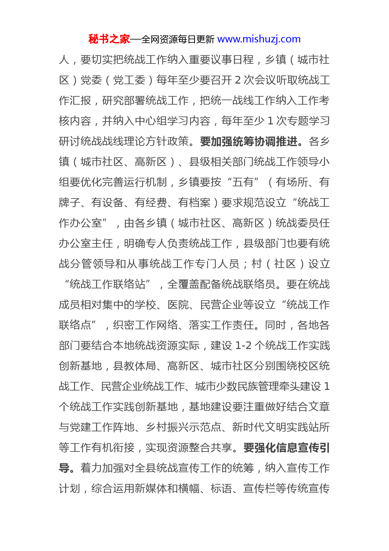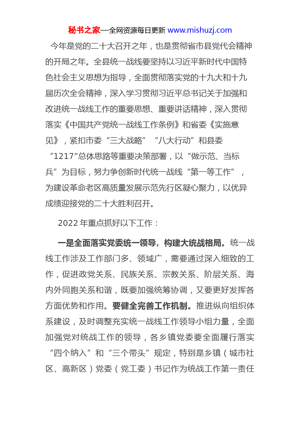 秘书之家—全网资源每日更新www.mishuzj.com今年是党的二十大召开之年,也是贯彻省市县党代会精神的开局之年。全县统一战线要坚持以习近平新时代中国特色社会主义思想为指导,全面贯彻落实党的十九大和十九届历次全会精神,深入学习贯彻习近平总书记关于加强和改进统一战线工作的重要思想、重要讲话精神,深入贯彻落实《中国共产党统一战线工作条例》和省委《实施意见》,紧扣市委“三大战略”“八大行动”和县委“1217”总体思路等重要决策部署,以“做示范、当标兵”为目标,努力争创新时代统一战线“第一等工作”,为建设革命老区高质量发展示范先行区凝心聚力,以优异成绩迎接党的二十大胜利召开。2022年重点抓好以下工作:一是全面落实党委统一领导,构建大统战格局。统一战线工作涉及工作部门多、领域广,需要通过深入细致的工作,促进政党关系、民族关系、宗教关系、阶层关系、海内外同胞关系和谐,既要加强统筹协调,又要更好发挥各方面优势和作用。要健全完善工作机制。推进纵向组织体系建设,及时调整充实统一战线工作领导小组力量,全面加强党对统战工作的领导,各乡镇党委要全面履行落实“四个纳入”和“三个带头”规定,特别是乡镇(城市社区、高新区)党委(党工委)书记作为统战工作第一责任秘书之家—全网资源每日更新www.mishuzj.com人,要切实把统战工作纳入重要议事日程,乡镇(城市社区)党委(党工委)每年至少要召开2次会议听取统战工作汇报,研究部署统战工作,把统一战线工作纳入工作考核内容,并纳入中心组学习内容,每年至少1次专题学习研讨统战战线理论方针政策。要加强统筹协调推进。各乡镇(城市社区、高新区)、县级相关部门统战工作领导小组要优化完善运行机制,乡镇要按“五有”(有场所、有牌子、有设备、有经费、有档案)要求规范设立“统战工作办公室”,由各乡镇(城市社区、高新区)统战委员任办公室主任,明确专人负责统战工作,县级部门也要有统战分管领导和从事统战工作专门人员;村(社区)设立“统战工作联络站”,全覆盖配备统战联络员。要在统战成员相对集中的学校、医院、民营企业等设立“统战工作联络点”,织密工作网络、落实工作责任。同时,各地各部门要结合本地统战资源实际,建设1-2个统战工作实践创新基地,县教体局、高新区、城市社区分别围绕校区统战工作、民营企业统战工作、城市少数民族管理牵头建设1个统战工作实践创新基地,基地建设要注重做好结合文章与党建工作阵地、乡村振兴示范点、新时代文明实践站所等工作有机衔接,实现资源整合共享。要强化信息宣传引导。着力加强对全县统战宣传工作的统筹,纳入宣传工作计划,综合运用新媒体和横幅、标语、宣传栏等传统宣传秘书之家—全网资源每日更新www.mishuzj.com媒介加大宣传力度,强化统战意识。乡镇(城市社区)党委(党工委)书记要带头学习宣传和贯彻落实统一战线理论、方针、政策和法律法规,每年要在辖区内上一堂统战专题党课;带头参加统一战线重要活动;带头广交深交党外朋友,结交一批有影响、有代表性的党外人士,努力营造“大统战”的浓厚氛围。二是紧紧围绕中心抓统战,助推改革发展大局。围绕中心、服务大局,是统一战线必须遵循的重要原则,也是统一战线取得成绩、体现作为的根本所在。要围绕大局发展建言献策。积极引导党外代表人士、民营经济人士、新的社会阶层人士等统战对象重点围绕工业昂起、科创挺起、乡村兴起、城市崛起、三产旺起、环境优起、民生厚起等七项重点工作开展专题调研,通过调研汇报会、党外代表人士座谈会、情况通报会等形式,为我县经济社会发展中的重大问题建肺腑之言,议发展之论,献务实之策。要围绕招大引强推动以商招商。充分发挥广东省XX商会、XX北京商会等异地商会作用,特别是发扬广东省XX商会返乡就业创业联合商会和乡贤在招商引资中的独特优势,积极“南融北接”,开展以商招商、商会合作交流等活动,大力推介XX,组织客商到我县考察,促成大项目好项目落地为我县决战工业一千亿贡献统战力量、彰显统战作为。要秘书之家—全网资源每日更新www.mishuzj.com围绕乡村振兴全面挖掘乡土人才。配强乡(镇)统战干事和村(居、社区)统战信息员,延伸基层统战工作触角,充分发掘镇村两级有想法想干事的能人,建立党外乡土人才数据库,通过组织乡土人才开展“乡村夜话”“乡村议事堂”等活动,动员乡土人才参与乡村振兴和乡村治理,用乡土人才“软治理”来解决农村“硬难题”,焕发农村社会治理的新生机和新活力,为乡村振兴发展注入强劲动力。要围绕民生事业改善开展志愿服务。鼓励支持统战对象履行社会责任,深入开展服务民生、科技惠民、医疗下乡、法律援助等志愿服务工作,扎实推进“万企兴万村”行动,为经济社会发展献计出力。三是着眼民营经济高质量发展,促进非公经济“两个健康”。XX县域经济能够实现高质量发展,民营经济功不可没。改革开放40多年来,民营企业蓬勃发展,民营经济从小到大、从弱到强,在稳定增长、促进创新、增加就业、改善民生等方面发挥了重要作用。要健全完善政企沟通协商制度。建立健全县领导与非公有制经济代表人士联系交流沟通机制,畅通反映问题渠道,增进政企互信,加强政企、银企对接工作,