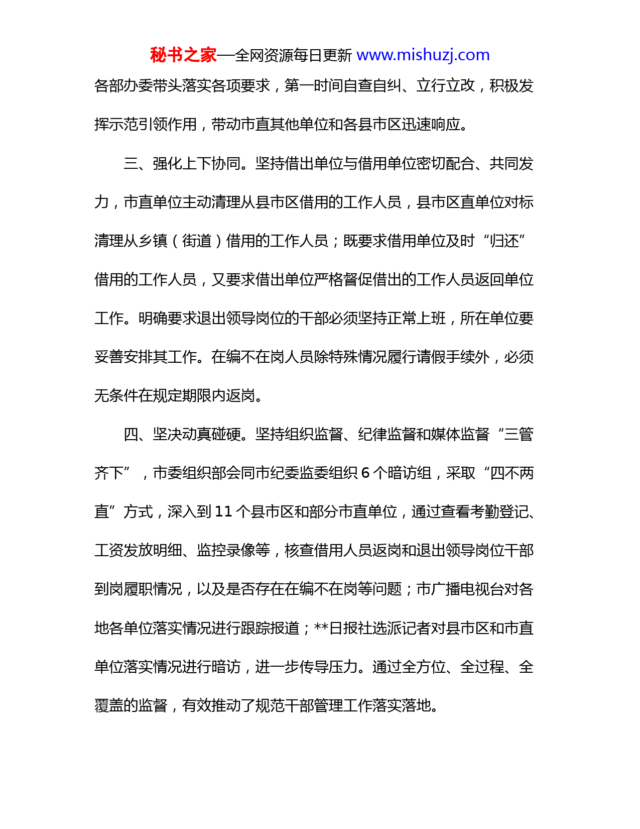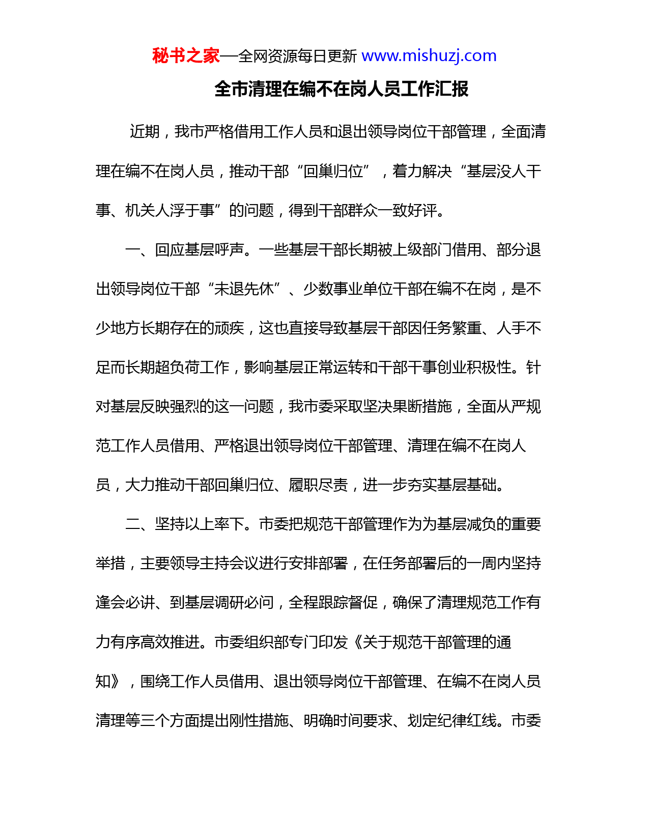 秘书之家—全网资源每日更新www.mishuzj.com全市清理在编不在岗人员工作汇报近期,我市严格借用工作人员和退出领导岗位干部管理,全面清理在编不在岗人员,推动干部“回巢归位”,着力解决“基层没人干事、机关人浮于事”的问题,得到干部群众一致好评。一、回应基层呼声。一些基层干部长期被上级部门借用、部分退出领导岗位干部“未退先休”、少数事业单位干部在编不在岗,是不少地方长期存在的顽疾,这也直接导致基层干部因任务繁重、人手不足而长期超负荷工作,影响基层正常运转和干部干事创业积极性。针对基层反映强烈的这一问题,我市委采取坚决果断措施,全面从严规范工作人员借用、严格退出领导岗位干部管理、清理在编不在岗人员,大力推动干部回巢归位、履职尽责,进一步夯实基层基础。二、坚持以上率下。市委把规范干部管理作为为基层减负的重要举措,主要领导主持会议进行安排部署,在任务部署后的一周内坚持逢会必讲、到基层调研必问,全程跟踪督促,确保了清理规范工作有力有序高效推进。市委组织部专门印发《关于规范干部管理的通知》,围绕工作人员借用、退出领导岗位干部管理、在编不在岗人员清理等三个方面提出刚性措施、明确时间要求、划定纪律红线。市委秘书之家—全网资源每日更新www.mishuzj.com各部办委带头落实各项要求,第一时间自查自纠、立行立改,积极发挥示范引领作用,带动市直其他单位和各县市区迅速响应。三、强化上下协同。坚持借出单位与借用单位密切配合、共同发力,市直单位主动清理从县市区借用的工作人员,县市区直单位对标清理从乡镇(街道)借用的工作人员;既要求借用单位及时“归还”借用的工作人员,又要求借出单位严格督促借出的工作人员返回单位工作。明确要求退出领导岗位的干部必须坚持正常上班,所在单位要妥善安排其工作。在编不在岗人员除特殊情况履行请假手续外,必须无条件在规定期限内返岗。四、坚决动真碰硬。坚持组织监督、纪律监督和媒体监督“三管齐下”,市委组织部会同市纪委监委组织6个暗访组,采取“四不两直”方式,深入到11个县市区和部分市直单位,通过查看考勤登记、工资发放明细、监控录像等,核查借用人员返岗和退出领导岗位干部到岗履职情况,以及是否存在在编不在岗等问题;市广播电视台对各地各单位落实情况进行跟踪报道;日报社选派记者对县市区和市直单位落实情况进行暗访,进一步传导压力。通过全方位、全过程、全覆盖的监督,有效推动了规范干部管理工作落实落地。秘书之家—全网资源每日更新www.mishuzj.com五、注重常态长效。明确规定市直单位不准从县市区借用工作人员,县市区直单位不准从乡镇(街道)借用工作人员,县市区不准跨行政区域借用工作人员,党委政府中心工作或重大项目指挥部确需借用工作人员的,原则上从本级有关单位借用,借用工作由组织部门统一管理;各单位党委(党组)对规范干部管理工作负主体责任,党委(党组)书记是第一责任人,一旦发现违反规定的情形,首先追究领导班子和党委(党组)书记的责任。通过健全机制、压实责任,确保常抓长严、常态长效。