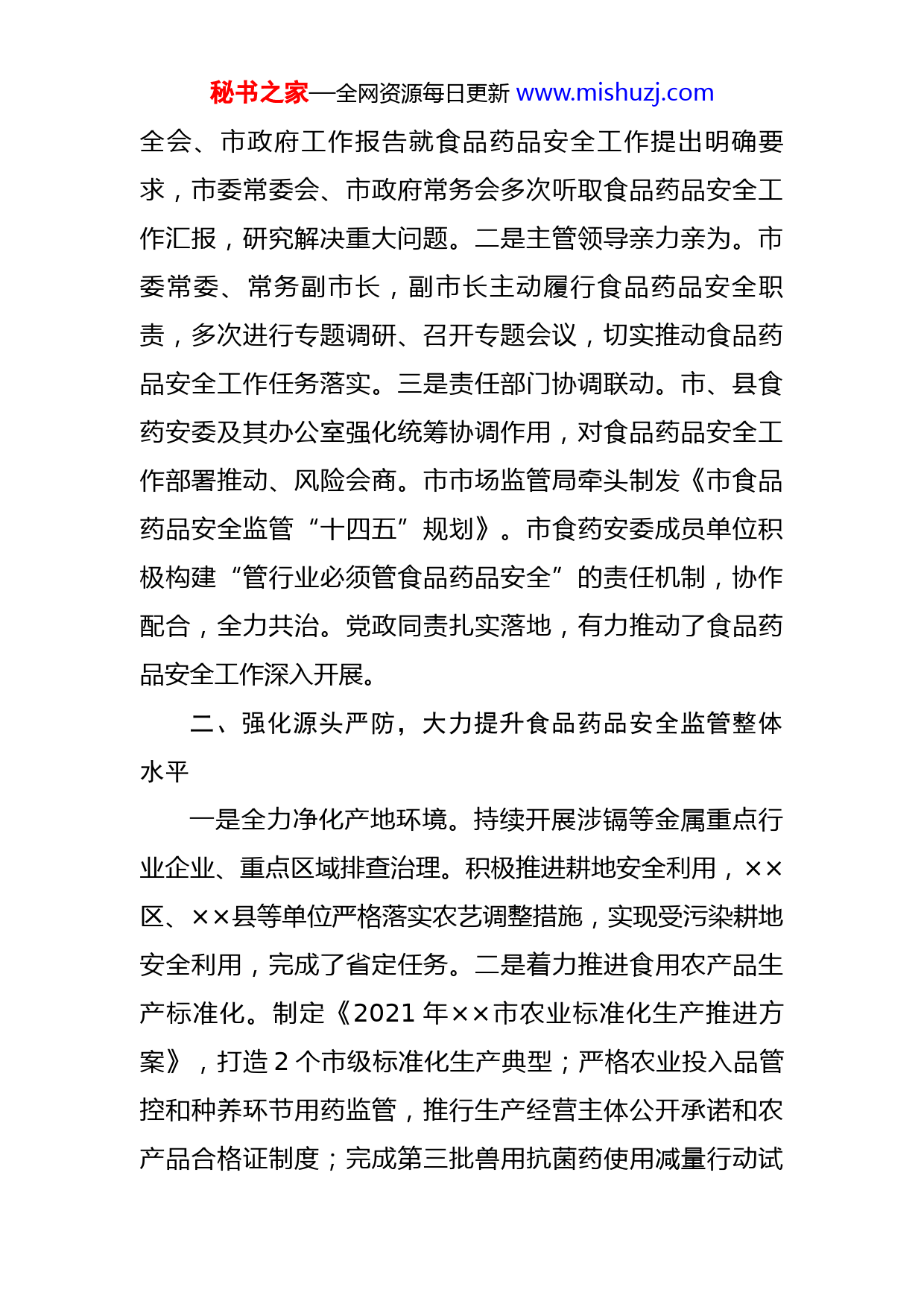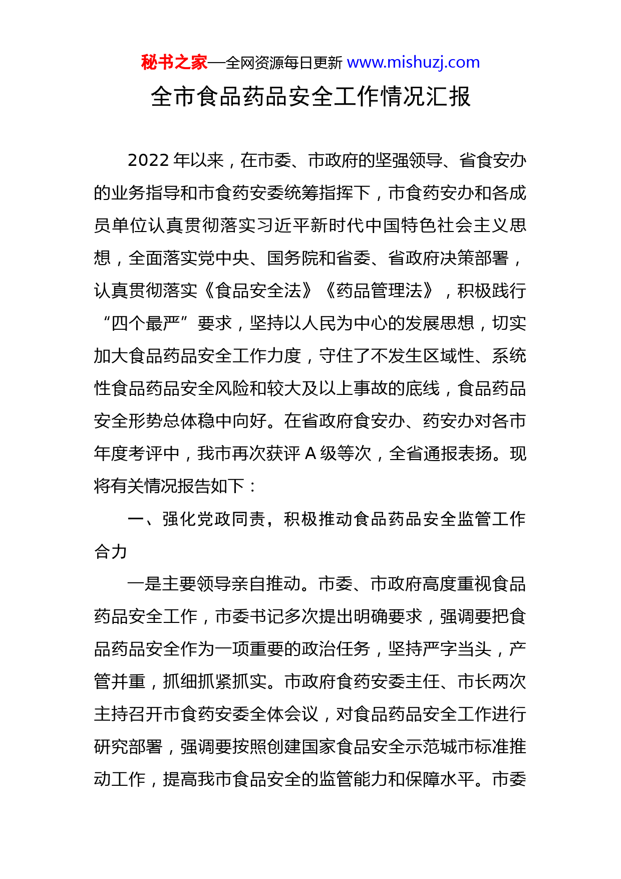 秘书之家—全网资源每日更新www.mishuzj.com全市食品药品安全工作情况汇报2022年以来,在市委、市政府的坚强领导、省食安办的业务指导和市食药安委统筹指挥下,市食药安办和各成员单位认真贯彻落实习近平新时代中国特色社会主义思想,全面落实党中央、国务院和省委、省政府决策部署,认真贯彻落实《食品安全法》《药品管理法》,积极践行“四个最严”要求,坚持以人民为中心的发展思想,切实加大食品药品安全工作力度,守住了不发生区域性、系统性食品药品安全风险和较大及以上事故的底线,食品药品安全形势总体稳中向好。在省政府食安办、药安办对各市年度考评中,我市再次获评A级等次,全省通报表扬。现将有关情况报告如下:一、强化党政同责,积极推动食品药品安全监管工作合力一是主要领导亲自推动。市委、市政府高度重视食品药品安全工作,市委书记多次提出明确要求,强调要把食品药品安全作为一项重要的政治任务,坚持严字当头,产管并重,抓细抓紧抓实。市政府食药安委主任、市长两次主持召开市食药安委全体会议,对食品药品安全工作进行研究部署,强调要按照创建国家食品安全示范城市标准推动工作,提高我市食品安全的监管能力和保障水平。市委秘书之家—全网资源每日更新www.mishuzj.com全会、市政府工作报告就食品药品安全工作提出明确要求,市委常委会、市政府常务会多次听取食品药品安全工作汇报,研究解决重大问题。二是主管领导亲力亲为。市委常委、常务副市长,副市长主动履行食品药品安全职责,多次进行专题调研、召开专题会议,切实推动食品药品安全工作任务落实。三是责任部门协调联动。市、县食药安委及其办公室强化统筹协调作用,对食品药品安全工作部署推动、风险会商。市市场监管局牵头制发《市食品药品安全监管“十四五”规划》。市食药安委成员单位积极构建“管行业必须管食品药品安全”的责任机制,协作配合,全力共治。党政同责扎实落地,有力推动了食品药品安全工作深入开展。二、强化源头严防,大力提升食品药品安全监管整体水平一是全力净化产地环境。持续开展涉镉等金属重点行业企业、重点区域排查治理。积极推进耕地安全利用,××区、××县等单位严格落实农艺调整措施,实现受污染耕地安全利用,完成了省定任务。二是着力推进食用农产品生产标准化。制定《2021年××市农业标准化生产推进方案》,打造2个市级标准化生产典型;严格农业投入品管控和种养环节用药监管,推行生产经营主体公开承诺和农产品合格证制度;完成第三批兽用抗菌药使用减量行动试秘书之家—全网资源每日更新www.mishuzj.com点评价,打造部级、省级试点单位各1家。加强农作物病虫害绿色防控评价统计,全市主要农作物病虫害绿色防控覆盖率达到67%,专业化统防统治覆盖率达到40%,农业标准化生产覆盖率达到74%;新申报绿色食品、有机食品认证企业20家、地理标志农产品2个。三是聚力食用农产品产地准出市场准入。农业农村、市场监管部门健全完善食用农产品产地准出与市场准入衔接机制,开展联合检查、联合培训。实施农产品质量安全追溯“六挂钩”机制,全市录入追溯平台农产品生产经营主体10013个、电子追溯主体970个,开(出)具纸质合格证2.8万张、电子合格证2.19万张。打造2个具有食用农产品追溯系统的批发市场样板,录入信息34万条,位居全省前列。四是强力推动粮食质量监管。坚持有仓必到、有粮必查、查必彻底,对库存粮食检查覆盖率100%。抽验市级储备粮30041吨,省级储备粮46996,未发现粮食质量问题。三、强化监管基础,聚焦提升食品药品安全治理能力一是深化许可审批改革。依托一体化在线政务服务平台,简化运行流程,实现了全环节、全流程网办,方便办事群众。二是推进食品医药产业转型升级。结合我市医药产业发展状况,起草了《关于加强药品安全工作促进医药产业创新发展的实施意见》,推动医药产业健康发展。30个项目列入省技改项目库,31家企业获得绿色工厂星级评秘书之家—全网资源每日更新www.mishuzj.com定。三是加强技术支撑。推广应用食品追溯系统,督促婴幼儿配方食品、肉制品、乳制品等15类重点行业1.1万家食品生产经营单位建立追溯体系。药品流通追溯系统单体药店入网率实现100%,非现场监管能力得到强化。四是夯实企业主体责任。组织食品药品生产、经营、餐饮单位食品安全管理人员进行培训考核。全市190家食品生产企业完成HACCP等先进质量体系认证。肉制品、白酒、食用植物油等高风险行业企业严格落实食品安全自查制度,风险报告率达到100%。五是强化学校食品安全监管。校园春秋季开学检查覆盖率100%,校长负责制和校长陪餐制落实率、大宗食品集中定点采购率、学校食堂“明厨亮灶”率达到100%,主城区“互联网+明厨亮灶”实现全覆盖。六是持续开展质量提升。组织开展了肉制品、乳制品、校园食品、中药材中药饮片等质量提升和“放心肉菜示范超市”创建活动。××区淀粉制品生产集中区和16家农贸市场实现整治提升。完成了对2家乳制品生产企业的监督检查,企业问题整改率、自查报告率、抽检合格率均达到100%。四、围绕群众关切,全力构建食品药品安全风险管控体系一是加大食品药品抽检力度。开展了“你点我检”“你送我检”、应急抽检、