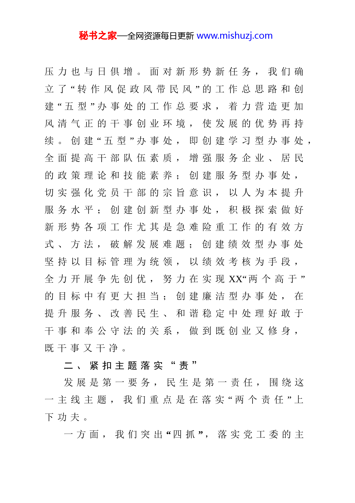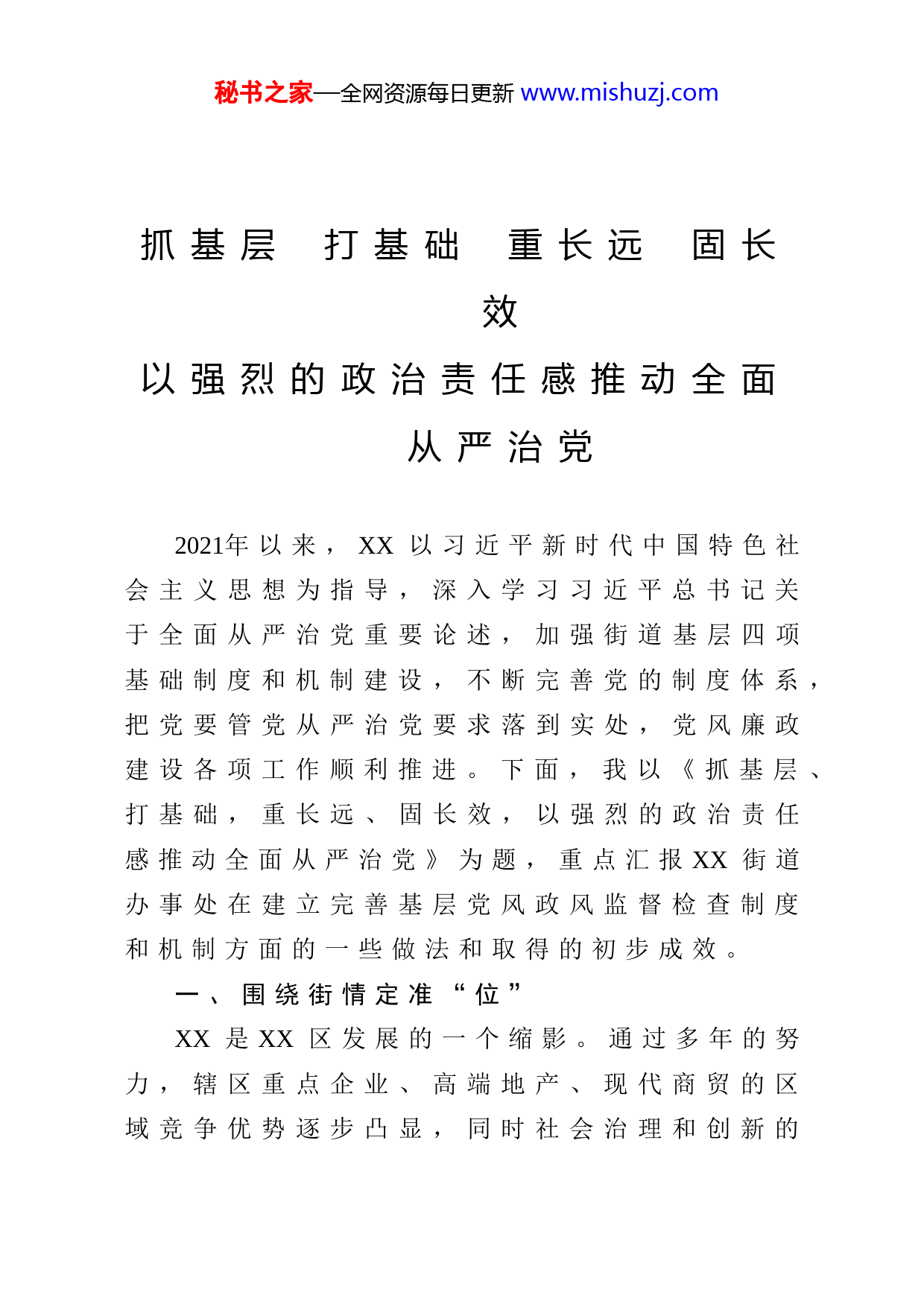 秘书之家—全网资源每日更新www.mishuzj.com抓基层打基础重长远固长效以强烈的政治责任感推动全面从严治党2021年以来,XX以习近平新时代中国特色社会主义思想为指导,深入学习习近平总书记关于全面从严治党重要论述,加强街道基层四项基础制度和机制建设,不断完善党的制度体系,把党要管党从严治党要求落到实处,党风廉政建设各项工作顺利推进。下面,我以《抓基层、打基础,重长远、固长效,以强烈的政治责任感推动全面从严治党》为题,重点汇报XX街道办事处在建立完善基层党风政风监督检查制度和机制方面的一些做法和取得的初步成效。一、围绕街情定准“位”XX是XX区发展的一个缩影。通过多年的努力,辖区重点企业、高端地产、现代商贸的区域竞争优势逐步凸显,同时社会治理和创新的秘书之家—全网资源每日更新www.mishuzj.com压力也与日俱增。面对新形势新任务,我们确“”立了转作风促政风带民风的工作总思路和创“”建五型办事处的工作总要求,着力营造更加风清气正的干事创业环境,使发展的优势再持“”续。创建五型办事处,即创建学习型办事处,全面提高干部队伍素质,增强服务企业、居民的政策理论和技能素养;创建服务型办事处,切实强化党员干部的宗旨意识,以人为本提升服务水平;创建创新型办事处,积极探索做好新形势各项工作尤其是急难险重工作的有效方式、方法,破解发展难题;创建绩效型办事处坚持以目标管理为统领,以绩效考核为手段,全力开展争先创优,努力在实现XX“”两个高于的目标中有更大担当;创建廉洁型办事处,在提升服务、改善民生、和谐稳定中处理好敢于干事和奉公守法的关系,做到既创业又修身,既干事又干净。二、紧扣主题落实“责”发展是第一要务,民生是第一责任,围绕这“”一主线主题,我们重点是在落实两个责任上下功夫。一方面,我们“”突出四抓,落实党工委的主秘书之家—全网资源每日更新www.mishuzj.com体责任。抓谋划。坚持把党风廉政建设与经济发展、城市管理、社会民生等工作同安排、同部署、同落实。抓班子。办事处党工委书记作为办事处党风廉政建设第一责任人,做到重大问题亲自过问,重要工作亲自部署,重点环节亲自协调,重要案件亲自督办,同时加强对班子成员和下一级党组织负责人的监管,通过谈心谈话、提醒告诫等形式,督促班子成员履行“”好一岗双责。抓制度。认真落实党风廉政建设有关要求和《XX区基层党风政风监督检查和责任追究办法》《办事处纪工委党风廉政建设月巡查制度》,把权力装进各级各项制度的笼子里。同时立足办事处的实际,量体裁衣制订“”出台了《办事处领导班子成员五包一考核制“度》《在服务企业和重点项目中实行五必须五”不准营造廉洁高效政务环境制度》等,为制度的笼子再加密,确保权力不泄漏。抓教育。通过廉政党课、廉政夜校、案件通报等有效形式加强对党员干部的党性党风党纪教育和廉洁从政教育,以铁的事实和血的教训,使全体党员干部做到防微杜渐、警钟长鸣。另一方面,我们“”坚持三放,落实办事处纪秘书之家—全网资源每日更新www.mishuzj.com工委的监督责任。放心不放任。把纪检工作的各项规定放在各项制度和工作之前,对纪检干部及其工作做到高看一眼、畏惧三分。目前办“事处纪工委除书记外,人员配备实行两专三”兼,党工委定期听取纪工委工作汇报,竭尽所能为纪工委提供一切必要的条件,使纪工委更好的聚焦主业开展工作。放手不干涉。对纪工委职权内的事情不打听情况、不乱打招呼、不讲人情。去年以来,办事处纪工委依法依规处理干部X人次,责令辞退聘用人员X人。放权不推责。对纪工委日常工作和巡查中发现的案件,在支持纪工委认真查办严格问责的基础上党工委重点是从案件中汲取教训,举一反三,完善制度,力求根治。如根据办事处纪工委督查部分社区干部中存在的纪律松懈、效能低下的问题,办事处党工委出台了《关于加强社区干部绩效考评工作管理办法》,有效扭转了部分社区干部中存在的不良作风,激发了社区干部的工作积极性。三、创新形式强化“督”1.以公开促监督。加强党务政务公开,在办“事处和各社区显眼位置设置党务政务(居务)秘书之家—全网资源每日更新www.mishuzj.com”公开栏,对公开的基本要求、内容、形式等进行规范,明确程序和时限。去年以来,我们重点在兴隆寨社区(村改居社区)换届和率先进“”行的集体资产改制工作中,加大对三资管理中资产、资金、资源使用和处置情况的公开力度,取得了良好的社会效果,也及时回应了居民和社会关切。2.以明责严监督。党工委定期向区纪委报告党风廉政建设责任制落实情况;班子X名成员“”按照党工委五包一考核工作制度,分包X个社区,担任所分包社区党风廉政建设第一责任人,签订了廉政建设目标责任书,履行对分管科室和分包社区、项目的监督责任和连带责任各社区居务监督委员会监督党风政风共计X次,发现问题X起,提出建议X条,目前已全部整改到位,减少经济损失和浪费共计X余万元。3.以制度保监督。党工委书记履行主体责任任务清单制度。党工委书记带头履行部署党风廉政建设工作、遵守党内政治生活制度、开展反腐倡廉教育、按照规定选拔任用中层干部等清单事项,实行项目化管理,加强对贯彻执行情况的动态