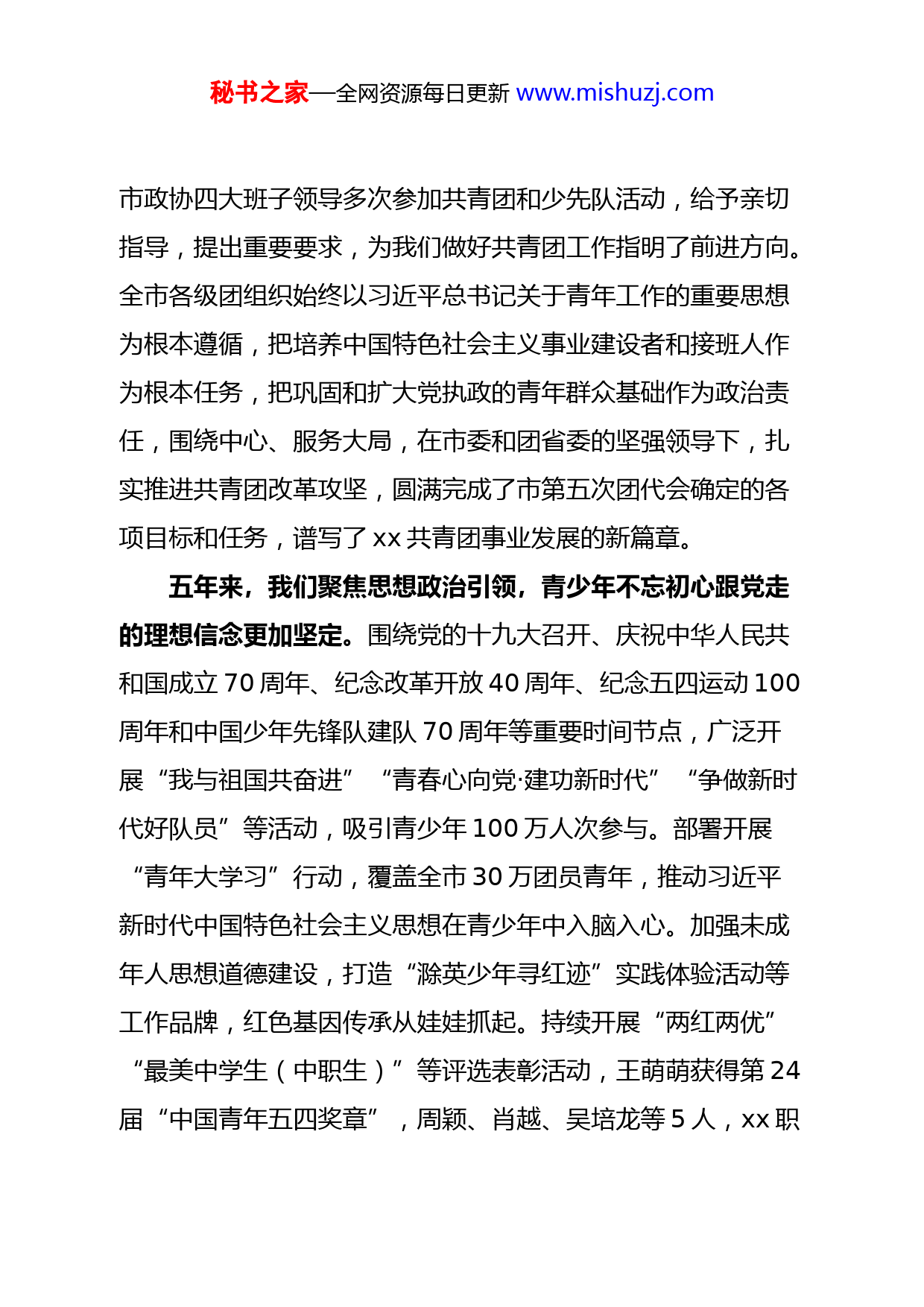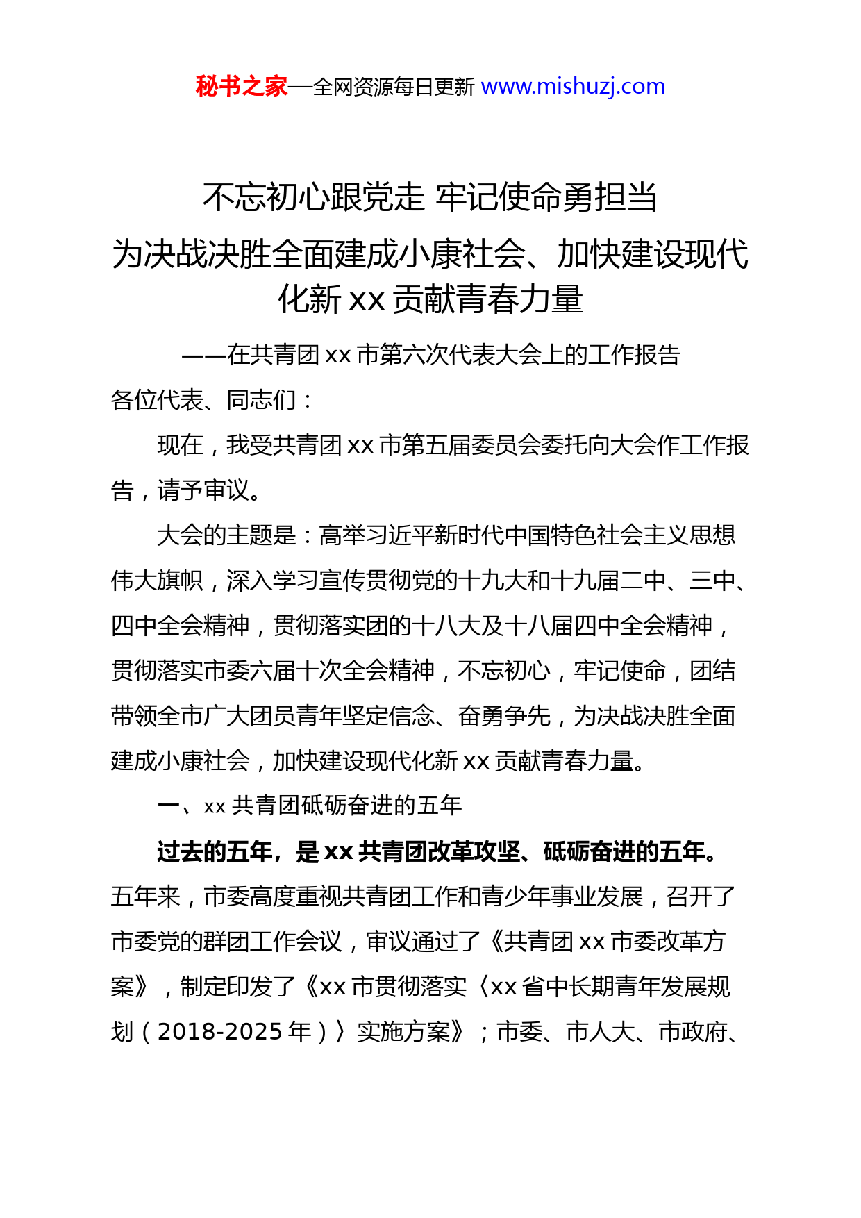 秘书之家—全网资源每日更新www.mishuzj.com不忘初心跟党走牢记使命勇担当为决战决胜全面建成小康社会、加快建设现代化新xx贡献青春力量——在共青团xx市第六次代表大会上的工作报告各位代表、同志们:现在,我受共青团xx市第五届委员会委托向大会作工作报告,请予审议。大会的主题是:高举习近平新时代中国特色社会主义思想伟大旗帜,深入学习宣传贯彻党的十九大和十九届二中、三中、四中全会精神,贯彻落实团的十八大及十八届四中全会精神,贯彻落实市委六届十次全会精神,不忘初心,牢记使命,团结带领全市广大团员青年坚定信念、奋勇争先,为决战决胜全面建成小康社会,加快建设现代化新xx贡献青春力量。一、xx共青团砥砺奋进的五年过去的五年,是xx共青团改革攻坚、砥砺奋进的五年。五年来,市委高度重视共青团工作和青少年事业发展,召开了市委党的群团工作会议,审议通过了《共青团xx市委改革方案》,制定印发了《xx市贯彻落实〈xx省中长期青年发展规划(2018-2025年)〉实施方案》;市委、市人大、市政府、秘书之家—全网资源每日更新www.mishuzj.com市政协四大班子领导多次参加共青团和少先队活动,给予亲切指导,提出重要要求,为我们做好共青团工作指明了前进方向。全市各级团组织始终以习近平总书记关于青年工作的重要思想为根本遵循,把培养中国特色社会主义事业建设者和接班人作为根本任务,把巩固和扩大党执政的青年群众基础作为政治责任,围绕中心、服务大局,在市委和团省委的坚强领导下,扎实推进共青团改革攻坚,圆满完成了市第五次团代会确定的各项目标和任务,谱写了xx共青团事业发展的新篇章。五年来,我们聚焦思想政治引领,青少年不忘初心跟党走的理想信念更加坚定。围绕党的十九大召开、庆祝中华人民共和国成立70周年、纪念改革开放40周年、纪念五四运动100周年和中国少年先锋队建队70周年等重要时间节点,广泛开展“我与祖国共奋进”“青春心向党·建功新时代”“争做新时代好队员”等活动,吸引青少年100万人次参与。部署开展“青年大学习”行动,覆盖全市30万团员青年,推动习近平新时代中国特色社会主义思想在青少年中入脑入心。加强未成年人思想道德建设,打造“滁英少年寻红迹”实践体验活动等工作品牌,红色基因传承从娃娃抓起。持续开展“两红两优”“最美中学生(中职生)”等评选表彰活动,王萌萌获得第24届“中国青年五四奖章”,周颖、肖越、吴培龙等5人,xx职秘书之家—全网资源每日更新www.mishuzj.com业技术学院团委、天长市天长街道团工委、琅琊区龙池社区团支部等5个集体,明光市“水上渔家”志愿服务等5个项目荣获团中央表彰。组建“青年讲师团”,举办“奋斗的青春最美丽”“青春故事分享会”“青年榜样进校园”等主题报告500余场次,帮助青少年厚植社会主义核心价值观。引导青少年积极传播青春正能量,助力构建清朗网络空间。五年来,我们聚焦党政中心大局,青年助力现代化新xx建设的生力军作用更加彰显。广泛开展“青年文明号”“青年岗位能手”“青年安全生产示范岗”“青少年维权岗”等“青”字号品牌创建活动,全国“青年文明号”xx市住房公积金管理中心业务服务科等8个国家级金字招牌熠熠生辉。组建各类青年突击队1000多支,在新冠肺炎疫情防控、防汛抗洪抢险、禁燃禁放烟花爆竹等“急、难、险、重、新”任务中发挥生力军作用。吹响“青春助力乡村振兴”的号角,市、县两级团委先后选派10名团干部驻村扶贫或结对帮扶,举办共青团乡村振兴脱贫攻坚培训班,在各类评先评优中向农村地区优秀青少年倾斜,激发青年脱贫内生动力。推荐青年企业家赴上海、淮安等地参加中国长三角青商高峰论坛、淮河生态经济带青年企业家交流会,组织基层团干部、少先队辅导员赴杭州、常州、南通等地培训学习,争做迈向长三角区域一体化的排头秘书之家—全网资源每日更新www.mishuzj.com兵。投身全国文明城市创建,从文明出行、环境美化,到文明劝导、素质提升,从城市乡村、公园广场,到大街小巷、景区景点,处处活跃着靓丽的“红马甲”。举办青年志愿服务项目大赛,组织2000多人次青年志愿者先后服务中国农民歌会、xx国际半程马拉松等重大赛会活动,青年志愿者成为城市的靓丽风景线。积极参与社会治理创新,扎实推进预防青少年违法犯罪工作,以市委办、市政府办名义出台具体实施意见,天长市、南谯区5个社区(村)顺利完成首批全国“青少年零犯罪零受害社区(村)”试点工作。五年来,我们聚焦服务青年需求,青少年人生出彩的舞台更加广阔。竭诚服务青年就业创业。开展“千校万岗”就业精准帮扶行动,线上线下举办青年人才公益招聘会,搭建起求职青年与用人单位间的桥梁。每年开展两期“创办你的企业”培训班,连续举办四届青年创新创业大赛,承办2018年“挑战杯——彩虹人生”xx省职业学校创新创效创业大赛。持续开展皖北地区青年创业贷款财政贴息工作,累计发放贴息资金300余万元。“小舞台·大文化”少儿文艺广场、青少年街舞挑战赛、青少年诗词大会等常态化文体活动异彩纷呈,超过11万青少年一展才华。举办阳光护考、家长课堂、法治宣讲等“12355与你同行”系列活动500余场次,为1800余人次青少年提供秘书之家—全网资源每日更新www.mishuzj.co
