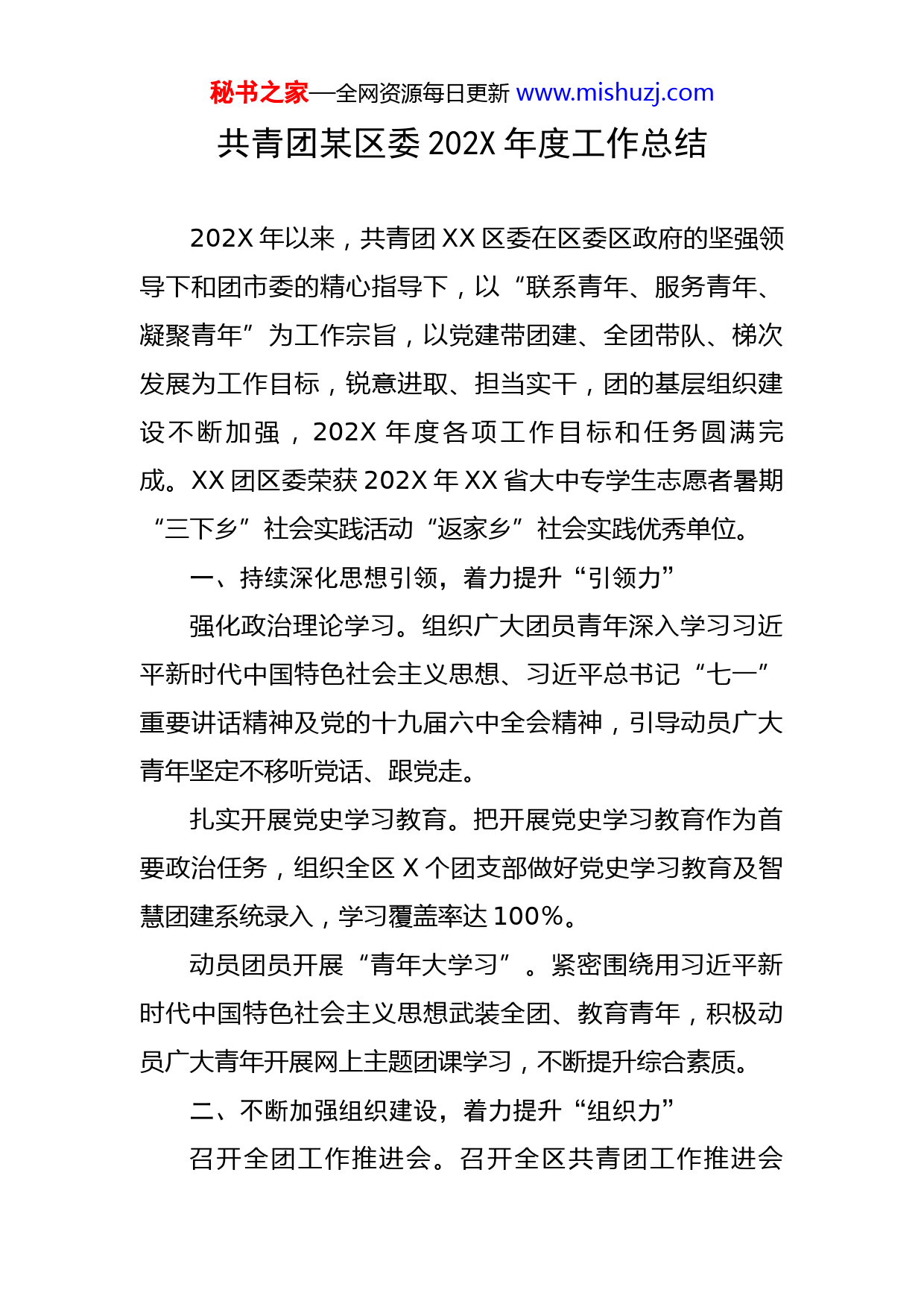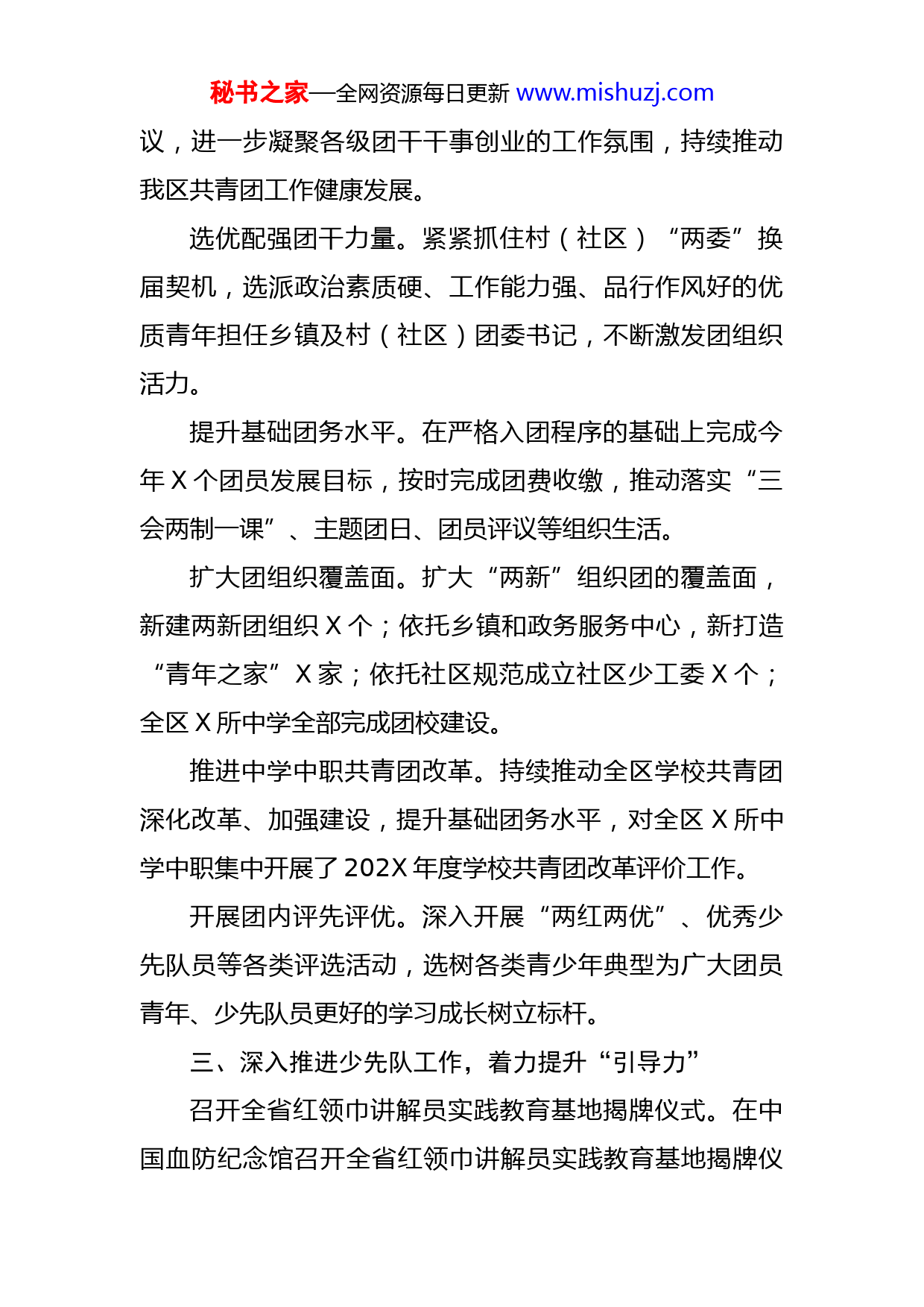 秘书之家—全网资源每日更新www.mishuzj.com共青团某区委202X年度工作总结202X年以来,共青团XX区委在区委区政府的坚强领导下和团市委的精心指导下,以“联系青年、服务青年、凝聚青年”为工作宗旨,以党建带团建、全团带队、梯次发展为工作目标,锐意进取、担当实干,团的基层组织建设不断加强,202X年度各项工作目标和任务圆满完成。XX团区委荣获202X年XX省大中专学生志愿者暑期“三下乡”社会实践活动“返家乡”社会实践优秀单位。一、持续深化思想引领,着力提升“引领力”强化政治理论学习。组织广大团员青年深入学习习近平新时代中国特色社会主义思想、习近平总书记“七一”重要讲话精神及党的十九届六中全会精神,引导动员广大青年坚定不移听党话、跟党走。扎实开展党史学习教育。把开展党史学习教育作为首要政治任务,组织全区X个团支部做好党史学习教育及智慧团建系统录入,学习覆盖率达100%。动员团员开展“青年大学习”。紧密围绕用习近平新时代中国特色社会主义思想武装全团、教育青年,积极动员广大青年开展网上主题团课学习,不断提升综合素质。二、不断加强组织建设,着力提升“组织力”召开全团工作推进会。召开全区共青团工作推进会秘书之家—全网资源每日更新www.mishuzj.com议,进一步凝聚各级团干干事创业的工作氛围,持续推动我区共青团工作健康发展。选优配强团干力量。紧紧抓住村(社区)“两委”换届契机,选派政治素质硬、工作能力强、品行作风好的优质青年担任乡镇及村(社区)团委书记,不断激发团组织活力。提升基础团务水平。在严格入团程序的基础上完成今年X个团员发展目标,按时完成团费收缴,推动落实“三会两制一课”、主题团日、团员评议等组织生活。扩大团组织覆盖面。扩大“两新”组织团的覆盖面,新建两新团组织X个;依托乡镇和政务服务中心,新打造“青年之家”X家;依托社区规范成立社区少工委X个;全区X所中学全部完成团校建设。推进中学中职共青团改革。持续推动全区学校共青团深化改革、加强建设,提升基础团务水平,对全区X所中学中职集中开展了202X年度学校共青团改革评价工作。开展团内评先评优。深入开展“两红两优”、优秀少先队员等各类评选活动,选树各类青少年典型为广大团员青年、少先队员更好的学习成长树立标杆。三、深入推进少先队工作,着力提升“引导力”召开全省红领巾讲解员实践教育基地揭牌仪式。在中国血防纪念馆召开全省红领巾讲解员实践教育基地揭牌仪秘书之家—全网资源每日更新www.mishuzj.com式,引导全区少先队员深刻感悟百年大党的责任担当,让革命薪火在一次次传递中根植于心。开展“红领巾爱学习”宣传教育活动。广泛开展“红领巾心向党”党史学习实践活动,教育引导少先队员牢记习总书记的谆谆教导,努力成长为德智体美劳全面发展的社会主义建设者和接班人。丰富少先队组织生活。全面开展分批入队、离队入团仪式,规范队会、队课和主题队日,增强队员们的责任感、荣誉感和使命感,激励少先队员们成长为担当民族复兴大任的时代新人,用实际行动践行“请党放心,强国有我”的铮铮誓言。四、助力青少年健康成长,着力提升“贡献力”召开预青工作会议。牵头召开预防青少年违法犯罪工作专项组会议,开展202X-202X年度全区学校兼职法制副校长选聘工作,全区X所学校实现法治副校长全覆盖。开展未成年人自护教育。组织各中小学在未成年人保护周期间开展自护教育活动,提高青少年对违法犯罪的自我防范意识和自我保护能力,自觉抵制各种不良行为及违法犯罪行为的引诱和侵害。开展宪法宣传活动。组织各中小学在宪法宣传周期间开展宪法宣传活动,提高青少年学法、知法、守法、护法的法治意识。秘书之家—全网资源每日更新www.mishuzj.com(一)开展“点亮微心愿共创文明城”小城大爱“微心愿”专项行动。在全区开展了微心愿征集活动,收集并实现来自各乡镇50名孩子的微心愿。(二)组织开展“一元捐”活动。在全区发起“希望工程·壹元捐”行动,积极营造全社会关爱XX青少年健康成长的良好氛围。目前共发动捐款X人次,筹集资金X元,所筹款项将全部用于“希望工程”项目。深入推进各类助学项目。今年以来共发放X元“希望工程圆梦行动”助学金到X名应届贫困高中毕业生手中,发放X元“希望工程1+1”助学金到X名贫困中小学生手中,发放X个“希望工程红色小书包”到三所农村学校,切实保障了贫困青少年的受教育权,让特困青少年感受到社会的温暖。五、发挥桥梁纽带作用,着力提升“凝聚力”召开青年工作联席会议。结合我区青年发展工作实际,就落实《XX省中长期青年发展规划(2018-2025年)》召开联席会议第二次全体会议,为策应新时代促进青年发展提供有力抓手。培育挖掘优秀青年。积极开展“乡村好青年”选培工作,全区共推选出X名乡村青年,其中Z名被评为乡村好青年。服务青年婚恋交友。联合区总工会、区妇联在灵溪小秘书之家—全网资源每日更新www.mishuzj.com镇开展202X年度“相约灵溪”青年联谊会,来自全区各机关单位的Z名单身青年男女参加,加强了单身青年的沟通交流,服务青年婚恋交友需求。开展志愿服务活动:(一)开展“七彩假期-暑期关爱儿童”夏令营活动。组织Z名返乡大学生志愿者在X镇X中