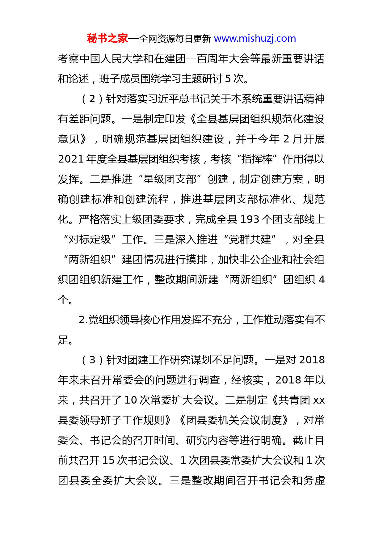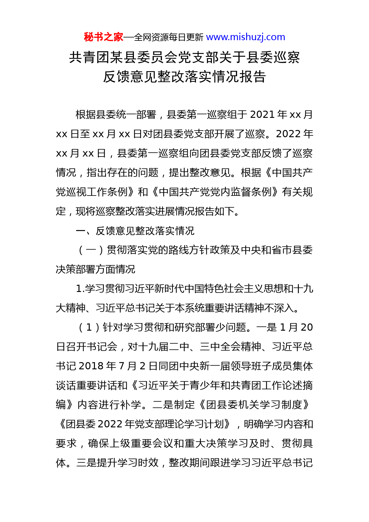 秘书之家—全网资源每日更新www.mishuzj.com共青团某县委员会党支部关于县委巡察反馈意见整改落实情况报告根据县委统一部署,县委第一巡察组于2021年xx月xx日至xx月xx日对团县委党支部开展了巡察。2022年xx月xx日,县委第一巡察组向团县委党支部反馈了巡察情况,指出存在的问题,提出整改意见。根据《中国共产党巡视工作条例》和《中国共产党党内监督条例》有关规定,现将巡察整改落实进展情况报告如下。一、反馈意见整改落实情况(一)贯彻落实党的路线方针政策及中央和省市县委决策部署方面情况1.学习贯彻习近平新时代中国特色社会主义思想和十九大精神、习近平总书记关于本系统重要讲话精神不深入。(1)针对学习贯彻和研究部署少问题。一是1月20日召开书记会,对十九届二中、三中全会精神、习近平总书记2018年7月2日同团中央新一届领导班子成员集体谈话重要讲话和《习近平关于青少年和共青团工作论述摘编》内容进行补学。二是制定《团县委机关学习制度》《团县委2022年党支部理论学习计划》,明确学习内容和要求,确保上级重要会议和重大决策学习及时、贯彻具体。三是提升学习时效,整改期间跟进学习习近平总书记秘书之家—全网资源每日更新www.mishuzj.com考察中国人民大学和在建团一百周年大会等最新重要讲话和论述,班子成员围绕学习主题研讨5次。(2)针对落实习近平总书记关于本系统重要讲话精神有差距问题。一是制定印发《全县基层团组织规范化建设意见》,明确规范基层团组织建设,并于今年2月开展2021年度全县基层团组织考核,考核“指挥棒”作用得以发挥。二是推进“星级团支部”创建,制定创建方案,明确创建标准和创建流程,推进基层团支部标准化、规范化。严格落实上级团委要求,完成全县193个团支部线上“对标定级”工作。三是深入推进“党群共建”,对全县“两新组织”建团情况进行摸排,加快非公企业和社会组织团组织新建工作,整改期间新建“两新组织”团组织4个。2.党组织领导核心作用发挥不充分,工作推动落实有不足。(3)针对团建工作研究谋划不足问题。一是对2018年来未召开常委会的问题进行调查,经核实,2018年以来,共召开了10次常委扩大会议。二是制定《共青团xx县委领导班子工作规则》《团县委机关会议制度》,对常委会、书记会的召开时间、研究内容等进行明确。截止目前共召开15次书记会议、1次团县委常委扩大会议和1次团县委全委扩大会议。三是整改期间召开书记会和务虚秘书之家—全网资源每日更新www.mishuzj.com会,对2021年工作认真总结,对2022年工作目标和计划进行研究讨论,印发《xx县共青团2022年工作要点》。四是对全县20个县直机关团组织、38个学校团组织、125个镇团组织进行全面细致排查,深入了解团组织换届和有关工作开展情况,向12个基层团组织下发“提示函”,督促到期未换届团组织进行换届。(4)针对落实党的领导、党建带团建不够扎实问题。一是今年2月份完成2021年度全县基层团组织考核,将同级党组织每年定期听取共青团青少年工作汇报情况纳入考核内容。二是以县域共青团基层团组织改革为契机,推动将基层党组织党建带团(队)建纳入党建工作部署和年度考核并明确所占分值。三是2021年12月份,向县委组织部干训室报送团干部培训计划,纳入全县党员干部教育培训规划中。(5)针对团建工作检查指导少、考核不实问题。一是制定印发《关于推进全县基层团组织规范化建设的意见》,让基层团组织建设有方向、有标准。二是今年2月组织开展2021年度全县基层团组织考核,考核方式包括实地考核和述职评议两部分,考核结果经书记会专题研究后印发至全县各级团组织,并对考核中各单位出现的问题进行点对点反馈。三是联合县平安办,围绕县级“双零社区”创建工作,深入各镇及创建村开展验收复核。整改期秘书之家—全网资源每日更新www.mishuzj.com间联合县教育局,围绕市级“校外少先队教育实践基地”申报,深入开展现场督查。3.服务大局,生力军和突击队作用不明显。(6)针对围绕中央决策缺乏研究部署问题。一是2月11日召开书记会,对扫黑除恶工作的有关要求进行了补充学习。跟进学习习近平总书记考察中国人民大学和在建团一百周年大会等最新重要讲话和论述,今年以来班子成员围绕不同学习主题研讨5次。二是印发《xx共青团2022年工作要点》,将各级团组织的落实情况纳入年底综合考核,实现流程闭环,确保工作部署落细落实见成效。三是成立xx县青年志愿者协会,今年疫情防控期间积极发挥县青志协的作用,会同县文明办广泛招募青年志愿者300多名;为隔离点儿童捐赠书籍绘本共200余册;玩具、文具套装300余套;为志愿者和干部送去暖心物资包共计500余份。(7)针对围绕xx发展缺少助力推动问题。一是助力青年创业,2021年我委会同7家县直单位组织开展首届县级优秀青年人才(团队)遴选活动,对评选出的4家优秀人才(团队)将拨付扶持资金36万元。二是搭建沟通桥梁,今年2月份联合县大数据中心前往芜湖长三角信息智能创新研究院就青年创业、数据产业园的创建进行考察学习。7月份,与县数字资源管理局等7家单位签订“创梦空秘书之家—全网资源每日更新www.mishuzj.com间”数字产业园共建协议,为入园企业提供服务。三是拓展青年阵地,对县直单位、“两新组织”的建