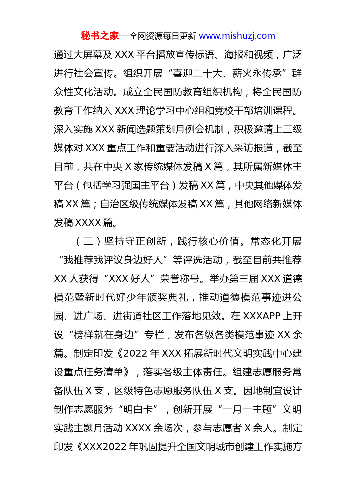 秘书之家—全网资源每日更新www.mishuzj.com关于2022年宣传工作情况的报告一、工作开展情况(一)着眼凝心铸魂,加强理论武装。抓住“关键少数”,充分发挥XXX理论学习中心组的龙头作用,举办党的二十大精神专题读书班,截至目前共举办XXX理论学习中心组学习会XX场。严格落实巡听旁听制度,对XXX各个党委(党组)的专题研讨进行了巡听旁听。在XXX组建青年、巾帼、园丁等XX支二十大宣讲团共XXX人,充实了宣讲力量。打造“理响XX”理论宣讲品牌,举办“理响XX”大讲堂,累计开展各级各类宣讲线上X万余场次,受众XX余万人,线下X万余场次,受众XX余万人,其中学习贯彻党的二十大精神基层宣讲XXXX场次,受众XX万人次。加强“学习强国”学习平台运用管理力度,将学党史纳入XXX党委(党组)理论学习中心组必学内容和党员干部教育培训课程,在XXXAPP上开设“党的二十大精神宣讲展播”专栏,目前已刊播XX条宣讲视频。(二)紧扣中心大局,壮大主流旋律。建立健全新闻线索月报告制度,围绕学习宣传贯彻党的二十大精神、疫情防控、优化营商环境等主题,开设重点栏目和专栏进行报道。加强新闻发言人队伍及平台载体建设,制定完善了突发事件应对机制。在各节日、纪念日等重要时间节点,秘书之家—全网资源每日更新www.mishuzj.com通过大屏幕及XXX平台播放宣传标语、海报和视频,广泛进行社会宣传。组织开展“喜迎二十大、薪火永传承”群众性文化活动。成立全民国防教育组织机构,将全民国防教育工作纳入XXX理论学习中心组和党校干部培训课程。深入实施XXX新闻选题策划月例会机制,积极邀请上三级媒体对XXX重点工作和重要活动进行深入采访报道,截至目前,共在中央X家传统媒体发稿X篇,其所属新媒体主平台(包括学习强国主平台)发稿XX篇,中央其他媒体发稿XX篇;自治区级传统媒体发稿XX篇,其他网络新媒体发稿XXXX篇。(三)坚持守正创新,践行核心价值。常态化开展“我推荐我评议身边好人”等评选活动,截至目前共推荐XX人获得“XXX好人”荣誉称号。举办第三届XXX道德模范暨新时代好少年颁奖典礼,推动道德模范事迹进公园、进广场、进街道社区工作落地见效。在XXXAPP上开设“榜样就在身边”专栏,发布各级各类模范事迹XX余篇。制定印发《2022年XXX拓展新时代文明实践中心建设重点任务清单》,落实各级主体责任。组建志愿服务常备队伍X支,区级特色志愿服务队伍X支。因地制宜设计制作志愿服务“明白卡”,创新开展“一月一主题”文明实践主题月活动XXXX余场次,参与志愿者X余人。制定印发《XXX2022年巩固提升全国文明城市创建工作实施方秘书之家—全网资源每日更新www.mishuzj.com案》,实行“处级领导包街道(苏木镇)、分管领导包战线、区直部门包社区、职能部门抓条块、督查部门抓跟踪”的工作机制。制定“街道(社区)、苏木镇(嘎查村)创城任务一览表”及重点部门创城任务清单。下发督导创城通报XX期,年初至今迎接中央明察暗访测评X次,自治区暗访测评X次。深入开展“好家风好家训”搜集主题活动,编印《XXX好家风好家训》读本。把文明校园创建纳入新时代文明实践教育平台建设,纳入未成年人思想道德建设工作考核,纳入文明城市创建督查之中,文明校园创建参与率达到100%。深入推进“文明团结超市”,目前XXX已有X家文明团结超市挂牌运行。在XXX总结推广余粮堡镇太平庄村“板凳议事会”典型做法。(四)创新体制机制,推动文化繁荣。依托“两个打造”工程,重点打造歌舞剧《彩云飘落的地方》、话剧《马走日》、电视剧《烈马长风》、图书《村名故事》。对乡村振兴题材剧目《牵“牛”花开的好日子》剧本进行提炼。创作原创歌曲《温暖你我》《梦在前方》、曲艺作品群口快板《中华廉洁赞》、小戏《男人有样》、原创舞蹈《草原儿女心向党》。举办“喜迎二十大‘艺’心向未来”群众性文化展演活动。深入开展文化惠民系列演出活动,完成惠民演出XXX场、线上活动点击浏览量X万次。承办全市第二届“中华诗词大会”,筹办第九届“XX诗人秘书之家—全网资源每日更新www.mishuzj.com节”暨本土诗人作品分享会。整合吕明仁、徐永清等烈士纪念馆,打造红色旅游品牌。深入推进莫力庙福巨辽代古城遗址的挖掘、保护工作。截至目前,我区拥有被评定为各级非物质文化遗产项目XX项。(五)树牢底线思维,防范化解风险。制定印发《2022年XXX意识形态工作计划》、防范化解意识形态领域重大风险工作实施方案、风险“三清单”。召开意识形态工作联席会、舆情研判会商会X次,印发每季度重要时间节点月提示,不断压实各级党组织意识形态工作责任。开展“正道”“新风”等专项行动,推进“扫黄打非”基层站点建设。对XXX个意识形态九类主要阵地进行排查统计,做到底数清、情况明。对各类展陈场馆实行备案登记制度,督促烈士纪念场馆开展整改,严格把关解说词和展板内容。对重点网站、论坛、微博等重点群体进行24小时监控,做好舆情应对和舆论引导。引导网评员针对热点问题进行正面评论,完成市级网评任务X万余次,自治区级网评任务XXXX余次,上报网评文章XXX篇。上报社会舆情信息XXX篇,中宣部采用XX篇。二、存在问题当前我区宣传思想工作还存在如下问题:一是舆论引导方面,媒体深度报道还有待加强,统筹媒体新闻资源力度还不够,在对外宣传正