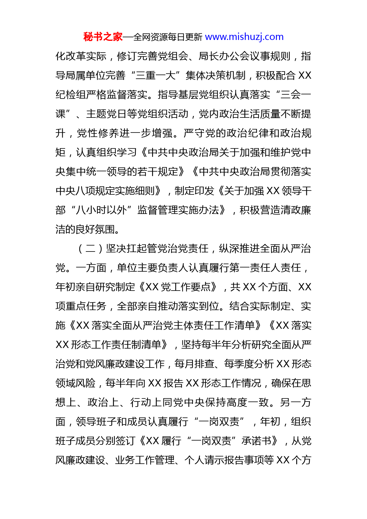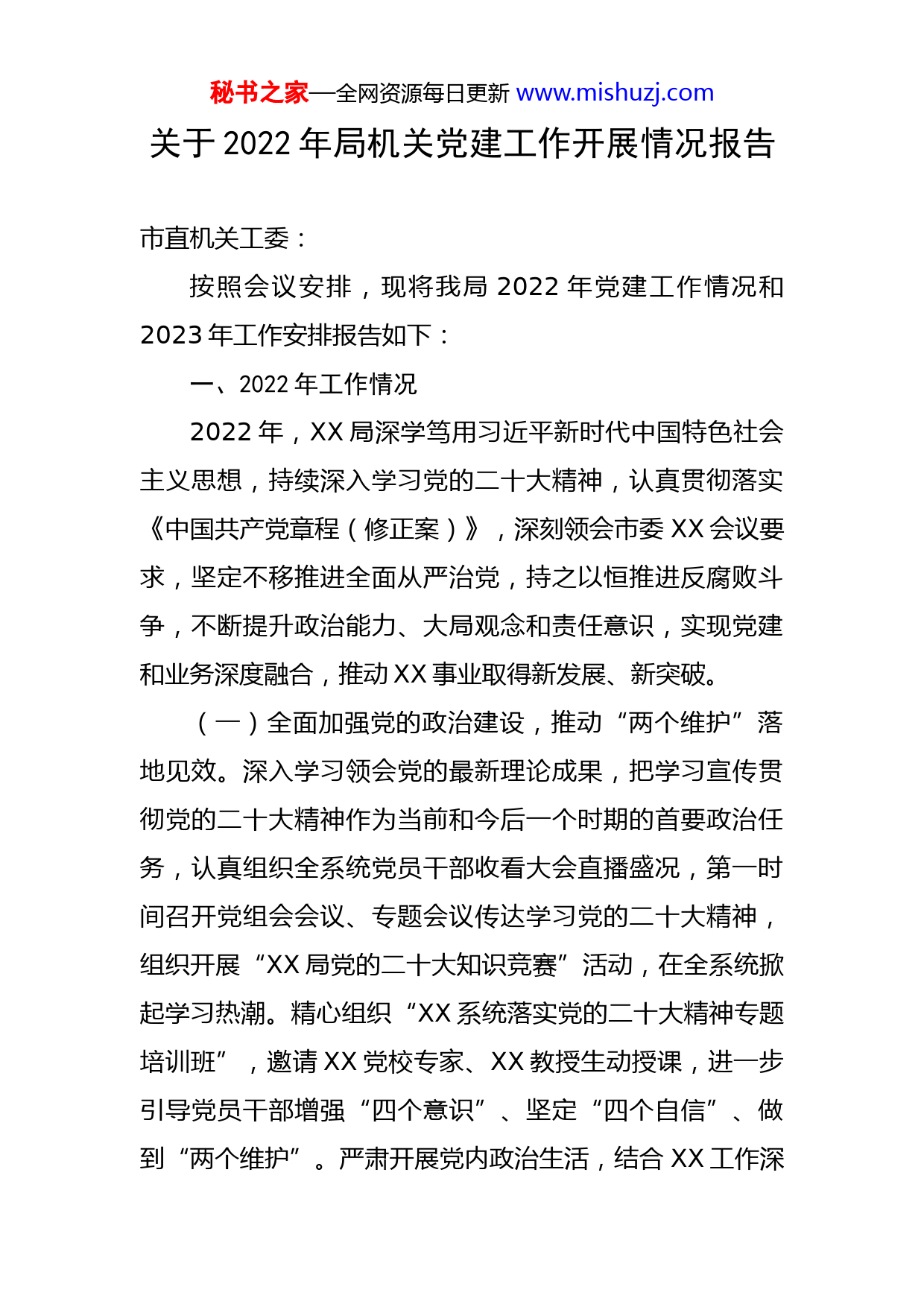 秘书之家—全网资源每日更新www.mishuzj.com关于2022年局机关党建工作开展情况报告市直机关工委:按照会议安排,现将我局2022年党建工作情况和2023年工作安排报告如下:一、2022年工作情况2022年,XX局深学笃用习近平新时代中国特色社会主义思想,持续深入学习党的二十大精神,认真贯彻落实《中国共产党章程(修正案)》,深刻领会市委XX会议要求,坚定不移推进全面从严治党,持之以恒推进反腐败斗争,不断提升政治能力、大局观念和责任意识,实现党建和业务深度融合,推动XX事业取得新发展、新突破。(一)全面加强党的政治建设,推动“两个维护”落地见效。深入学习领会党的最新理论成果,把学习宣传贯彻党的二十大精神作为当前和今后一个时期的首要政治任务,认真组织全系统党员干部收看大会直播盛况,第一时间召开党组会会议、专题会议传达学习党的二十大精神,组织开展“XX局党的二十大知识竞赛”活动,在全系统掀起学习热潮。精心组织“XX系统落实党的二十大精神专题培训班”,邀请XX党校专家、XX教授生动授课,进一步引导党员干部增强“四个意识”、坚定“四个自信”、做到“两个维护”。严肃开展党内政治生活,结合XX工作深秘书之家—全网资源每日更新www.mishuzj.com化改革实际,修订完善党组会、局长办公会议事规则,指导局属单位完善“三重一大”集体决策机制,积极配合XX纪检组严格监督落实。指导基层党组织认真落实“三会一课”、主题党日等党组织活动,党内政治生活质量不断提升,党性修养进一步增强。严守党的政治纪律和政治规矩,认真组织学习《中共中央政治局关于加强和维护党中央集中统一领导的若干规定》《中共中央政治局贯彻落实中央八项规定实施细则》,制定印发《关于加强XX领导干部“八小时以外”监督管理实施办法》,积极营造清政廉洁的良好氛围。(二)坚决扛起管党治党责任,纵深推进全面从严治党。一方面,单位主要负责人认真履行第一责任人责任,年初亲自研究制定《XX党工作要点》,共XX个方面、XX项重点任务,全部亲自推动落实到位。结合实际制定、实施《XX落实全面从严治党主体责任工作清单》《XX落实XX形态工作责任制清单》,坚持每半年分析研究全面从严治党和党风廉政建设工作,每月排查、每季度分析XX形态领域风险,每半年向XX报告XX形态工作情况,确保在思想上、政治上、行动上同党中央保持高度一致。另一方面,领导班子和成员认真履行“一岗双责”,年初,组织班子成员分别签订《XX履行“一岗双责”承诺书》,从党风廉政建设、业务工作管理、个人请示报告事项等XX个方秘书之家—全网资源每日更新www.mishuzj.com面明确了承诺事项,真正做到全面从严治党与业务工作“两手抓、两手硬”。坚持每周例会和每周学习制度,班子成员每周一上午定期听取分管领域工作汇报,每周五下午参加定点联系党支部的学习活动,动态掌握分管干部职工的工作、思想等情况,及时了解情况、研究问题、推动工作。(三)加强机关党建“三基”建设,充分发挥战斗堡垒作用。加强政治机关建设,持续深入推进党史学习教育常态化长效化,制定印发《XX落实《关于推动党史学习教育常态化长效化的实施意见》方案》,明确把开展党史学习教育情况纳入党员干部年度考核内容,确保工作实效。立足本职开展好“我为群众办实事实践活动”,着眼出行难、交通难等问题建立XX“1小时XX圈”,切实提升为民服务的能力和水平。加强基层组织建设,对照XX上级部门关于《加强XX“三基”建设工作方案》要求,结合实际制定《XX工作实施方案》,清单化制定落实措施XX条,通过征集经验线索、典型案例、调查问卷、实地调研等方式,逐一推动相关工作全面落地。加快适应XX深化改革实际,结合改革成立的XX部门、XX单位等内设机构,调整组建党组织XX个,配齐配强党组织书记。制定实施《XX党务公开实施方案》,制定印发《XX党务工作手册》,帮助党员干部更好地了解和参与党内事务。加强干部队伍建秘书之家—全网资源每日更新www.mishuzj.com设,分类抓好新任党支部书记和党务工作者培训,根据XX情防控实际,通过“线上+线下”方式分批对XX名党组织书记、党务干部进行培训教育,进一步提升党性修养和业务能力。(四)锲而不舍纠“四风”树新风,持之以恒正风肃纪反腐。用好巡察监督这把“利剑”,聚焦中央、市委重大决策部署和XX上级部门有关要求,坚持问题导向和结果导向相结合,常态化开展政治监督。今年以来,组建成立X个巡察工作组,由XX级领导干部带队督导,围绕学习贯彻落实习近平新时代中国特色社会主义思想和XX上级部门决策部署、履行全面从严治党主体责任、开展党史学习教育、财务管理、选人用人等情况,对全系统XX个分局、XX个单位推进落实情况进行巡察,对上一年度XX个单位的巡察整改情况进行评估,形成巡察工作报告XX份、发现问题XX个,制定整改措施XX条,有力推动全系统作风建设持续向好。精细化开展日常监督,全面梳理XX业务领域廉政风险点,组织各部门、各单位结合实际制定《廉政风险防控方案》,编制工作流程导图,严格规范工作程序。常态化抓好党风廉政教育,通过“走出去”参观廉政教育基地、“请进来”学习党纪党规解读、“坐下来”交流学习工作感悟,进一步筑牢拒腐防变的思想防线。今年以来,XX局全面从严治党