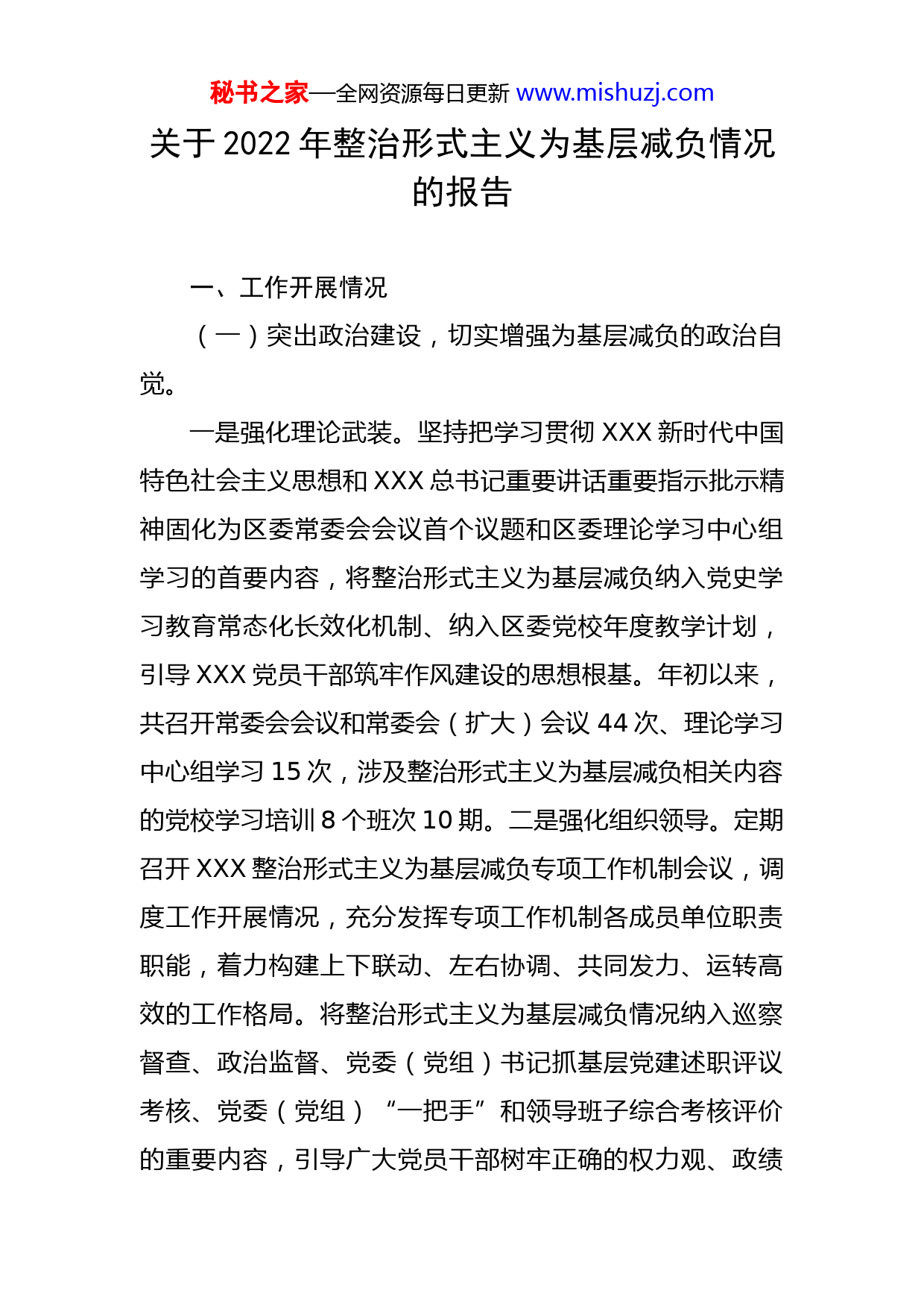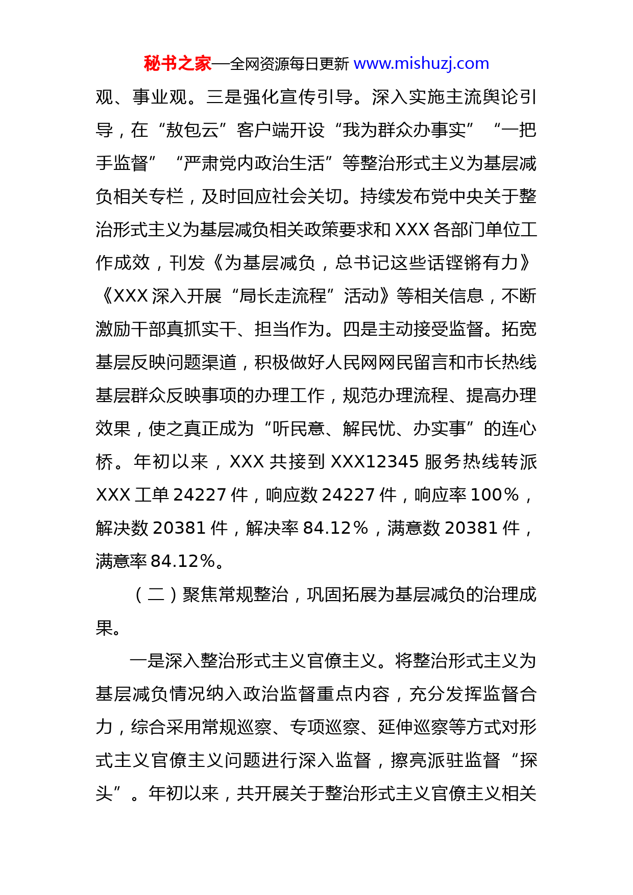 秘书之家—全网资源每日更新www.mishuzj.com关于2022年整治形式主义为基层减负情况的报告一、工作开展情况(一)突出政治建设,切实增强为基层减负的政治自觉。一是强化理论武装。坚持把学习贯彻XXX新时代中国特色社会主义思想和XXX总书记重要讲话重要指示批示精神固化为区委常委会会议首个议题和区委理论学习中心组学习的首要内容,将整治形式主义为基层减负纳入党史学习教育常态化长效化机制、纳入区委党校年度教学计划,引导XXX党员干部筑牢作风建设的思想根基。年初以来,共召开常委会会议和常委会(扩大)会议44次、理论学习中心组学习15次,涉及整治形式主义为基层减负相关内容的党校学习培训8个班次10期。二是强化组织领导。定期召开XXX整治形式主义为基层减负专项工作机制会议,调度工作开展情况,充分发挥专项工作机制各成员单位职责职能,着力构建上下联动、左右协调、共同发力、运转高效的工作格局。将整治形式主义为基层减负情况纳入巡察督查、政治监督、党委(党组)书记抓基层党建述职评议考核、党委(党组)“一把手”和领导班子综合考核评价的重要内容,引导广大党员干部树牢正确的权力观、政绩秘书之家—全网资源每日更新www.mishuzj.com观、事业观。三是强化宣传引导。深入实施主流舆论引导,在“敖包云”客户端开设“我为群众办事实”“一把手监督”“严肃党内政治生活”等整治形式主义为基层减负相关专栏,及时回应社会关切。持续发布党中央关于整治形式主义为基层减负相关政策要求和XXX各部门单位工作成效,刊发《为基层减负,总书记这些话铿锵有力》《XXX深入开展“局长走流程”活动》等相关信息,不断激励干部真抓实干、担当作为。四是主动接受监督。拓宽基层反映问题渠道,积极做好人民网网民留言和市长热线基层群众反映事项的办理工作,规范办理流程、提高办理效果,使之真正成为“听民意、解民忧、办实事”的连心桥。年初以来,XXX共接到XXX12345服务热线转派XXX工单24227件,响应数24227件,响应率100%,解决数20381件,解决率84.12%,满意数20381件,满意率84.12%。(二)聚焦常规整治,巩固拓展为基层减负的治理成果。一是深入整治形式主义官僚主义。将整治形式主义为基层减负情况纳入政治监督重点内容,充分发挥监督合力,综合采用常规巡察、专项巡察、延伸巡察等方式对形式主义官僚主义问题进行深入监督,擦亮派驻监督“探头”。年初以来,共开展关于整治形式主义官僚主义相关秘书之家—全网资源每日更新www.mishuzj.com巡察1轮,共查处形式主义、官僚主义相关问题线索XXX件,立案XXX件,给予党纪政务处分XXX人,通报曝光XXX批XXX人。二是持续推进精文减会。定期召开XXX公文管理与报备业务培训会,进一步提高公文规范管理水平。严格执行发文开会审批报备制度,建立月监测制度、减负工作台账,从严管控文件数量和XXX性会议规模,区委办公室、区政府办公室及时对各部门目标完成情况进行跟踪通报。年初以来,共制发本级两类文件XXX件、同比减少10.3%,召开XXX性会议XXX次,文风会风进一步好转。三是统筹规范督查考核。统筹XXX各项督查检查考核计划,严格控制总量,制定《XXX2022年度督查检查考核计划》,每月对各苏木镇、街道接受区级督查检查考核情况进行摸底调查。今年以来,各单位上报年度督查检查考核事项共计XXX条,经反复研判后精简合并为XXX条,比上年度计划数同比减少15.4%。截至目前,接收计划内督查检查考核备案报告XXX项。四是切实改进调查研究。积极构建大调研工作格局,建立经常性调查研究制度,对XXX所有苏木镇开展全覆盖式乡村振兴调研。统筹安排调研活动,不集中或轮番到一个地方、一个点、一条线路去调研,调研过程中不搞陪同,调研乘车及用餐一切从简,促进了工作作风进一步好转。XXX处级领导同志每月调研和现场办公时间均不低于当月工作日的1/3,年初以来,秘书之家—全网资源每日更新www.mishuzj.com各常委累计开展调研指导工作XXX余次、XXX余天。五是持续增强基层党组织活力。简化基层报表事项,采取“一表多用、多信息合一、定期更新”模式,有效避免相同信息重复统计情况出现,减轻村级组织行政管理事务过多负担。优化精简村干部培训,推动对334名嘎查村党组织书记培训全覆盖、镇级对嘎查村“两委”成员和农村党员培训全覆盖。强化基层基础保障,今年以来,已完成村干部工资和离任老干部补贴经费审核和发放工作,共发放经费XXX万元。六是持续整治“指尖上的形式主义”和创建示范活动中的形式主义。在完成移动互联网应用程序整治清理工作的基础上,要求各部门各单位建立健全政务APP、微信工作群内部管理制度,实行实名准入制度,规范信息发布。常态化开展监督检查,定期开展整治“指尖上的形式主义”“回头看”工作,确保基层减负取得实效。(三)紧盯重点领域,持续提升为基层减负的工作效能。一是常态化开展疫情防控监督检查。发布《关于在XXX疫情防控中受理党员干部不担当不作为等问题举报的公告》,成立监督检查组,紧盯重点单位、重点场所,深入整治疫情防控工作中的形式主义、官僚主义问题。年初以来,共检查重点单位及重点场所1000余个,共发现问题600余个,向相关部门提出整改建议33条,发送提醒函秘书之家—全网资源每日更新www.mishuzj.com10份、督办函