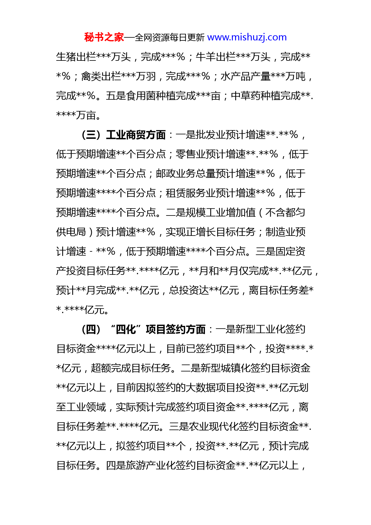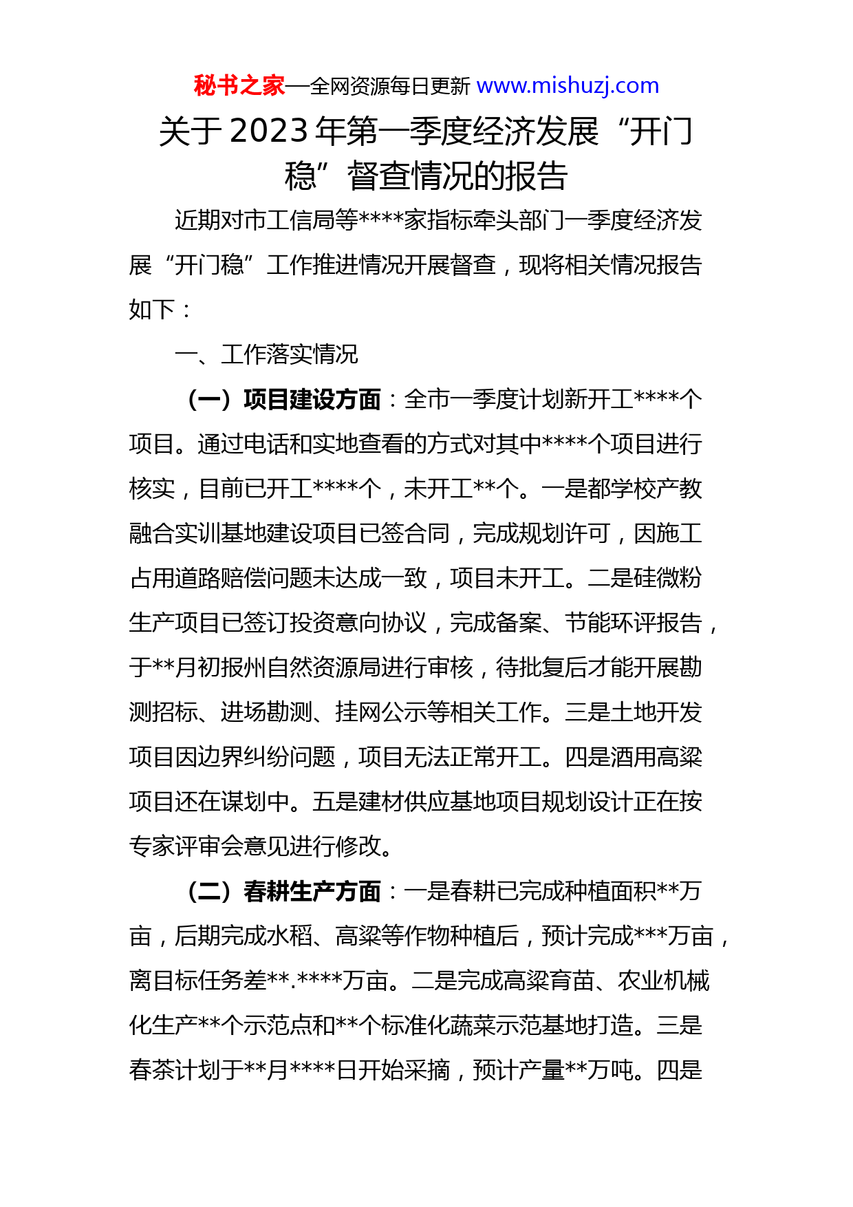 秘书之家—全网资源每日更新www.mishuzj.com关于2023年第一季度经济发展“开门稳”督查情况的报告近期对市工信局等家指标牵头部门一季度经济发展“开门稳”工作推进情况开展督查,现将相关情况报告如下:一、工作落实情况(一)项目建设方面:全市一季度计划新开工个项目。通过电话和实地查看的方式对其中个项目进行核实,目前已开工个,未开工个。一是都学校产教融合实训基地建设项目已签合同,完成规划许可,因施工占用道路赔偿问题未达成一致,项目未开工。二是硅微粉生产项目已签订投资意向协议,完成备案、节能环评报告,于月初报州自然资源局进行审核,待批复后才能开展勘测招标、进场勘测、挂网公示等相关工作。三是土地开发项目因边界纠纷问题,项目无法正常开工。四是酒用高粱项目还在谋划中。五是建材供应基地项目规划设计正在按专家评审会意见进行修改。(二)春耕生产方面:一是春耕已完成种植面积万亩,后期完成水稻、高粱等作物种植后,预计完成万亩,离目标任务差.万亩。二是完成高粱育苗、农业机械化生产个示范点和个标准化蔬菜示范基地打造。三是春茶计划于月日开始采摘,预计产量万吨。四是秘书之家—全网资源每日更新www.mishuzj.com生猪出栏万头,完成%;牛羊出栏万头,完成%;禽类出栏万羽,完成%;水产品产量万吨,完成%。五是食用菌种植完成亩;中草药种植完成.万亩。(三)工业商贸方面:一是批发业预计增速.%,低于预期增速个百分点;零售业预计增速.%,低于预期增速个百分点;邮政业务总量预计增速%,低于预期增速个百分点;租赁服务业预计增速%,低于预期增速个百分点。二是规模工业增加值(不含都匀供电局)预计增速%,实现正增长目标任务;制造业预计增速﹣%,低于预期增速个百分点。三是固定资产投资目标任务.亿元,月和月仅完成.亿元,预计月完成.亿元,总投资达亿元,离目标任务差.亿元。(四)“四化”项目签约方面:一是新型工业化签约目标资金亿元以上,目前已签约项目个,投资.亿元,超额完成目标任务。二是新型城镇化签约目标资金亿元以上,目前因拟签约的大数据项目投资.亿元划至工业领域,实际预计完成签约项目资金.亿元,离目标任务差.亿元。三是农业现代化签约目标资金.亿元以上,拟签约项目个,投资.亿元,预计完成目标任务。四是旅游产业化签约目标资金.亿元以上,秘书之家—全网资源每日更新www.mishuzj.com目前拟签约项目个,投资.亿元,预计完成目标任务。五是新增产业到位资金已完成.亿元,离目标任务差.亿元,市投促局正在挖掘存量项目来补足资金缺口。(五)投资保障方面:一是一季度固定资产投资任务为万元,因无存量项目以及拟新入库项目资料待完善,存在无法完成任务的风险。二是建立政银企及时对接机制,搭建市级重点项目融资对接平台,目前水泥厂已签约中长期贷款和贷款贴息,支用贷款.亿元,完成目标任务。三是通过统筹谋划,超额完成目标任务。转移支付资金已到亿元,完成目标任务。(六)其他指标方面:培育市场主体目标任务户,截至督查时,市市监局调度完成户,离目标任务差户。餐饮业预计增速%,低于预期增速个百分点。水利、环境和公共设施管理劳动报酬指标预计增速%,低于预期增速个百分点。电信业务总量指标,预计增速为%,低于预期增速个百分点,位次可保持在全州前列。城镇居民人均可支配收入预计增速%,低于预期增速个百分点。建筑业总产值预计完成亿元,增速%,低于预期增速个百分点。二、存在问题(一)部分指标推进不理想。部分指标完成情况离目标任务差距较大,一定程度上影响一季度经济发展“开门秘书之家—全网资源每日更新www.mishuzj.com稳”工作目标实现。(二)存量项目支撑乏力,投资后劲不足。(三)工作思考谋划有差距。部分单位在开展工作中对如何缩小目标任务差距思考不足,存在以文件落实文件现象。(四)工作存在“等、靠”思想。部分单位在开展工作的过程中,未主动靠前,存在“等、靠”思想。(五)底数不清现象依然存在。部分单位对所负责的工作推进情况底数不清、情况不明。三、工作建议(一)紧盯目标任务,强化责任落实。市发改局要紧盯2023年一季度经济发展“开门稳”目标任务,全力抓好经济运行分析调度,加强重点经济指标的监测研判。市统计局要依法依规做好统计工作,把好数据源头质量关,做好数据审核工作,加强统计精细化管理,做到应统尽统、颗粒归仓。各部门要以“跳起来摘桃子”的精神,推动各项任务目标实现,负责多项指标的部门要取长补短做好指标平衡(优势指标增量补充弱项指标缺口),确保各领域、各板块指标达到预期目标。各部门要围绕目标任务再发力、再冲刺。(二)狠抓项目谋划,做大项目储备库。全市各级各部门要紧紧围绕新型工业化、新型城镇化、农业现代化、秘书之家—全网资源每日更新www.mishuzj.com旅游产业化积极谋划储备一批大项目、好项目。市投促局要强化项目前期工作,加强向上对接力度,全力以赴争取上级项目资金、政策支持,促进项目顺利建设,推动我市区域经济迅速增长,实现2023年全年GDP增长%的目标。(三)加强系统谋划,确保目标任务保质保量完成。市发改局要充分运用此次督查结果,加强分析研判,提高调度分析的精准性、实效性,超前谋划下一步经济工作,为推动全年经济社会高质量发展奠定坚实基础。各