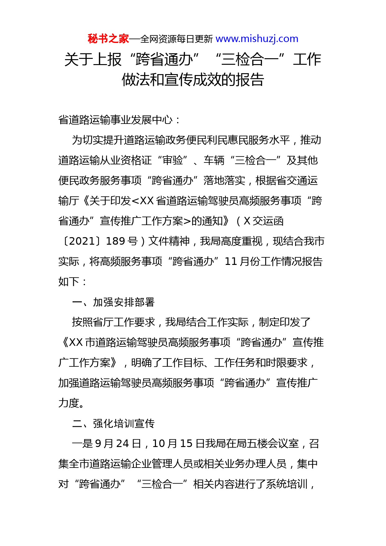 秘书之家—全网资源每日更新www.mishuzj.com关于上报“跨省通办”“三检合一”工作做法和宣传成效的报告省道路运输事业发展中心:为切实提升道路运输政务便民利民惠民服务水平,推动道路运输从业资格证“审验”、车辆“三检合一”及其他便民政务服务事项“跨省通办”落地落实,根据省交通运输厅《关于印发的通知》(X交运函〔2021〕189号)文件精神,我局高度重视,现结合我市实际,将高频服务事项“跨省通办”11月份工作情况报告如下:一、加强安排部署按照省厅工作要求,我局结合工作实际,制定印发了《XX市道路运输驾驶员高频服务事项“跨省通办”宣传推广工作方案》,明确了工作目标、工作任务和时限要求,加强道路运输驾驶员高频服务事项“跨省通办”宣传推广力度。二、强化培训宣传一是9月24日,10月15日我局在局五楼会议室,召集全市道路运输企业管理人员或相关业务办理人员,集中对“跨省通办”“三检合一”相关内容进行了系统培训,秘书之家—全网资源每日更新www.mishuzj.com培训人数53人,会上将企业提出的相关问题一一进行了解答。二是督促全市道路运输企业结合业务知识培训、安全教育等时机,对“跨省通办”“三检合一”相关内容开展广泛宣传。三是结合实际在办事窗口、运输站场、物流园区、企业内部宣传栏张贴宣传海报100份,发放从业资格证“跨省通办”手把手教程及道路运输证“跨省通办”手把手教程各100份,实现企业全覆盖。四是利用“微信公众号、快手、抖音”等网络平台做好宣传工作。10月8日我局通过抖音官方平台发布跨省通办宣传视频1条,其中浏览观看人数1062人,点赞人99人,答复内容1条。10月9日我局通过微信公众号发布跨省通办宣传内容2两条,阅读人数109人。五是通过利用车站、公交车、出租车等LED电子屏,滚动播放道路运输便民政务服务“跨省通办”宣传标语,扩大宣传的覆盖面。截止目前,共办理各项“跨省通办”件数32件,其中:道路运输证注销7件、道路运输证换发14件,从业资格证补发1件,人员诚信考核10件。三、及时回复咨询我局在市政务大厅交通运输服务窗口指定专人负责,为前来办事的企业和群众提供“跨省通办”“三检合一”业务办理咨询答疑服务。同时,组织开展12328交通运输服秘书之家—全网资源每日更新www.mishuzj.com务热线值班人员“跨省通办”“三检合一”专项培训,及时解答群众咨询。四、存在的问题和下一步工作计划因部分企业及驾驶员对电脑操作不够熟练,都愿意线下办理,导致我市办件数量较低。对此,我局在下一步工作中,将加大宣传力度,引导驾驶员线上办理,以此来提升提件数量及办理效率。XX市交通运输局