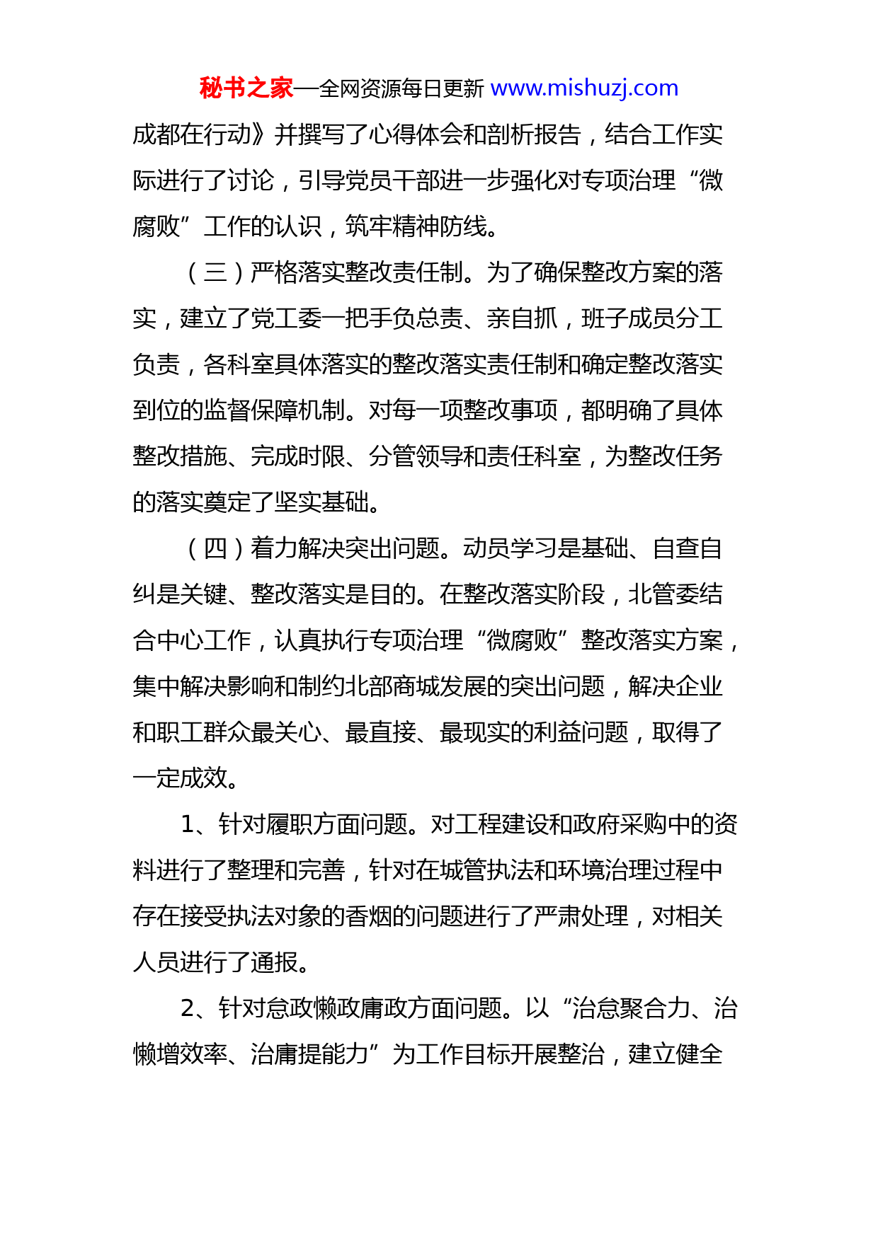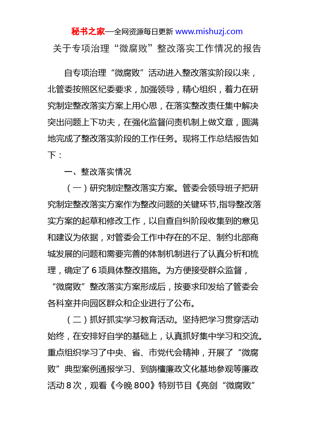 秘书之家—全网资源每日更新www.mishuzj.com关于专项治理“微腐败”整改落实工作情况的报告自专项治理“微腐败”活动进入整改落实阶段以来,北管委按照区纪委要求,加强领导,精心组织,着力在研究制定整改落实方案上用心思,在落实整改责任集中解决突出问题上下功夫,在强化监督问责机制上做文章,圆满地完成了整改落实阶段的工作任务。现将工作总结报告如下:一、整改落实情况(一)研究制定整改落实方案。管委会领导班子把研究制定整改落实方案作为整改问题的关键环节,指导整改落实方案的起草和修改工作,以自查自纠阶段收集到的意见和建议为依据,对管委会工作中存在的不足、制约北部商城发展的问题和需要完善的体制机制进行了认真分析和梳理,确定了6项具体整改措施。为方便接受群众监督,“微腐败”整改落实方案形成后,按要求印发给了管委会各科室并向园区群众和企业进行了公布。(二)抓好抓实学习教育活动。坚持把学习贯穿活动始终,在安排好自学的基础上,认真抓好集中学习和交流。重点组织学习了中央、省、市党代会精神,开展了“微腐败”典型案例通报学习、到旃檀廉政文化基地参观等廉政活动8次,观看《今晚800》特别节目《亮剑“微腐败”秘书之家—全网资源每日更新www.mishuzj.com成都在行动》并撰写了心得体会和剖析报告,结合工作实际进行了讨论,引导党员干部进一步强化对专项治理“微腐败”工作的认识,筑牢精神防线。(三)严格落实整改责任制。为了确保整改方案的落实,建立了党工委一把手负总责、亲自抓,班子成员分工负责,各科室具体落实的整改落实责任制和确定整改落实到位的监督保障机制。对每一项整改事项,都明确了具体整改措施、完成时限、分管领导和责任科室,为整改任务的落实奠定了坚实基础。(四)着力解决突出问题。动员学习是基础、自查自纠是关键、整改落实是目的。在整改落实阶段,北管委结合中心工作,认真执行专项治理“微腐败”整改落实方案,集中解决影响和制约北部商城发展的突出问题,解决企业和职工群众最关心、最直接、最现实的利益问题,取得了一定成效。1、针对履职方面问题。对工程建设和政府采购中的资料进行了整理和完善,针对在城管执法和环境治理过程中存在接受执法对象的香烟的问题进行了严肃处理,对相关人员进行了通报。2、针对怠政懒政庸政方面问题。以“治怠聚合力、治懒增效率、治庸提能力”为工作目标开展整治,建立健全秘书之家—全网资源每日更新www.mishuzj.com作风建设长效机制,全面实现思想作风、工作作风、生活作风的大转变。3、针对遵守党的政治纪律和贯彻落实中央八项规定精神方面问题。通过加强党章党规的学习,进一步增强了干部职工的政治意识、纪律意识、规矩意识;强化对资金使用的审批审查,严格控制管委会内“三公”经费支出。4、针对维稳工作中因为群众诉求未得到合理解决造成的干群关系比较紧张的问题。召开北部商城维稳工作研判会制定切实可行的应急处突措施,同时针对短时期无法解决的诉求,向群众做好解释工作,争取群众的支持和理解。(五)完善机制体制建设。北管委把解决“微腐败”现实问题与建立长效机制结合起来,推进相关体制机制的建立和完善,形成制度保障,先后修改和完善《北部商城管委会党风廉政建设谈话提醒制度》、《北部商城管委会“五不直接分管”制度实施办法》、《成都市新都北部商城管理委员会权力清单和责任清单管理办法》、《成都市新都北部商城管理委员会科室廉政风险点及防控措施》,推进了“微腐败”治理整改工作落到实处。(六)做好材料和信息报送工作。按要求及时上报了《成都市新都北部商城管理委员会专项治理“微腐败”问题整改落实方案》、《北部商城管理委员会“微腐败”问题剖析报告》等材料,共印发通报7次,简报5期。秘书之家—全网资源每日更新www.mishuzj.com二、整改落实的主要特点(一)领导高度重视。北管委党工委对专项治理“微腐败”第三阶段工作极为重视,以高度的责任感和使命感,高标准,严要求,扎扎实实地抓好各个环节工作的落实。7月21日召开了专项治理“微腐败”第三阶段动员大会,就整改落实工作进行了专项部署,班子成员带头研究起草整改落实方案,保证了整改落实方案的质量;为抓好问题的集中整改,班子成员按照整改责任制的分工和要求,积极组织各科室抓好整改措施的落实,能解决的问题马上采取措施加以整改,一时解决不了的问题,积极创造条件,按照规定时限进行整改,争取早日解决。(二)组织措施到位。为使整改落实工作开展得富有成效,北管委严格按照区纪委相关文件要求,始终注重结合自身工作实际,以突出实效为重点,为企业和群众解决交通出行、公共用电、生活服务等问题10条,获得园区企业和群众的一致好评,使整改落实阶段工作取得切实成效。(三)工作主动超前。在第三阶段工作中,北管委始终注重发挥工作的主动性,超前运作并按时完成各个环节的工作任务。工作中遇到困难和问题及时向区纪委督导组请示报告,并严格按照区纪委组的指示办理,活动开展情况及时向区纪委督导组汇报;及时落实专项治理“微腐败”工作通知精神,按时上报各种材料和报表;严格落实秘书之家—全网资源每日更新www.mishuzj.com《成都市新都北