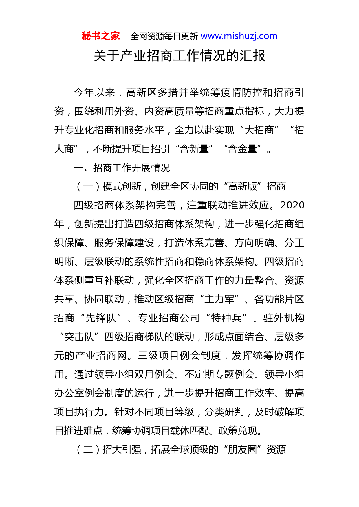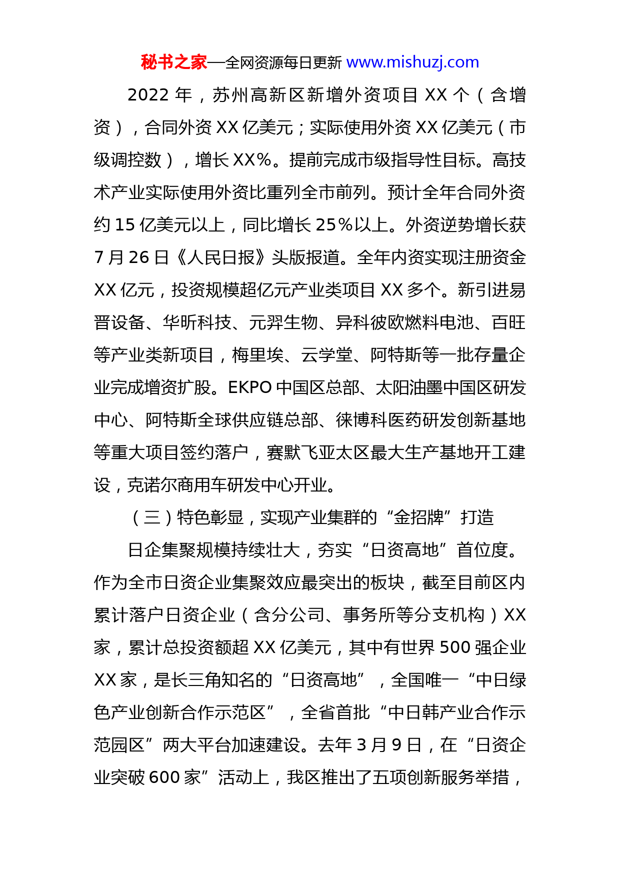 秘书之家—全网资源每日更新www.mishuzj.com关于产业招商工作情况的汇报今年以来,高新区多措并举统筹疫情防控和招商引资,围绕利用外资、内资高质量等招商重点指标,大力提升专业化招商和服务水平,全力以赴实现“大招商”“招大商”,不断提升项目招引“含新量”“含金量”。一、招商工作开展情况(一)模式创新,创建全区协同的“高新版”招商四级招商体系架构完善,注重联动推进效应。2020年,创新提出打造四级招商体系架构,进一步强化招商组织保障、服务保障建设,打造体系完善、方向明确、分工明晰、层级联动的系统性招商和稳商体系架构。四级招商体系侧重互补联动,强化全区招商工作的力量整合、资源共享、协同联动,推动区级招商“主力军”、各功能片区招商“先锋队”、专业招商公司“特种兵”、驻外机构“突击队”四级招商梯队的联动,形成点面结合、层级多元的产业招商网。三级项目例会制度,发挥统筹协调作用。通过领导小组双月例会、不定期专题例会、领导小组办公室例会制度的运行,进一步提升招商工作效率、提高项目执行力。针对不同项目等级,分类研判,及时破解项目推进难点,统筹协调项目载体匹配、政策兑现。(二)招大引强,拓展全球顶级的“朋友圈”资源秘书之家—全网资源每日更新www.mishuzj.com2022年,苏州高新区新增外资项目XX个(含增资),合同外资XX亿美元;实际使用外资XX亿美元(市级调控数),增长XX%。提前完成市级指导性目标。高技术产业实际使用外资比重列全市前列。预计全年合同外资约15亿美元以上,同比增长25%以上。外资逆势增长获7月26日《人民日报》头版报道。全年内资实现注册资金XX亿元,投资规模超亿元产业类项目XX多个。新引进易晋设备、华昕科技、元羿生物、异科彼欧燃料电池、百旺等产业类新项目,梅里埃、云学堂、阿特斯等一批存量企业完成增资扩股。EKPO中国区总部、太阳油墨中国区研发中心、阿特斯全球供应链总部、徕博科医药研发创新基地等重大项目签约落户,赛默飞亚太区最大生产基地开工建设,克诺尔商用车研发中心开业。(三)特色彰显,实现产业集群的“金招牌”打造日企集聚规模持续壮大,夯实“日资高地”首位度。作为全市日资企业集聚效应最突出的板块,截至目前区内累计落户日资企业(含分公司、事务所等分支机构)XX家,累计总投资额超XX亿美元,其中有世界500强企业XX家,是长三角知名的“日资高地”,全国唯一“中日绿色产业创新合作示范区”,全省首批“中日韩产业合作示范园区”两大平台加速建设。去年3月9日,在“日资企业突破600家”活动上,我区推出了五项创新服务举措,秘书之家—全网资源每日更新www.mishuzj.com设立了中日绿色产业基金,加速线上“苏作馆”在乐天网上线,设立“中日友好门诊”、日资中小企业服务中心,开通“商贸通”中日国际数据通道,不断丰富对日合作内涵。今年将举办日资企业700家庆典。集成电路集群初具规模,创建“硬核科创”高平台。目前,全区集聚了集成电路产业类相关企业XX家,预计全年营收规模近XX亿元,超全年140亿元目标的XX%。上市企业6家(长光华芯、国芯科技、固锝电子、天孚通信、和林微纳、普源精电),独角兽企业3家,瞪羚企业9家,专精特新企业9家以及高新技术企业38家,另有贝克微、珂玛材料、硅谷数模等多家企业计划上市。先后落户了南京大学国家集成电路产教融合创新平台苏州中心、集成电路可靠性验证公共服务平台、长三角G60科创走廊激光产业联盟、苏州半导体激光创新研究院、江苏省板卡集成电路和元器件适配验证中心等多个高层次专业平台,为集成电路产业发展提供全方位支撑。光子产业聚焦发展动能,下好“战略产业”先手棋。8月18日,高新区举办光子产业创新集群发展大会暨太湖光子中心发布活动,在全国率先启动建设世界级光子创新中心——太湖光子中心,并发布太湖光子中心总体概念及产业创新政策。太湖光子中心将被打造成为太湖科学城、高新区的特色品牌,全力推进千亿级光子产业集群,形成秘书之家—全网资源每日更新www.mishuzj.com“东纳米、西光子”的产业发展格局。从光芯片、光制造、光显示、光医疗、光通信及光传感六个细分领域出发,借助各类中介公司、头部基金、投行、高校院所资源,围绕产业链上下游重要环节,招引“竞争性强、成长性好、关联性高”的产业链引擎性项目。(四)注重实效,强化项目服务的“推进器”赋能今年以来共完成产业用地预审项目XX个,总投资约XX亿元,其中通用汽研院、狮山生物医药创新基地XX个项目已完成供地并开工。截至年底,我区共签约项目XX多个。已签约项目进度总体有序推进,克诺尔商用车研发中心、西门子电气产品中国及东亚总部、百胜中国智能运营中心等XX个项目已开业;中软国际解放号苏州新软件协同创新产业基地、赛默飞世尔生命科学产业基地、中国汽研华东总部等XX个项目已开工。二、存在问题与不足一是国际形势不稳定。受疫情和国际关系不稳定等因素影响,国际投资信心不足,国外招商、来区考察也受到限制,项目招引周期拉长,且不确定性加强。国内投资除了疫情影响,一方面受限于一线城市和经济大市的产业结构调整、劳动力成本上涨等客观问题,一些高能耗、劳力密集的产业或产业部分环节,出现了资金、技术、人才等