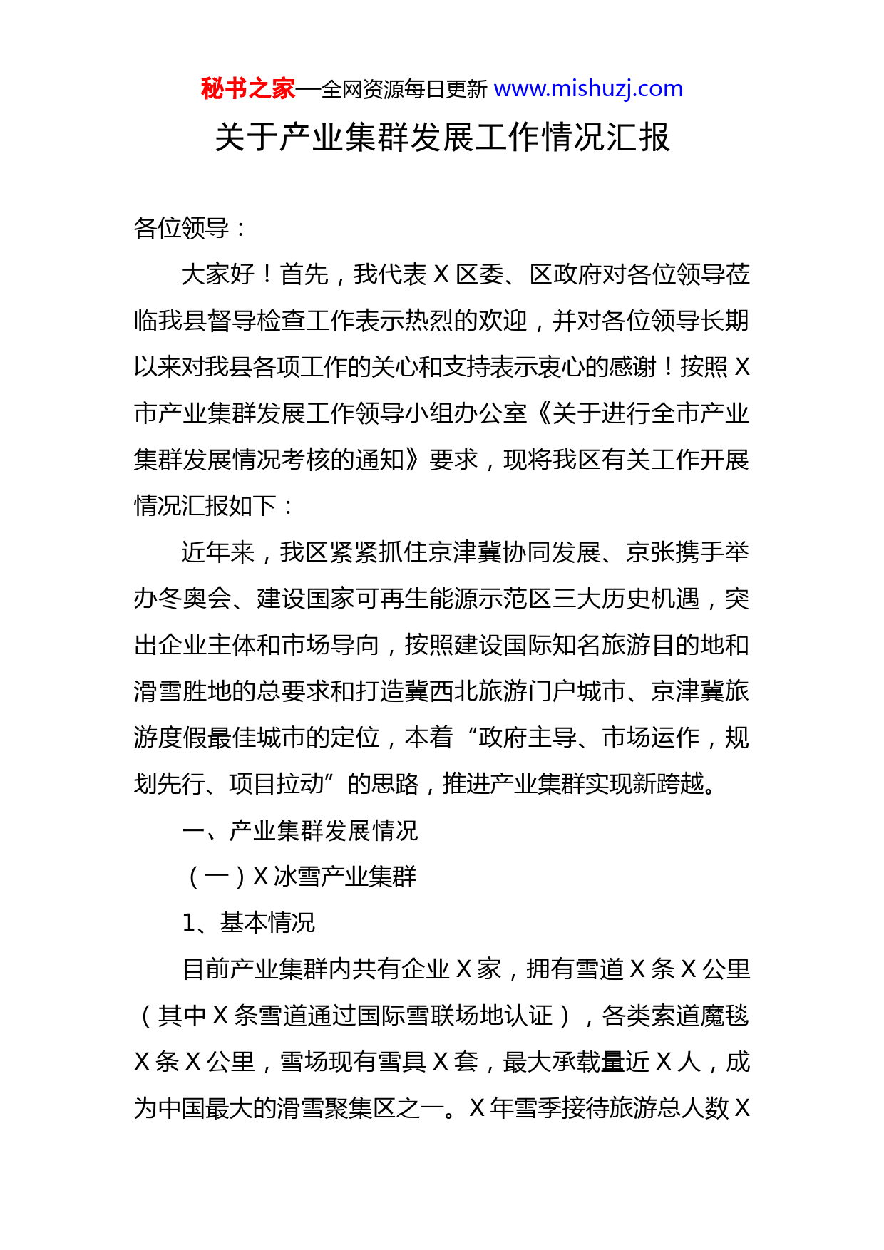 秘书之家—全网资源每日更新www.mishuzj.com关于产业集群发展工作情况汇报各位领导:大家好!首先,我代表X区委、区政府对各位领导莅临我县督导检查工作表示热烈的欢迎,并对各位领导长期以来对我县各项工作的关心和支持表示衷心的感谢!按照X市产业集群发展工作领导小组办公室《关于进行全市产业集群发展情况考核的通知》要求,现将我区有关工作开展情况汇报如下:近年来,我区紧紧抓住京津冀协同发展、京张携手举办冬奥会、建设国家可再生能源示范区三大历史机遇,突出企业主体和市场导向,按照建设国际知名旅游目的地和滑雪胜地的总要求和打造冀西北旅游门户城市、京津冀旅游度假最佳城市的定位,本着“政府主导、市场运作,规划先行、项目拉动”的思路,推进产业集群实现新跨越。一、产业集群发展情况(一)X冰雪产业集群1、基本情况目前产业集群内共有企业X家,拥有雪道X条X公里(其中X条雪道通过国际雪联场地认证),各类索道魔毯X条X公里,雪场现有雪具X套,最大承载量近X人,成为中国最大的滑雪聚集区之一。X年雪季接待旅游总人数X秘书之家—全网资源每日更新www.mishuzj.com万人次,实现旅游综合总收入X亿元,连续X年保持了X%以上的高速增长。X年全年完成营业收入X亿元,实缴税金X亿元,累计固定资产投资X亿元。2、指标完成情况X冰雪产业集群X年新增企业X家,新增就业人数X人,新增上缴税金X万元,增速X%,新增营业收入X万元,增速X%。新增雪道X条X公里,各类索道魔毯X条X公里。3、组织机构建立情况为贯彻落实《X市人民政府关于大力培育和推进产业集群发展的实施意见》(张政字〔X〕X号)精神,确保产业集群规划、公共服务体系、基金、管理办法等保障措施按照上级规定时间节点完成,各项重点项目顺利推进,产业集群发展达到预期目标,推动我区产业结构优化升级,结合我区实际,制定印发了《X市X区X年培育和推进产业集群发展工作方案》,制定了我区产业集群工作方案,成立了领导小组,领导小组办公室设在区冰雪文化产业园区,办公室主任由冰雪文化产业园区主任王晶同志担任。4、集群发展规划及组织实施为加快我区冰雪产业集群健康、快速发展,我区于X年编制了《X县冰雪文化产业园区产业规划》(X-X年),长期以来我区按照规划的总体思路和定位,组织实施规划秘书之家—全网资源每日更新www.mishuzj.com内容,逐步实现冰雪产业集群的茁壮成长。(二)通用航空产业集群项目进度1、基本情况X年X月与宇翔盛泰航空产业发展有限公司就X区红旗营航空小镇签署了合作开发框架。目前项目正在选址:拟定红旗营乡和水泉子村建设两个通用机场。2、集群发展规划及组织实施为了进一步抢抓承办X年冬奥会机遇,加快“旅游+”产业战略实施步伐,推进区域经济社会健康可持续发展,区政府与宇翔盛泰航空产业发展有限公司就X区红旗营航空小镇签署了合作开发框架,并制定了产业集群发展规划。三、存在的主要问题(一)交通不便利公务和商务包机飞行,俗称“空中的士”,是通用航空的重要服务项目之一,是短距交通运输的发展方向,具有灵活、方便、快捷的特点,但是机场到雪场的交通将限制这一发展。(二)土地指标制约通用机场的建设将需要较大的土地面积,但目前由于冬奥建设用地,土地指标比较紧张,很难短期完成通用机场的建设。秘书之家—全网资源每日更新www.mishuzj.com四、下一步工作安排(一)拟在古杨树村建立古杨树国家滑雪中心、筹备发展万科汗海梁滑雪场。(二)协助宇翔盛泰航空产业发展有限公司对开发区域进行实地考察,完成勘测、土地规划调整、用地指标争取等工作。(三)督促宇翔盛泰航空产业发展有限公司加快落实通用航空产业集群发展规划各项内容。