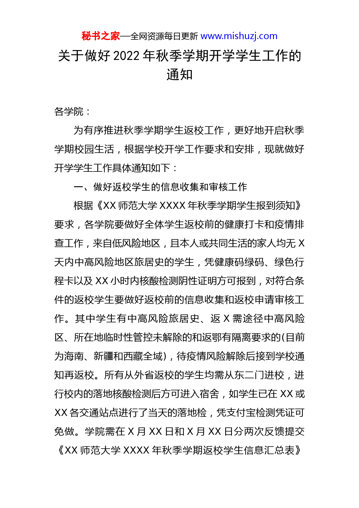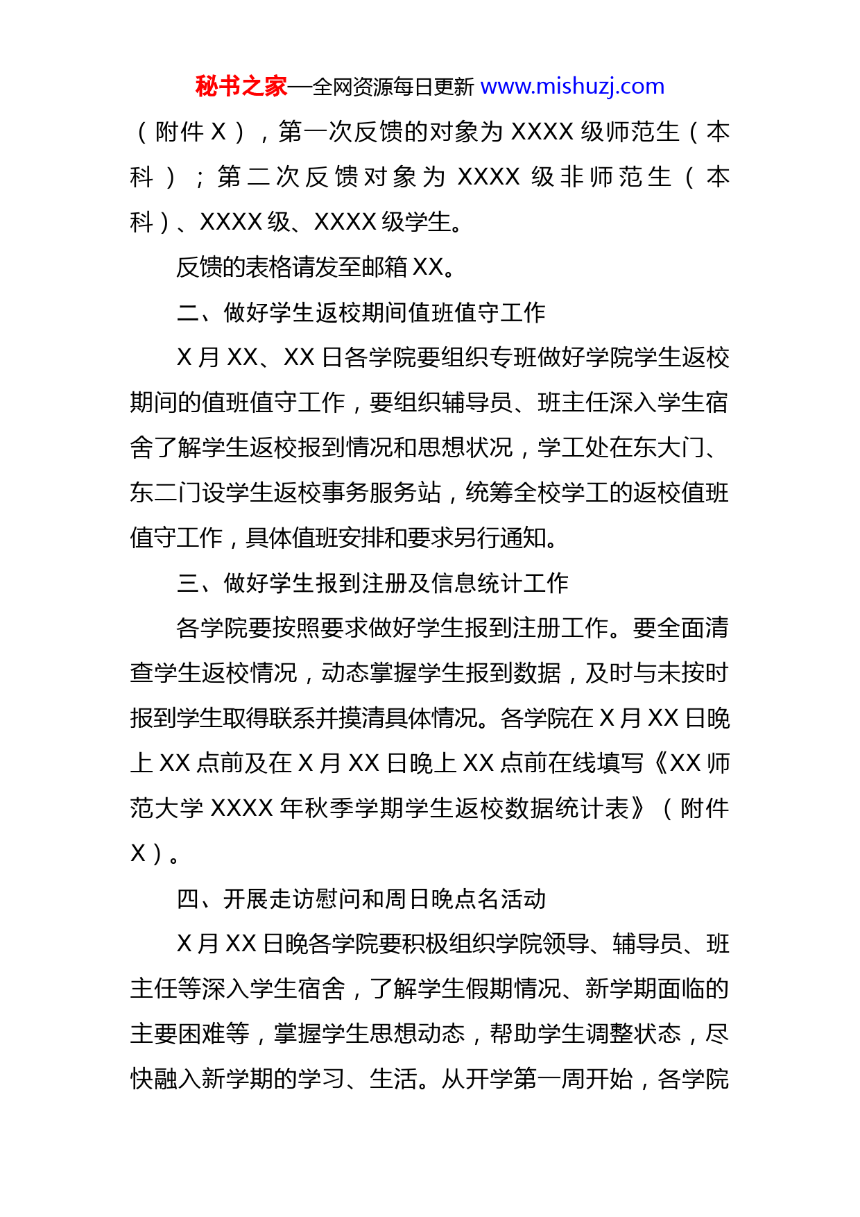 秘书之家—全网资源每日更新www.mishuzj.com关于做好2022年秋季学期开学学生工作的通知各学院:为有序推进秋季学期学生返校工作,更好地开启秋季学期校园生活,根据学校开学工作要求和安排,现就做好开学学生工作具体通知如下:一、做好返校学生的信息收集和审核工作根据《XX师范大学XXXX年秋季学期学生报到须知》要求,各学院要做好全体学生返校前的健康打卡和疫情排查工作,来自低风险地区,且本人或共同生活的家人均无X天内中高风险地区旅居史的学生,凭健康码绿码、绿色行程卡以及XX小时内核酸检测阴性证明方可报到,对符合条件的返校学生要做好返校前的信息收集和返校申请审核工作。其中学生有中高风险旅居史、返X需途径中高风险区、所在地临时性管控未解除的和返鄂有隔离要求的(目前为海南、新疆和西藏全域),待疫情风险解除后接到学校通知再返校。所有从外省返校的学生均需从东二门进校,进行校内的落地核酸检测后方可进入宿舍,如学生已在XX或XX各交通站点进行了当天的落地检,凭支付宝检测凭证可免做。学院需在X月XX日和X月XX日分两次反馈提交《XX师范大学XXXX年秋季学期返校学生信息汇总表》秘书之家—全网资源每日更新www.mishuzj.com(附件X),第一次反馈的对象为XXXX级师范生(本科);第二次反馈对象为XXXX级非师范生(本科)、XXXX级、XXXX级学生。反馈的表格请发至邮箱XX。二、做好学生返校期间值班值守工作X月XX、XX日各学院要组织专班做好学院学生返校期间的值班值守工作,要组织辅导员、班主任深入学生宿舍了解学生返校报到情况和思想状况,学工处在东大门、东二门设学生返校事务服务站,统筹全校学工的返校值班值守工作,具体值班安排和要求另行通知。三、做好学生报到注册及信息统计工作各学院要按照要求做好学生报到注册工作。要全面清查学生返校情况,动态掌握学生报到数据,及时与未按时报到学生取得联系并摸清具体情况。各学院在X月XX日晚上XX点前及在X月XX日晚上XX点前在线填写《XX师范大学XXXX年秋季学期学生返校数据统计表》(附件X)。四、开展走访慰问和周日晚点名活动X月XX日晚各学院要积极组织学院领导、辅导员、班主任等深入学生宿舍,了解学生假期情况、新学期面临的主要困难等,掌握学生思想动态,帮助学生调整状态,尽快融入新学期的学习、生活。从开学第一周开始,各学院秘书之家—全网资源每日更新www.mishuzj.com要常态化开展周日晚点名活动,严格日常管理,特别是请销假制度,倡导学生非必要不出校,主动掌握学生动向。五、开展安全教育、隐患排查和加强关爱学生工作各学院要组织班主任工作会议部署学期初安全教育工作,重点抓好疫情防控、防火防盗、防范电信网络诈骗、心理健康等学期初高风险安全教育和隐患排查;要进一步加大对学生的关爱力度,及时了解学生返校后的心理状况,优化工作方式方法,持续做好学生的思想引导、学业辅导、就业指导、心理疏导;辅导员、班主任要点对点和学生加强沟通联系,加大对有特殊困难学生的关心关爱力度,及时帮助解决实际问题;高度关注受疫情影响学生、家庭经济困难学生、学业困难学生、思想情绪波动大的学生,开展“一对一”的思想引导、心理疏导和学习生活指导,妥善做好心理咨询和帮扶工作;开学继续实行学生安全情况日报告制度,与学生返校情况同时上报。六、组织好“开学第一课”各学院要深入学习贯彻习近平新时代中国特色社会主义思想,开展全覆盖、全媒体、全方位的宣传活动,广泛普及国家安全法律法规,增加学生爱党爱国爱校的主动性和自觉性,各学院要通过主题班会、课前十分钟演讲、故事分享会、学习交流会等多种形式,切实引导学生增强国家意识,强化政治认同,坚定四个自信,全力营造良好的秘书之家—全网资源每日更新www.mishuzj.com舆论氛围,喜迎党的二十大胜利召开。七、督查学生上课积极配合学校教学检查工作。X月XX日要组织安排院领导、辅导员、班主任等到教学楼、课堂检查学生上课情况,引导学生遵守文明公约,规范言行举止,营造良好学习氛围。