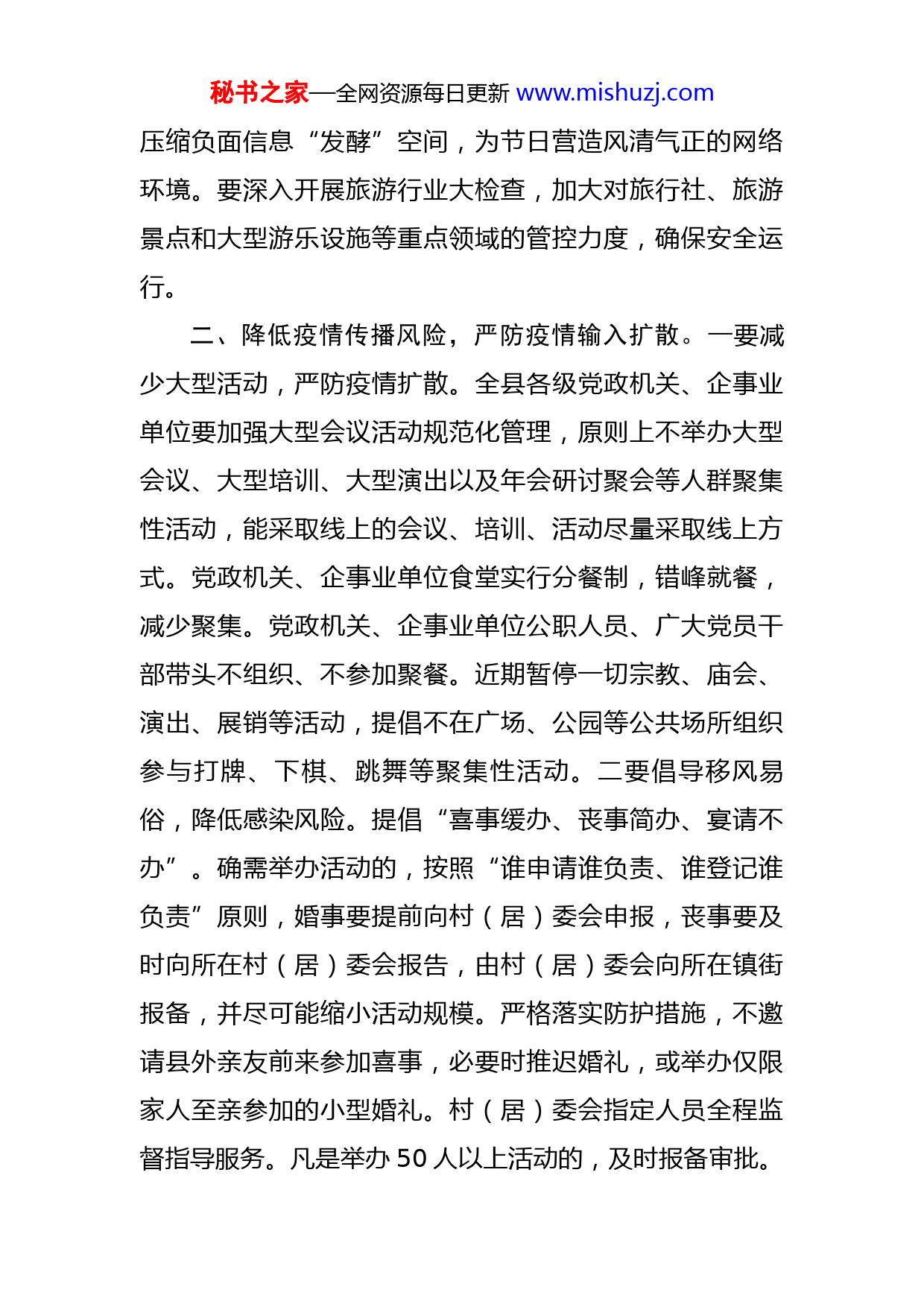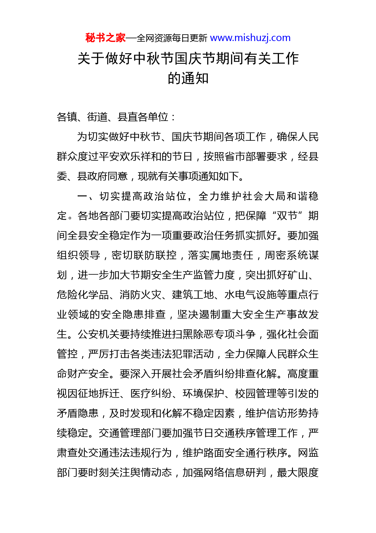 秘书之家—全网资源每日更新www.mishuzj.com关于做好中秋节国庆节期间有关工作的通知各镇、街道、县直各单位:为切实做好中秋节、国庆节期间各项工作,确保人民群众度过平安欢乐祥和的节日,按照省市部署要求,经县委、县政府同意,现就有关事项通知如下。一、切实提高政治站位,全力维护社会大局和谐稳定。各地各部门要切实提高政治站位,把保障“双节”期间全县安全稳定作为一项重要政治任务抓实抓好。要加强组织领导,密切联防联控,落实属地责任,周密系统谋划,进一步加大节期安全生产监管力度,突出抓好矿山、危险化学品、消防火灾、建筑工地、水电气设施等重点行业领域的安全隐患排查,坚决遏制重大安全生产事故发生。公安机关要持续推进扫黑除恶专项斗争,强化社会面管控,严厉打击各类违法犯罪活动,全力保障人民群众生命财产安全。要深入开展社会矛盾纠纷排查化解。高度重视因征地拆迁、医疗纠纷、环境保护、校园管理等引发的矛盾隐患,及时发现和化解不稳定因素,维护信访形势持续稳定。交通管理部门要加强节日交通秩序管理工作,严肃查处交通违法违规行为,维护路面安全通行秩序。网监部门要时刻关注舆情动态,加强网络信息研判,最大限度秘书之家—全网资源每日更新www.mishuzj.com压缩负面信息“发酵”空间,为节日营造风清气正的网络环境。要深入开展旅游行业大检查,加大对旅行社、旅游景点和大型游乐设施等重点领域的管控力度,确保安全运行。二、降低疫情传播风险,严防疫情输入扩散。一要减少大型活动,严防疫情扩散。全县各级党政机关、企事业单位要加强大型会议活动规范化管理,原则上不举办大型会议、大型培训、大型演出以及年会研讨聚会等人群聚集性活动,能采取线上的会议、培训、活动尽量采取线上方式。党政机关、企事业单位食堂实行分餐制,错峰就餐,减少聚集。党政机关、企事业单位公职人员、广大党员干部带头不组织、不参加聚餐。近期暂停一切宗教、庙会、演出、展销等活动,提倡不在广场、公园等公共场所组织参与打牌、下棋、跳舞等聚集性活动。二要倡导移风易俗,降低感染风险。提倡“喜事缓办、丧事简办、宴请不办”。确需举办活动的,按照“谁申请谁负责、谁登记谁负责”原则,婚事要提前向村(居)委会申报,丧事要及时向所在村(居)委会报告,由村(居)委会向所在镇街报备,并尽可能缩小活动规模。严格落实防护措施,不邀请县外亲友前来参加喜事,必要时推迟婚礼,或举办仅限家人至亲参加的小型婚礼。村(居)委会指定人员全程监督指导服务。凡是举办50人以上活动的,及时报备审批。秘书之家—全网资源每日更新www.mishuzj.com三要落实常态管理,严格测温扫码。人员密集、流动性大、空间密闭等容易发生聚集性疫情的批发市场、农贸市场、商场超市、网吧酒吧、影剧院、台球室、KTV、健身房、体育场馆等重点场所,要履行好主体责任,落实防疫经理责任制,坚持做好每日员工健康监测、场所定期消毒通风。广大居民要自觉遵守防疫政策,进入宾馆、饭店、酒吧、网吧、KTV、棋牌室(麻将馆)等重点公共场所,要主动测量体温、扫场所码、出示健康码和行程码,提供72小时核酸检测阴性证明,保持安全社交距离。四要做好个人防护,养成健康习惯。请广大居民朋友加强自我防护,科学佩戴口罩、勤洗手、常通风,咳嗽、打喷嚏时注意遮挡。减少在人群密集、空间密闭、空气不流通场所的停留时间,做到不聚餐、不聚集、不扎堆,保持安全社交距离等良好的卫生习惯。五要强化自主报备,当好抗疫哨兵。7天内从有阳性病例的县(市、区、旗)及低、中、高风险区域来(返)××人员,需提前向目的地单位、社区(村)或酒店报备,并配合做好集中隔离、居家隔离、核酸检测等相应的健康管理措施;无风险地区人员请在抵达县域后第一时间主动向属地社区(村)、单位或酒店报备,倡导主动落实“三天两检”健康管理措施。六要积极核酸检测,排查潜在风险。请广大居民群众按村(居)、单位通知要求,在应急处置演练期间,积极主动前往核酸检测点秘书之家—全网资源每日更新www.mishuzj.com参加检测,确保我县核酸筛查工作不漏一户、不落一人。三、精心做好节期民生保障工作,充分满足群众生产生活需要。各地各部门要密切监控中秋节和国庆节市场状态,提前组织货源,科学储备物资,根据居民消费特点及变化情况指导商贸流通企业搞好产销衔接。积极做好粮油肉蛋奶等重要农副产品保供稳价工作,确保节日期间不断档、不脱销。食品药品监管部门要加大对节日食品、基本药物、疫苗等的监督检查力度,消除安全隐患,严防不合格食品、药品、药械等流入市场。文化旅游部门要坚持以人民为中心的服务导向,围绕节日特点和民俗特色,积极组织开展群众喜闻乐见的文旅活动,丰富群众节日文化生活。交通运输部门要深入分析节日期间学生流、旅游流、探亲流等情况,科学调度运力资源,加强客流监测并及时发布运次和票源信息,服务群众便利出行。各级党委、政府要积极组织开展走访慰问生活困难党员、老党员、老干部和军队离退休干部、老战士、生活困难退役人员、烈军属等活动,确保党员群众幸福过节。四、严守廉洁自律政治底线,严防节期“四风”问题发生。各地各部门要坚定不移全面从严治