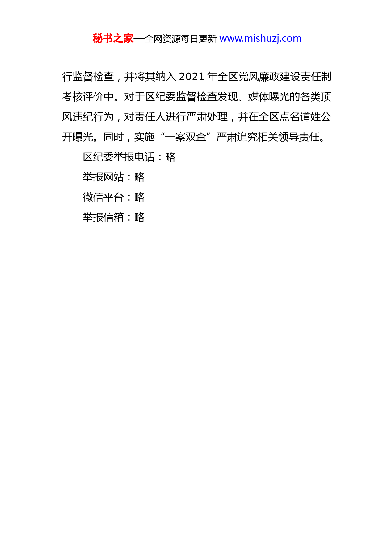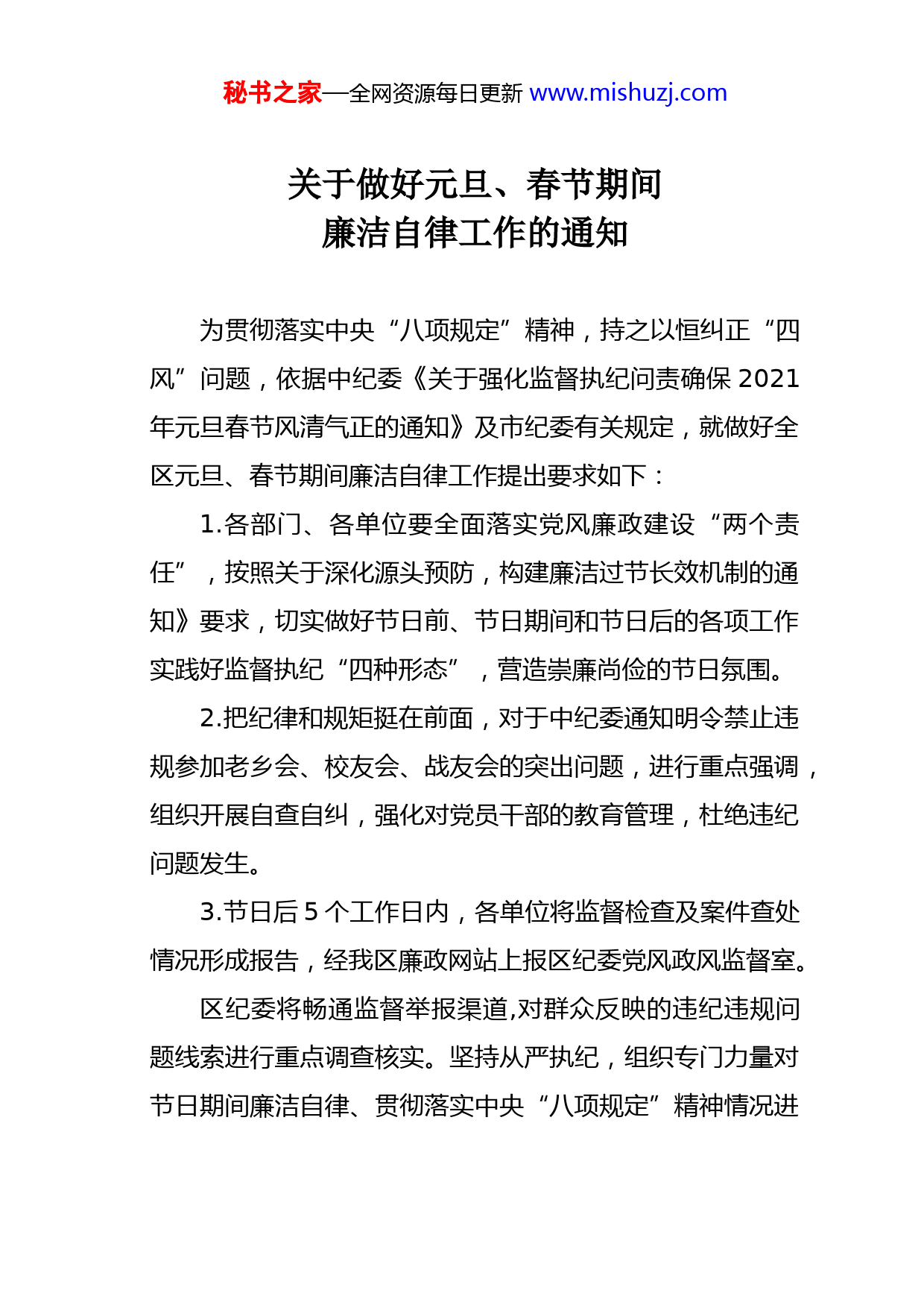 秘书之家—全网资源每日更新www.mishuzj.com关于做好元旦、春节期间廉洁自律工作的通知为贯彻落实中央“八项规定”精神,持之以恒纠正“四风”问题,依据中纪委《关于强化监督执纪问责确保2021年元旦春节风清气正的通知》及市纪委有关规定,就做好全区元旦、春节期间廉洁自律工作提出要求如下:1.各部门、各单位要全面落实党风廉政建设“两个责任”,按照关于深化源头预防,构建廉洁过节长效机制的通知》要求,切实做好节日前、节日期间和节日后的各项工作实践好监督执纪“四种形态”,营造崇廉尚俭的节日氛围。2.把纪律和规矩挺在前面,对于中纪委通知明令禁止违规参加老乡会、校友会、战友会的突出问题,进行重点强调,组织开展自查自纠,强化对党员干部的教育管理,杜绝违纪问题发生。3.节日后5个工作日内,各单位将监督检查及案件查处情况形成报告,经我区廉政网站上报区纪委党风政风监督室。区纪委将畅通监督举报渠道,对群众反映的违纪违规问题线索进行重点调查核实。坚持从严执纪,组织专门力量对节日期间廉洁自律、贯彻落实中央“八项规定”精神情况进秘书之家—全网资源每日更新www.mishuzj.com行监督检查,并将其纳入2021年全区党风廉政建设责任制考核评价中。对于区纪委监督检查发现、媒体曝光的各类顶风违纪行为,对责任人进行严肃处理,并在全区点名道姓公开曝光。同时,实施“一案双查”严肃追究相关领导责任。区纪委举报电话:略举报网站:略微信平台:略举报信箱:略